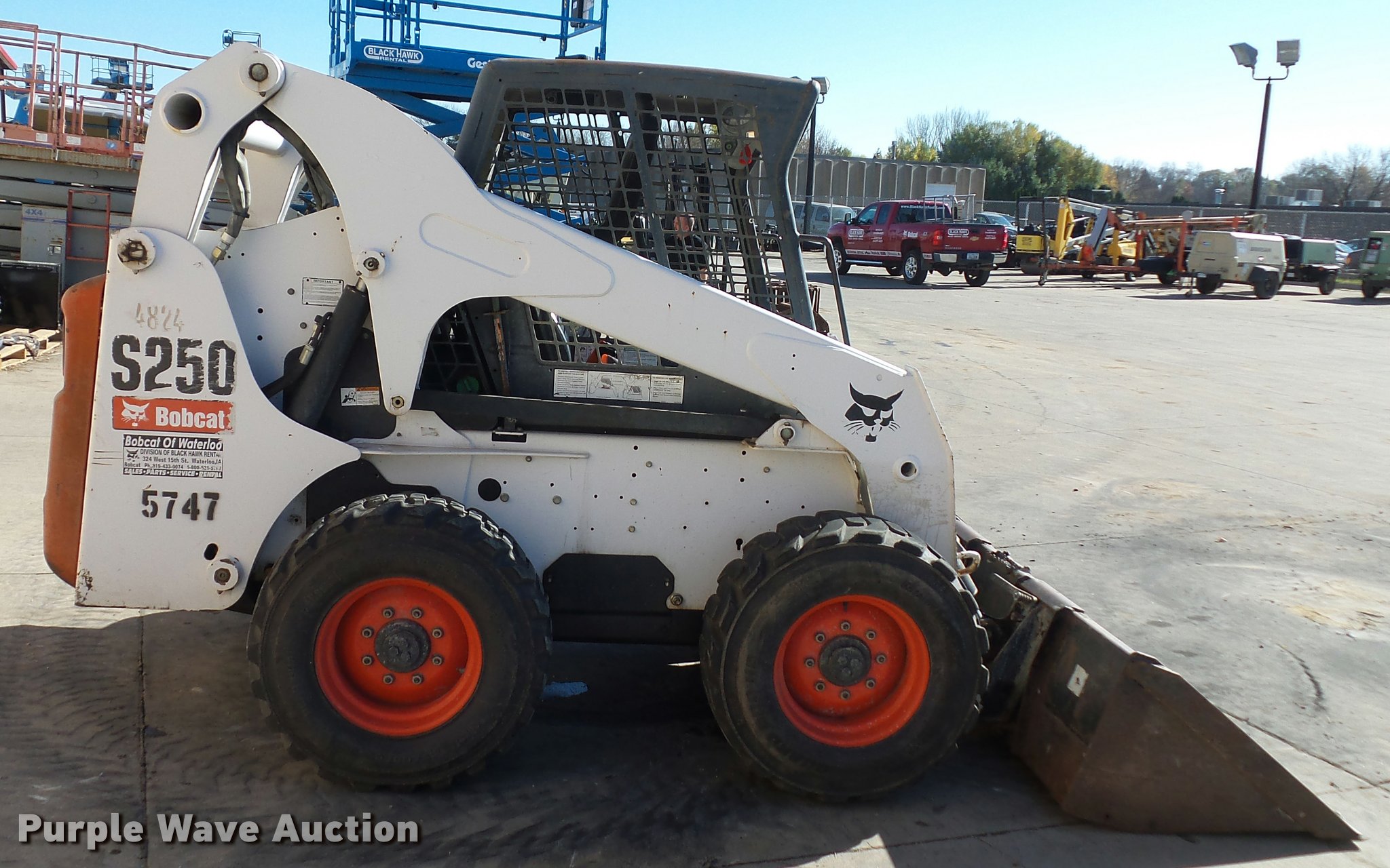 2008 Bobcat S250 skid steer. 2,384 hours on meter, Four cylinder diesel engine, Hydrostatic transmission, OROPS, Hand and foot controls, 78"W bucket, Auxiliary hydraulics, Manual quick coupler, 12-16.5 tires, Serial A5GM20586. Black Hawk Rental. 4325 University Avenue. Cedar Falls, IA 50613