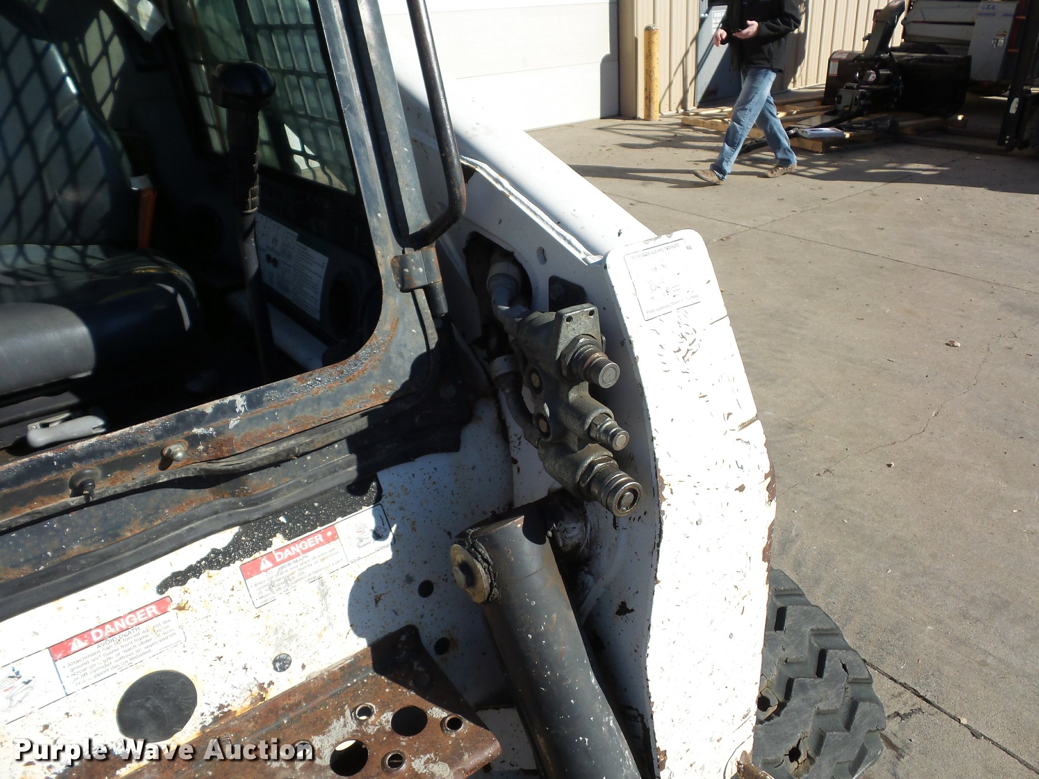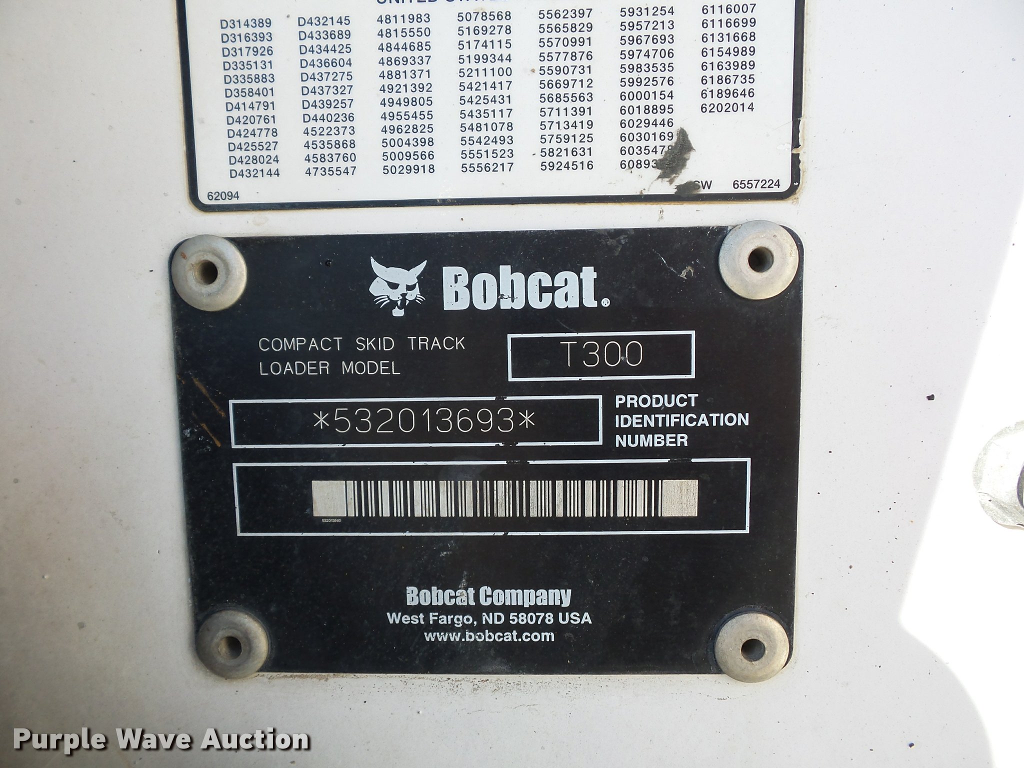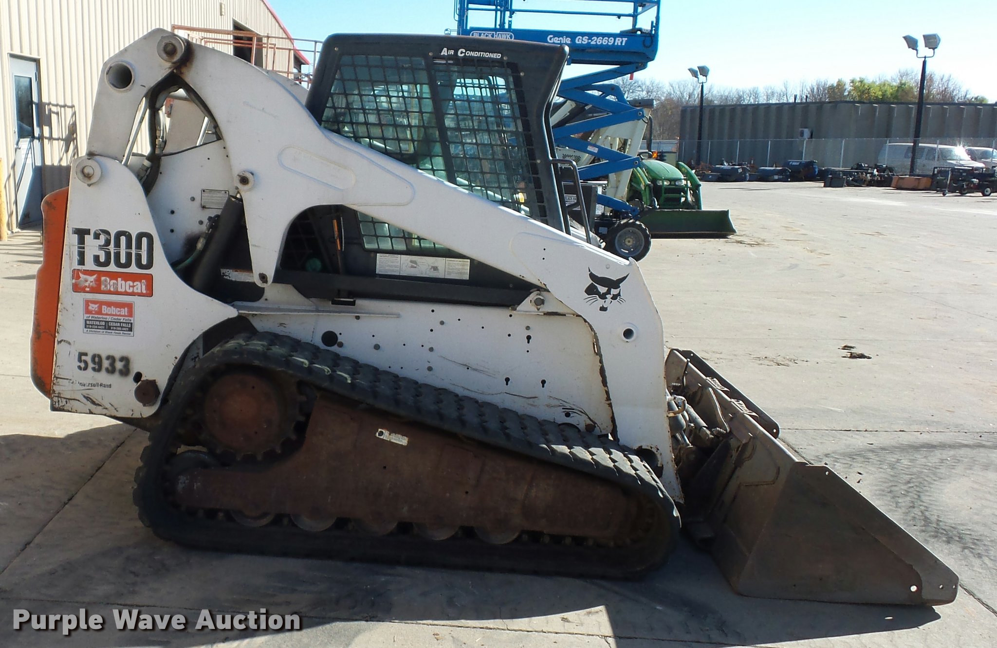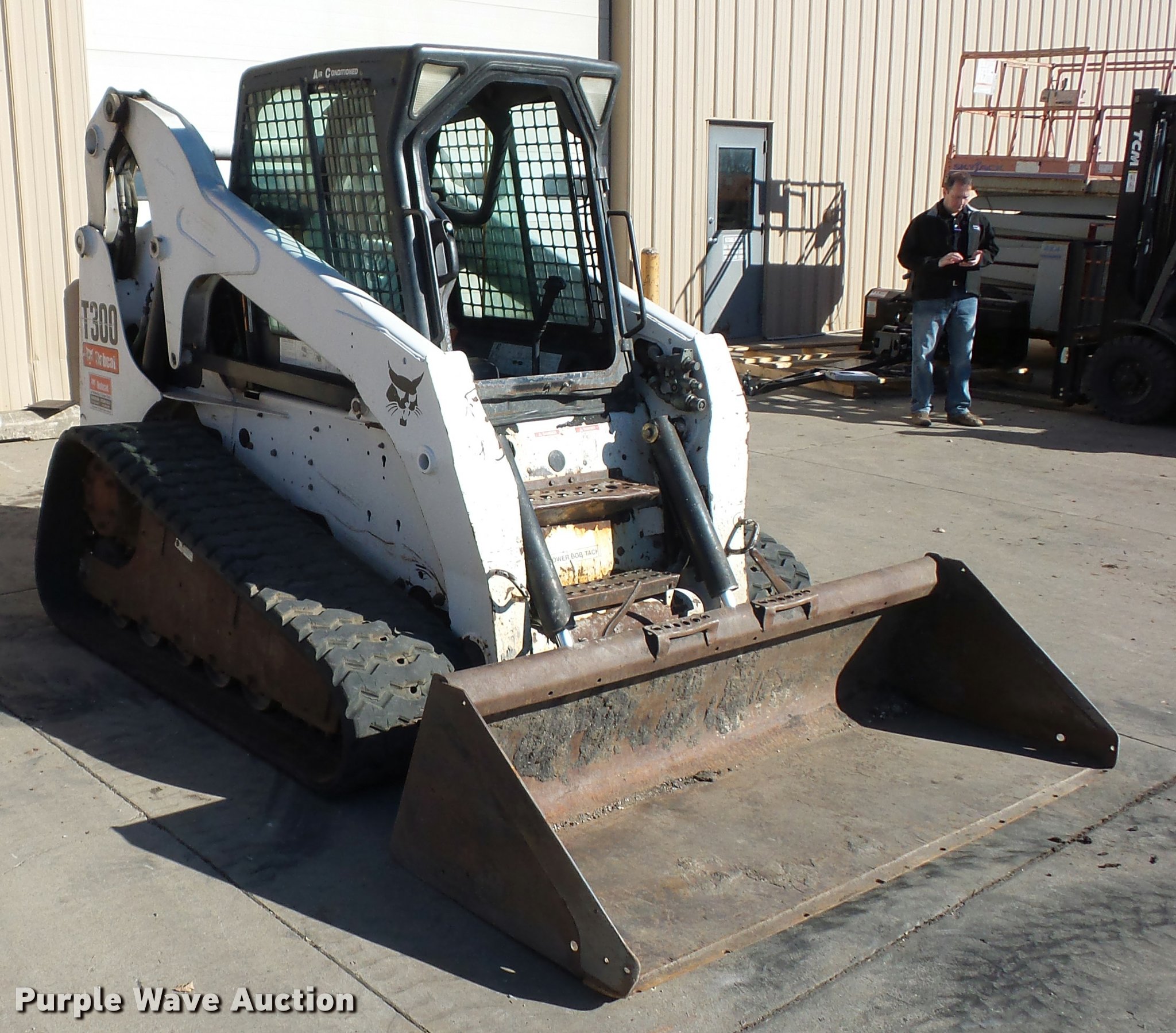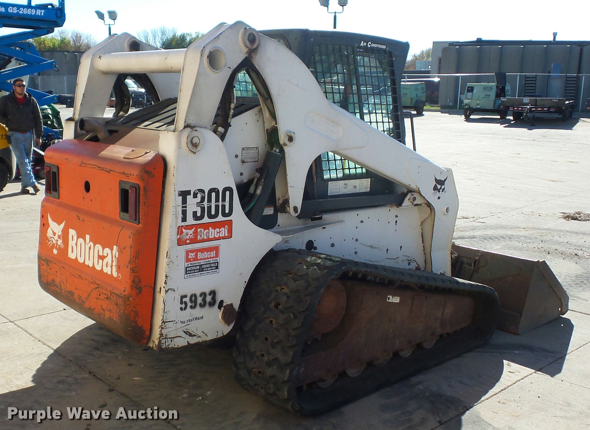 Purple Wave is selling a used Tracked Skid Steer Loader in Iowa. This item is a 2006 Bobcat T300 skid steer with the following: 4,062 hours on meter, Four cylinder diesel engine, Hydrostatic transmission, Enclosed cab, AC and heat, Hand and foot controls, 80"W bucket, High flow auxiliary hydraulics, Power Bobtach, Front work lights, 18"W tracks, Front glass missing, Serial 532013693