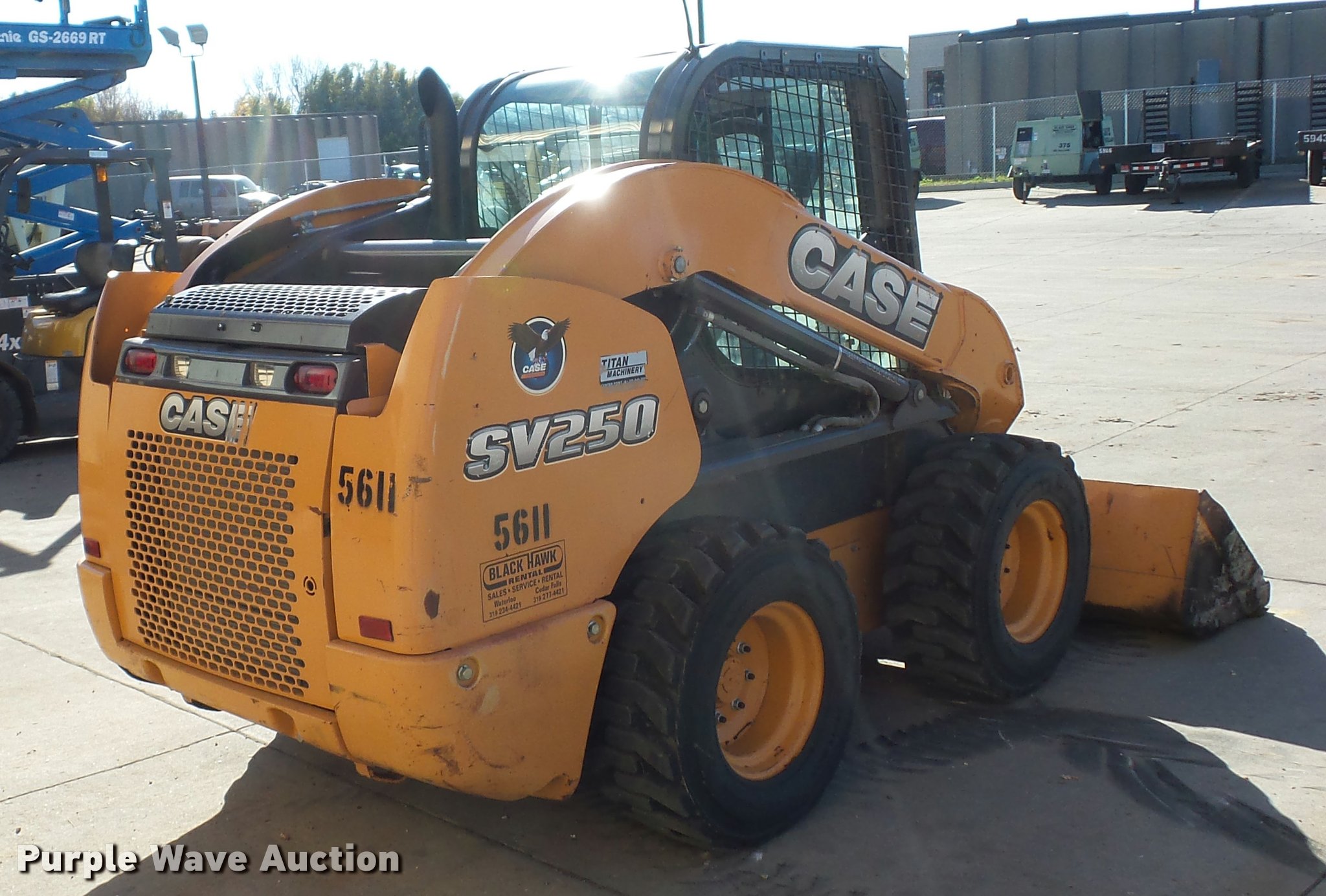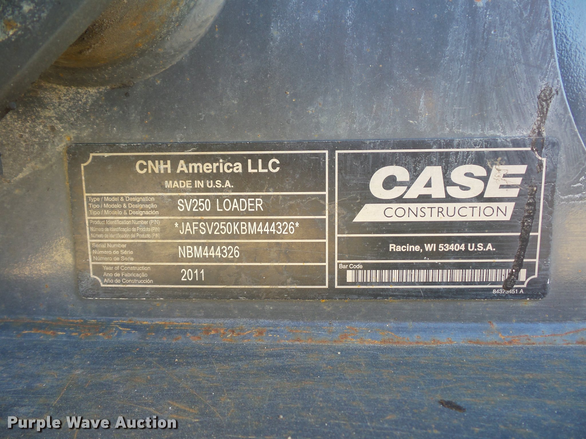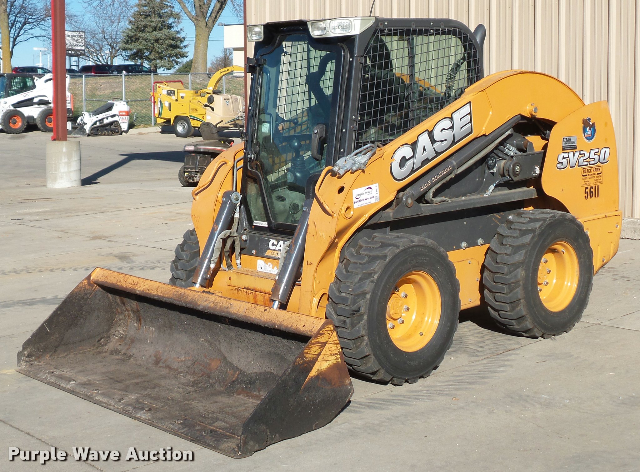 Purple Wave is selling a used Skid Steer Loader in Iowa. This item is a 2011 Case SV250 skid steer with the following: 1,582 hours on meter, Four cylinder diesel engine, Two speed hydrostatic transmission, Enclosed cab, AC and heat, AM/FM, Joystick controls, 83"W bucket, High flow auxiliary hydraulics, Front and rear work lights, 12-16.5 tires, Serial JAFSV250KBM44436