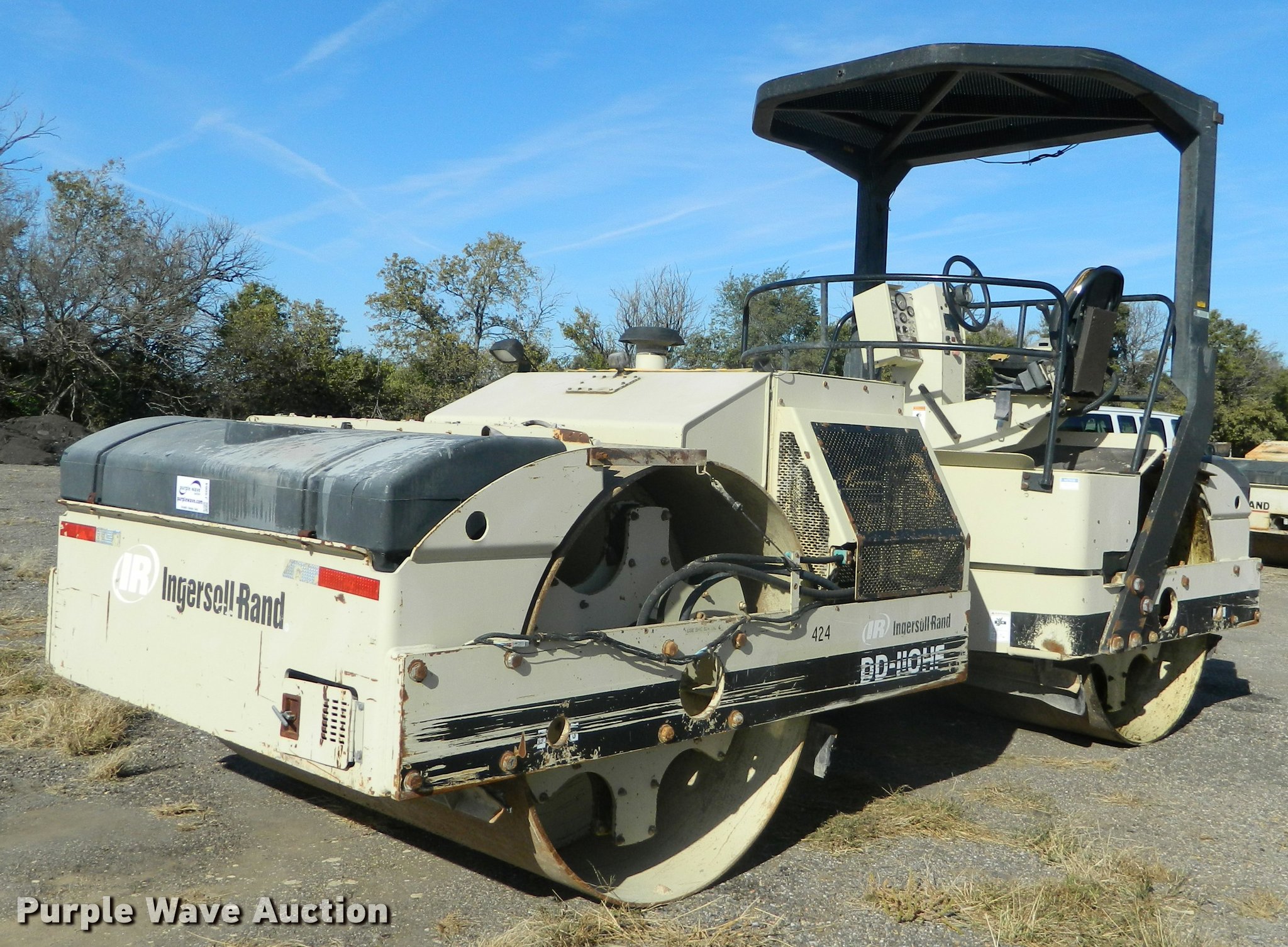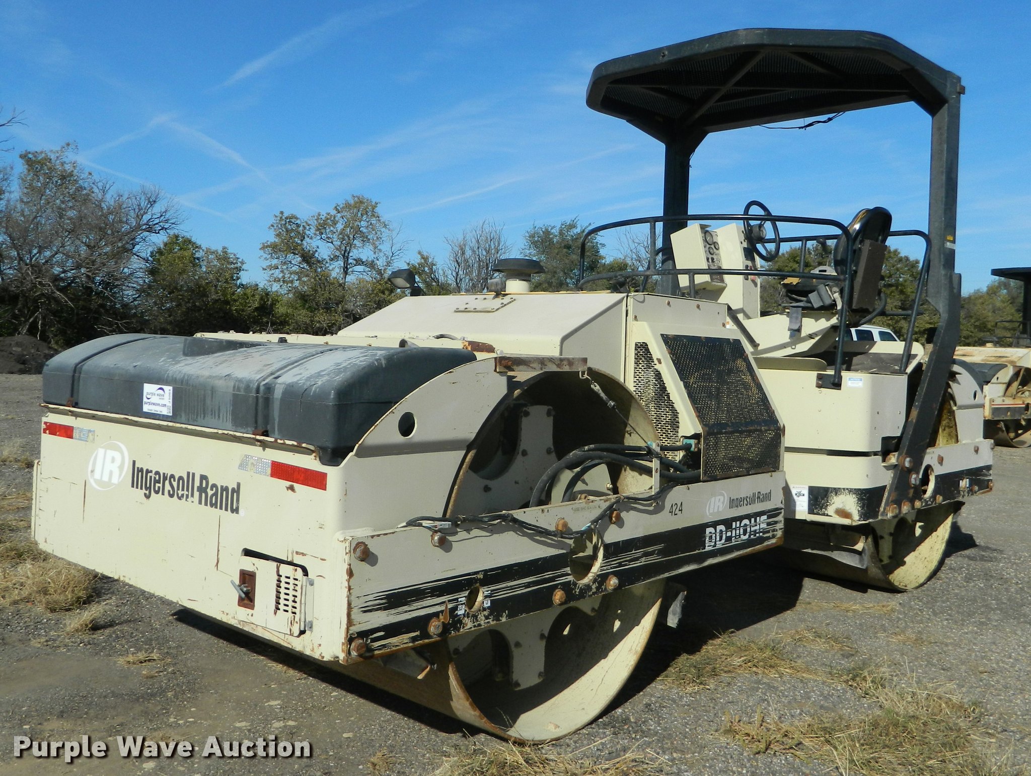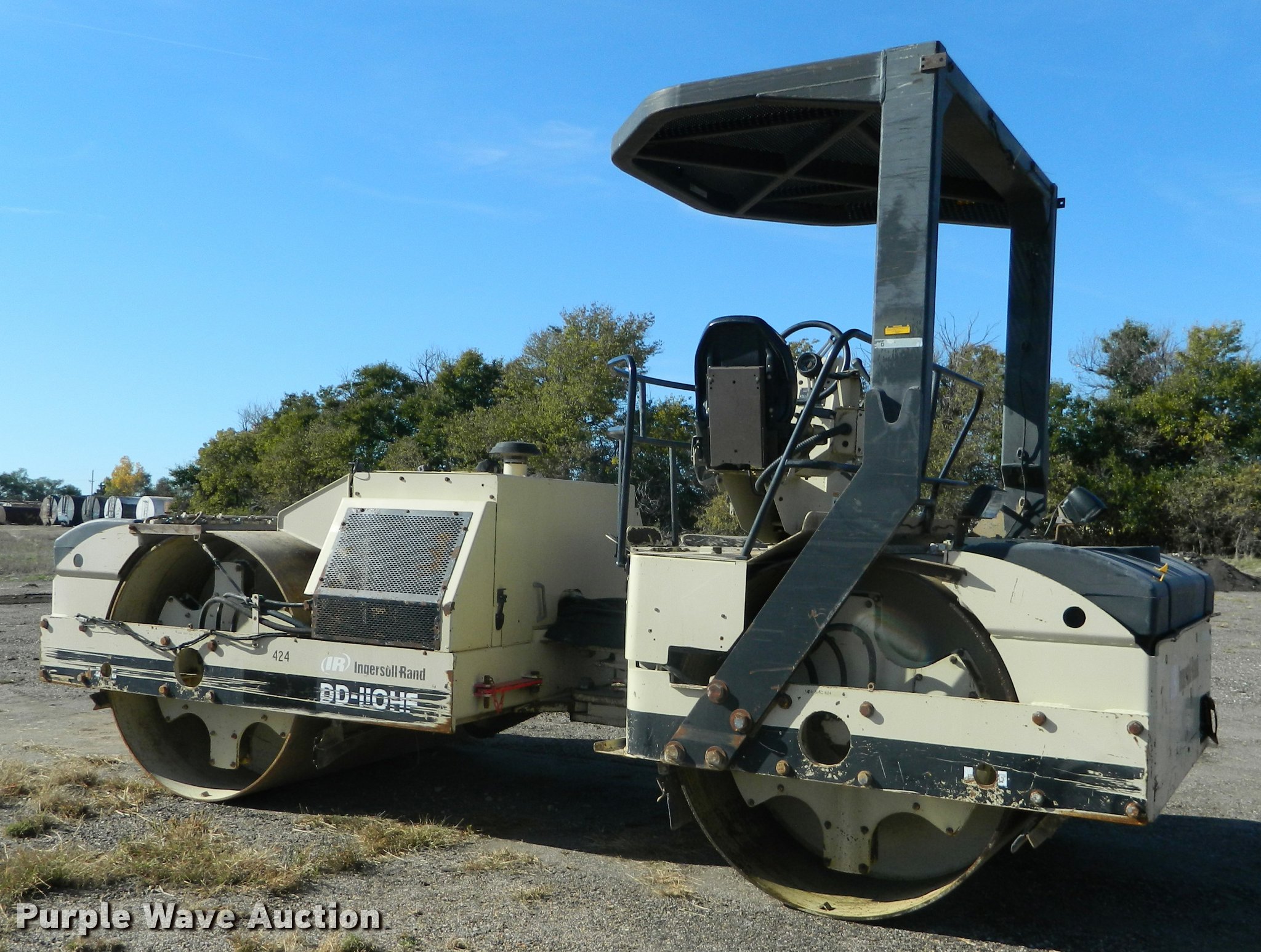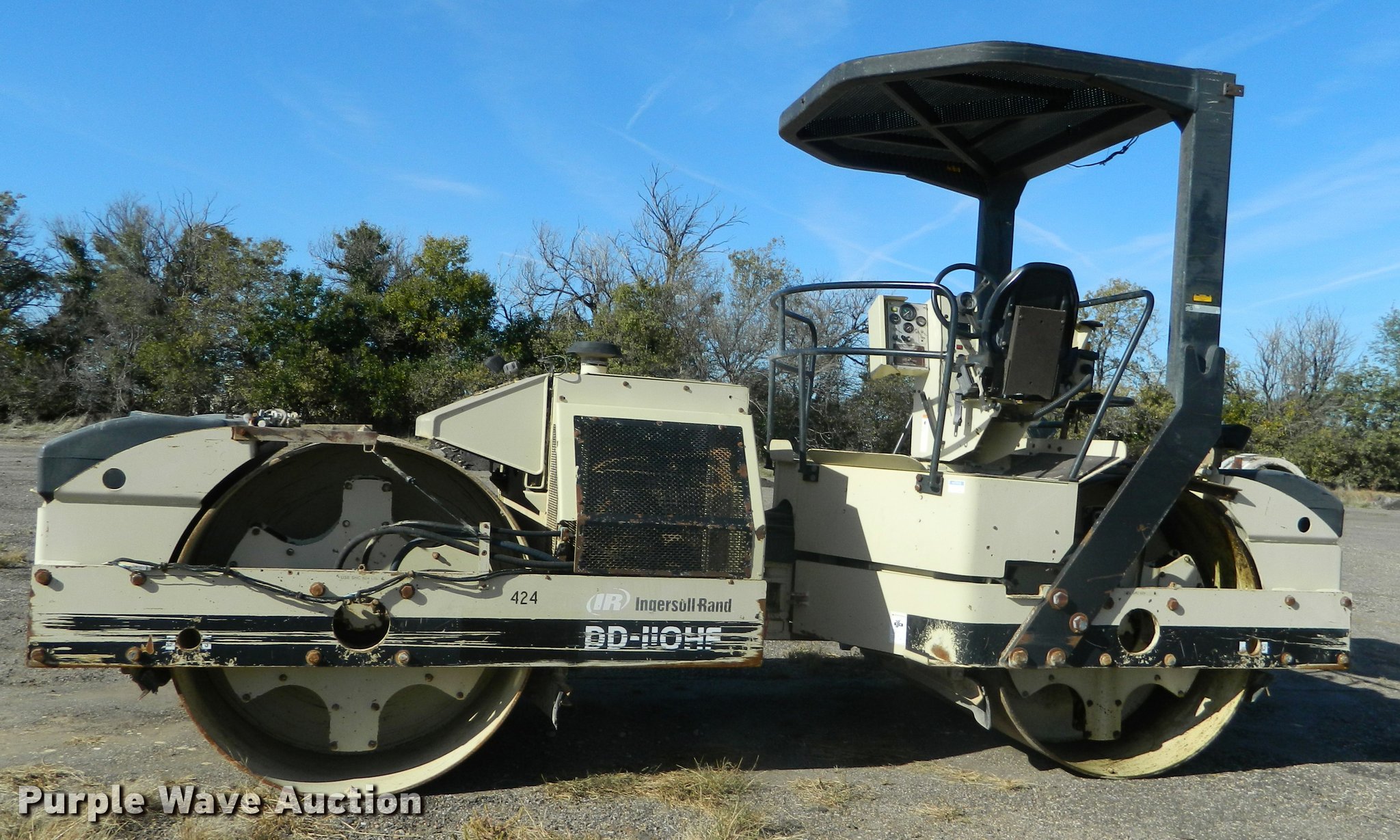 Purple Wave is selling a used Double Drum Roller Compactor in Kansas. This item is a 2002 Ingersoll Rand DD110HF double drum vibratory roller with the following: 10,419 hours on meter, Cummins four cylinder diesel engine, Hydrostatic transmission, OROPS, 78"W x 52" diameter smooth steel drums, Two speed vibratory system, Front and rear drum scrapers, Front and rear water application, Dual propel system, Serial 170156, Unit# 424