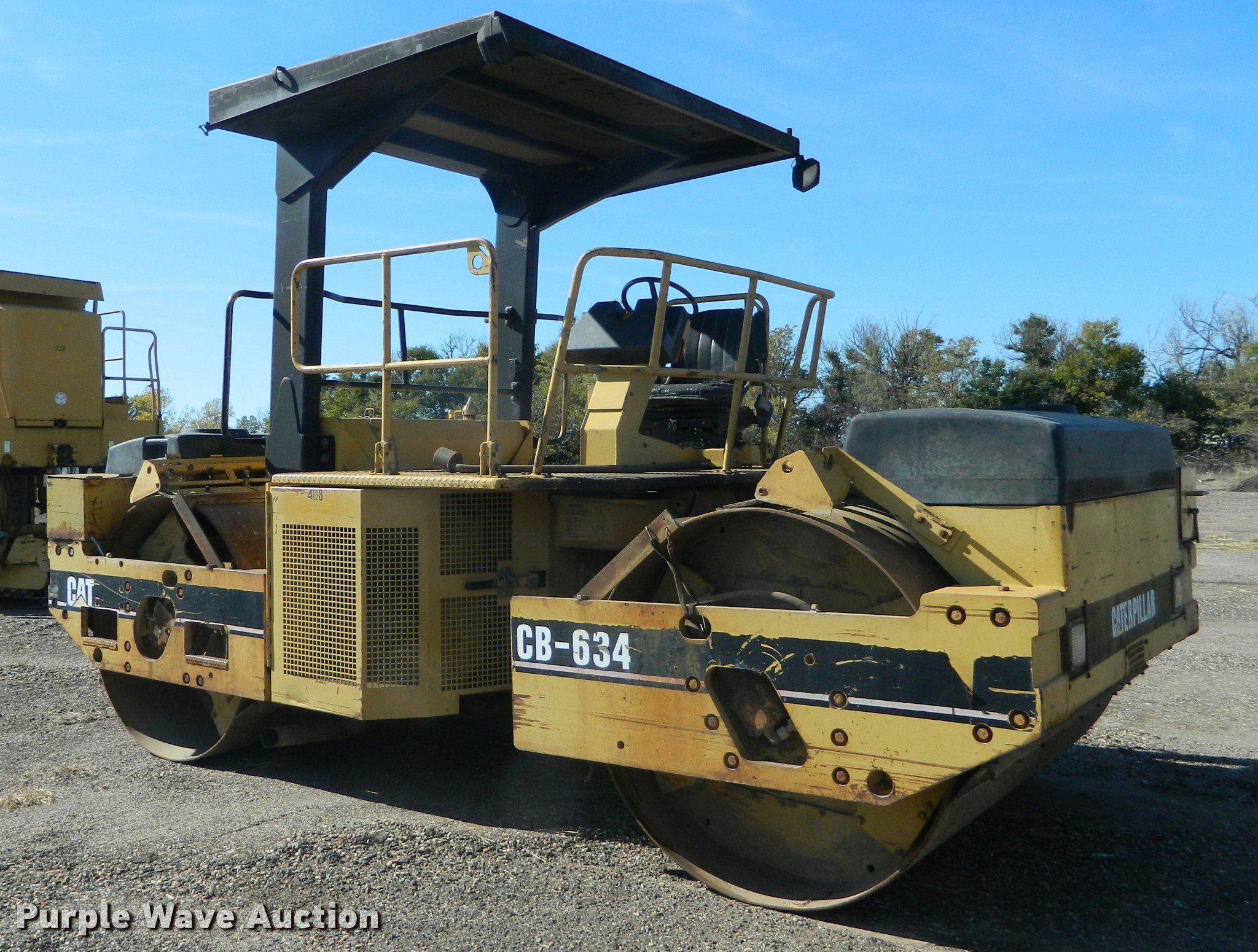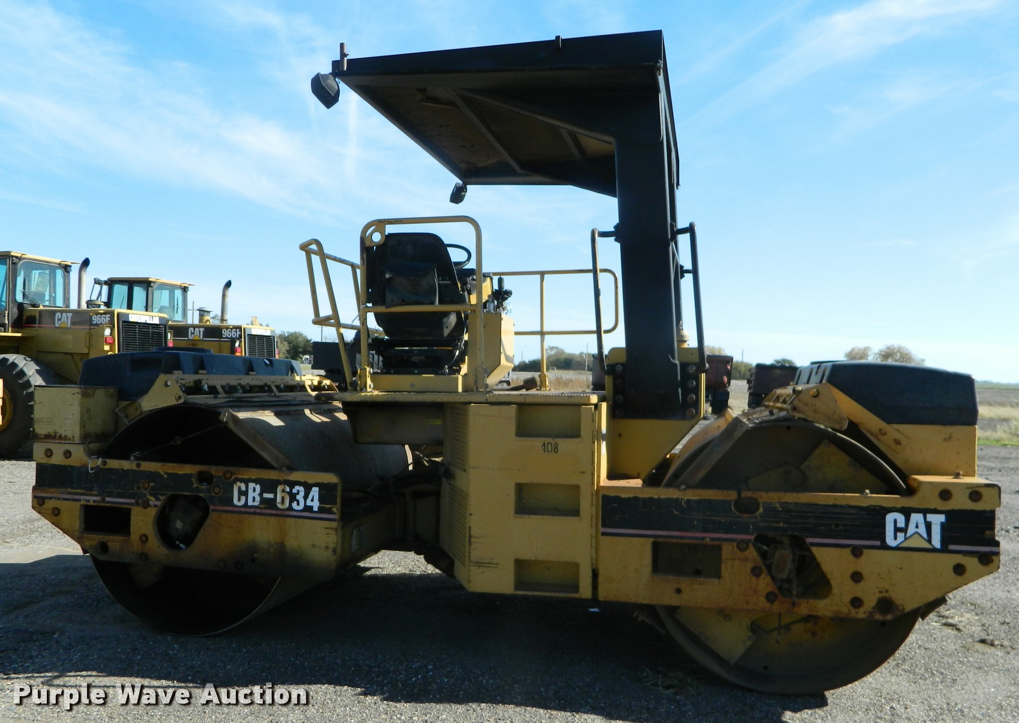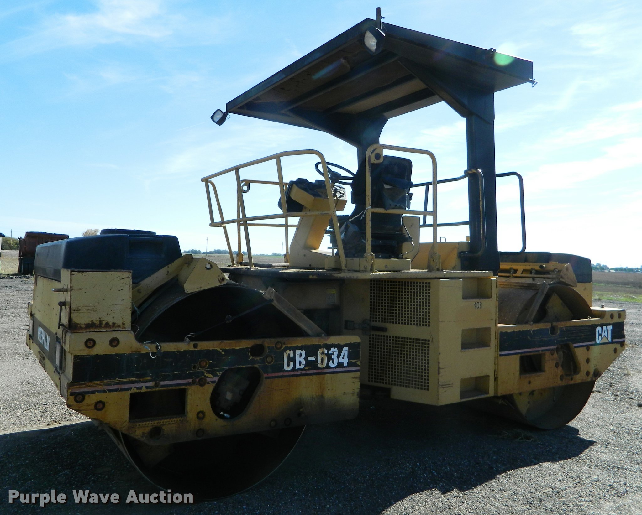 Purple Wave is selling a used Double Drum Roller Compactor in Kansas. This item is a 1996 Caterpillar CB634 double drum vibratory roller with the following: 11,014 hours on meter, Caterpillar six cylinder diesel engine, Hydrostatic transmission, OROPS, Canopy, Work lights, 84"W x 52" diameter smooth steel drums, Dual two speed vibratory system, Front and rear drum scrapers, Front and rear water application, Dual propel system, Serial 5CL00186, Unit# 408