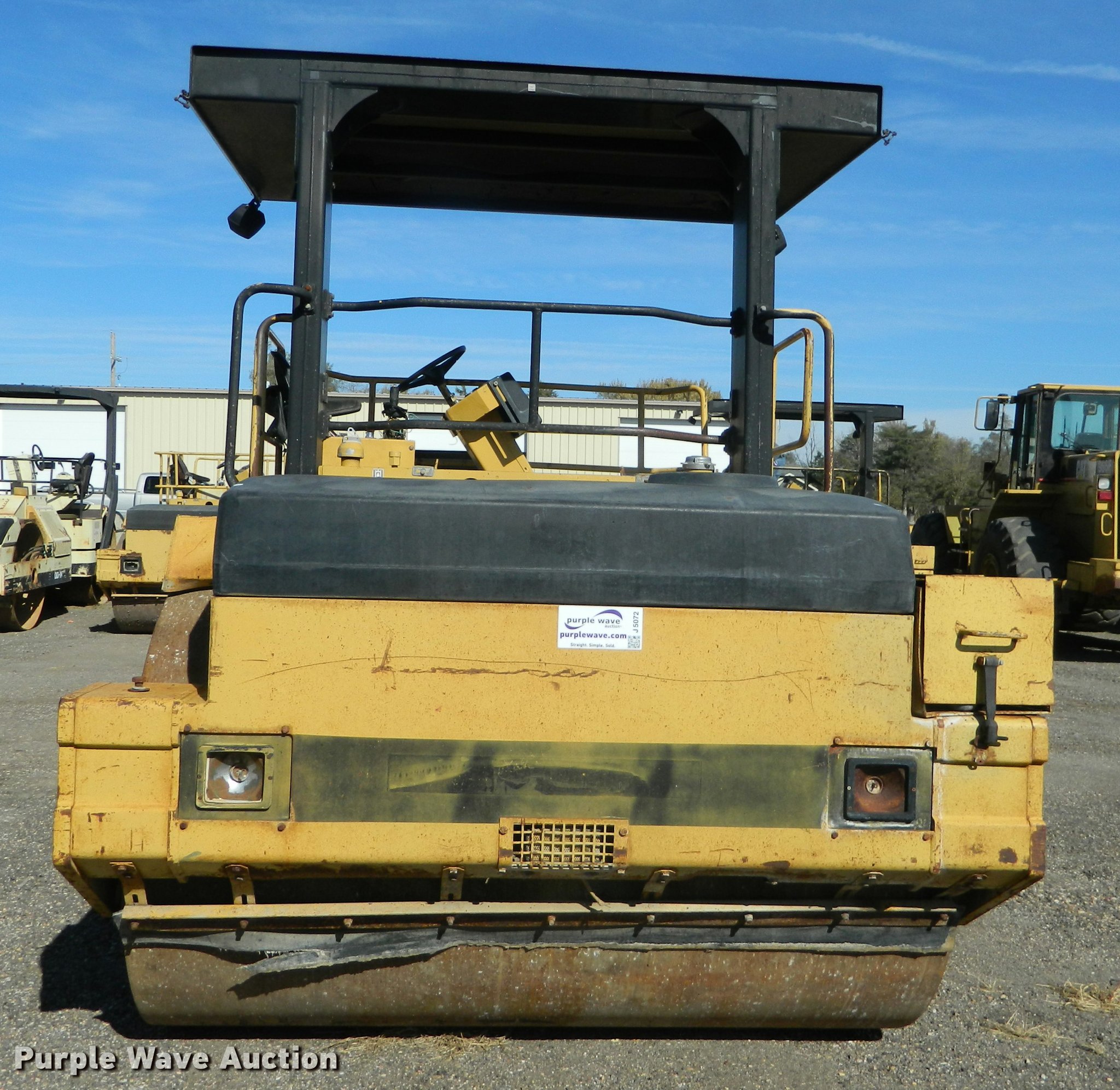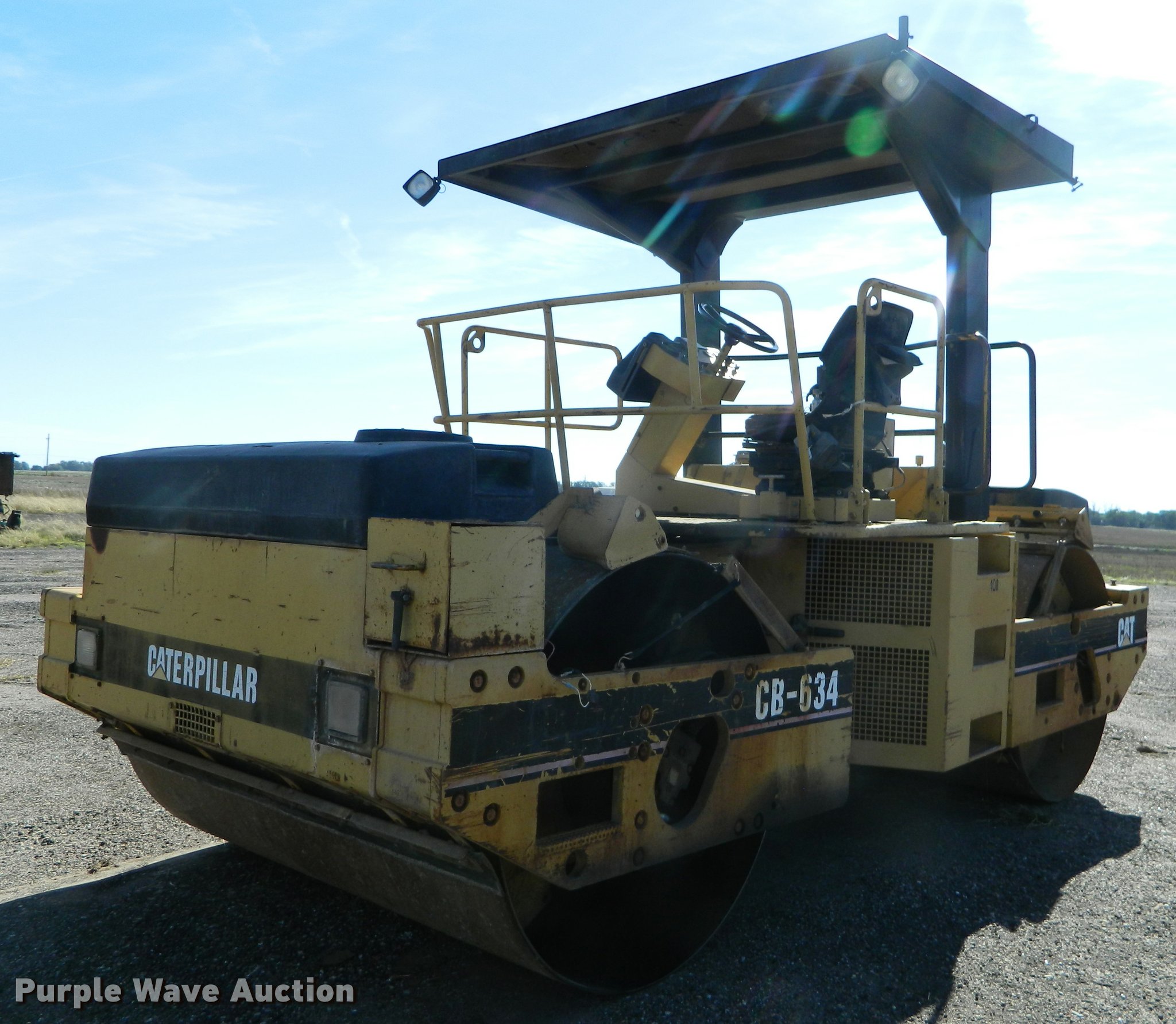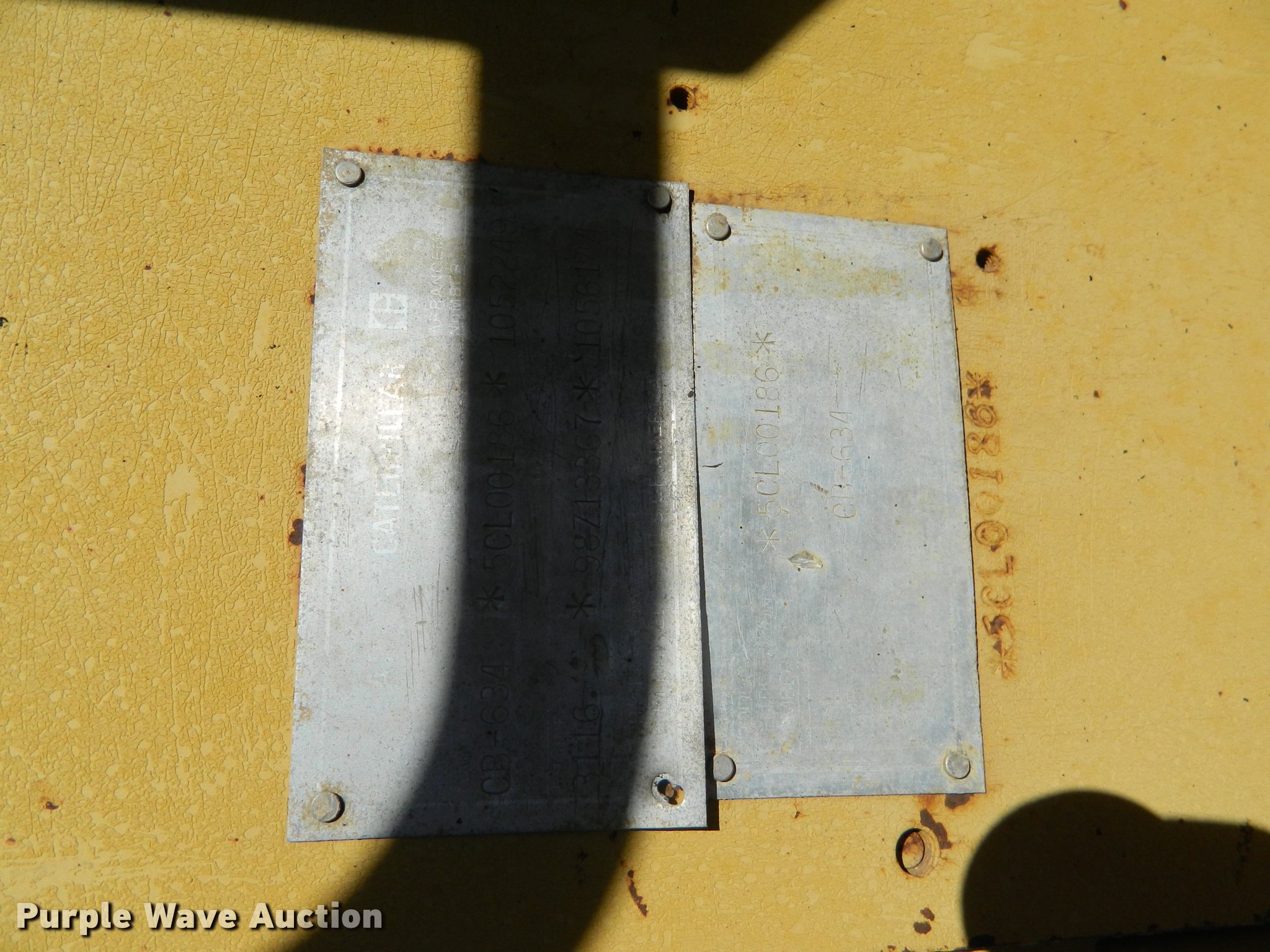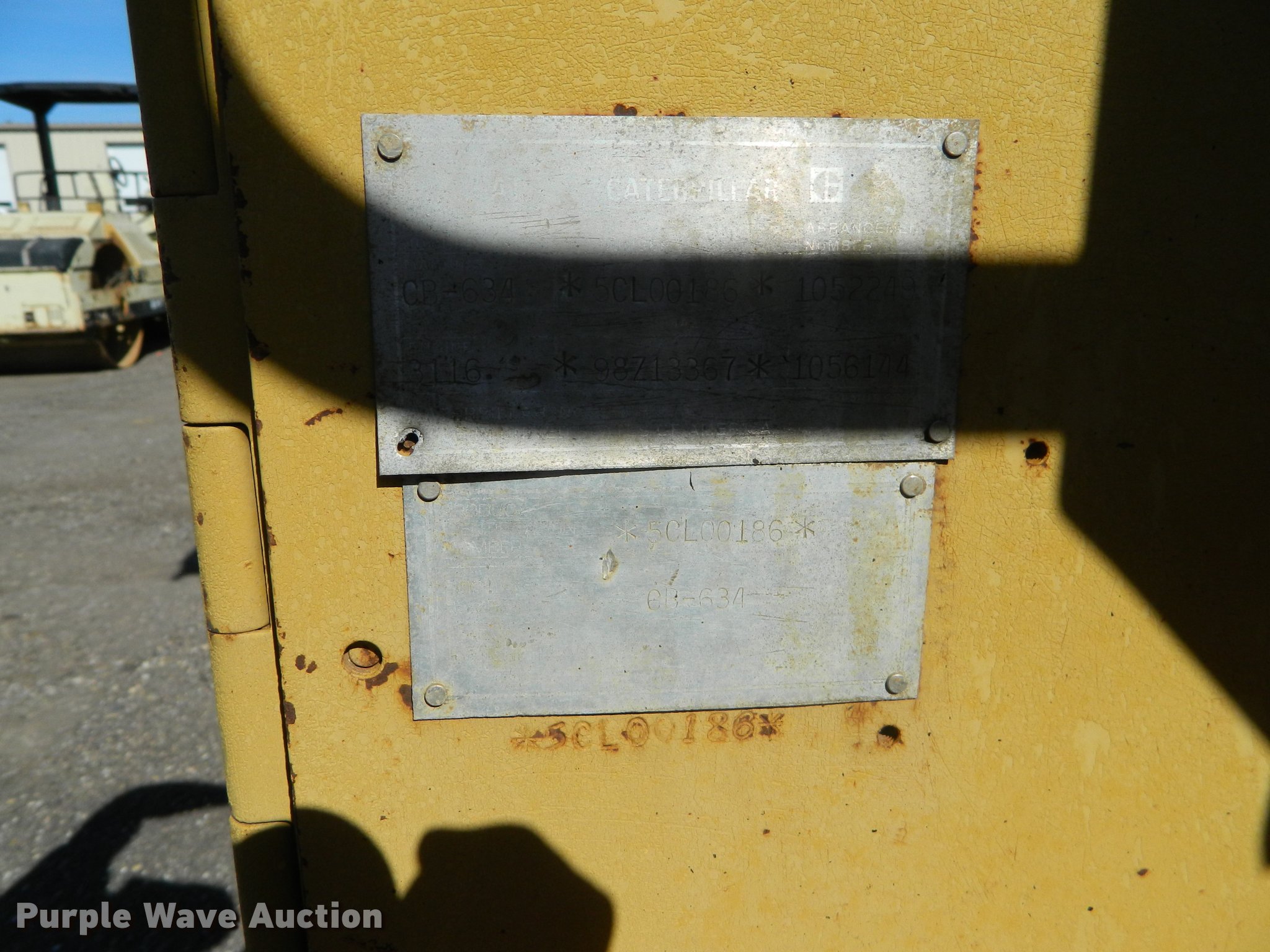 Purple Wave is selling a used Double Drum Roller Compactor in Kansas. This item is a 1996 Caterpillar CB634 double drum vibratory roller with the following: 11,014 hours on meter, Caterpillar six cylinder diesel engine, Hydrostatic transmission, OROPS, Canopy, Work lights, 84"W x 52" diameter smooth steel drums, Dual two speed vibratory system, Front and rear drum scrapers, Front and rear water application, Dual propel system, Serial 5CL00186, Unit# 408