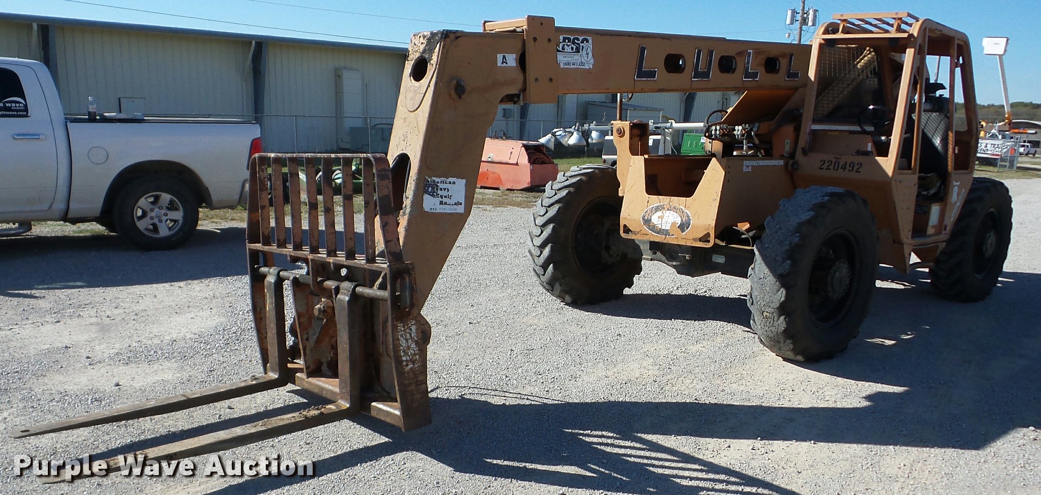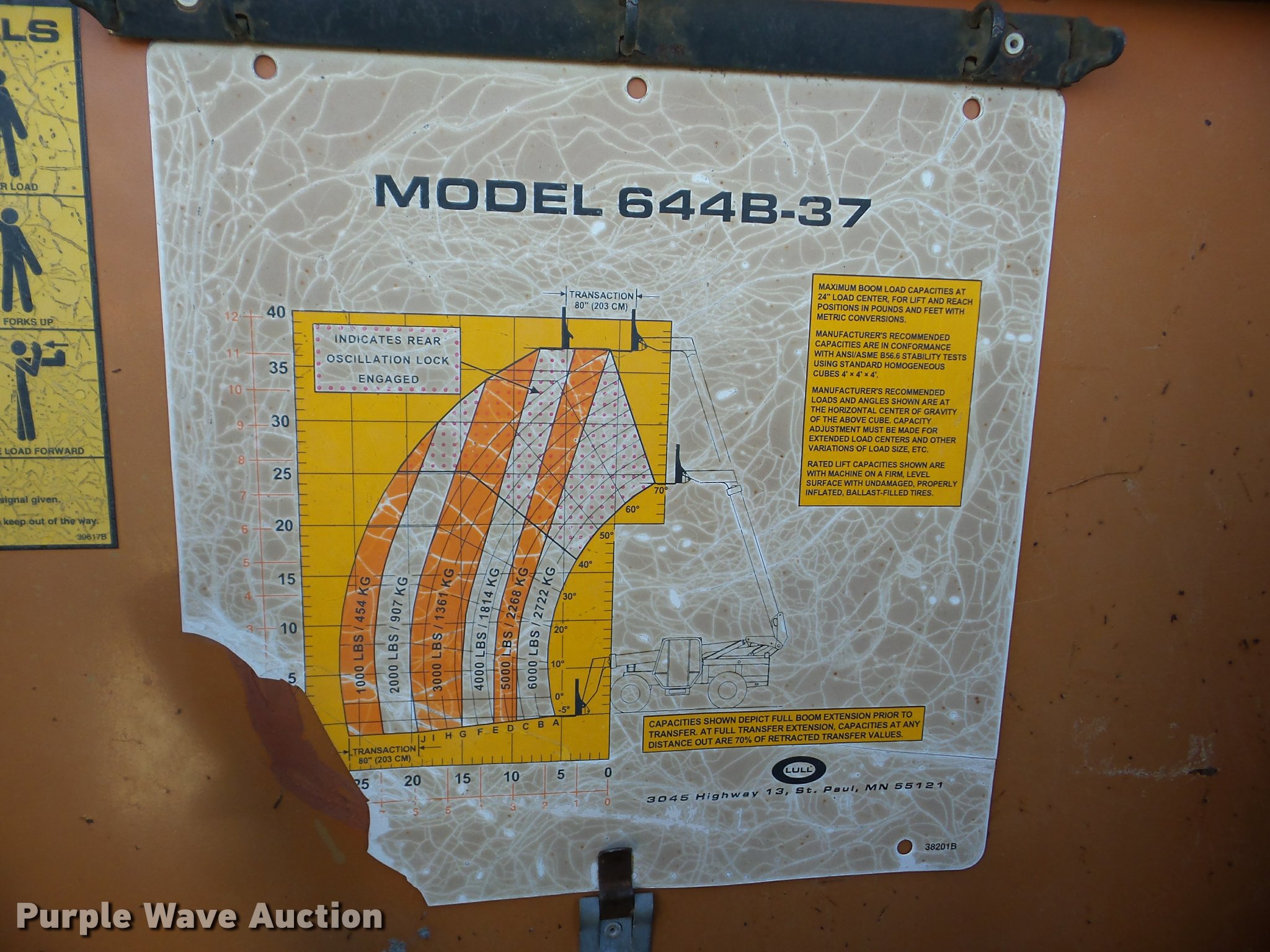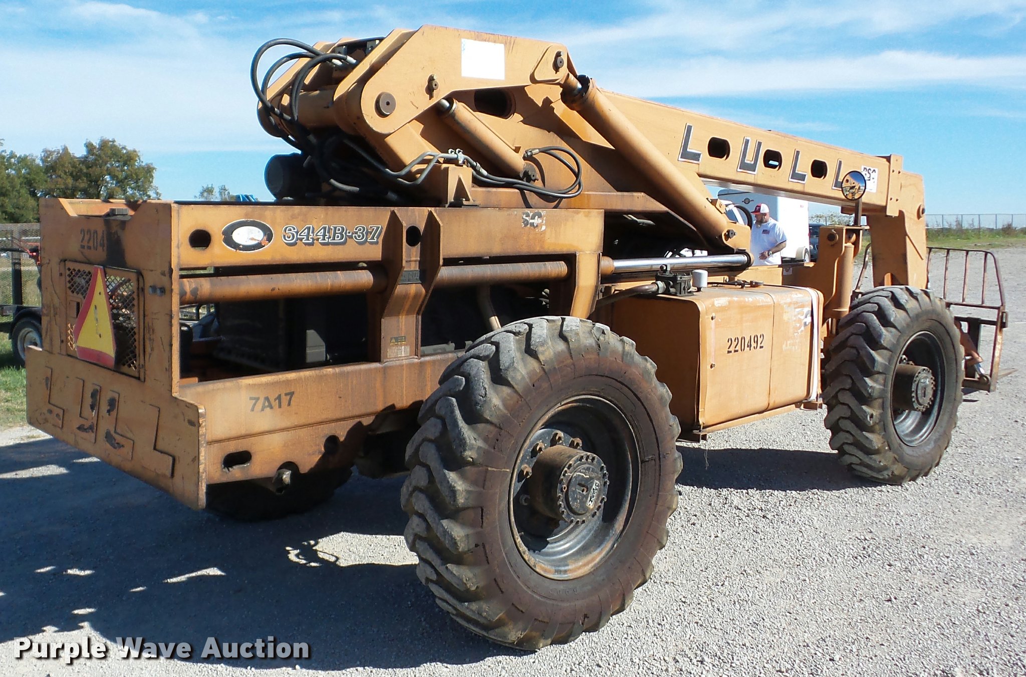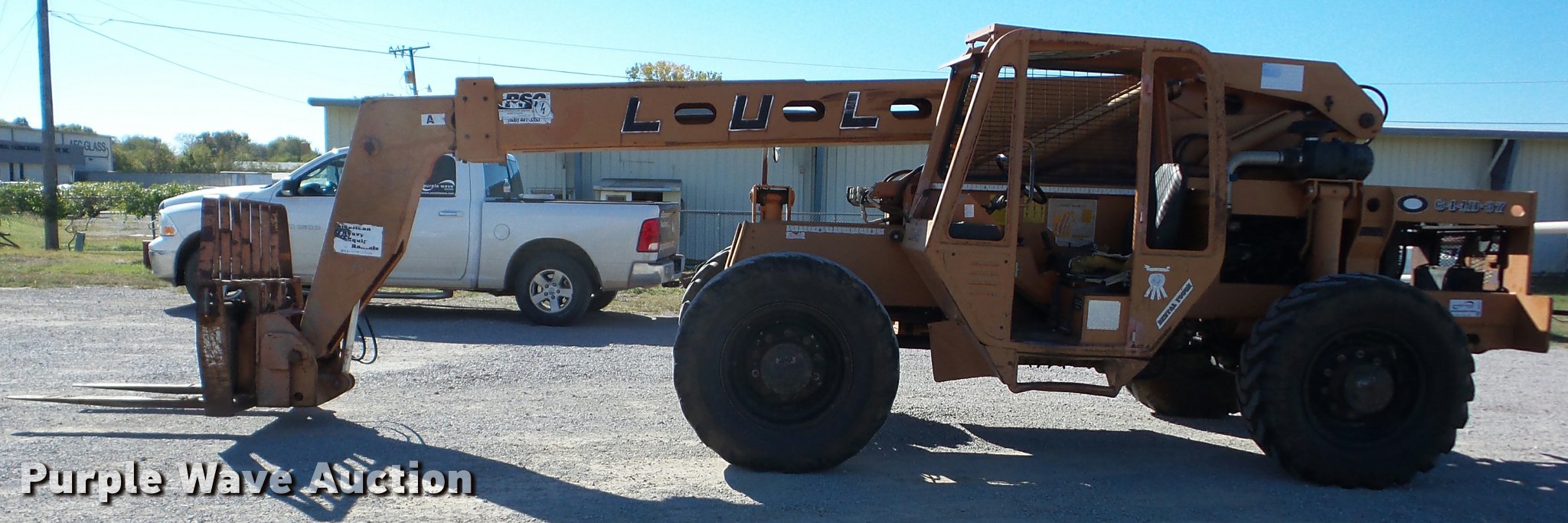 Purple Wave is selling a used Telehandler in Oklahoma. This item is a Lull 644B-37 telehandler with the following: 5,403 hours on meter, John Deere four cylinder diesel engine, Shuttle shift transmission, 4F-4R gears, Four wheel drive, Crab steer, Four sheel steer, OROPS, Tilt cab, 6,000 lbs maximum lift capacity, 37' maximum lift heights, 25' maximum reach, 48" fork length, Auxiliary hydraulics, Tilt carriage, Hydraulic leveling, 13.00-24 tires, Non-operational boom slide, Serial 97V12N21-891, Unit# 7A17