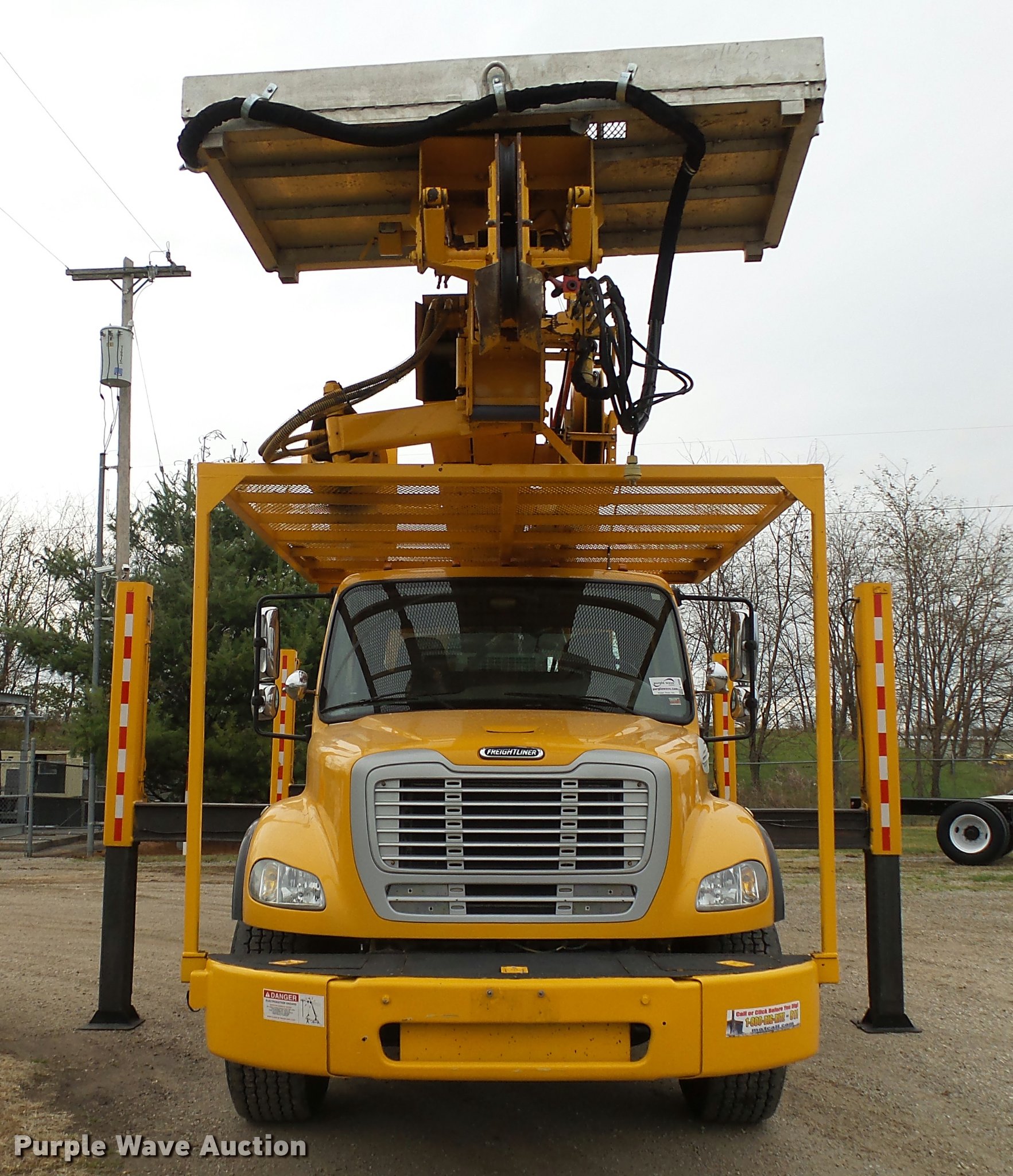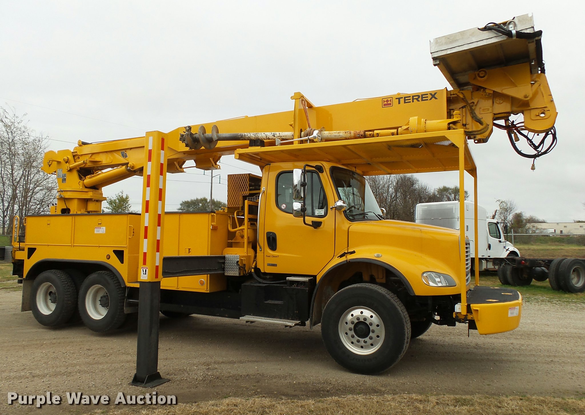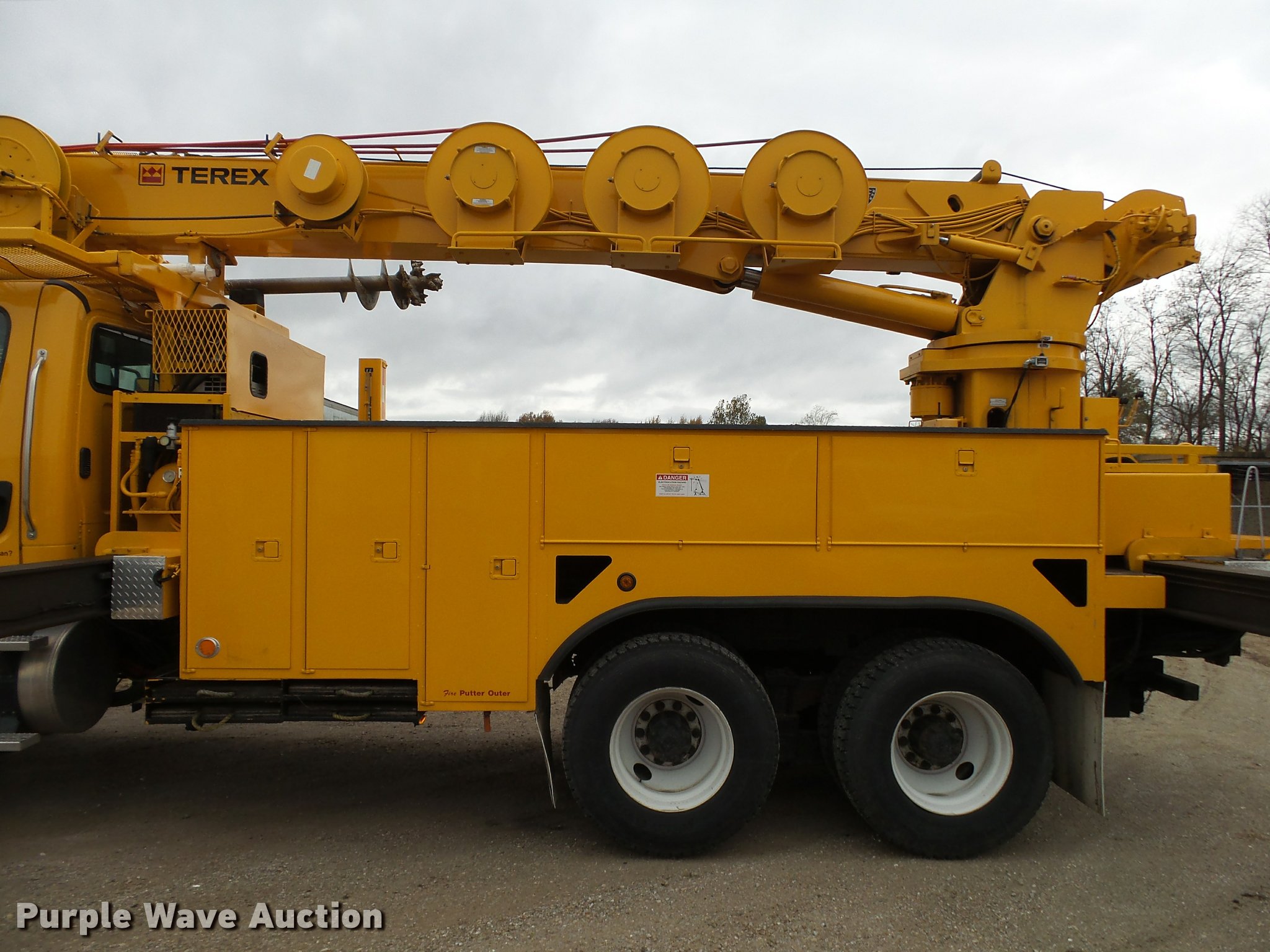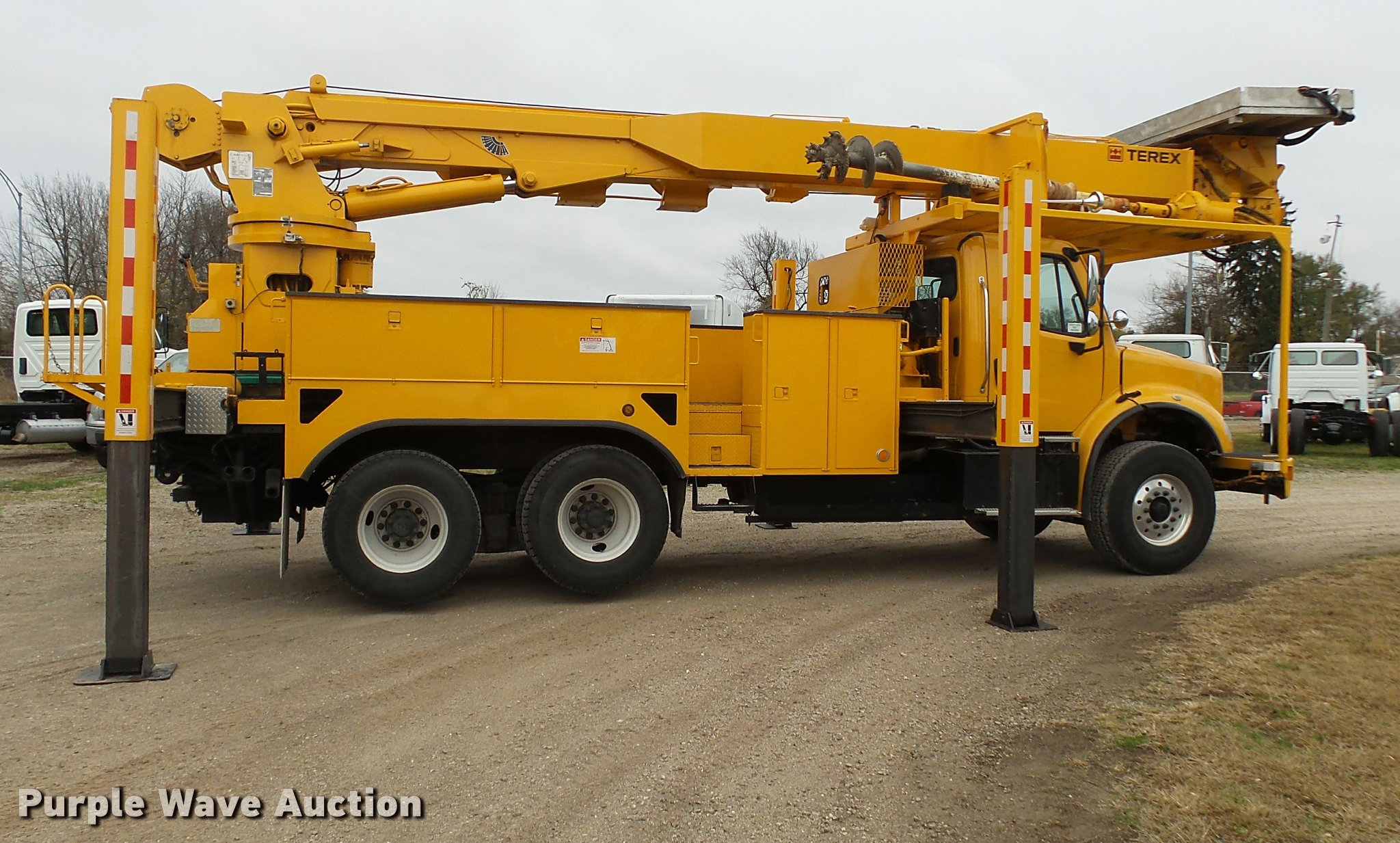 Purple Wave is selling a used Bucket Truck in Missouri. This item is a 2007 Freightliner Business Class M2 digger derrick truck with the following: 36,166 actual miles, 2,523 hours on meter, Caterpillar C13 12.5L L6 turbo diesel engine, Eaton Fuller 8LL nine speed manual transmission, Tandem axle, AC and heat, AM/FM, Power windows and locks, Power and heated mirrors, Air suspension seat, Backup alarm, Air ride cab, PTO, Terex 1N11747 service bed, Serial 1N1747, 18'L, Shelving, Slideout drawers, Utility rack, Catwalk, Work lights, Pintle hitch, Trailer wiring, Terex General boom, Serial 2060831667, 70' boom length, Man basket, Folding platform, 1,000 lbs capacity, Ground and platform controls, Remote control, Articulating, telescopic boom, 16" auger diameter, (4) outriggers, Single exhaust stack, Single fuel tank, Hendrickson walking beam suspension, Air brakes, 425/65R22.5 front tires, 11R22.5 rear tires, GVWR 66,000 lbs, Curb side outrigger control valve leaking, Hose fitting to rear street side outrigger leaking, Boom leaked off 50 percent of load, View Inspection report