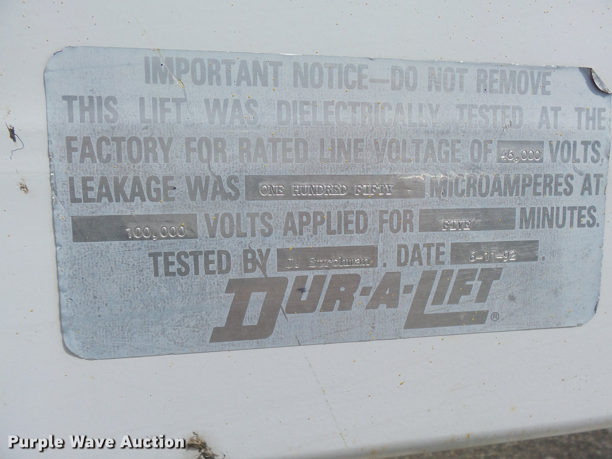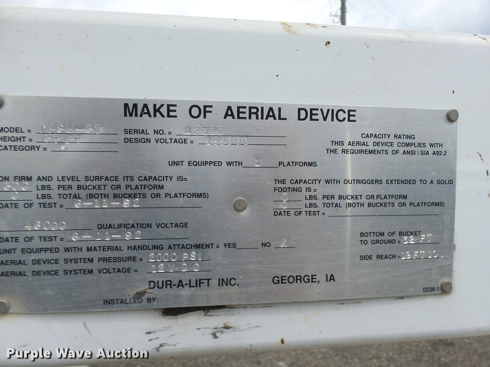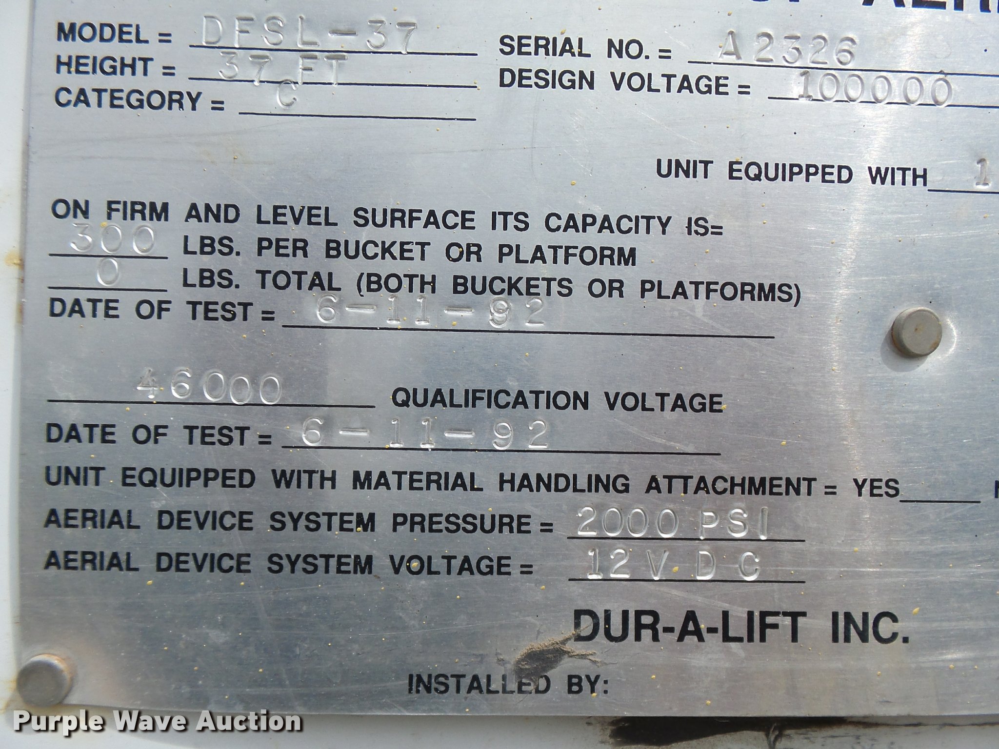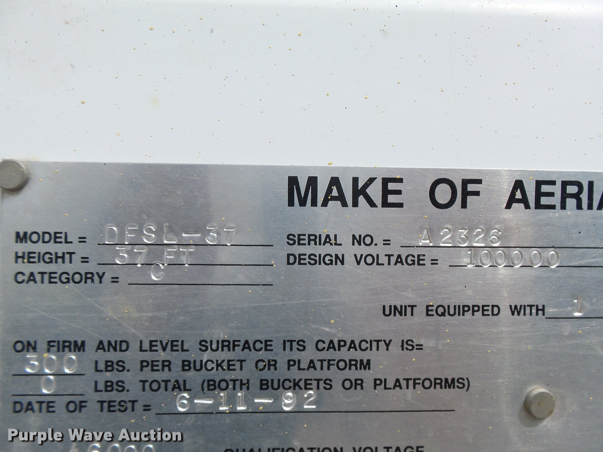 Purple Wave is selling a used Truck Part and Attach. in Kansas. This item is a Dur-a-lift DFSL-37 bucket attachment with the following: 300 lbs maximum bucket capacity, 37' maximum lift height, Serial A2326