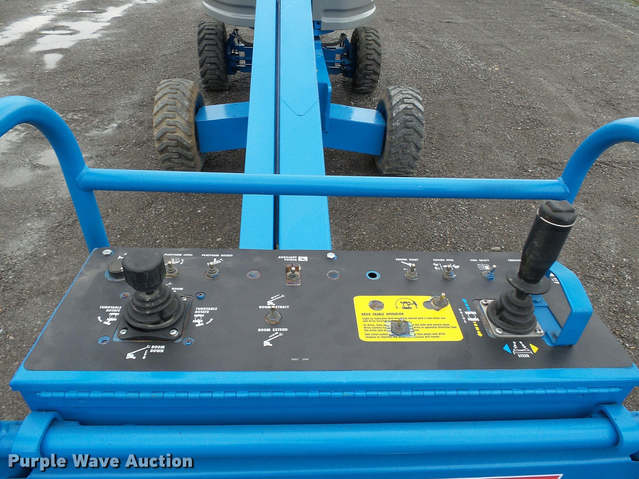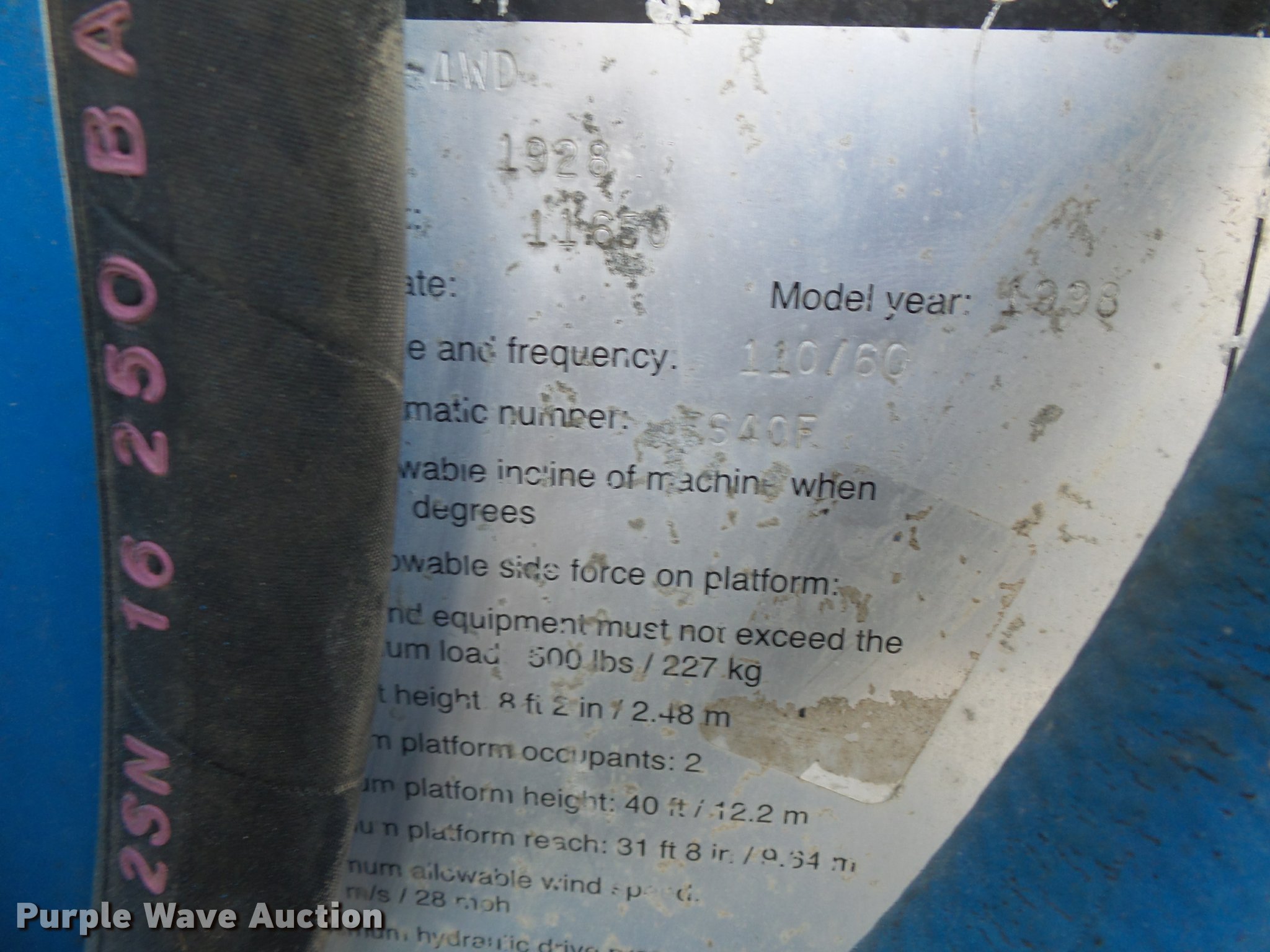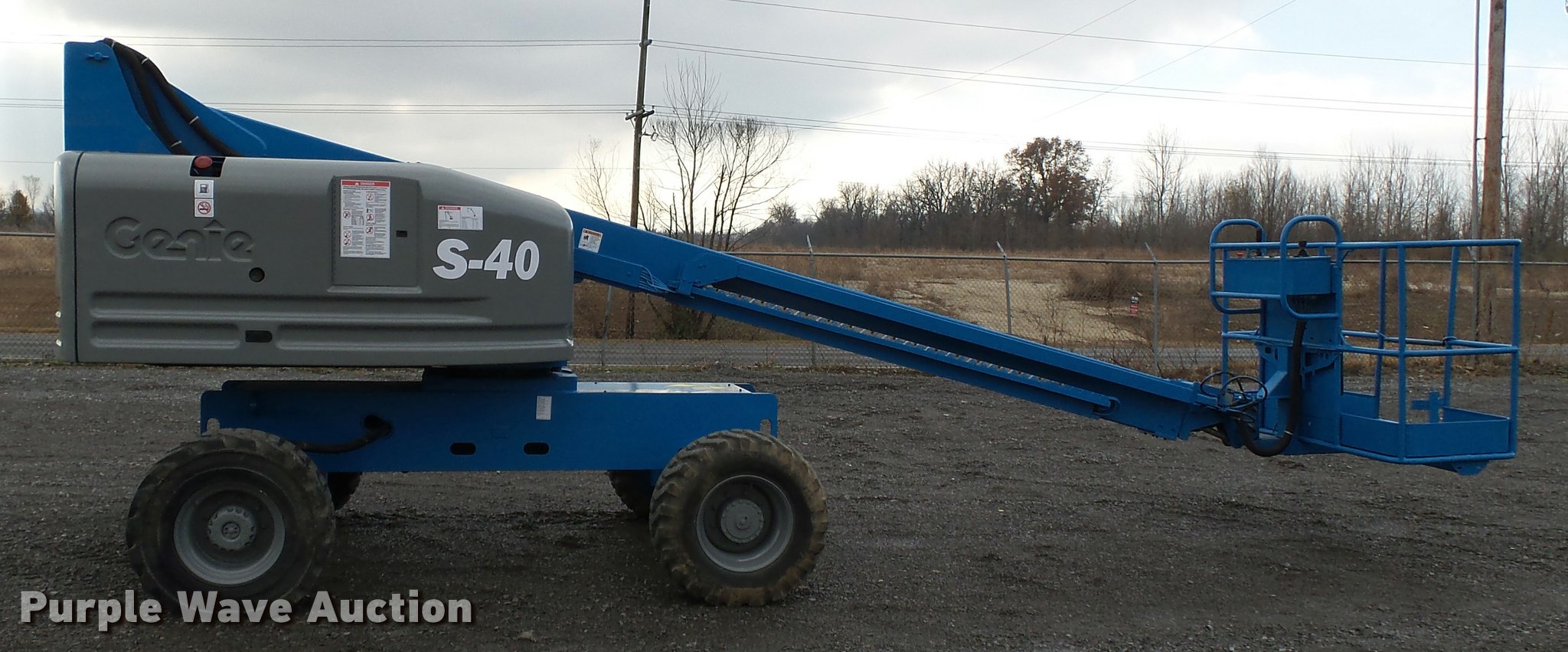 Purple Wave is selling a used Boom Lift in Missouri. This item is a Genie S40 boom lift with the following: 2,759 hours on meter, Four cylinder dual fuel engine, Four wheel drive, 12V, 500 lbs maximum lift capacity, 40' maximum reach, 40' maximum lift height, 5'L x 30"W platform, Platform and ground controls, AC power outlet, Hydraulic platform rotation, On-board generator, 110V, 12-16.5 tires, Serial 1928