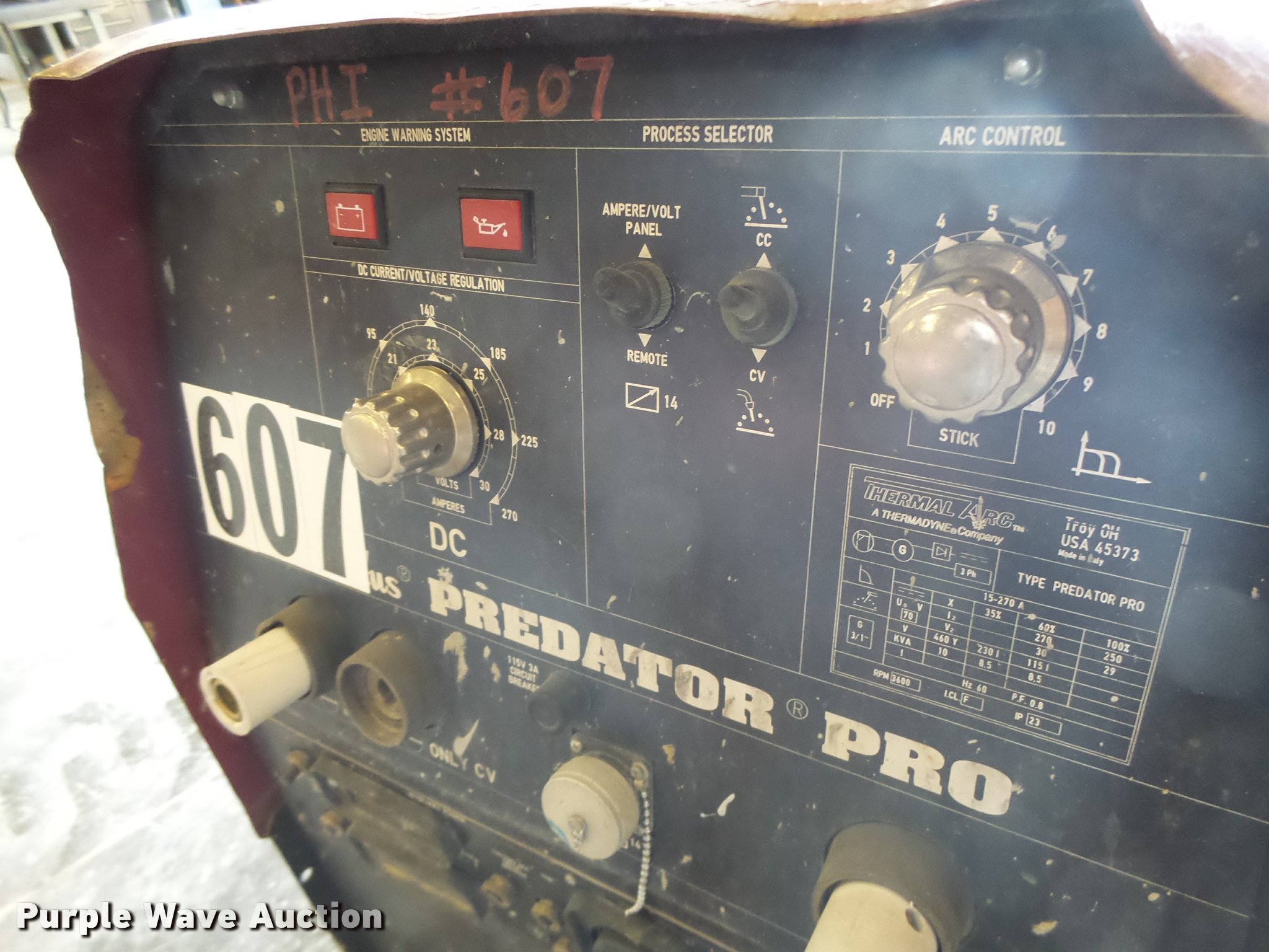Predator Pro welder. Honda CX620 single cylinder gas engine, 270 amps, Serial G02090301009. Phillips Hardy Inc. 15290 Highway 135. Boonville, MO 65233