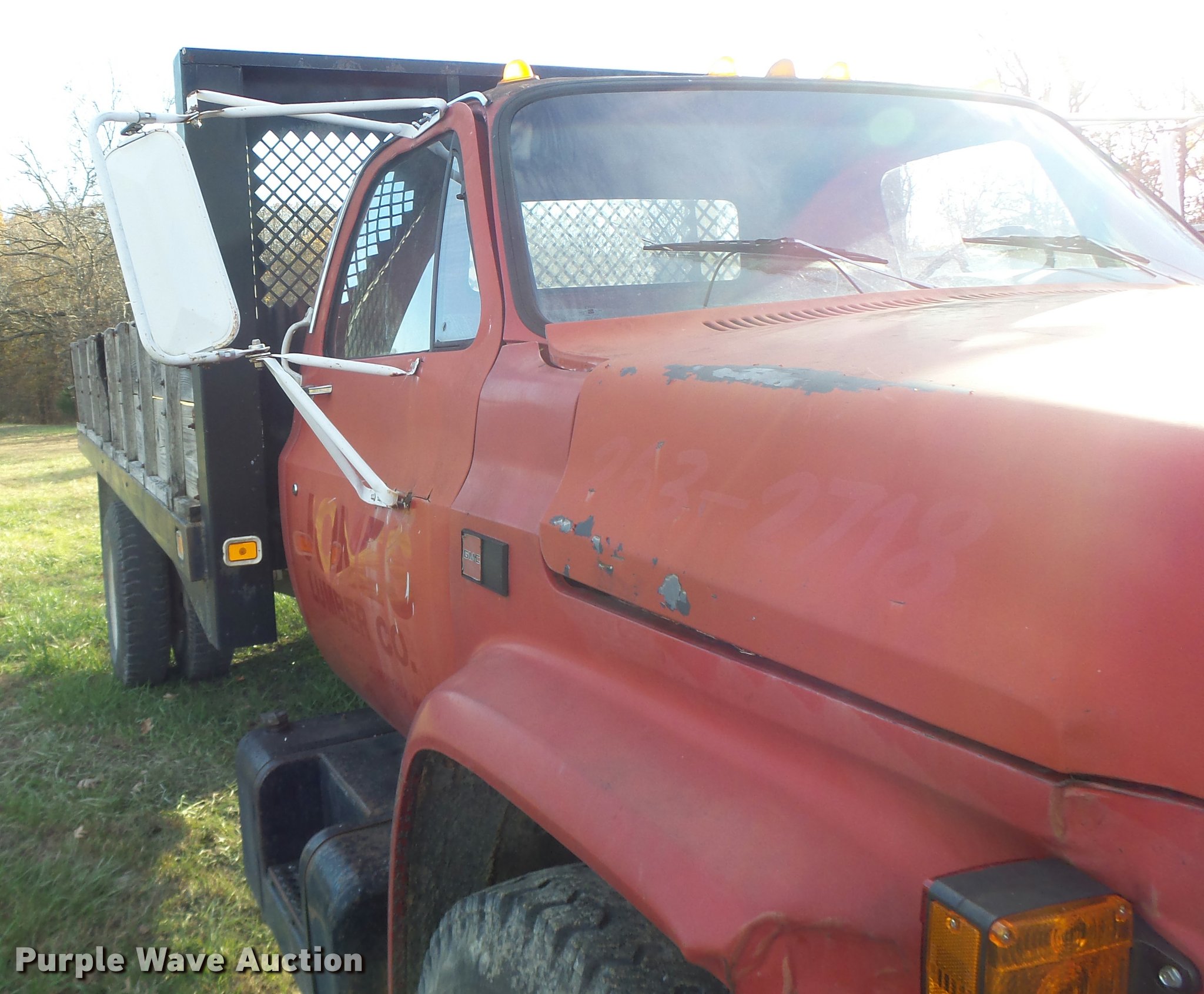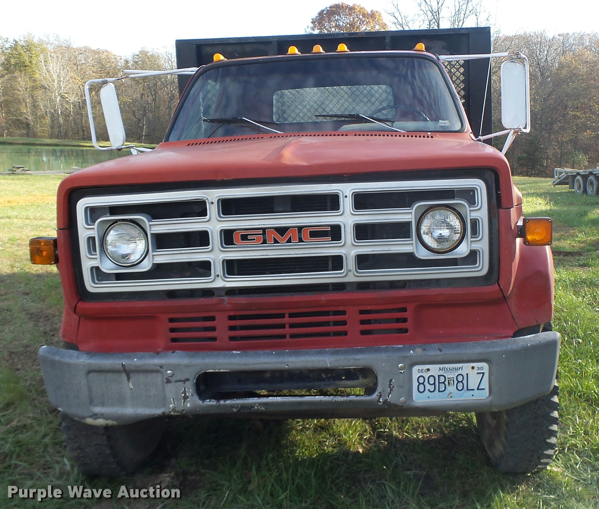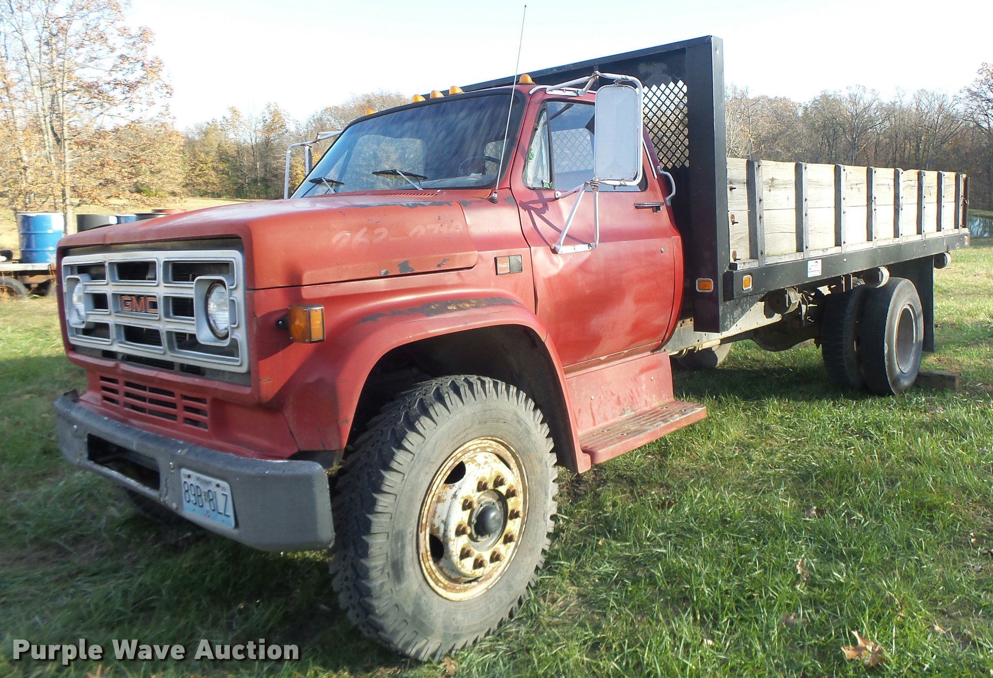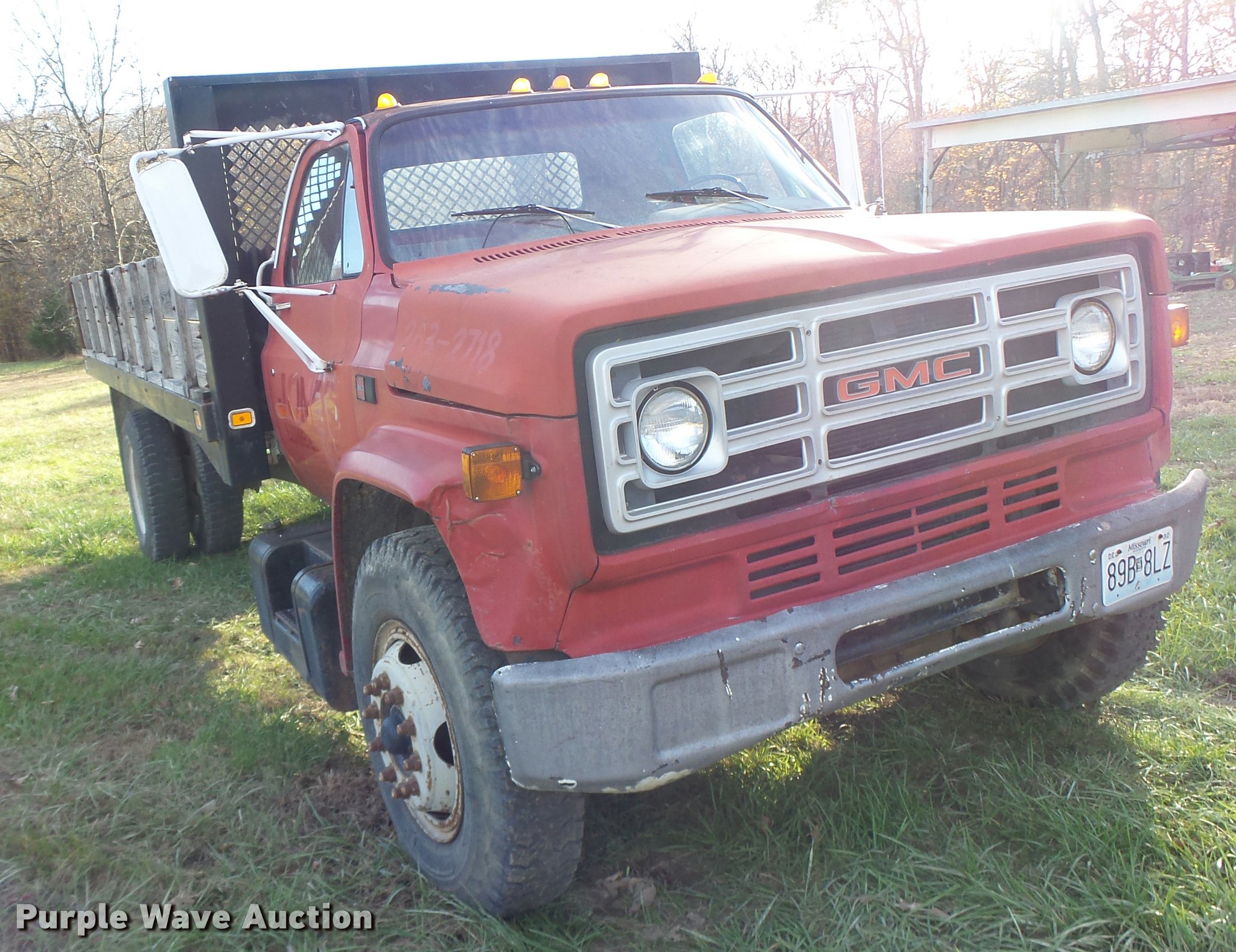 Purple Wave is selling a used Flat Bed Truck in Missouri. This item is a 1987 GMC C7D042 dump flatbed truck with the following: 180,459 miles on odometer, 6.0L V8 gas engine, Automatic transmission, Single axle, Heat, Spring suspension seat, PTO, Knapheide dump flatbed, 16'L x 8'W, Wood floor, Stake side pockets, Removeable sides, Single fuel tank, Spring suspension, Hydraulic brakes, 9.00-20 tires, GVWR 27,080 lbs