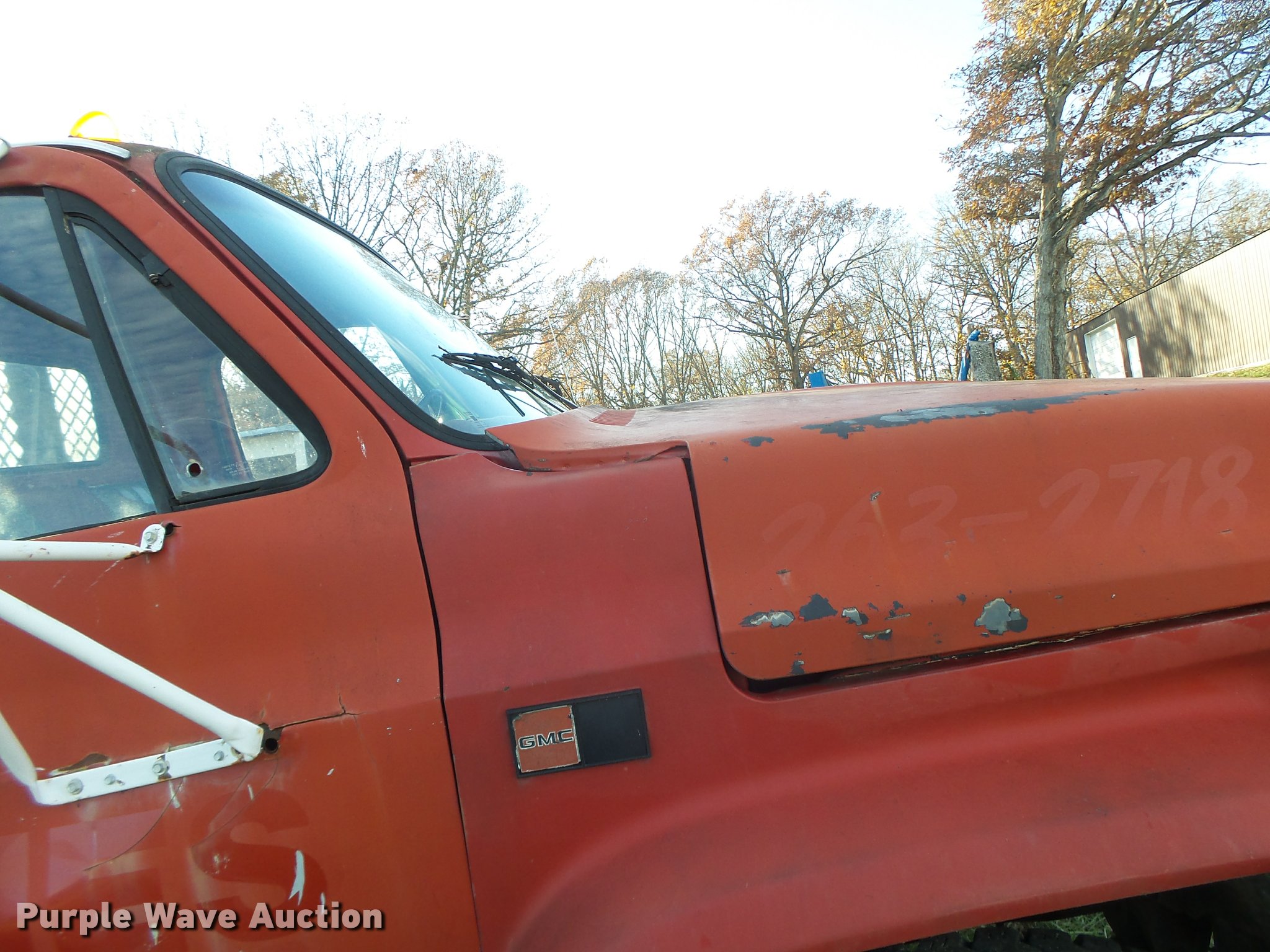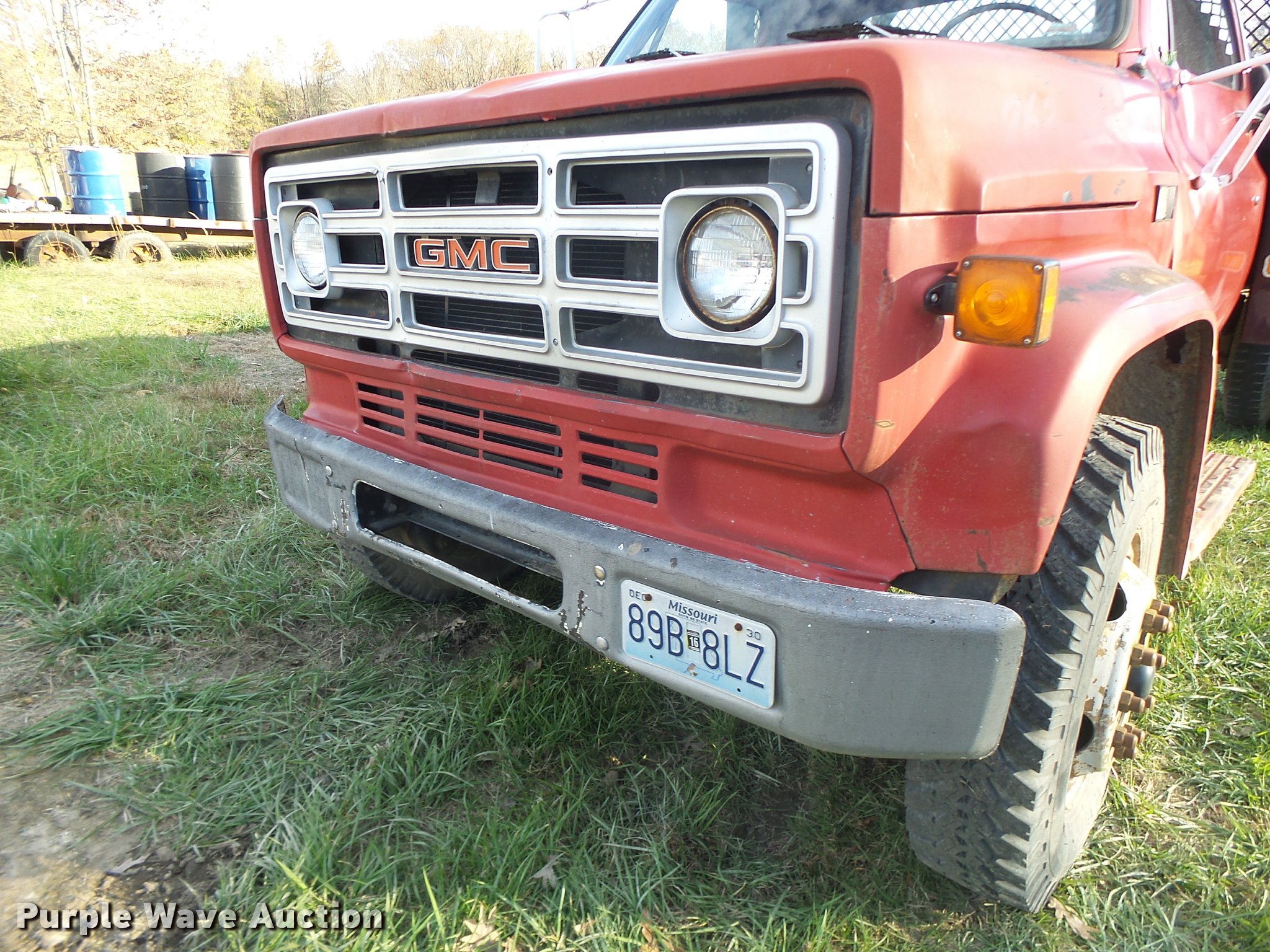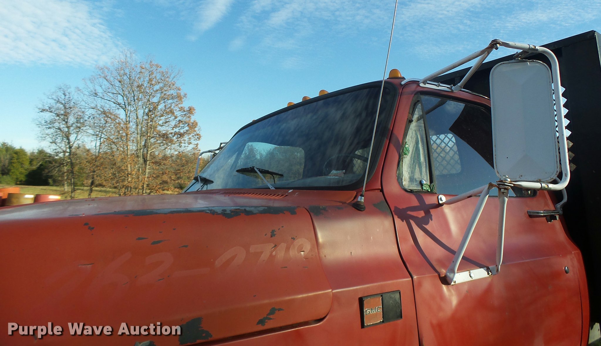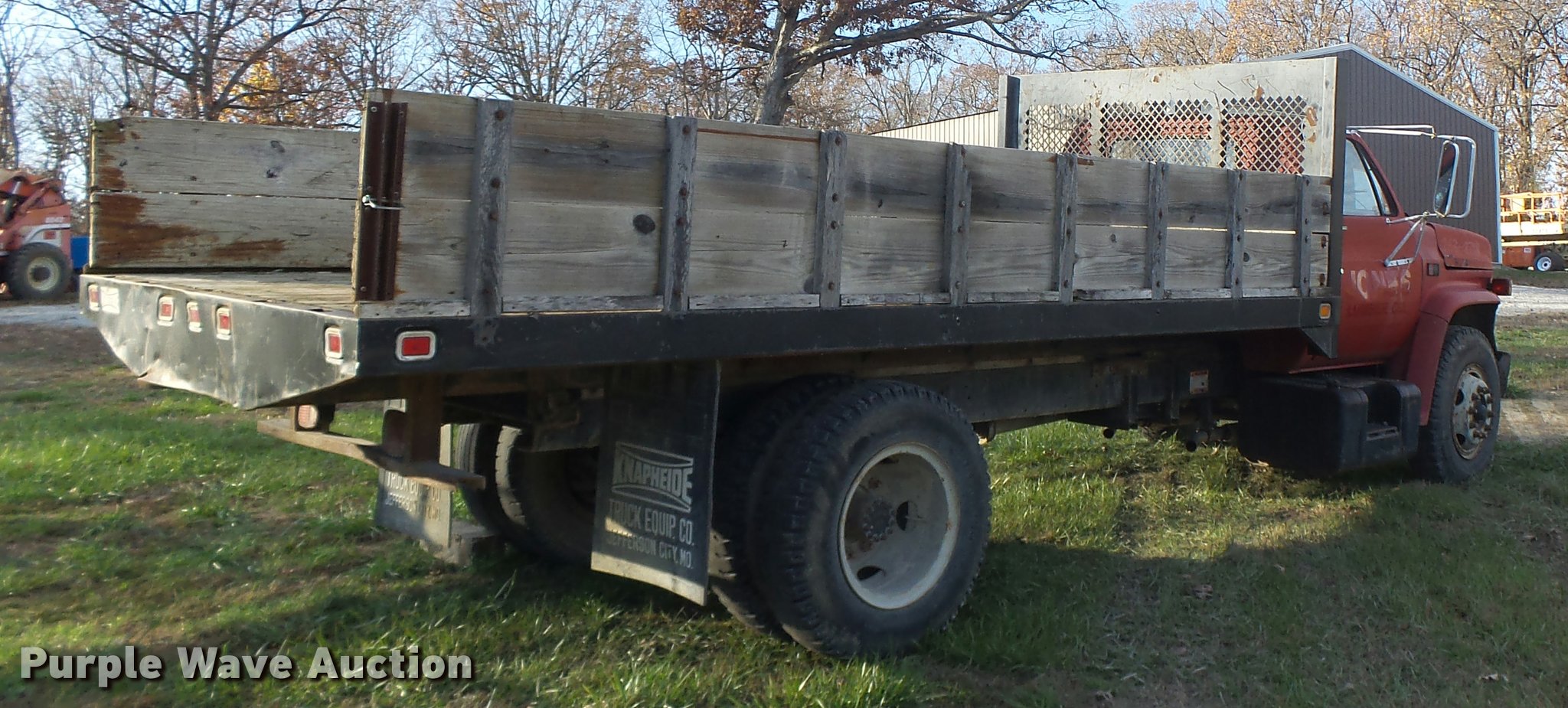 Purple Wave is selling a used Flat Bed Truck in Missouri. This item is a 1987 GMC C7D042 dump flatbed truck with the following: 180,459 miles on odometer, 6.0L V8 gas engine, Automatic transmission, Single axle, Heat, Spring suspension seat, PTO, Knapheide dump flatbed, 16'L x 8'W, Wood floor, Stake side pockets, Removeable sides, Single fuel tank, Spring suspension, Hydraulic brakes, 9.00-20 tires, GVWR 27,080 lbs