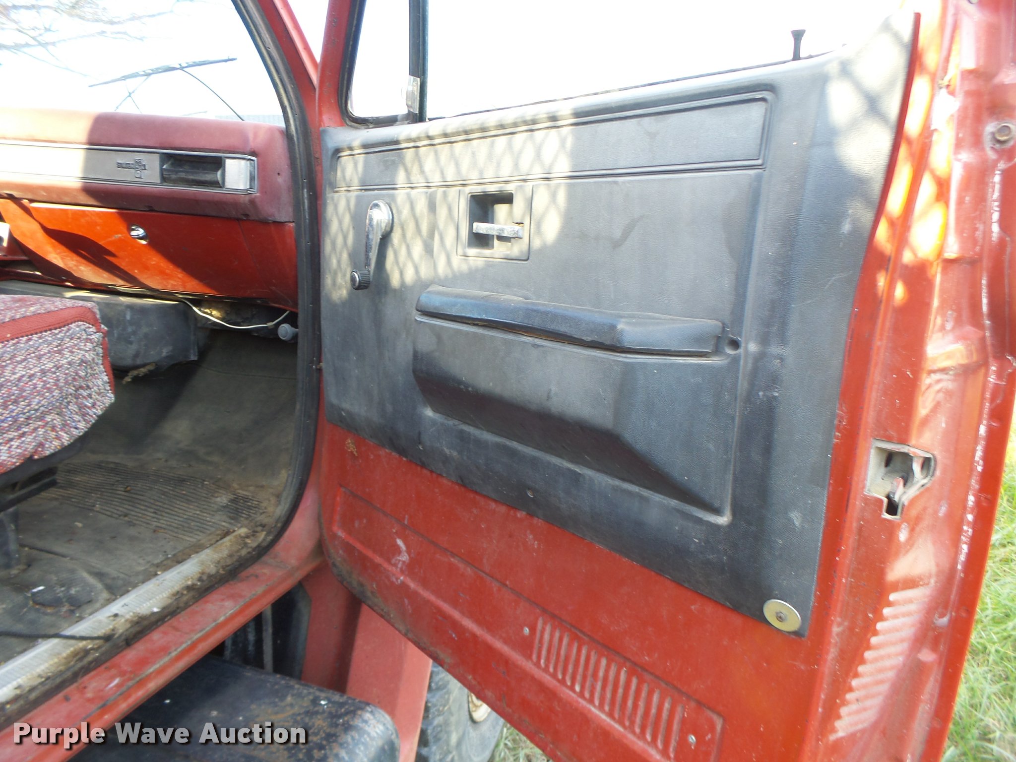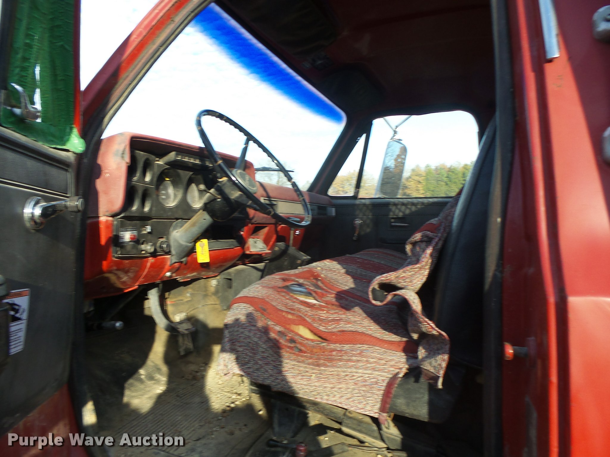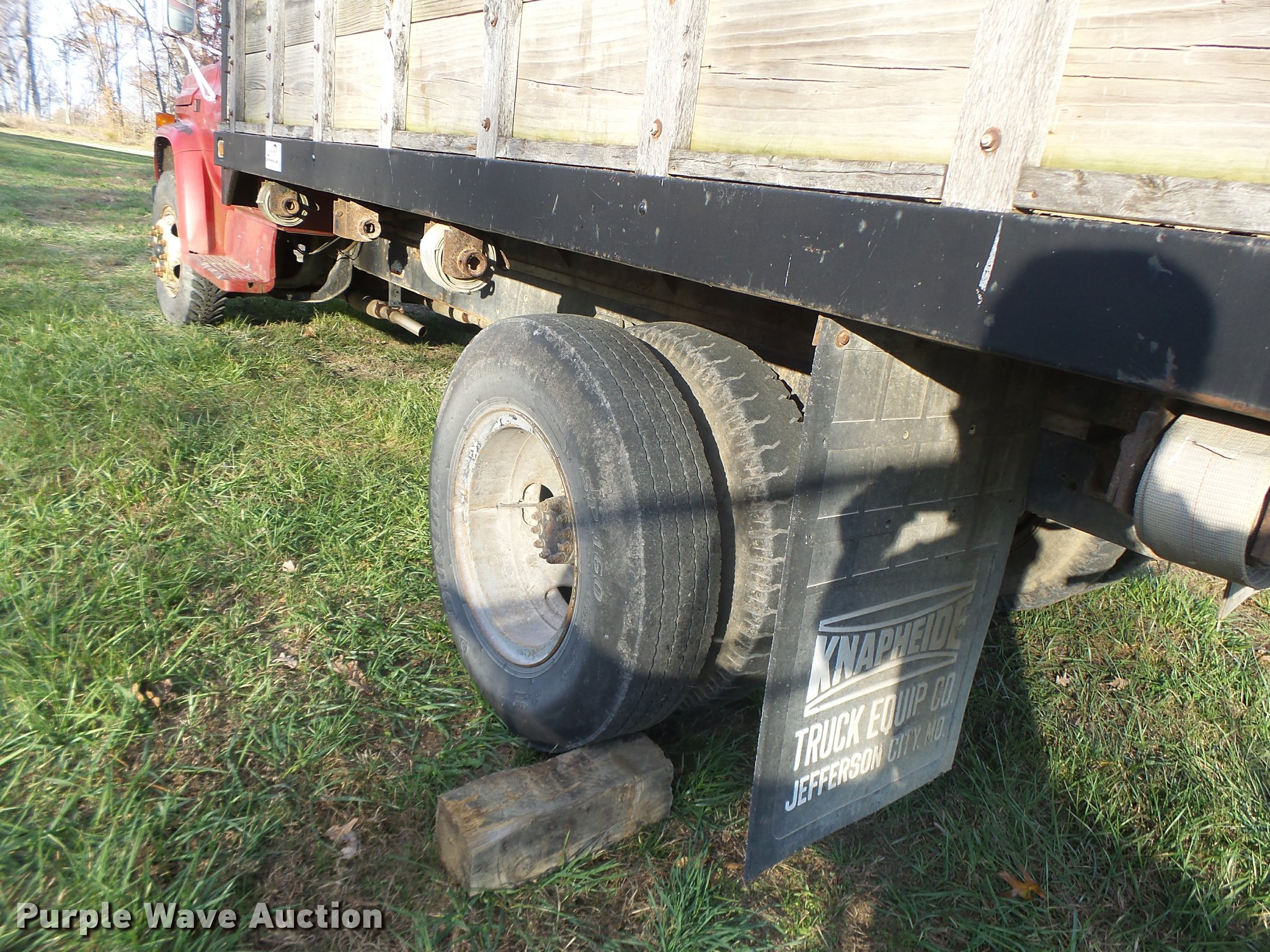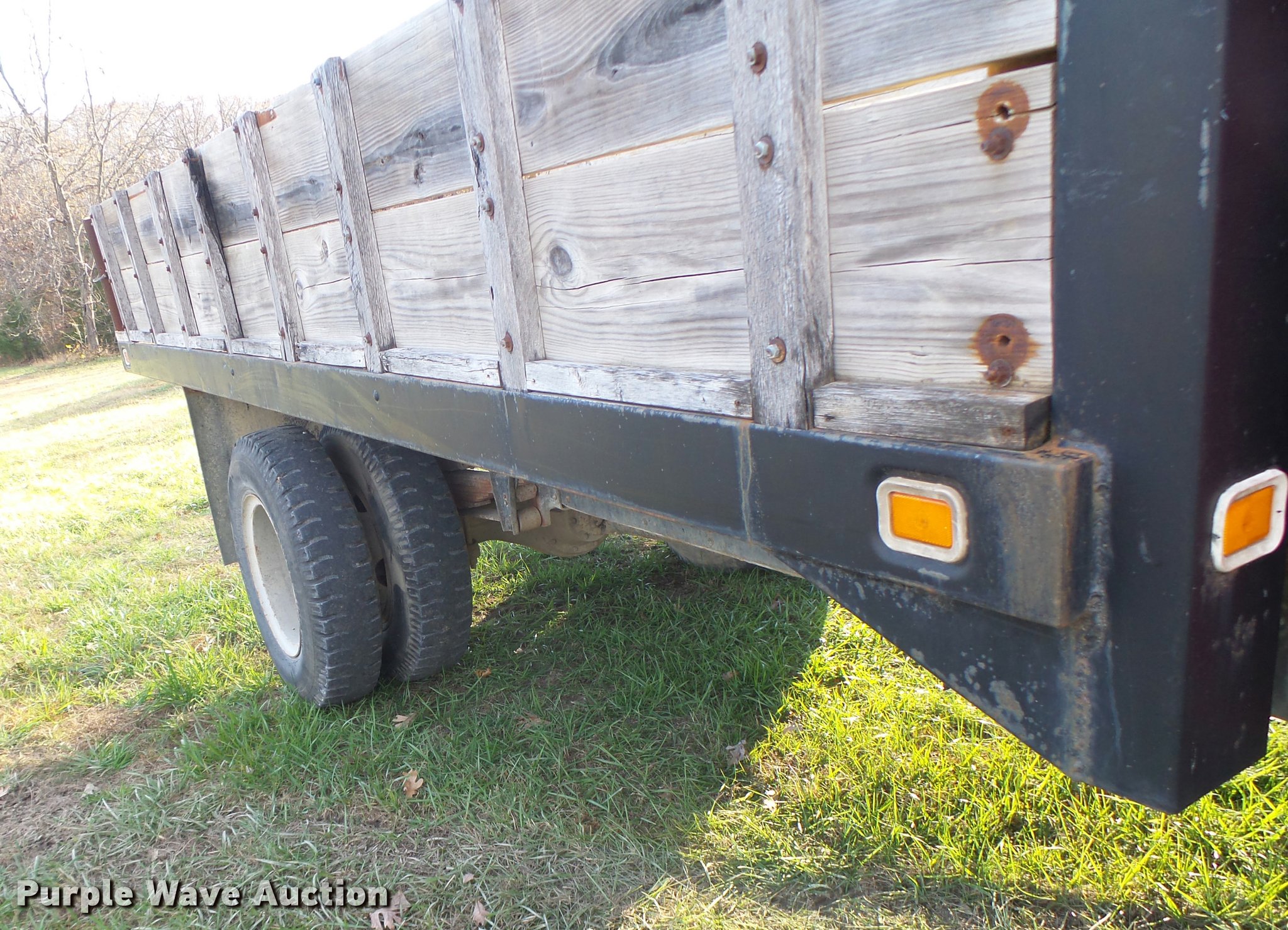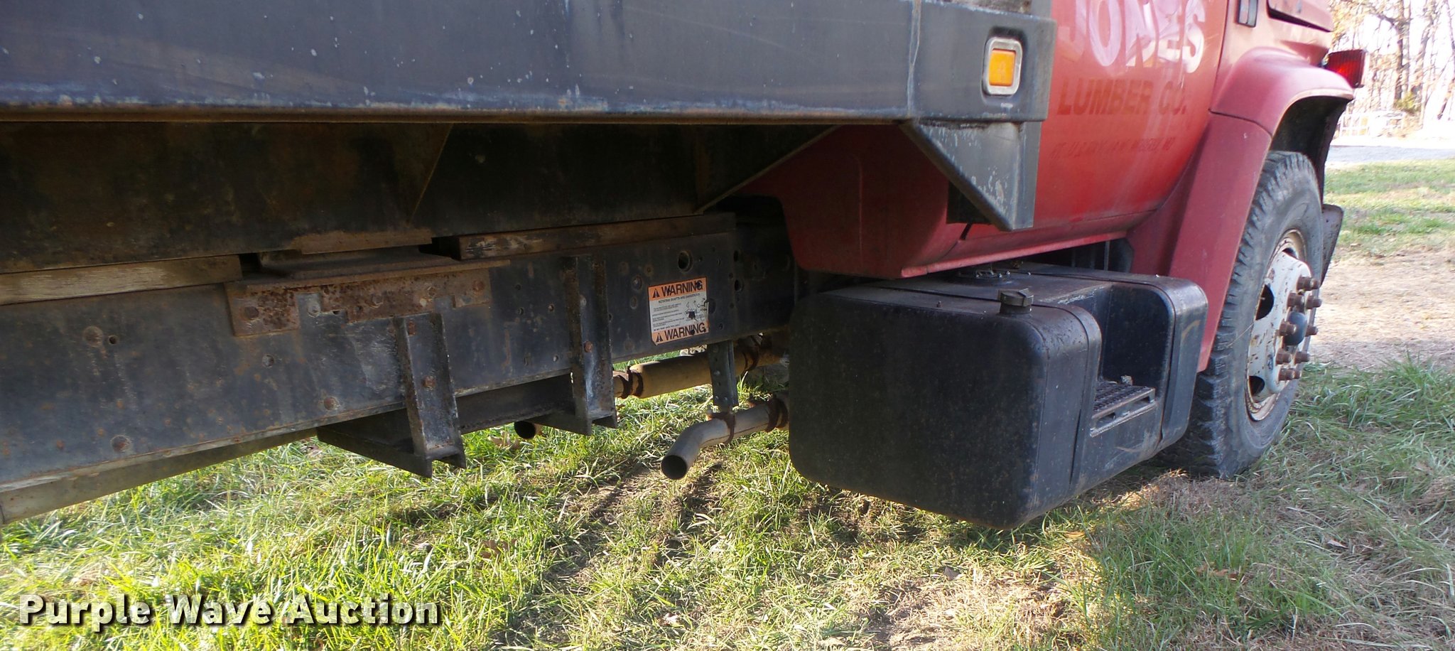 Purple Wave is selling a used Flat Bed Truck in Missouri. This item is a 1987 GMC C7D042 dump flatbed truck with the following: 180,459 miles on odometer, 6.0L V8 gas engine, Automatic transmission, Single axle, Heat, Spring suspension seat, PTO, Knapheide dump flatbed, 16'L x 8'W, Wood floor, Stake side pockets, Removeable sides, Single fuel tank, Spring suspension, Hydraulic brakes, 9.00-20 tires, GVWR 27,080 lbs