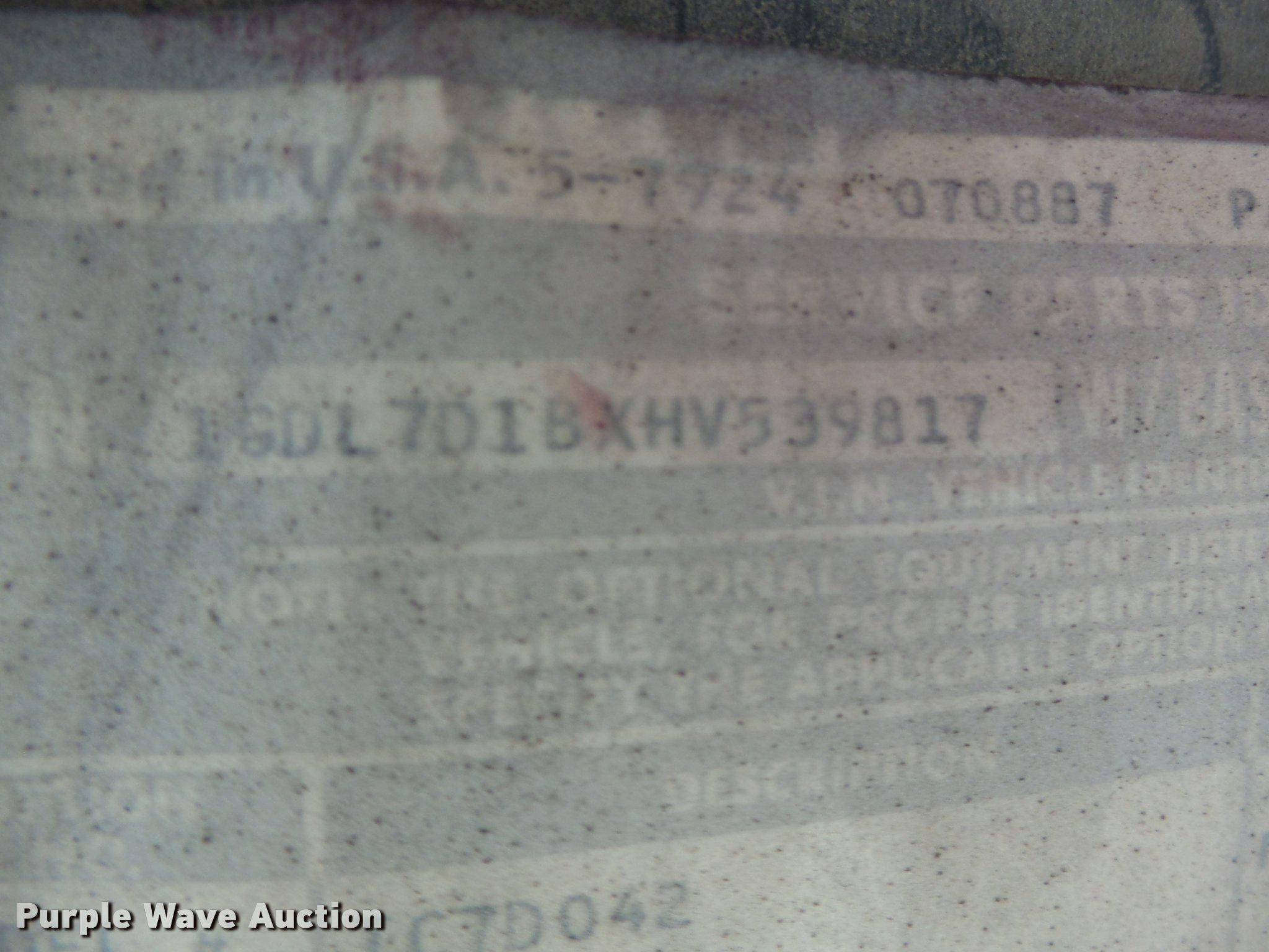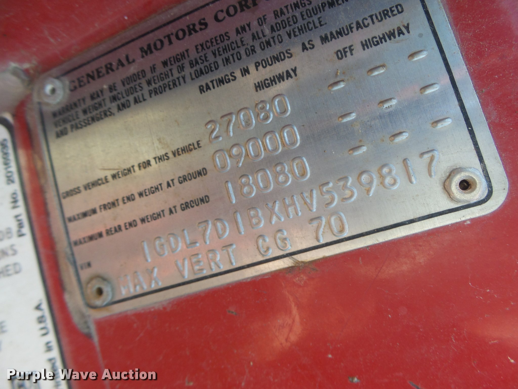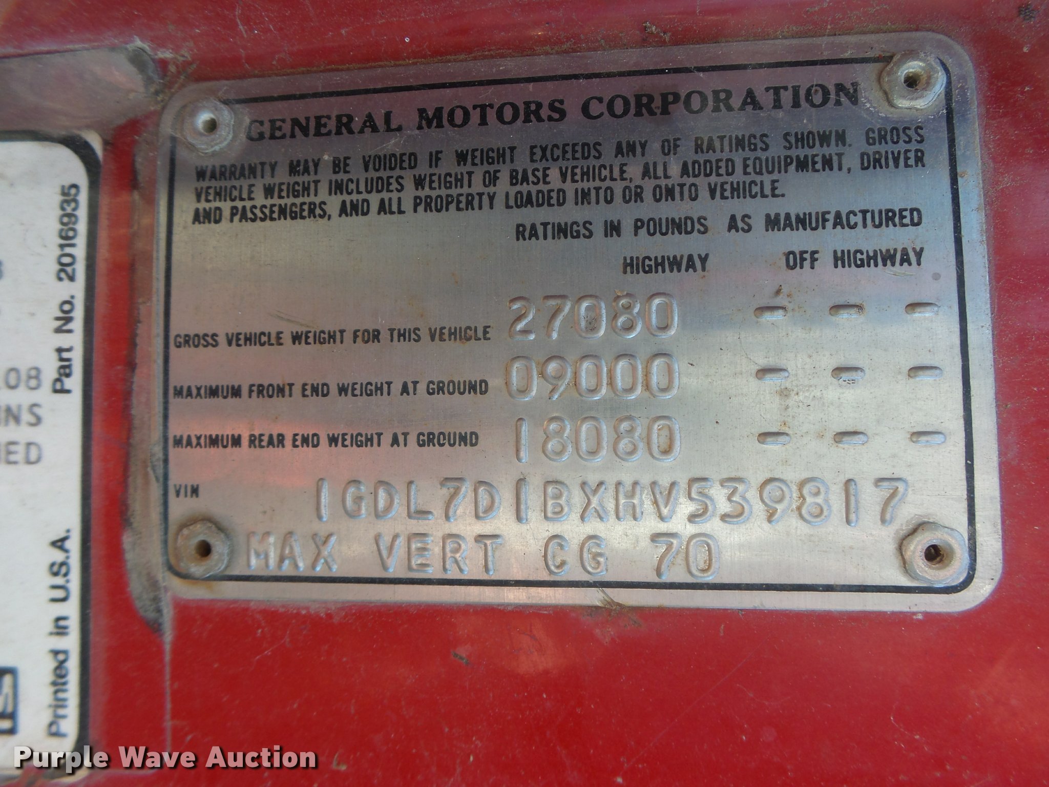 1987 GMC C7D042 dump flatbed truck. 180,459 miles on odometer, 6.0L V8 gas engine, Automatic transmission, Single axle, Heat, Spring suspension seat, PTO, Knapheide dump flatbed 16'L x 8'W , Wood floor, Stake side pockets, Removeable sides, Single fuel tank, Spring suspension, Hydraulic brakes, 9.00-20 tires, GVWR 27,080 lbs. Missouri title. 1GDL7D1BXHV539817. AA Erection. 12390 N. Highway YY. Harrisburg, MO 65256