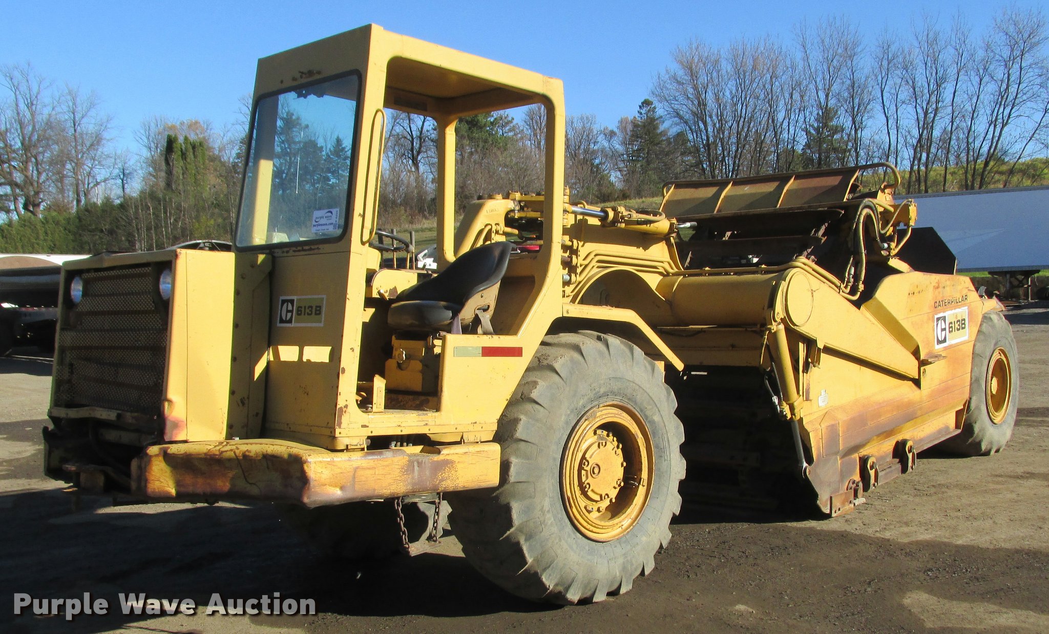Purple Wave is selling a used Elevating Scraper in Minnesota. This item is a 1979 Caterpillar 613B elevating scraper with the following: 4,522 hours on meter, Caterpillar 3208 diesel engine, Powershift transmission, 4F-2R gears, OROPS, Suspension seat, Reversible cutting edge, Elevator reverse, Hydraulic lift, Four lever scraper controls, Air brakes, 23.5-25 tires, Serial 38W6165