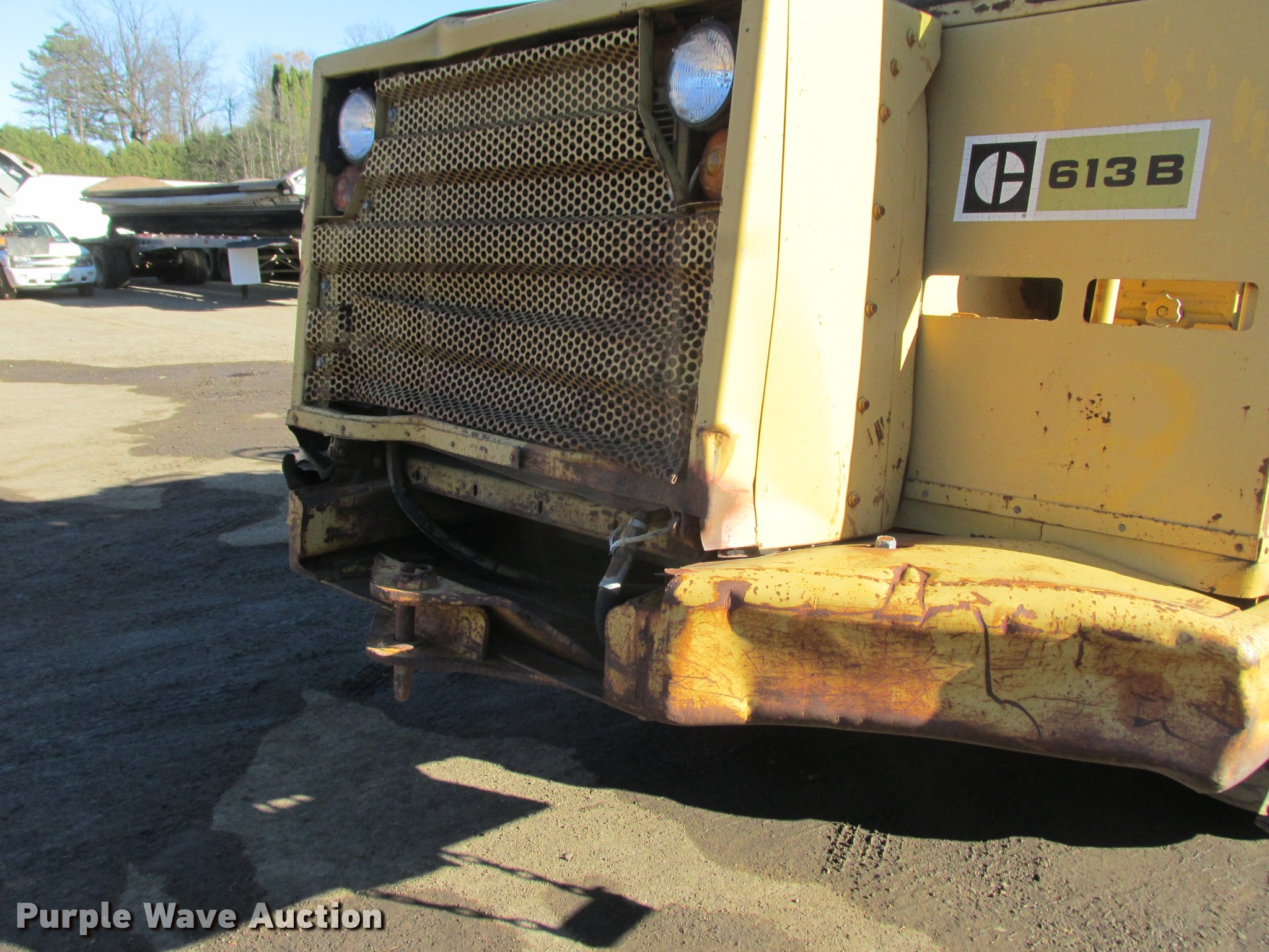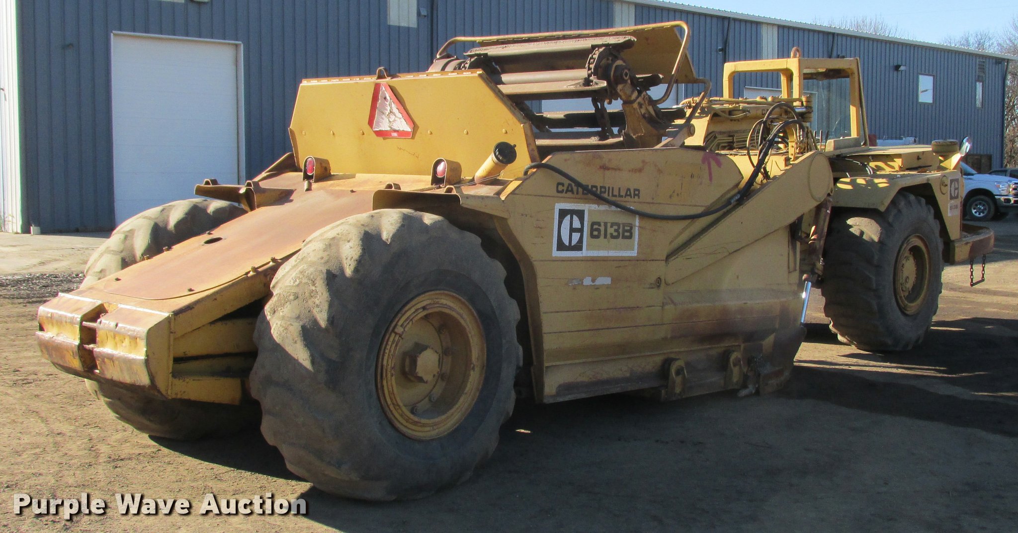 1979 Caterpillar 613B elevating scraper. 4,522 hours on meter, Caterpillar 3208 diesel engine, Powershift transmission 4F-2R gears, OROPS, Suspension seat, Reversible cutting edge, Elevator reverse, Hydraulic lift, Four lever scraper controls, Air brakes, 23.5-25 tires, Serial 38W6165. Service records and oil samples available upon request. M.B.E. Inc. 530 River Street SE. Delano, MN 55328