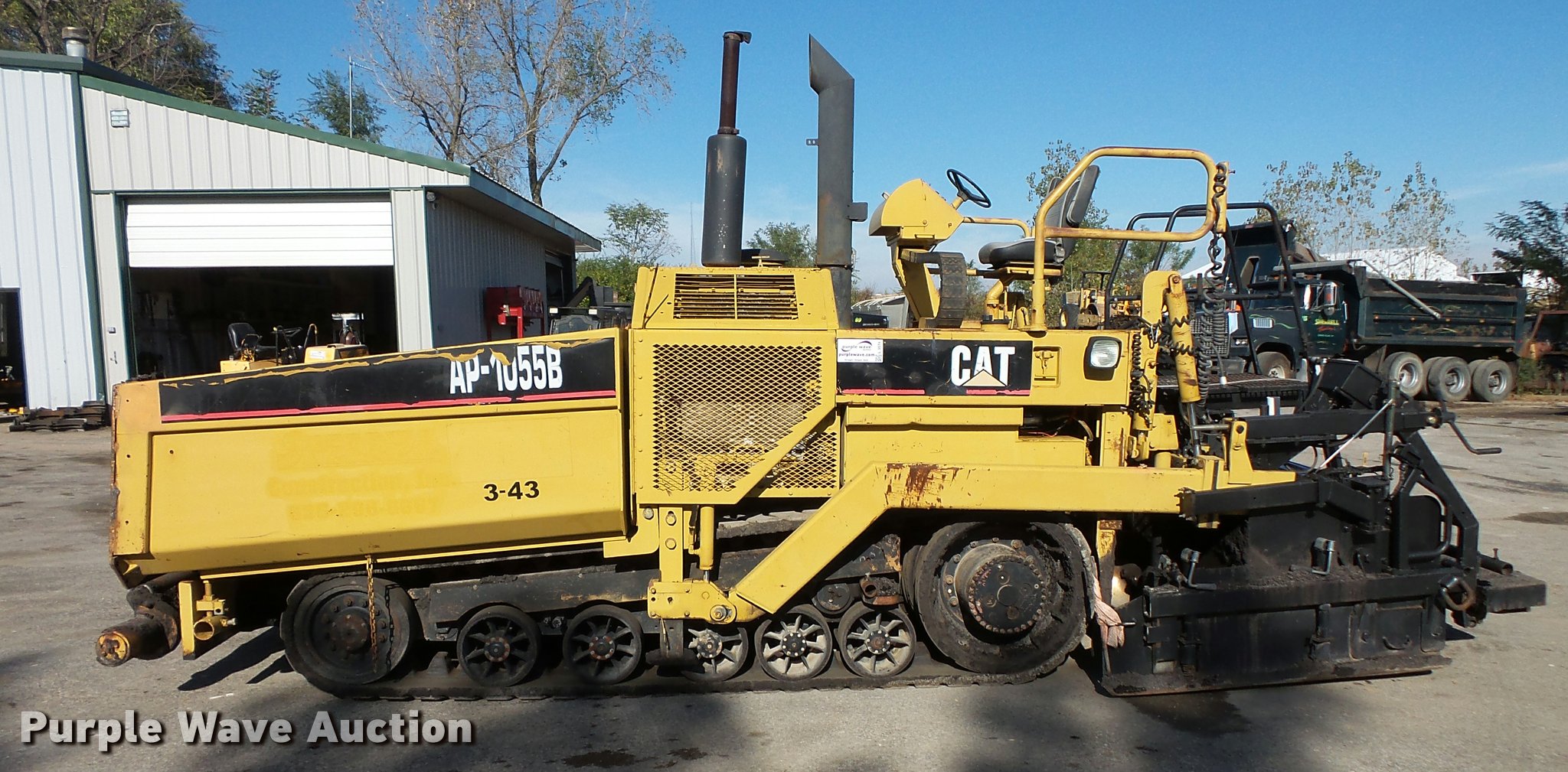 2001 Caterpillar AP-1055B paver. 6,584 hours on meter, Caterpillar 3116 six cylinder diesel engine 174 HP, Serial 98235287, Hydrostatic transmission, Joystick and steering wheel controls, Caterpillar Extend-A-Mat screed Model 10-20B, Serial 2LN03574, 10' to 20' paving width, Rubber tracks, Serial ABB00343. Sherell Construction. 1520 Old State Route 21. Arnold, MO 63010