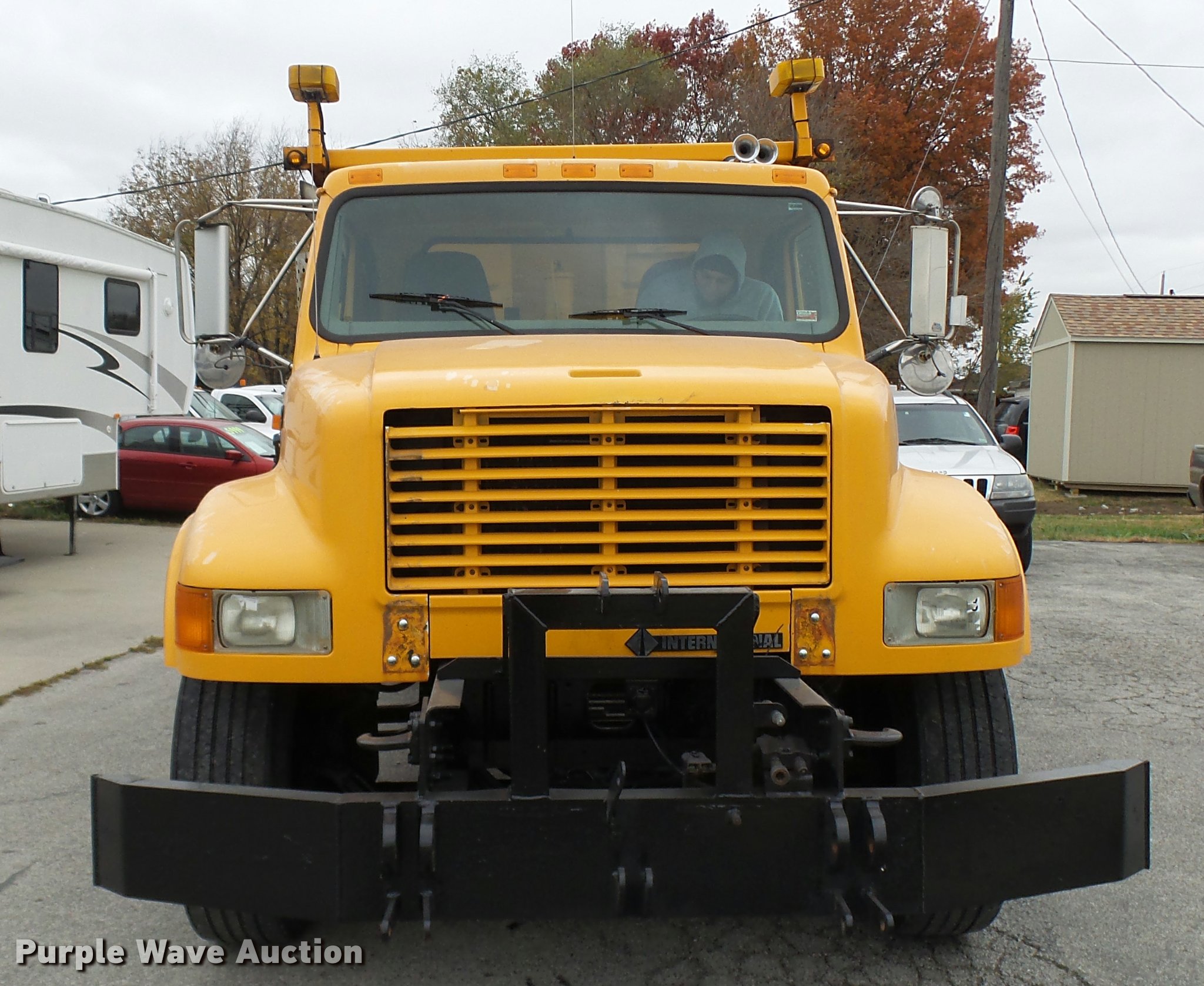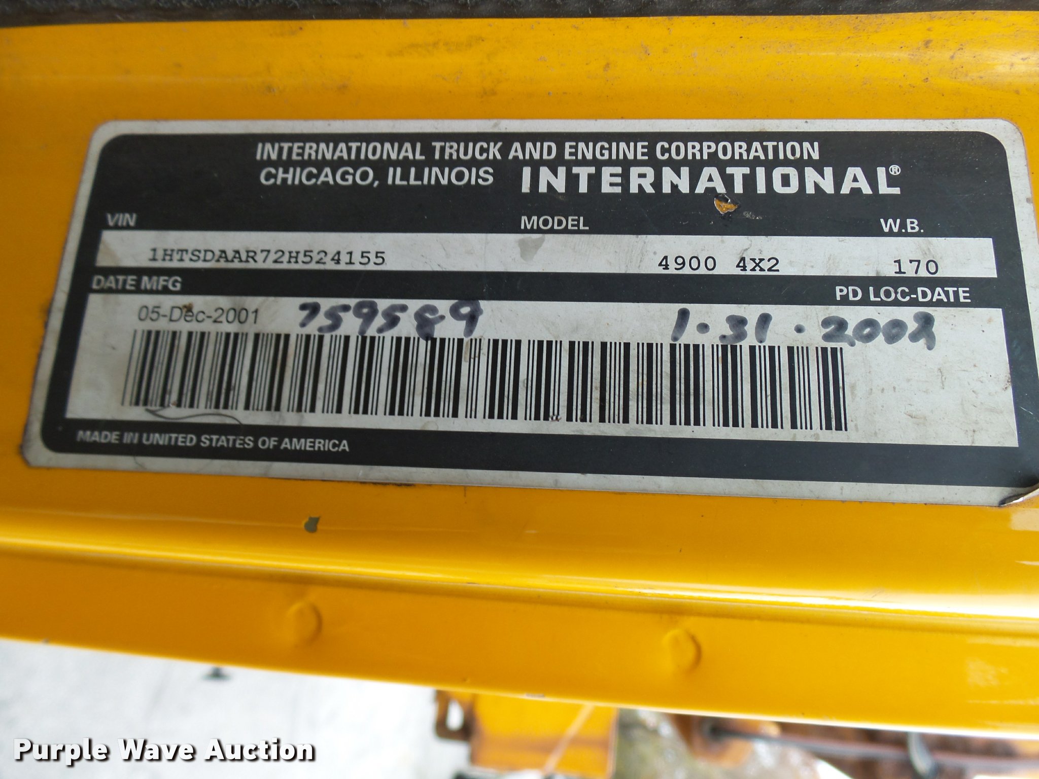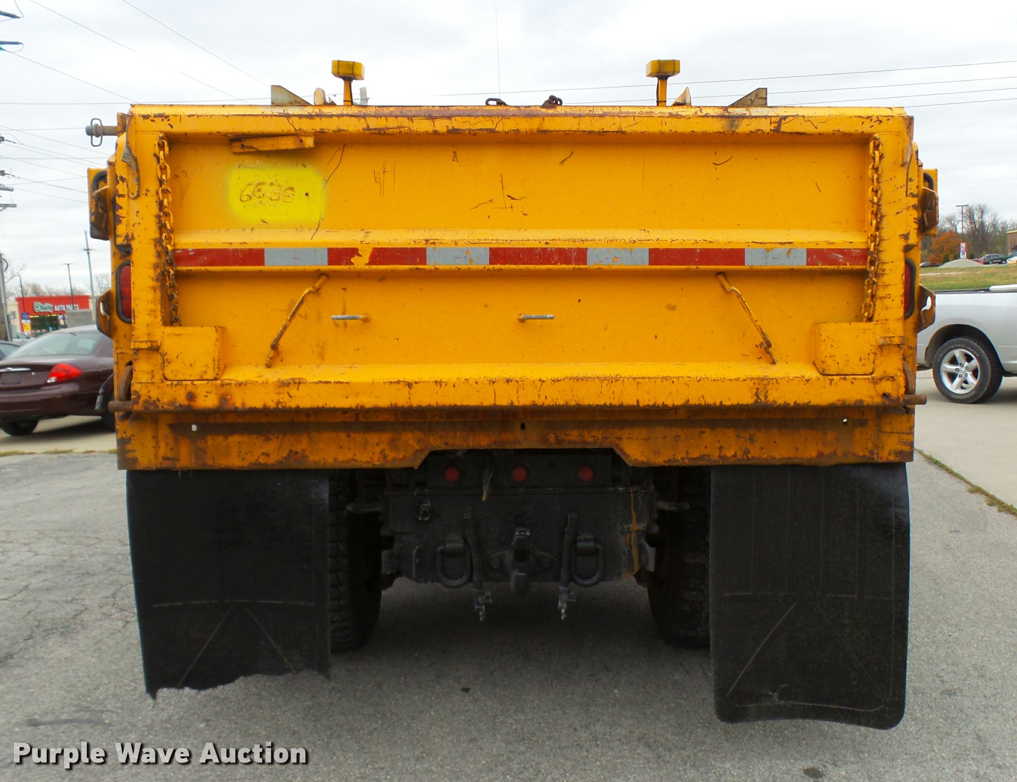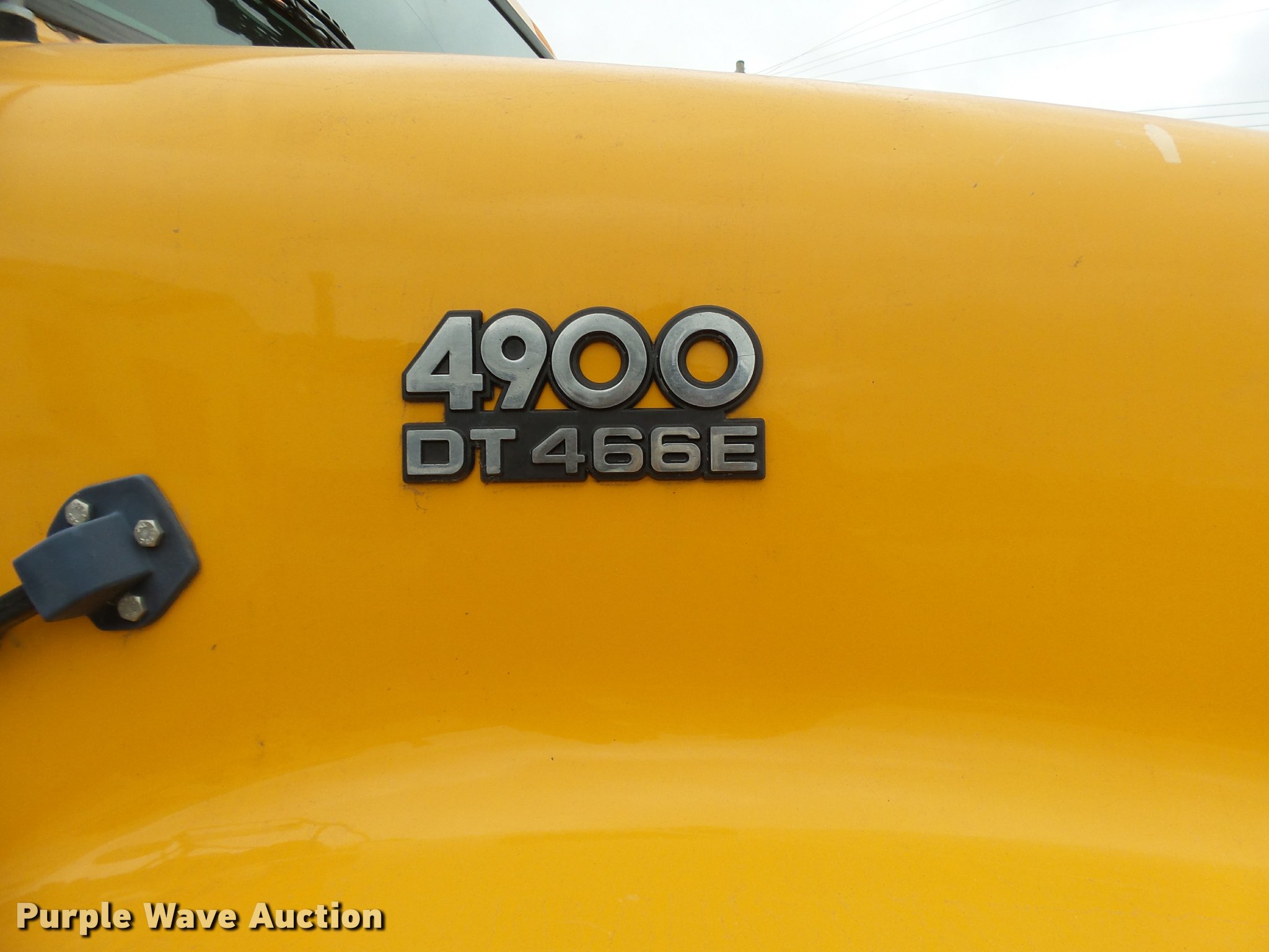 Purple Wave is selling a used Construction Dump Truck in Missouri. This item is a 2002 International 4900 dump truck with the following: 138,590 miles on odometer, International DT466 7.6L L6 diesel engine, Automatic transmission, AC and heat, Cruise, AM/FM, Power windows and mirrors, Heated mirrors, Air suspension seat, Block heater, PTO, 10'L dump bed, Model 402FT, Air operated end gate, Rear hydraulic couplers, Rear air brake coupler, Single fuel tank, Front snow plow auxiliary hydraulic couplers, Snow plow front bumper, Amber beacon light, Pintle hitch, Trailer wiring, Spring suspension, Air brakes, 315/80R22.5 tires, GVWR 35,000 lbs, FAWR 12,000 lbs, RAWR 23,000 lbs