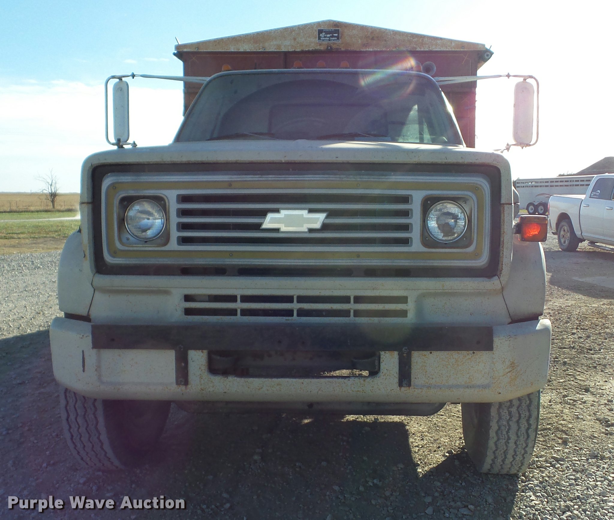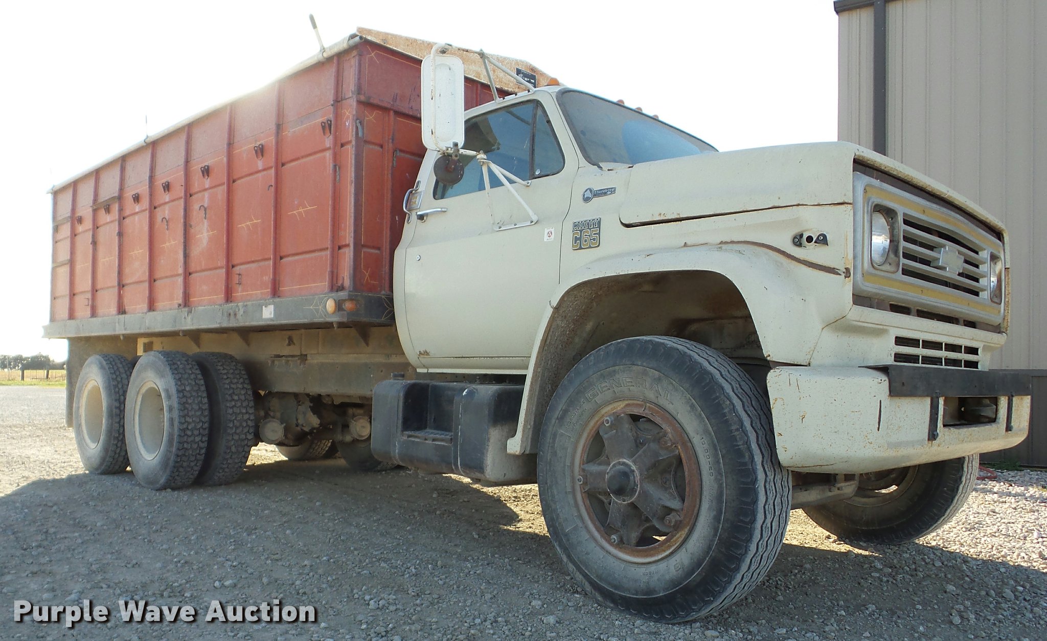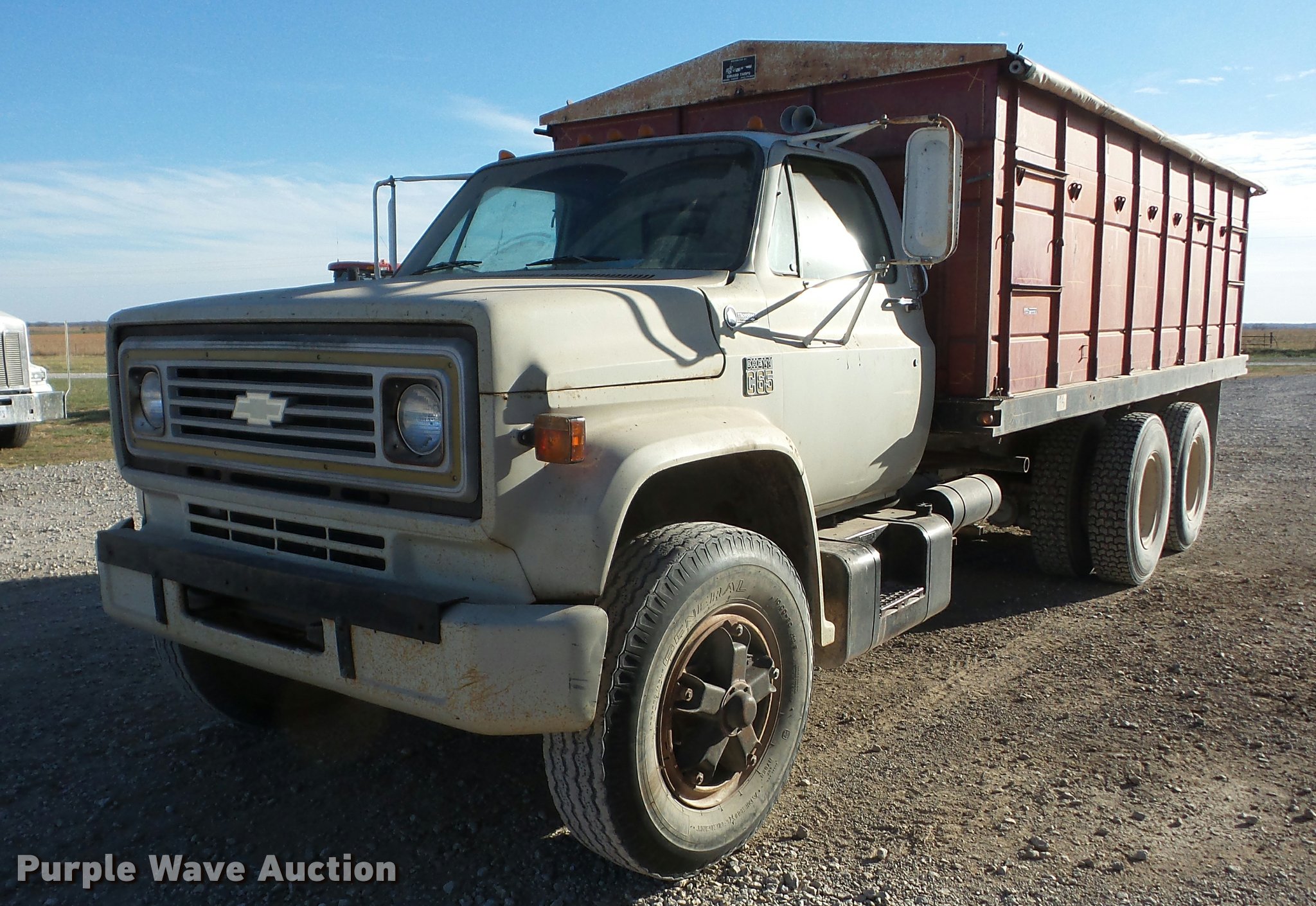 Purple Wave is selling a used Grain Truck in Kansas. This item is a 1974 Chevrolet C65 grain truck with the following: 70,832 miles on odometer, Chevrolet 366 C.I.D. eight cylinder gas engine, Five speed manual transmission, Four speed auxiliary transmission, Tandem axle, Inter-axle differential lock, Heat, Suspension seat, PTO, 18'L x 96"W steel grain bed, 52" side height, Rollover tarp, Manual end gate, Dual ram hoist, Single fuel tank, Spring over walking beam suspension, Air brakes, 10.00R20 tires, GVWR 41,000 lbs, FAWR 9,000 lbs, IAWR 16,160 lbs, RAWR 16,160 lbs, Speedometer inoperable