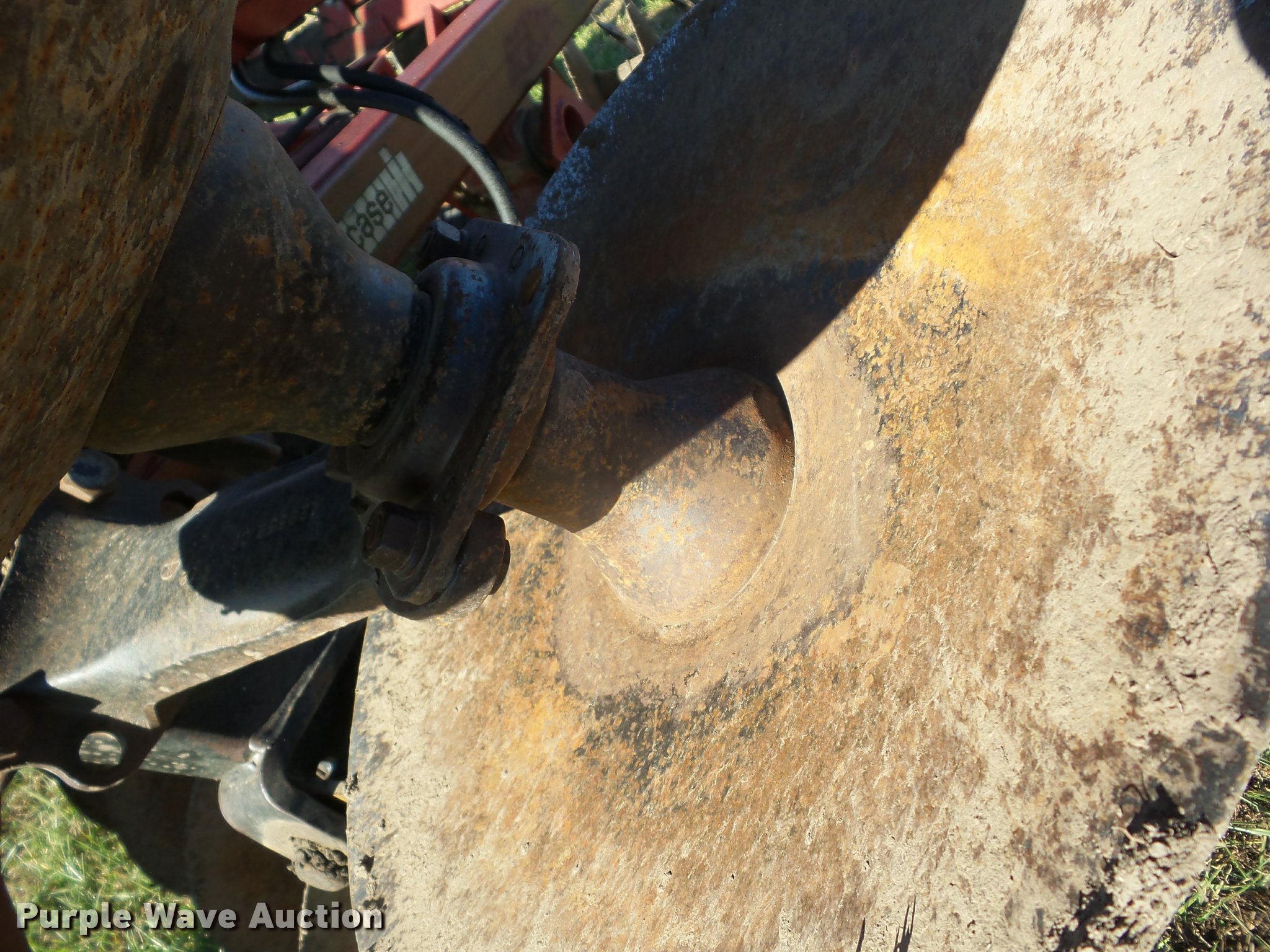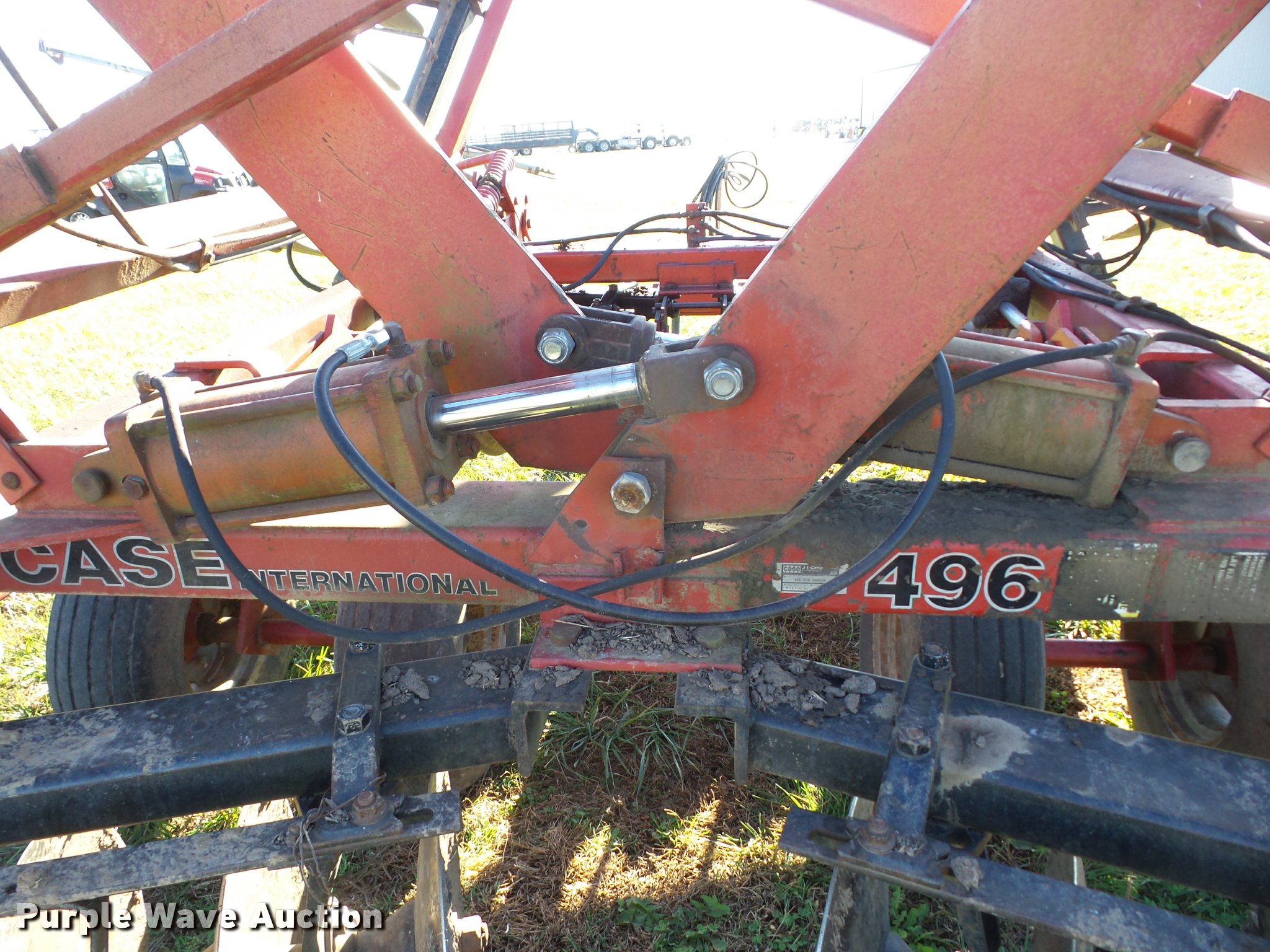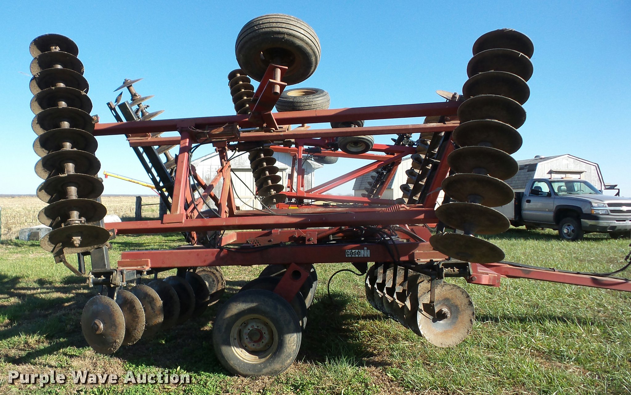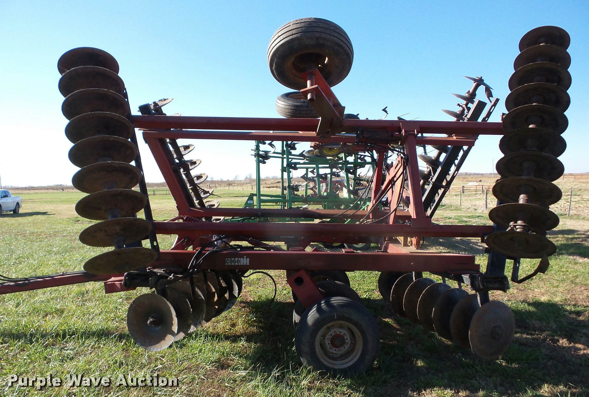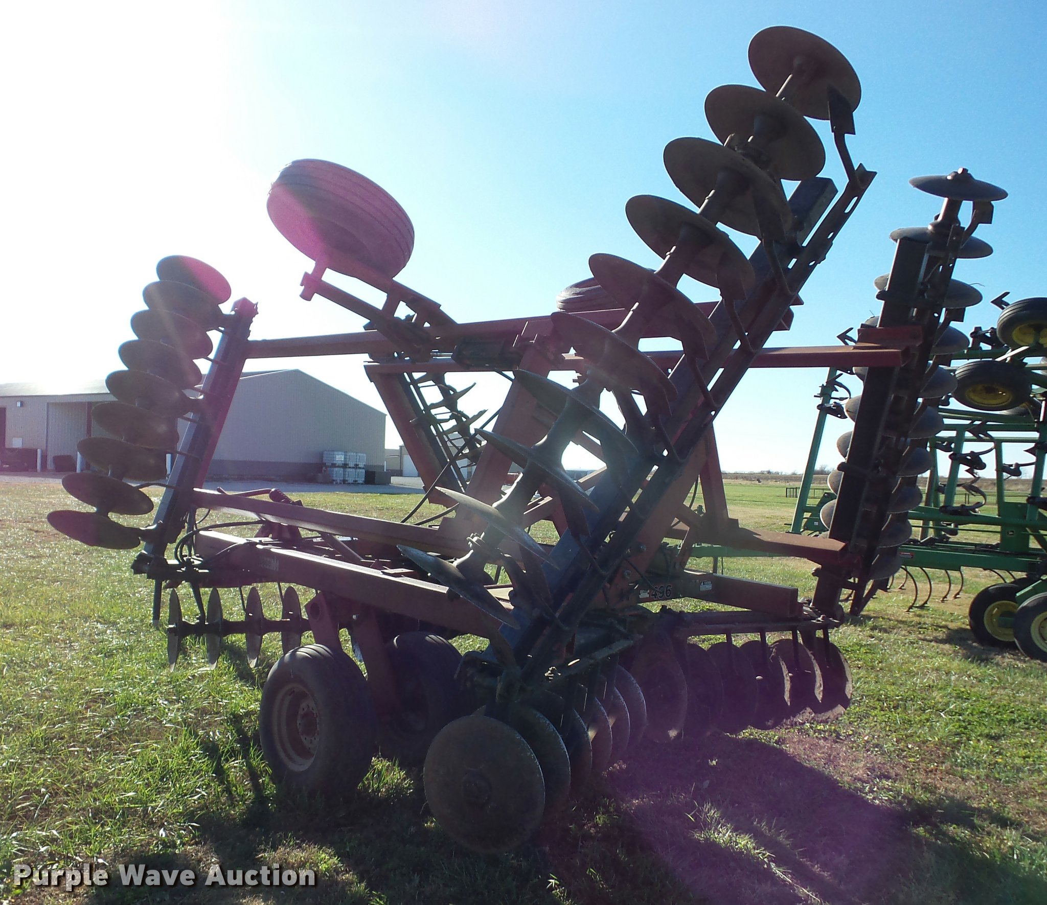 Purple Wave is selling a used Disk in Kansas. This item is a Case IH 496 double off-set disk with the following: 22.5'W, 20" diameter front blades, 20" diameter rear blades, 9" spacing, Disk scrapers, Hydraulic lift and fold, Hydraulic leveler, Pin/clevis hitch, Walking tandem axle, 9.5L-14 tires, Hydraulic hose needs to be replaced, Serial 0470000C209966