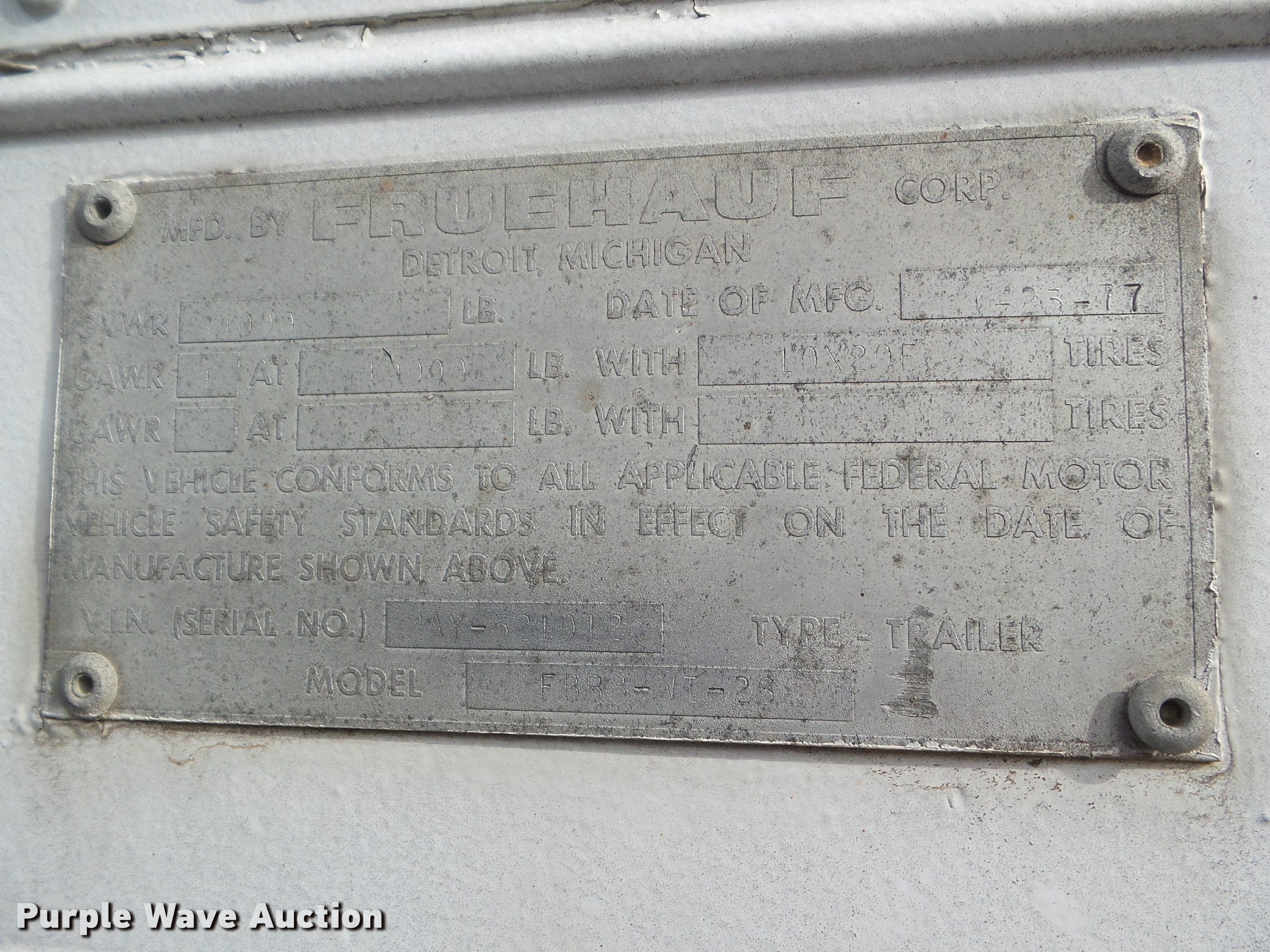 Purple Wave is selling a used Dry Van Trailer in Kansas. This item is a 1977 Fruehauf FBB8-17-26 dry van trailer with the following: 28'L x 92"W, Aluminum deck, Roll up rear door, Lift gate, Unknown operating condition, Fifth wheel plate, Dual leg two speed landing gear, Spring suspension, Air brakes, 11R24.5 tires