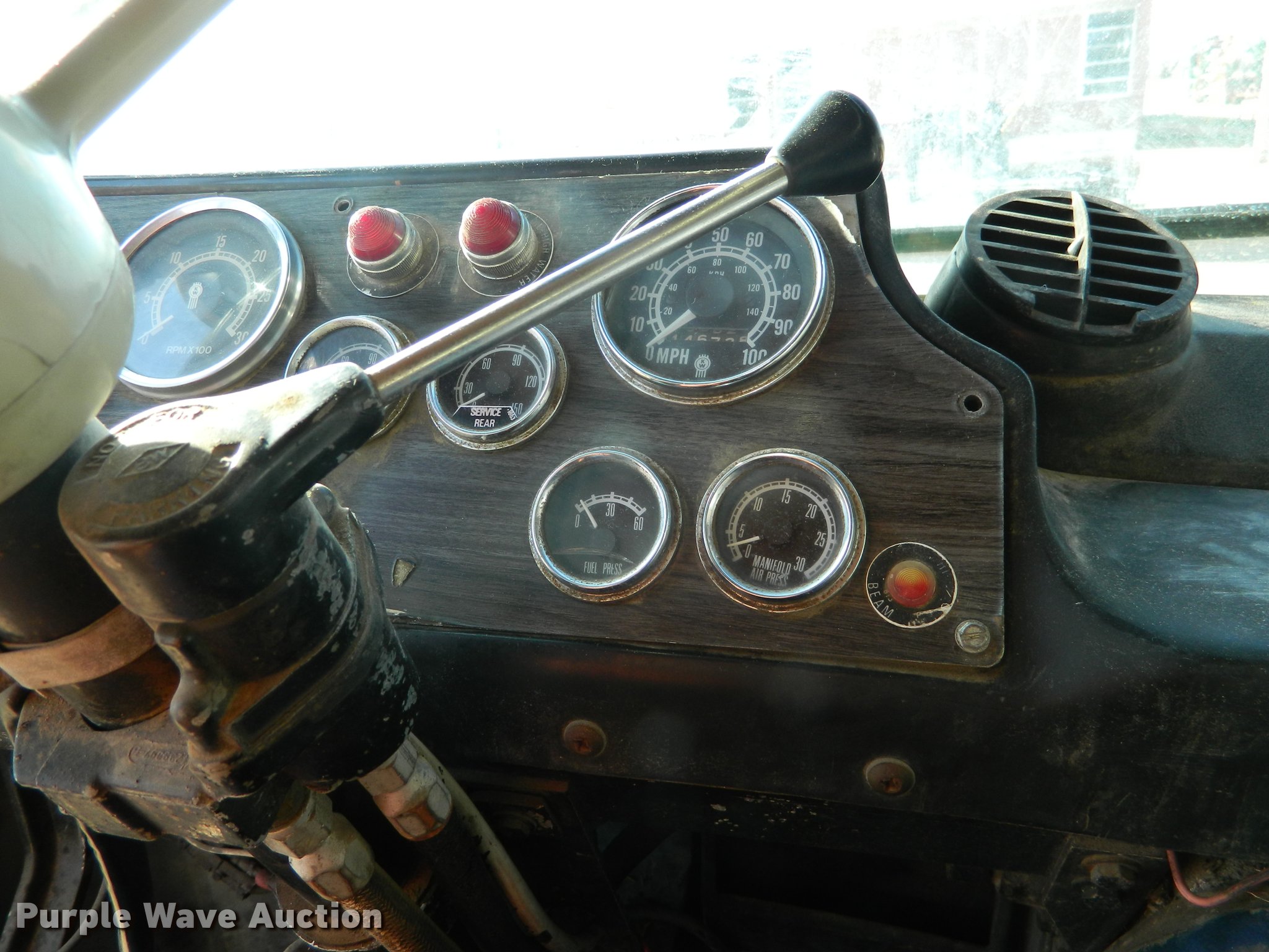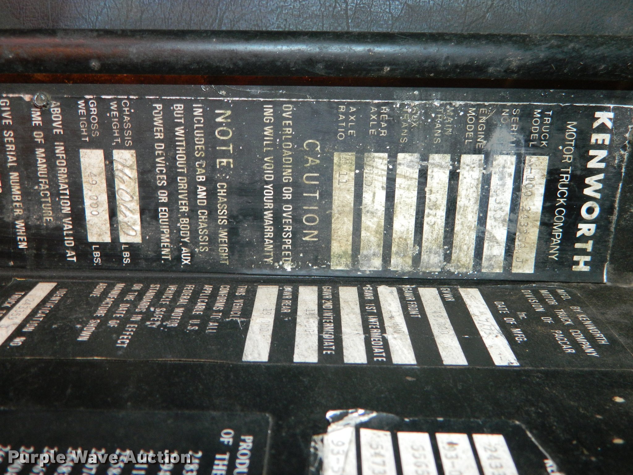 Purple Wave is selling a used Truck Tractor in Kansas. This item is a 1976 Kenworth 100 semi truck with the following: 146,738 miles on odometer, Six cylinder turbo diesel engine, Eaton Fuller Road Ranger 13 speed manual transmission, Tandem axle, Inter-axle differential lock, Heat, AM/FM, Heated mirrors, Air suspension seat, 29" sleeper, Single bed, Block heater, Exterior visor, Single rear exhaust stack, Air operated sliding fifth wheel plate, Dual fuel tanks, Quarter fenders, Spring suspension, Air brakes, 168" wheelbase, 11R24.5 tires, Broken windshield