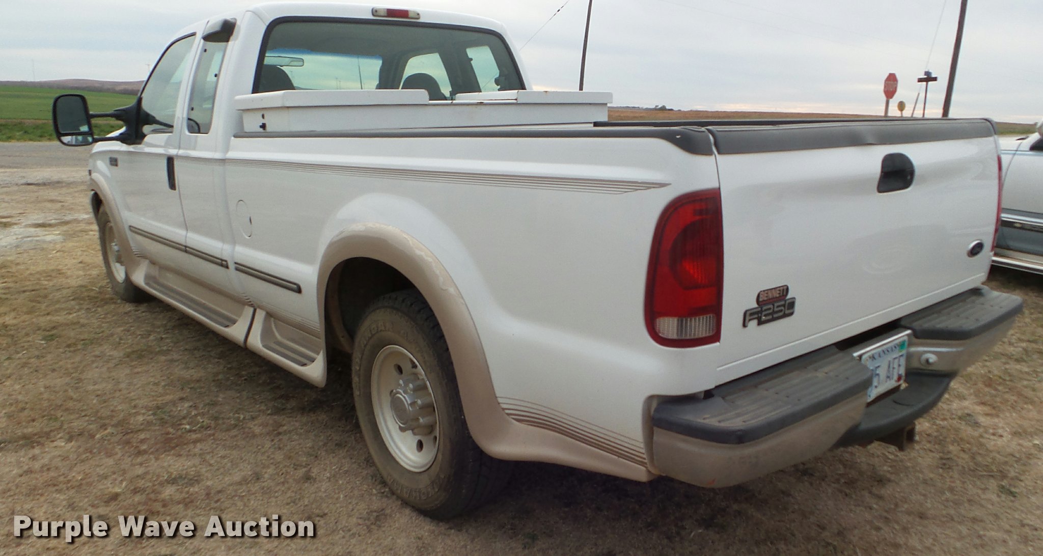 1999 Ford F250 Super Duty SuperCab pickup truck. 122,828 miles on odometer, 6.8L V10 SOHC 20V gas engine, Automatic transmission, AC and heat, Tilt, Cruise, AM/FM/CD, Power windows, locks, and mirrors, Cloth interior, Running boards, Bed liner, Toolbox, Gooseneck ball, Receiver hitch, Trailer wiring, 235/85R16 tires. Kansas title. 1FTNX20S8XEC08753. Steven K Donley Estate. Westfall, KS 67423
