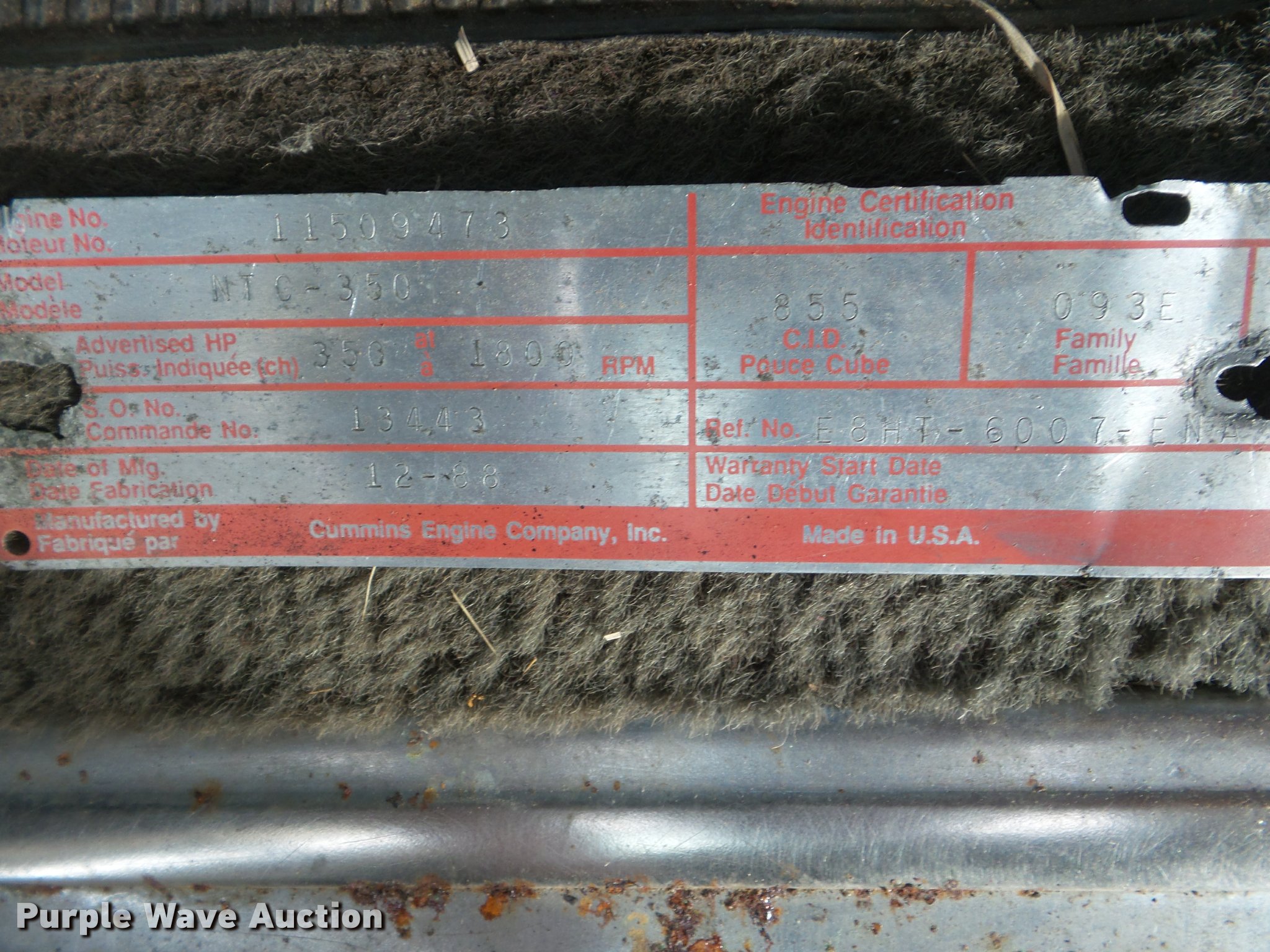 Purple Wave is selling a used Truck Tractor in Kansas. This item is a 1989 Ford LTL9000 semi truck with the following: 721,978 miles on odometer, Cummins N14 14.0L L6 turbo diesel engine, Eaton Fuller 10 speed manual transmission, Tandem axle, Inter-axle differential lock, AC and heat, AM/FM/cassette, Heated mirrors, Air suspension seat, 29" sleeper, Single bed, Rear climate control, PTO, Wet kit, Exterior visor, Single front exhaust stack, Air operated sliding fifth wheel plate, Dual fuel tanks, Stainless steel quarter fenders, Air suspension, Air brakes, 216" wheelbase, 11R24.5 tires, GVWR 46,000 lbs