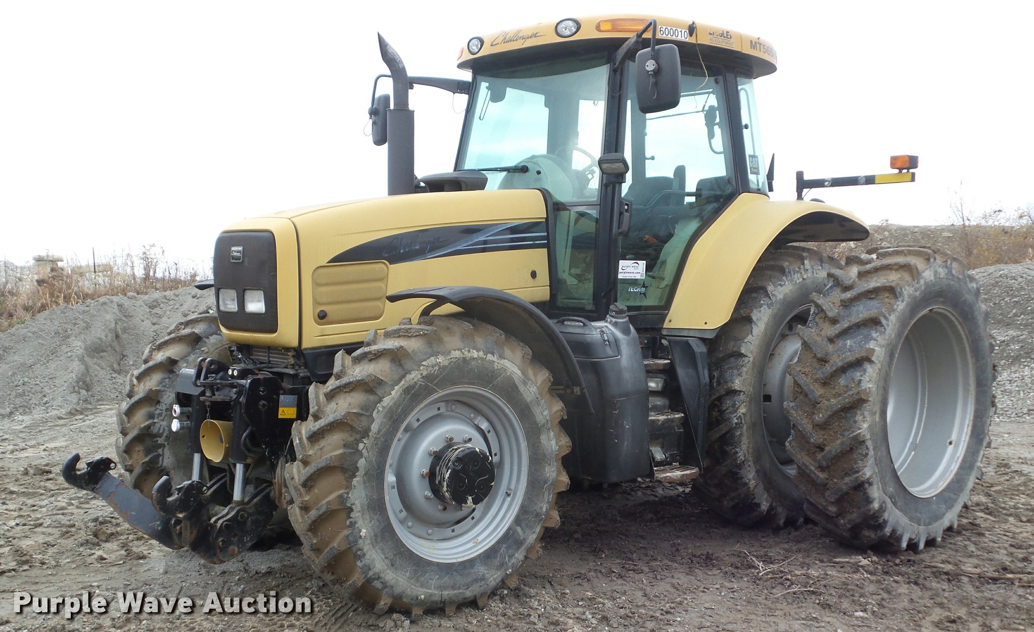 Purple Wave is selling a used Tractor in Ohio. This item is a 2004 AGCO Challenger MT565B MFWD tractor with the following: 1,488 hours on meter, Caterpillar 3056F 6.0L six cylinder turbo diesel engine, Serial 35601553, CVT transmission, AC and heat, Tilt steering wheel, AM/FM/CD, Air suspension seat, Instructor's seat, Shade, Three point, Front three point, Quick attach, Seven pin outlet, Rear 540/1000 PTO, Front 1000 PTO, Front hydraulic remote set, (4) rear hydraulic remote sets, 380/85R20 front tires, 480/80R42 dual rear tires, Serial N251026, Unit# 600010