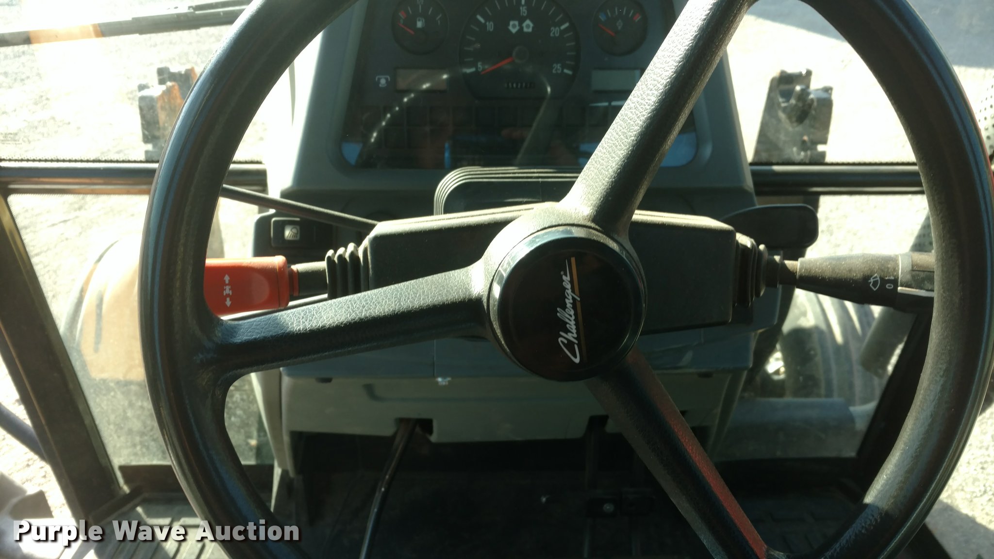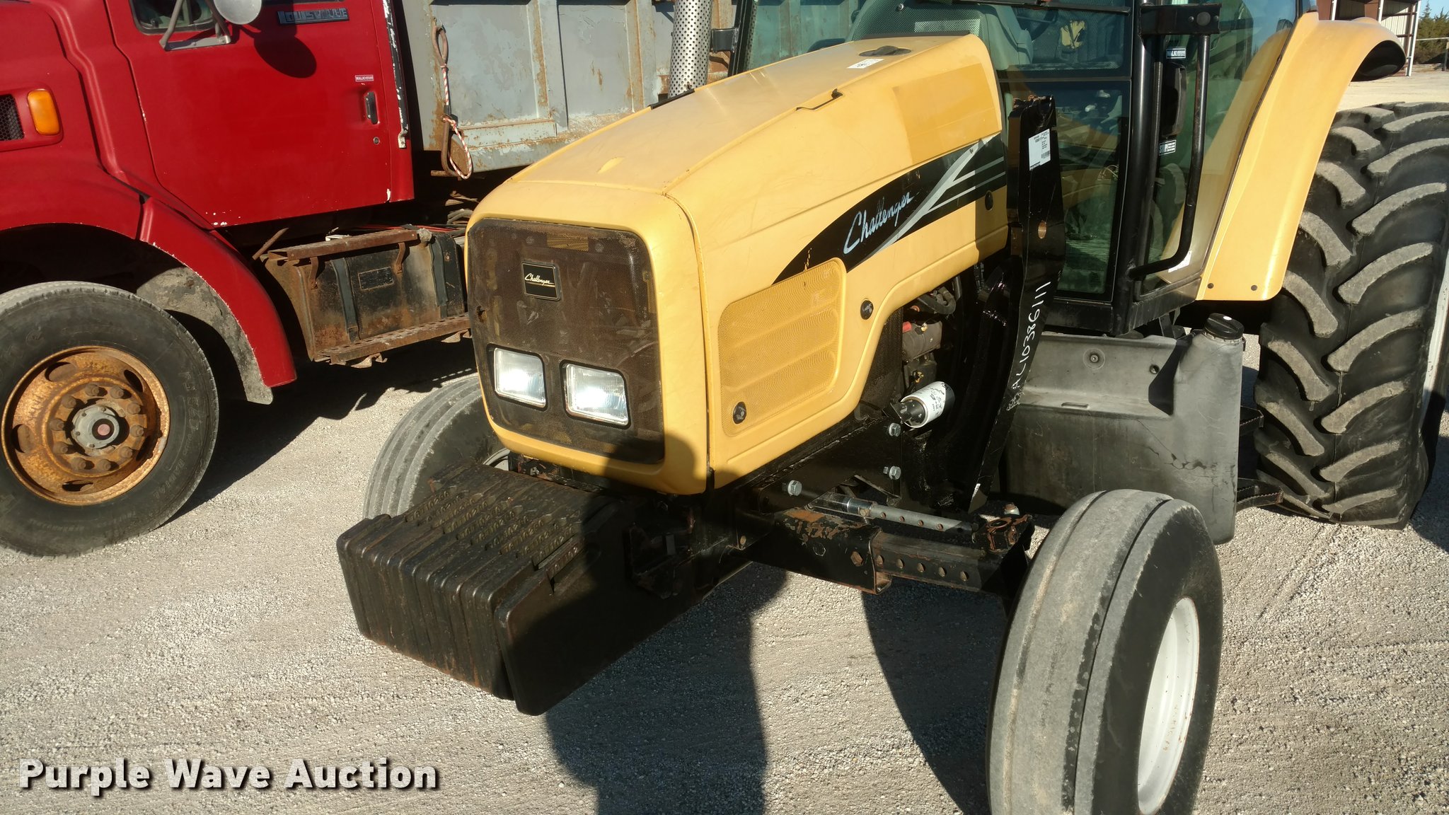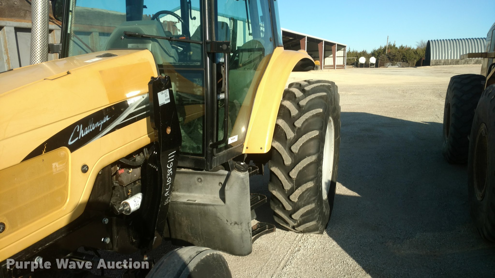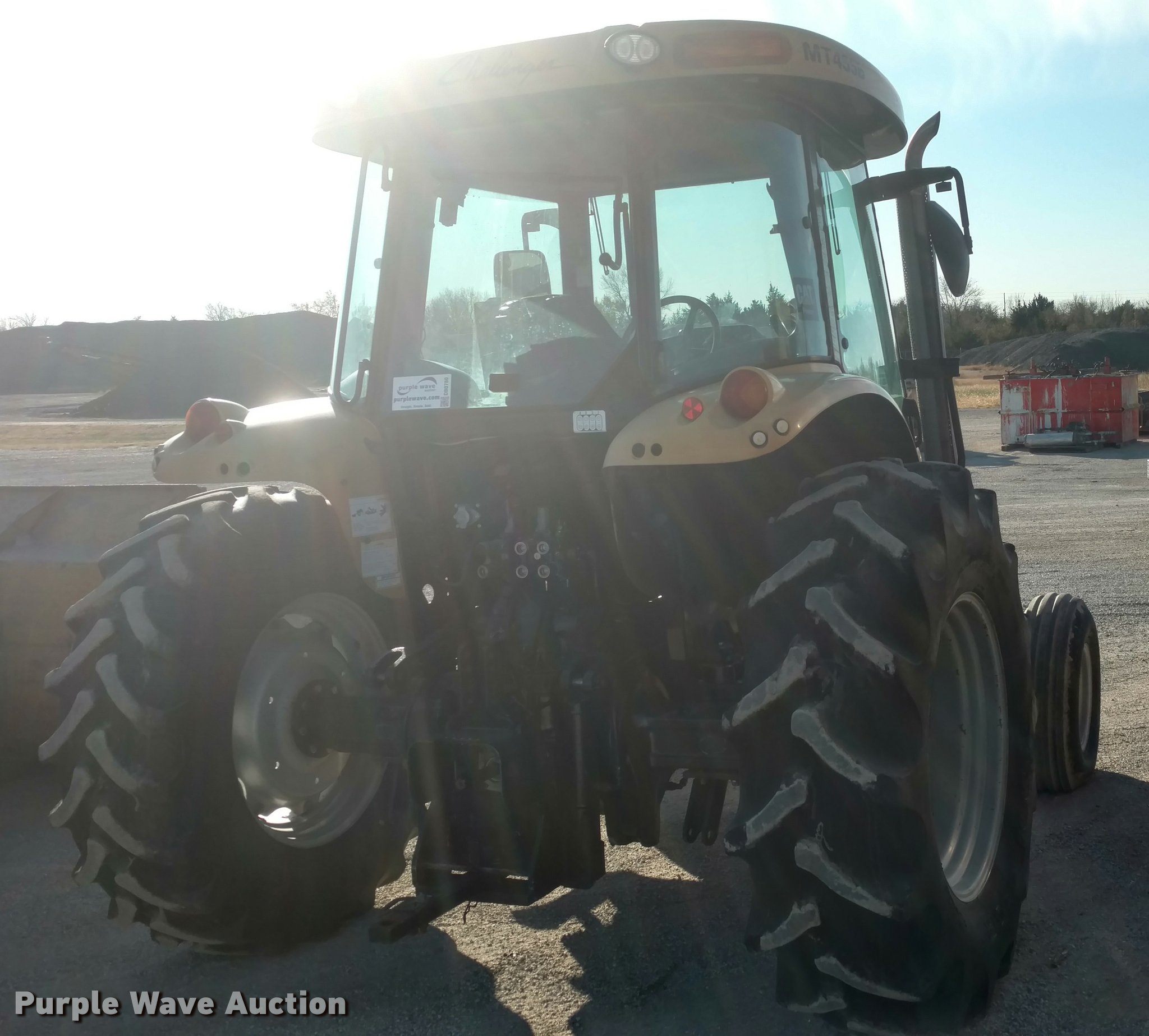 Purple Wave is selling a used Tractor in Kansas. This item is a Caterpillar Challenger MT455B tractor with the following: 5,627 hours on meter, Four cylinder diesel engine, Powershift transmission, 16F-16R gears, Enclosed cab, AC and heat, AM/FM, Suspension seat, Three point, 540 PTO, Draw bar, (3) rear hydraulic remotes, (12) suitcase weights, 10.00-16 front tires, 480/80R30 rear tires, Serial P027022