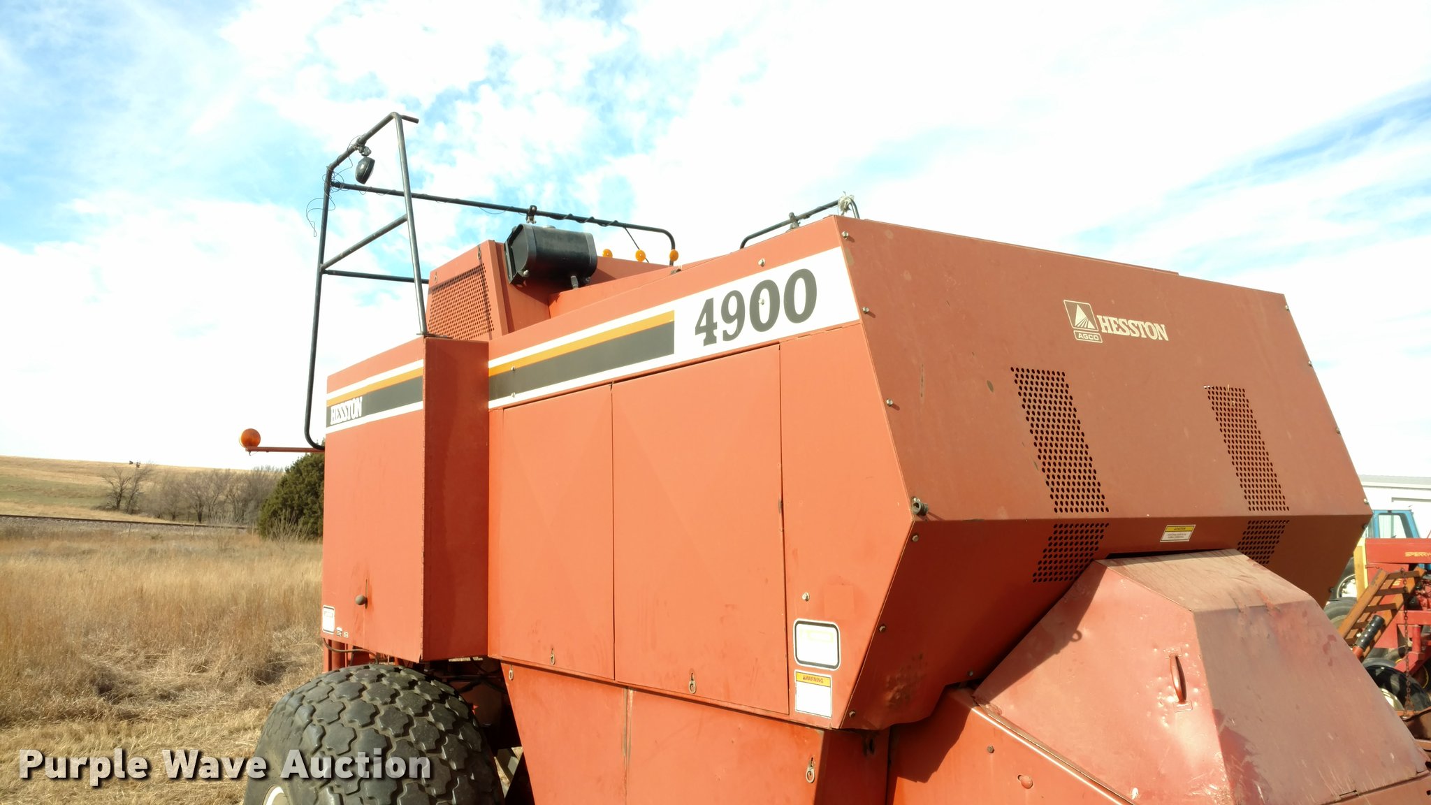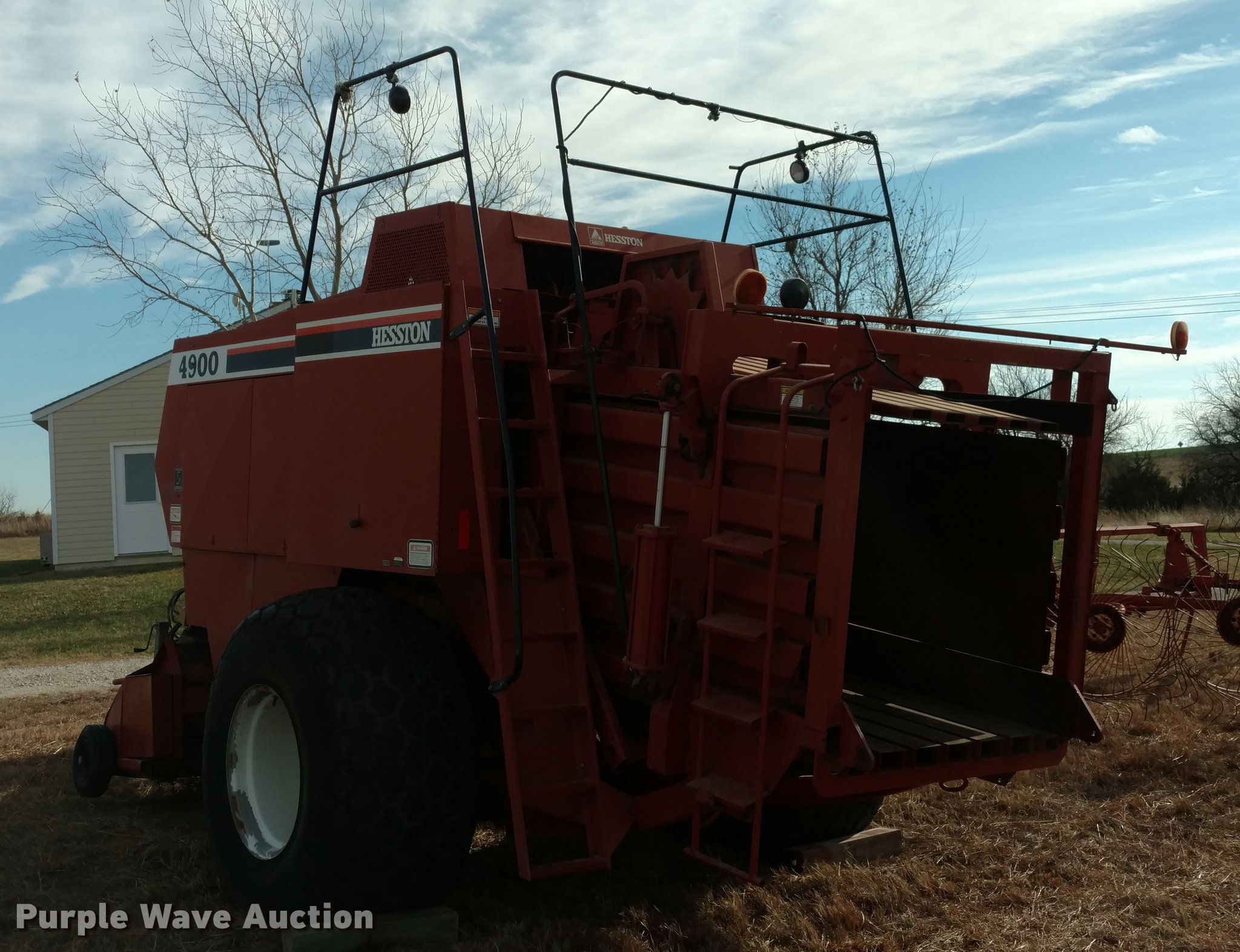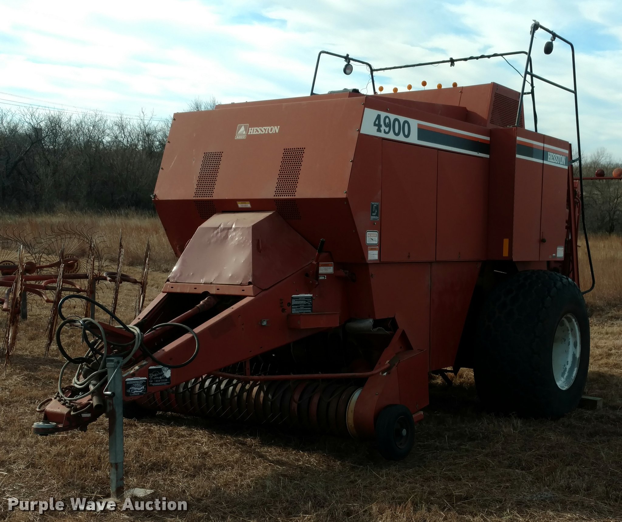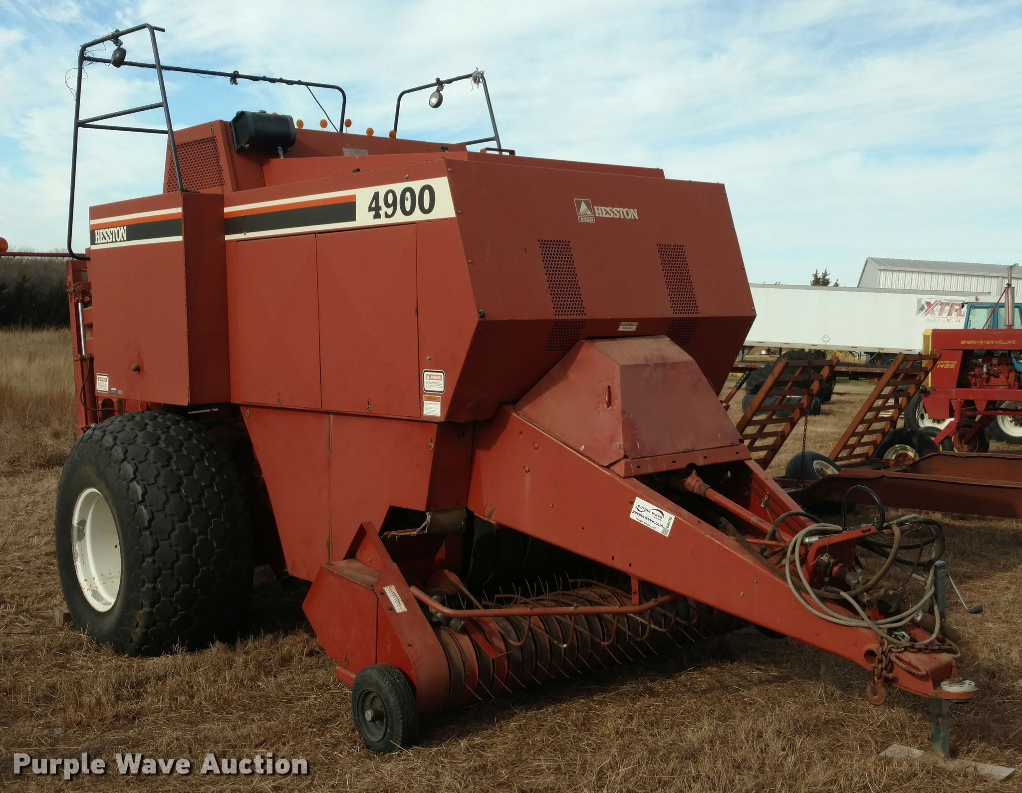 Purple Wave is selling a used Square Baler in Kansas. This item is a Hesston 4900 large square baler with the following: 4' x 4' bale capacity, 84"W pickup, Hydraulic lift, 4.80-8 gauge wheels, Twine tie, (24) twine ball compartment, Double knot knotters, Bale chute, 1000 PTO, 28L-26 tires, Serial BB4903072