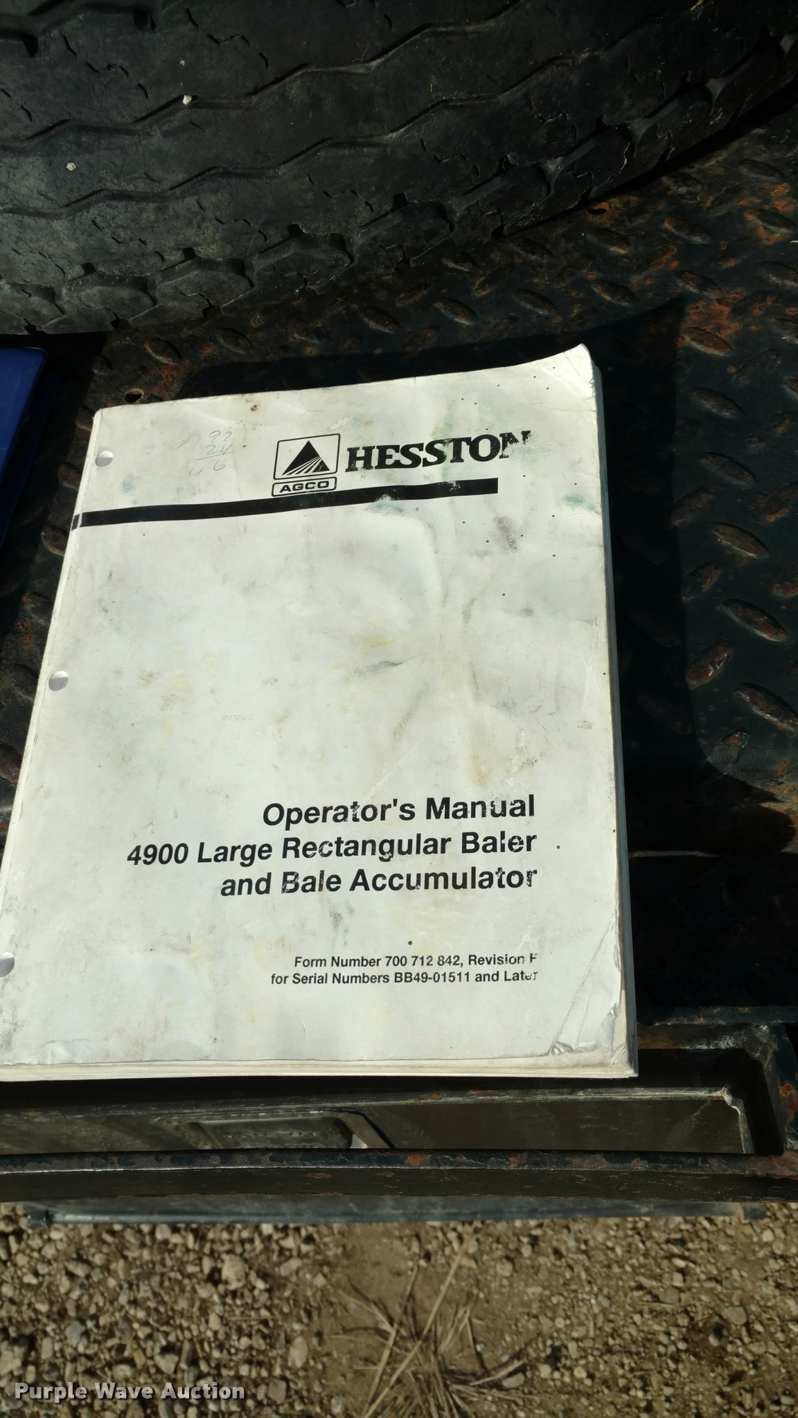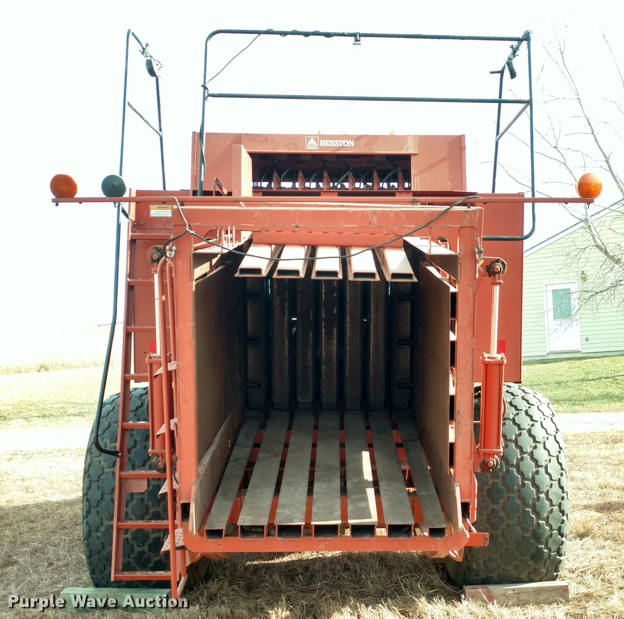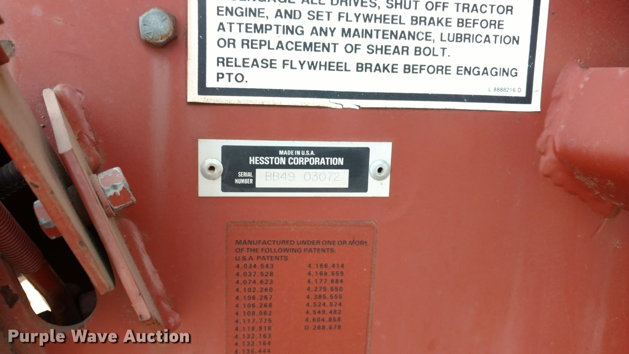 Purple Wave is selling a used Square Baler in Kansas. This item is a Hesston 4900 large square baler with the following: 4' x 4' bale capacity, 84"W pickup, Hydraulic lift, 4.80-8 gauge wheels, Twine tie, (24) twine ball compartment, Double knot knotters, Bale chute, 1000 PTO, 28L-26 tires, Serial BB4903072