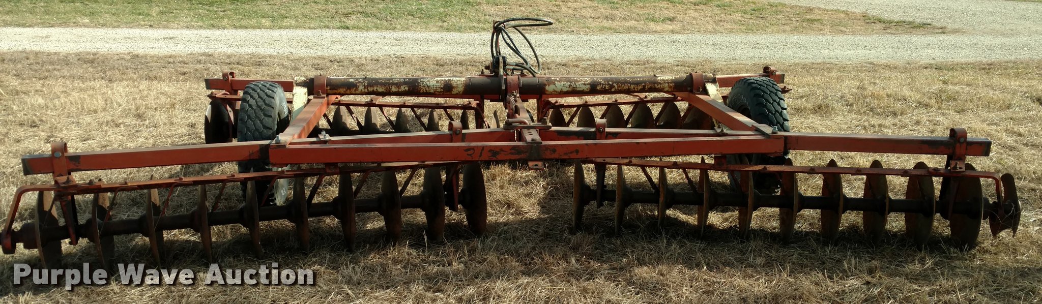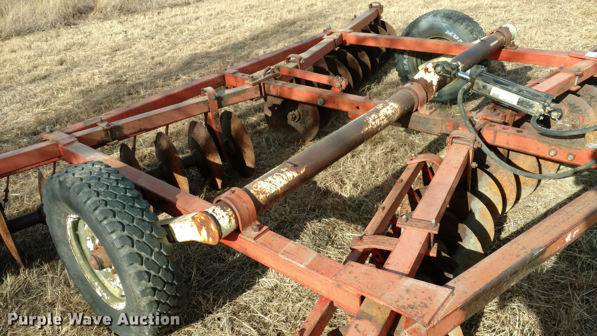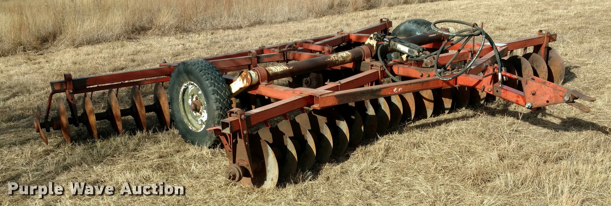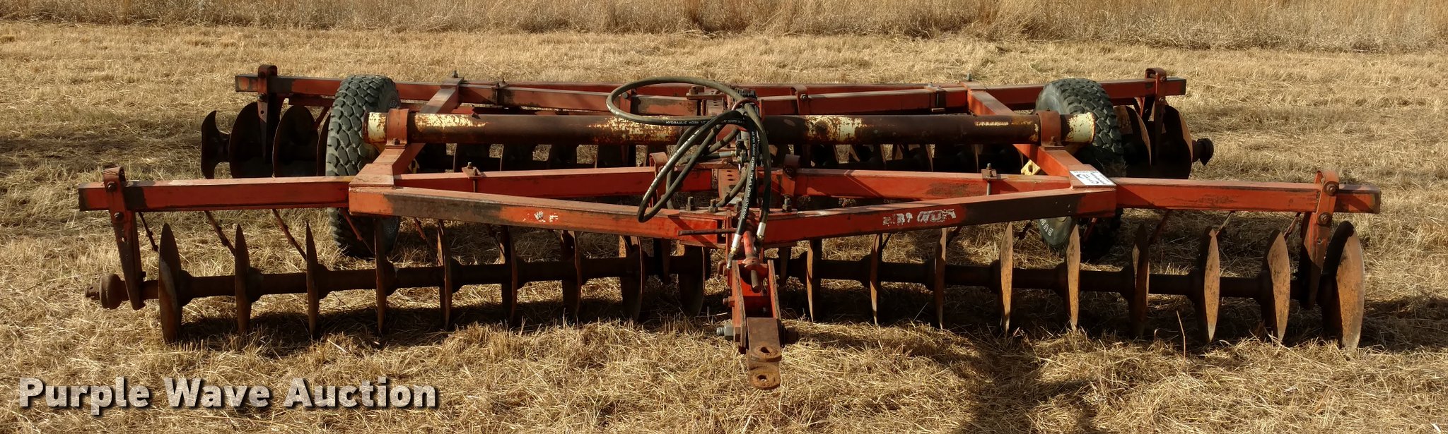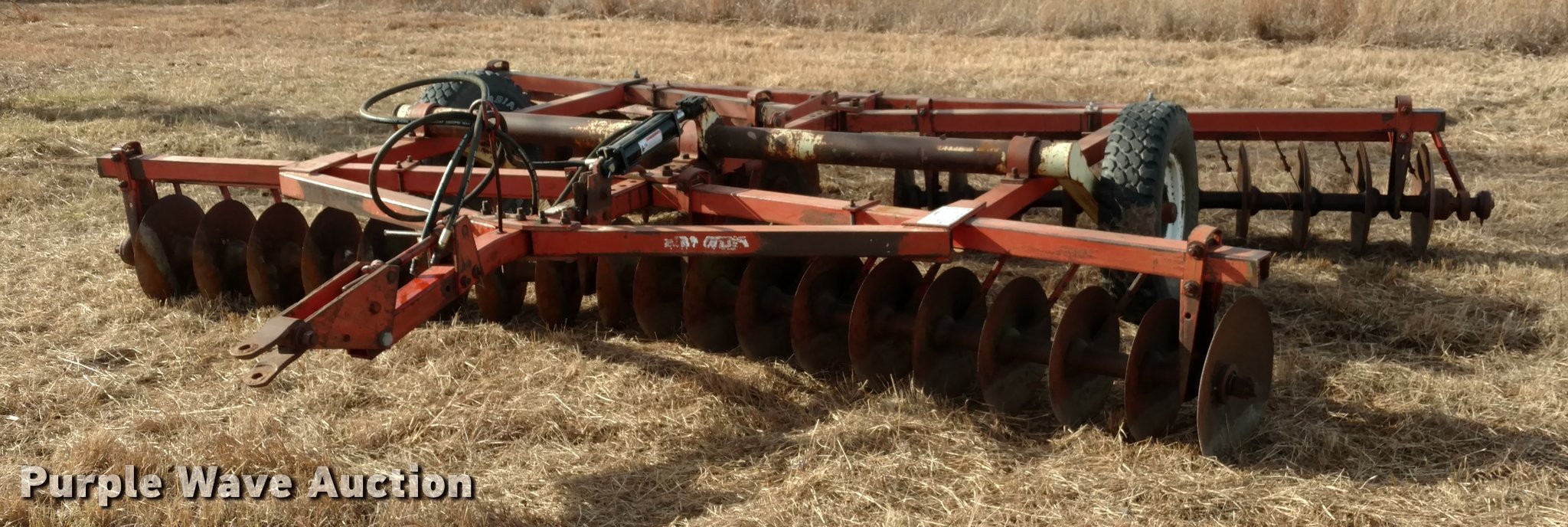 Purple Wave is selling a used Disk in Kansas. This item is a Double off-set disk with the following: Model 616, 16'W, Hydraulic lift, Blade cleaners, 16" tires, Serial 7415