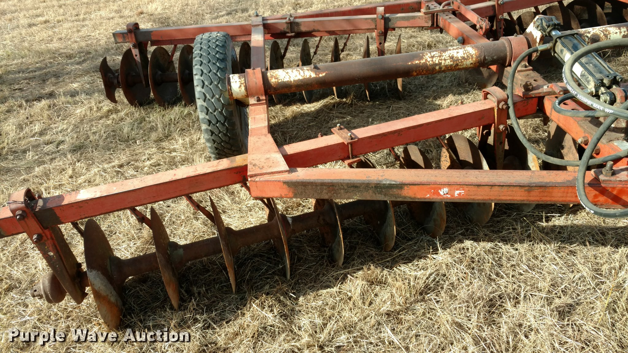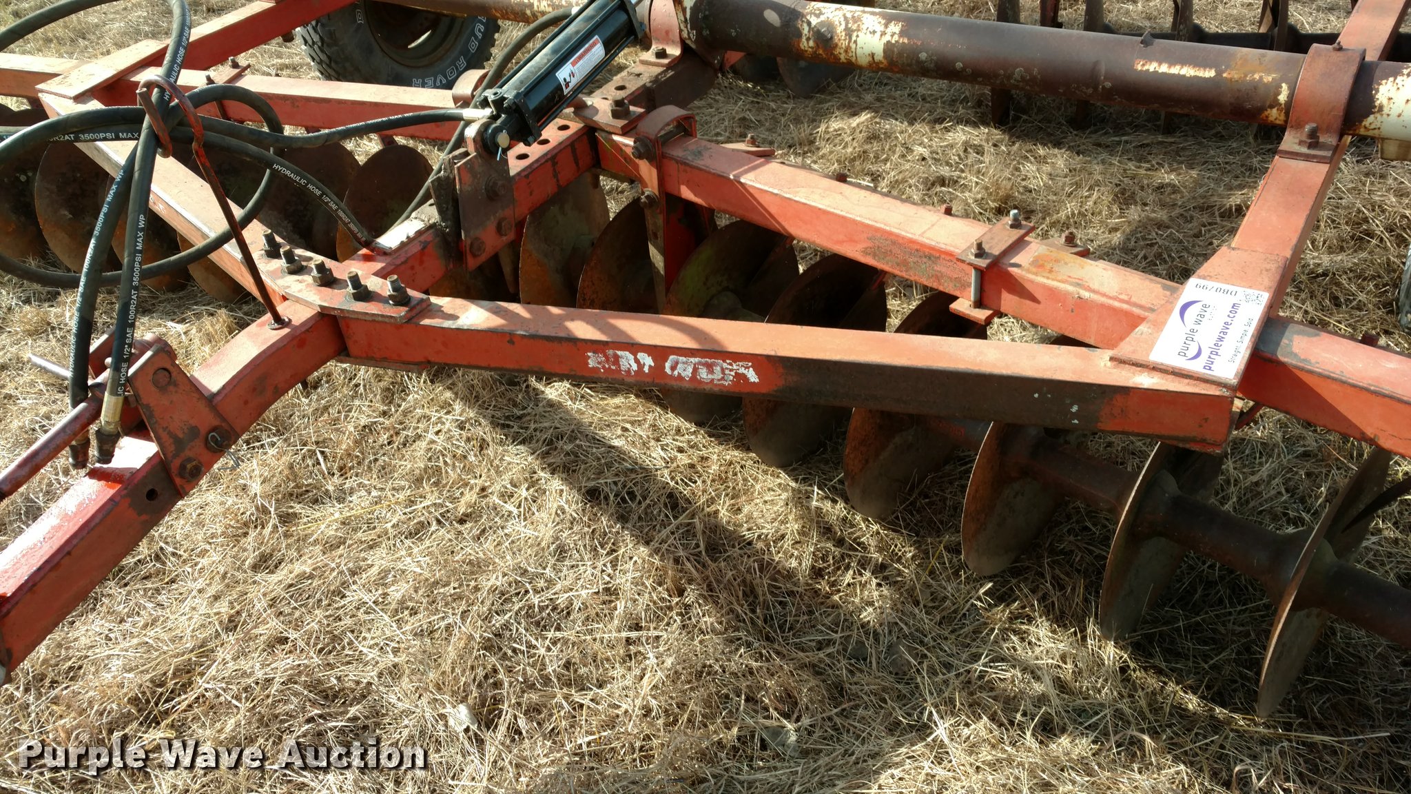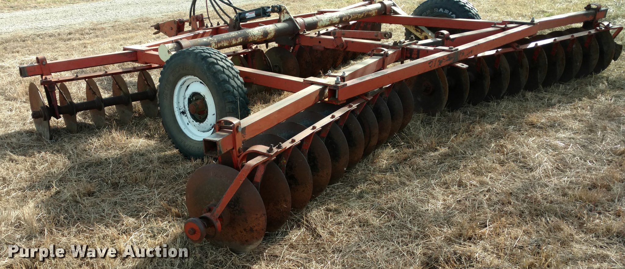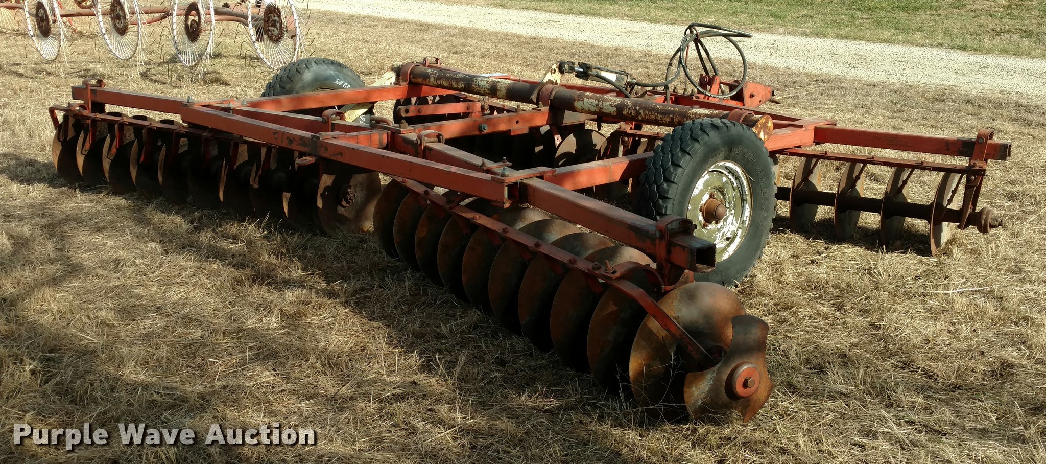 Purple Wave is selling a used Disk in Kansas. This item is a Double off-set disk with the following: Model 616, 16'W, Hydraulic lift, Blade cleaners, 16" tires, Serial 7415
