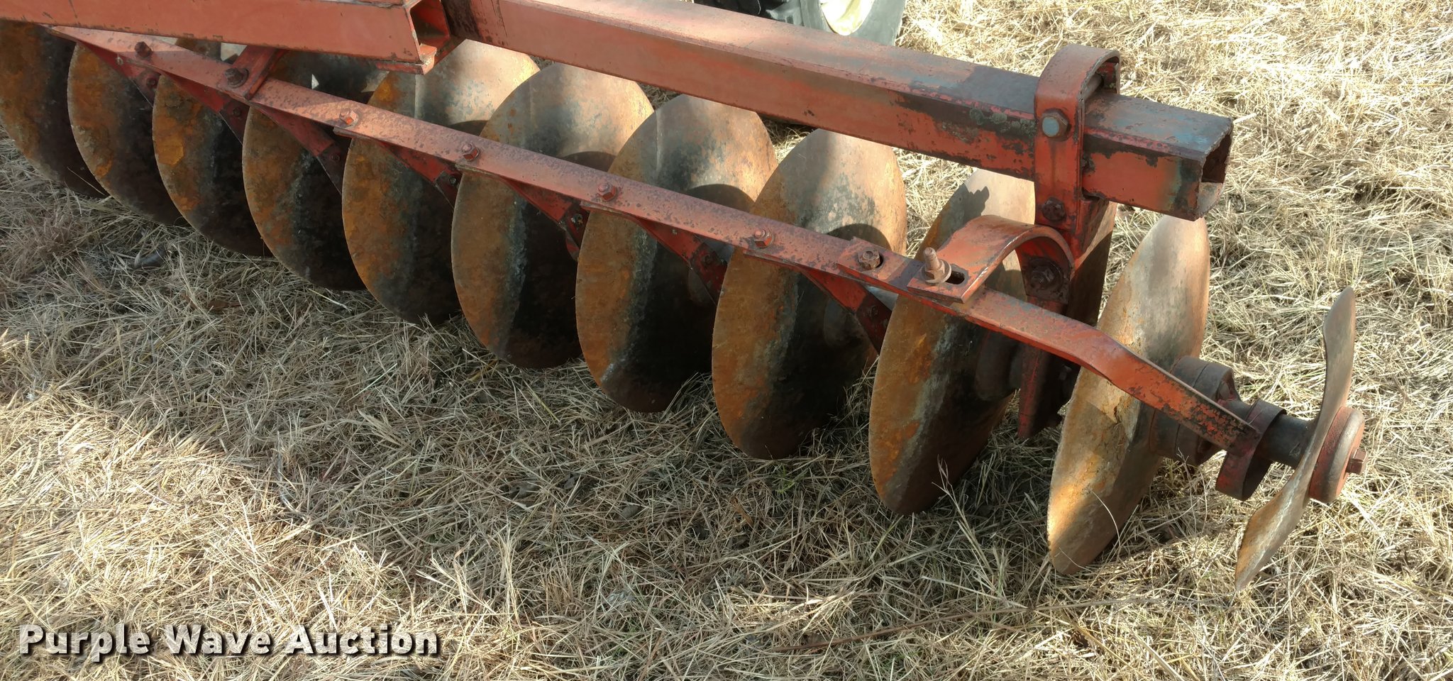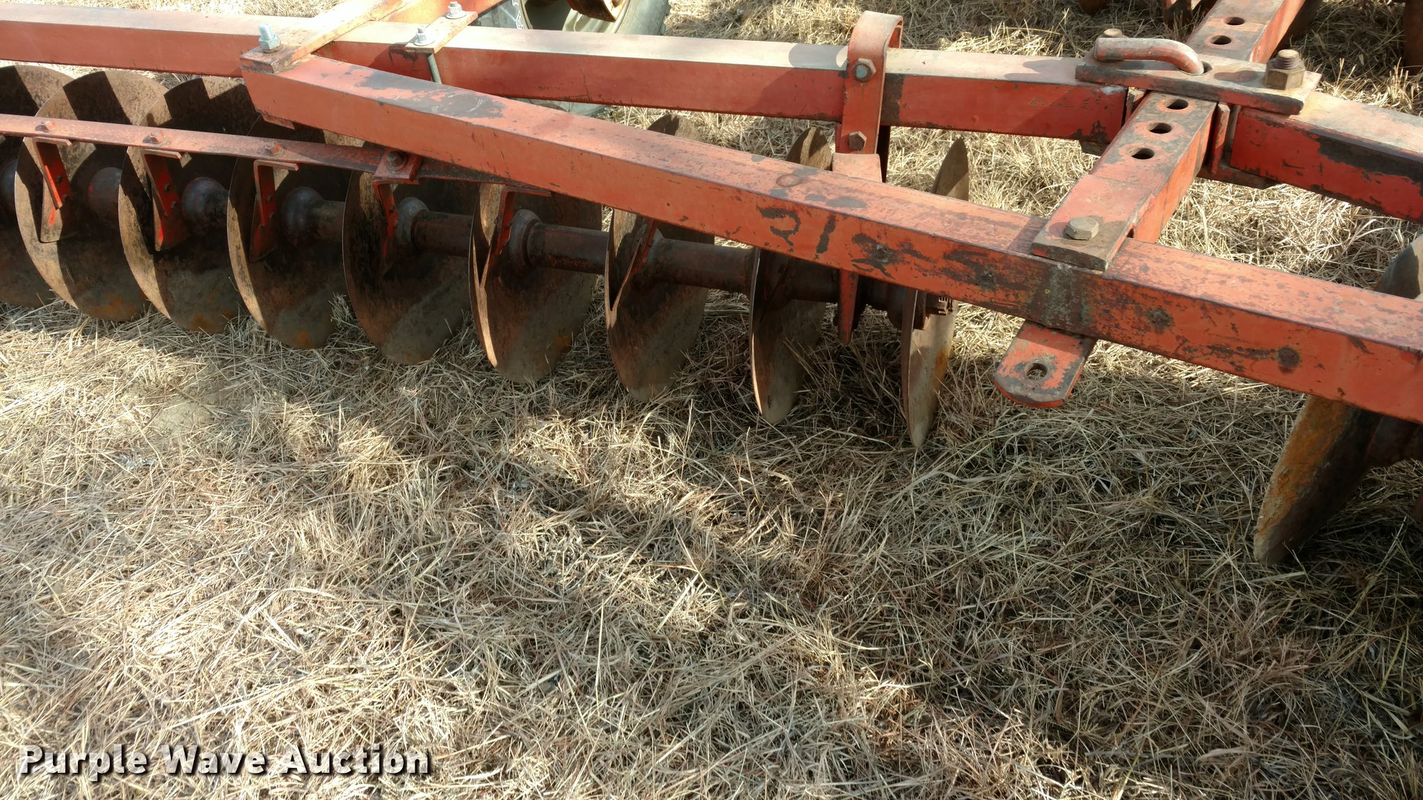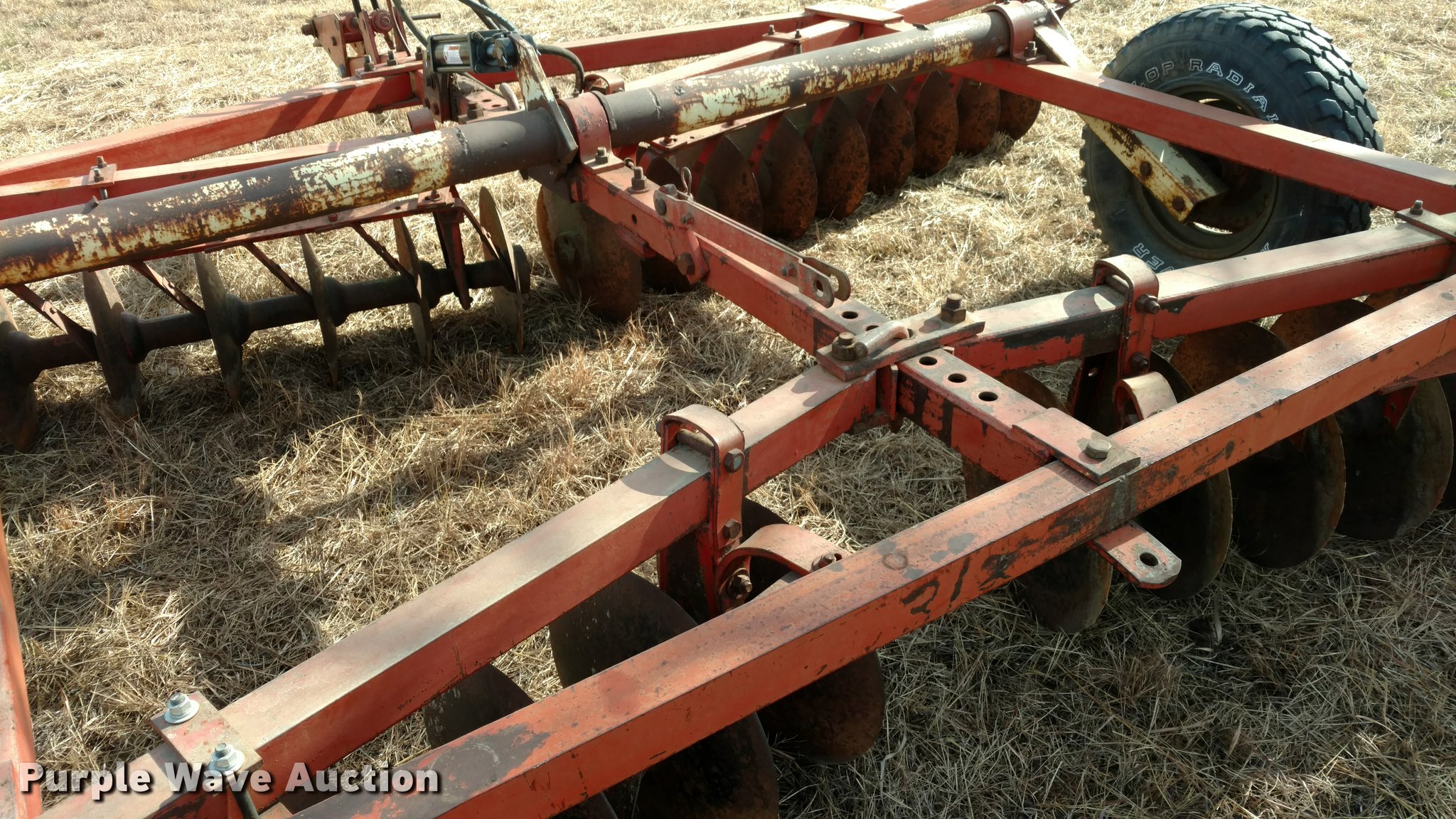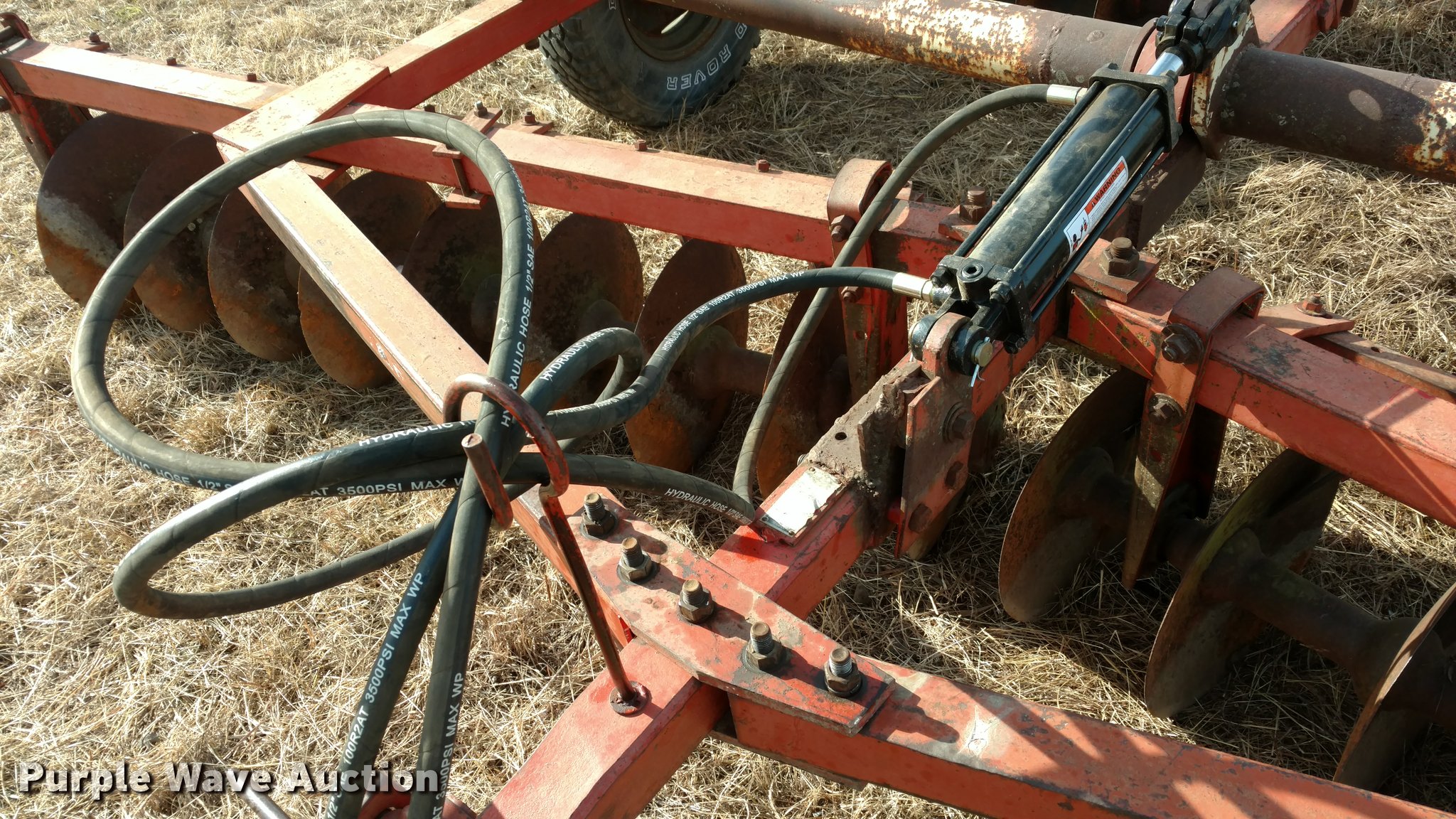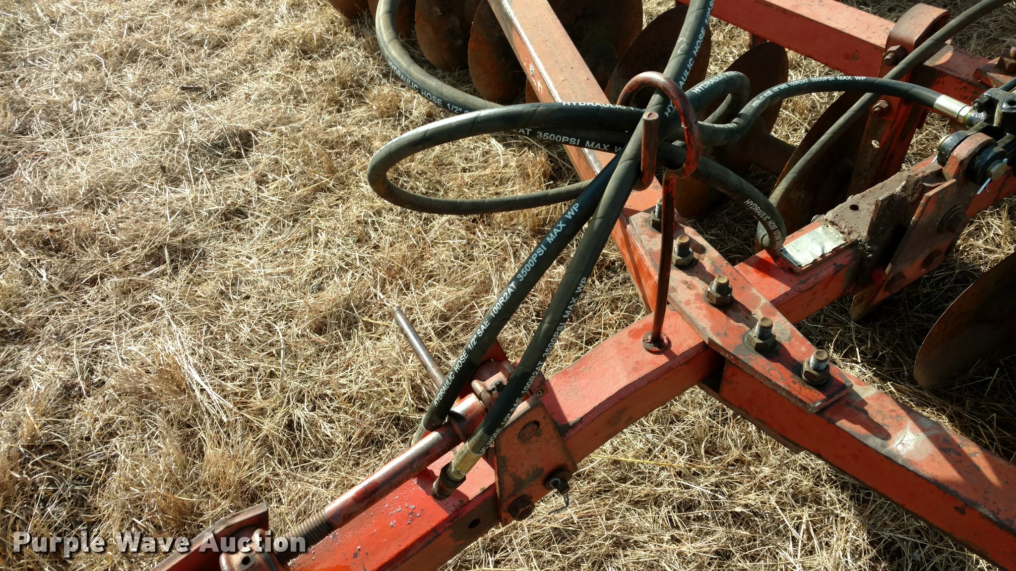 Purple Wave is selling a used Disk in Kansas. This item is a Double off-set disk with the following: Model 616, 16'W, Hydraulic lift, Blade cleaners, 16" tires, Serial 7415