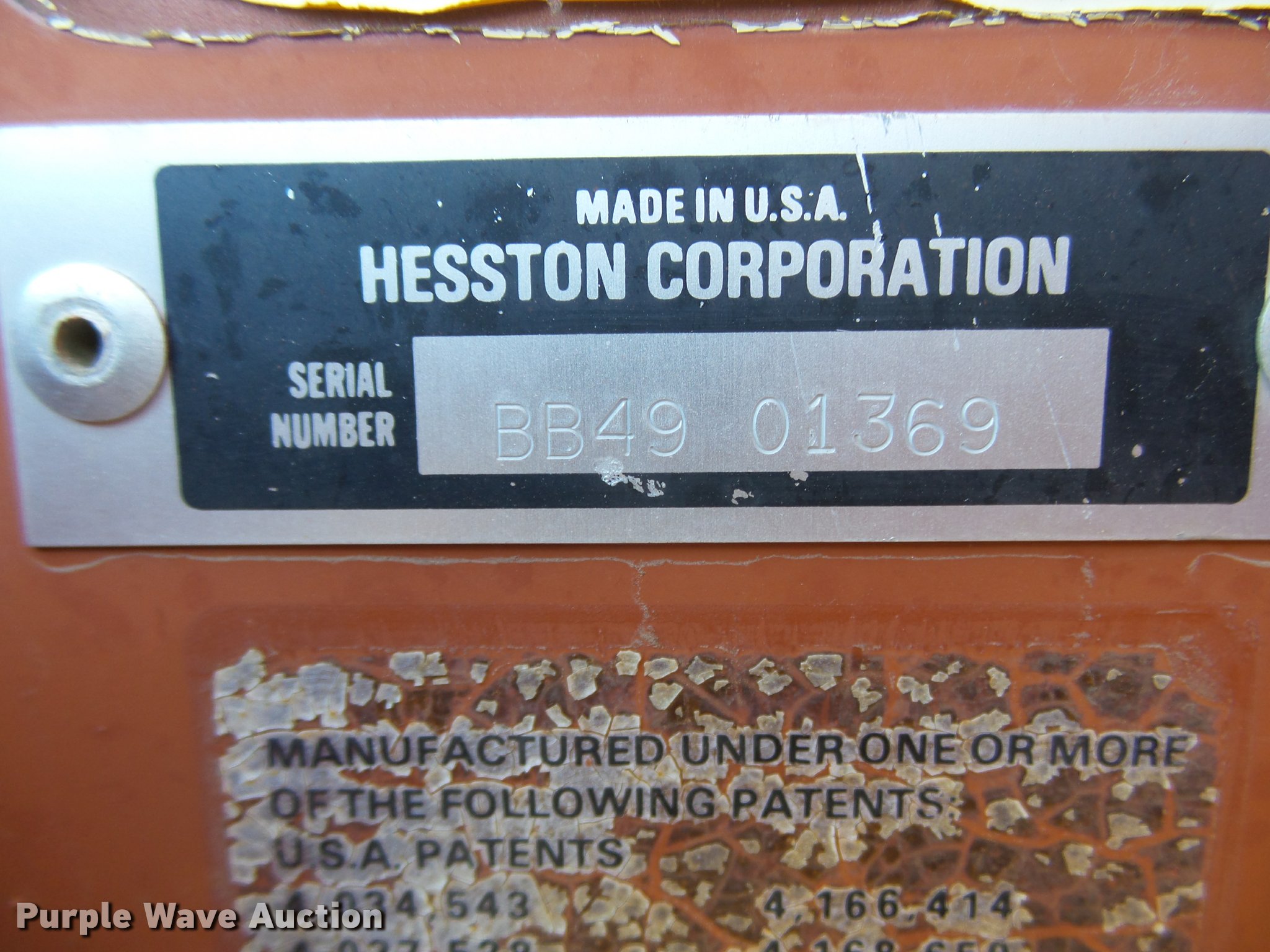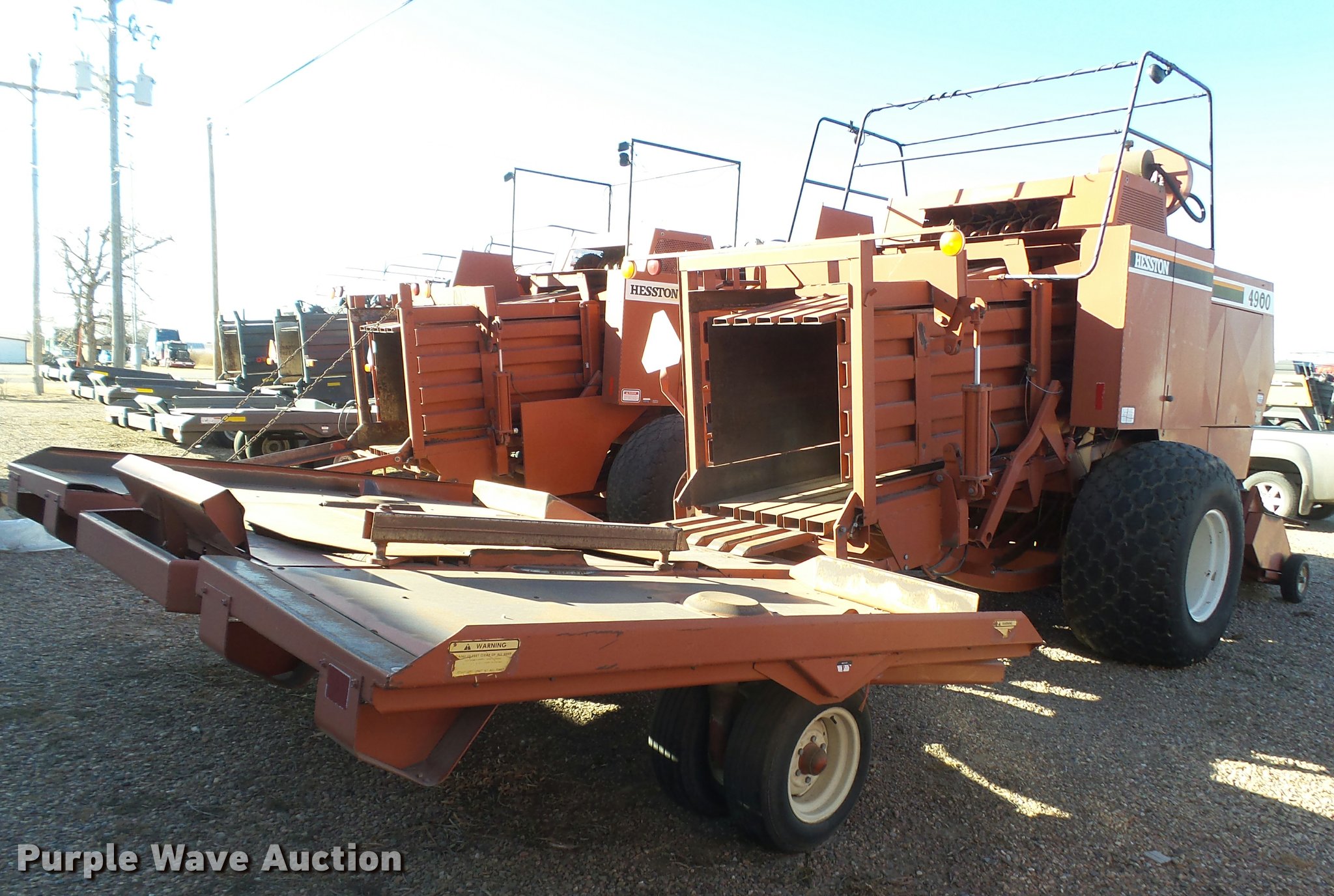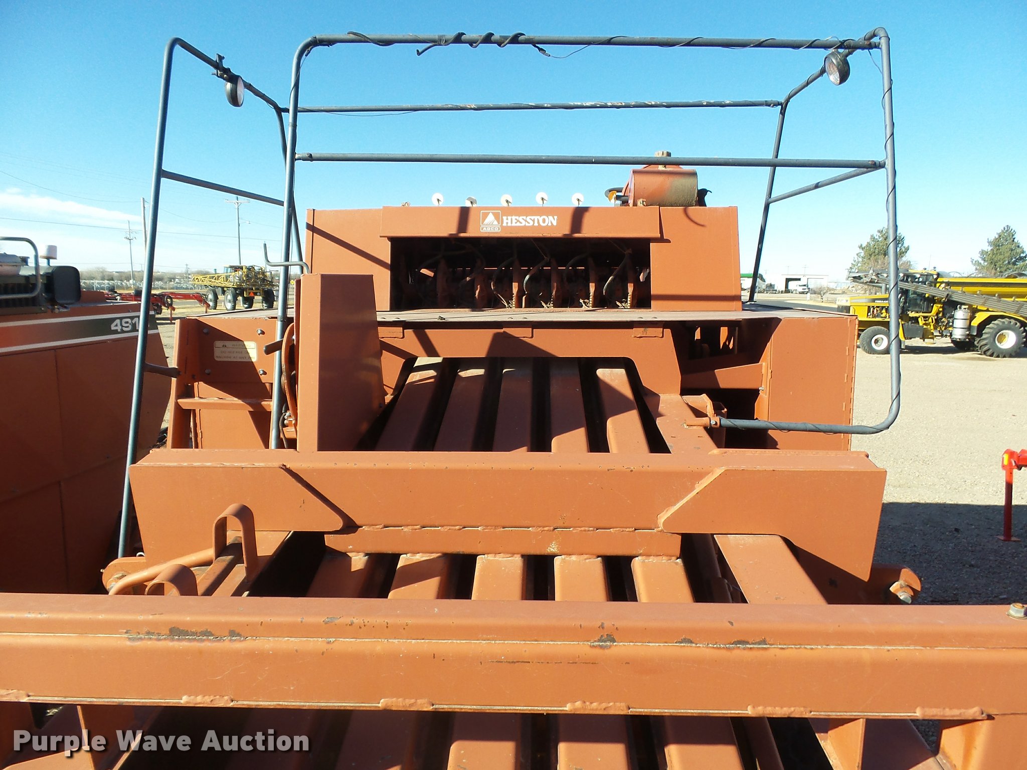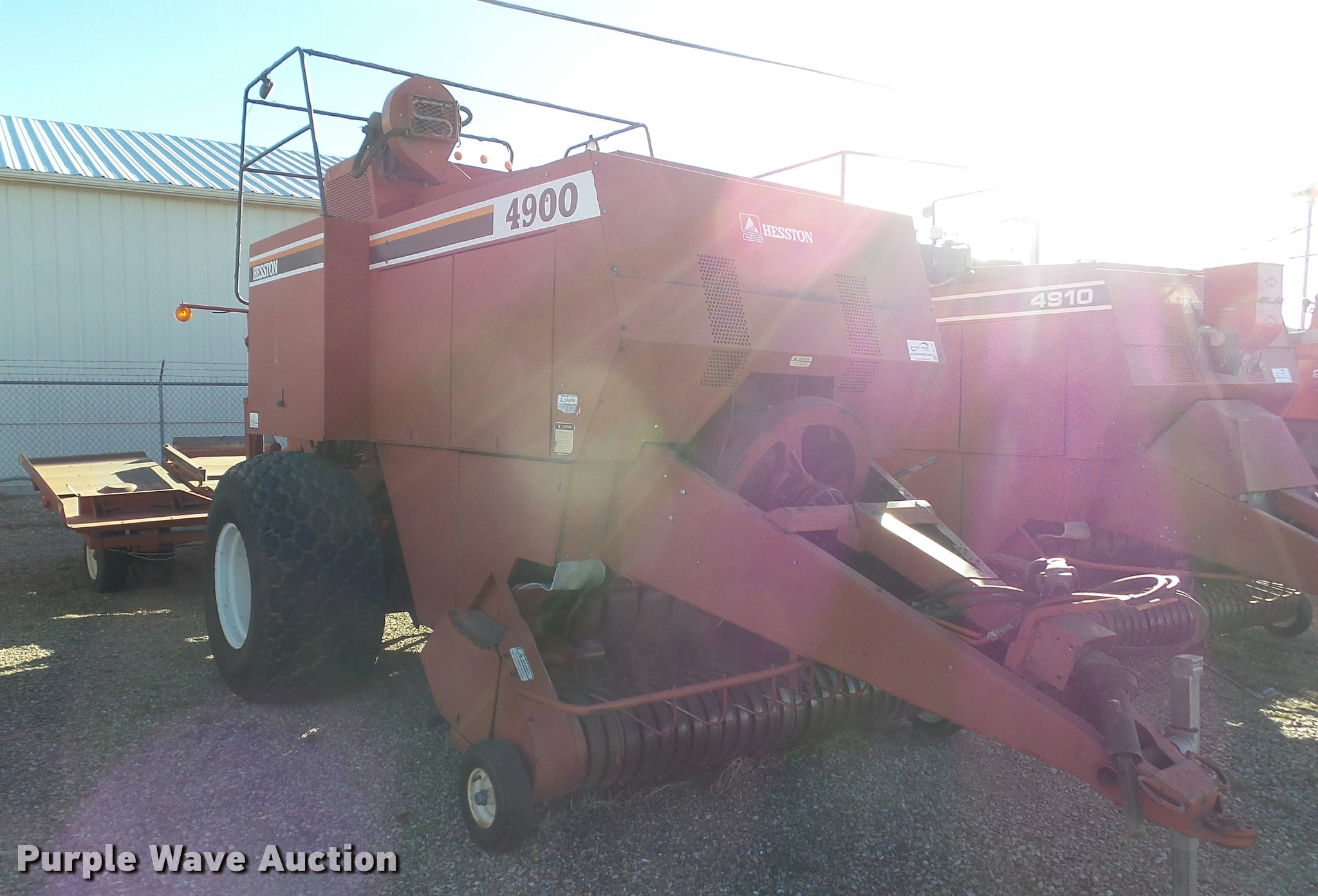 Purple Wave is selling a used Square Baler in Kansas. This item is a 1993 AGCO Hesston 4900 large square baler with the following: Approx. 26,047 bales, 4' x 4' bale capacity, 84"W pickup, Hydraulic pickup lift, Twine tie, Knotters, Hesston bale accumulator, Three bale capacity, Serial BA4900445, Large 1000 PTO, Pin hitch, 28L-26 tires, Serial BB4901369