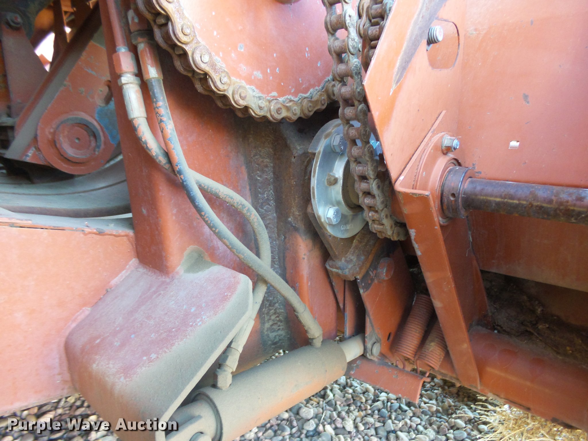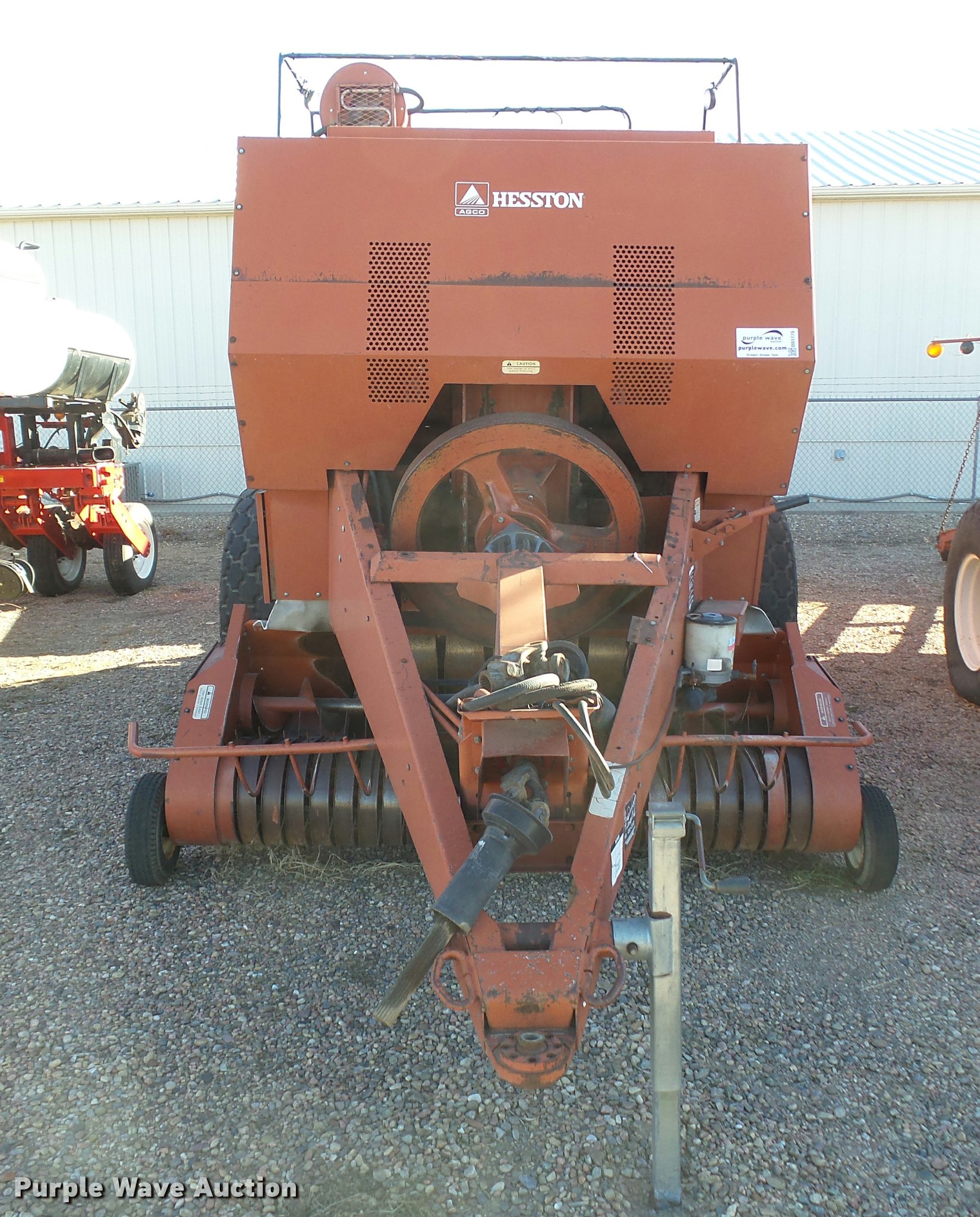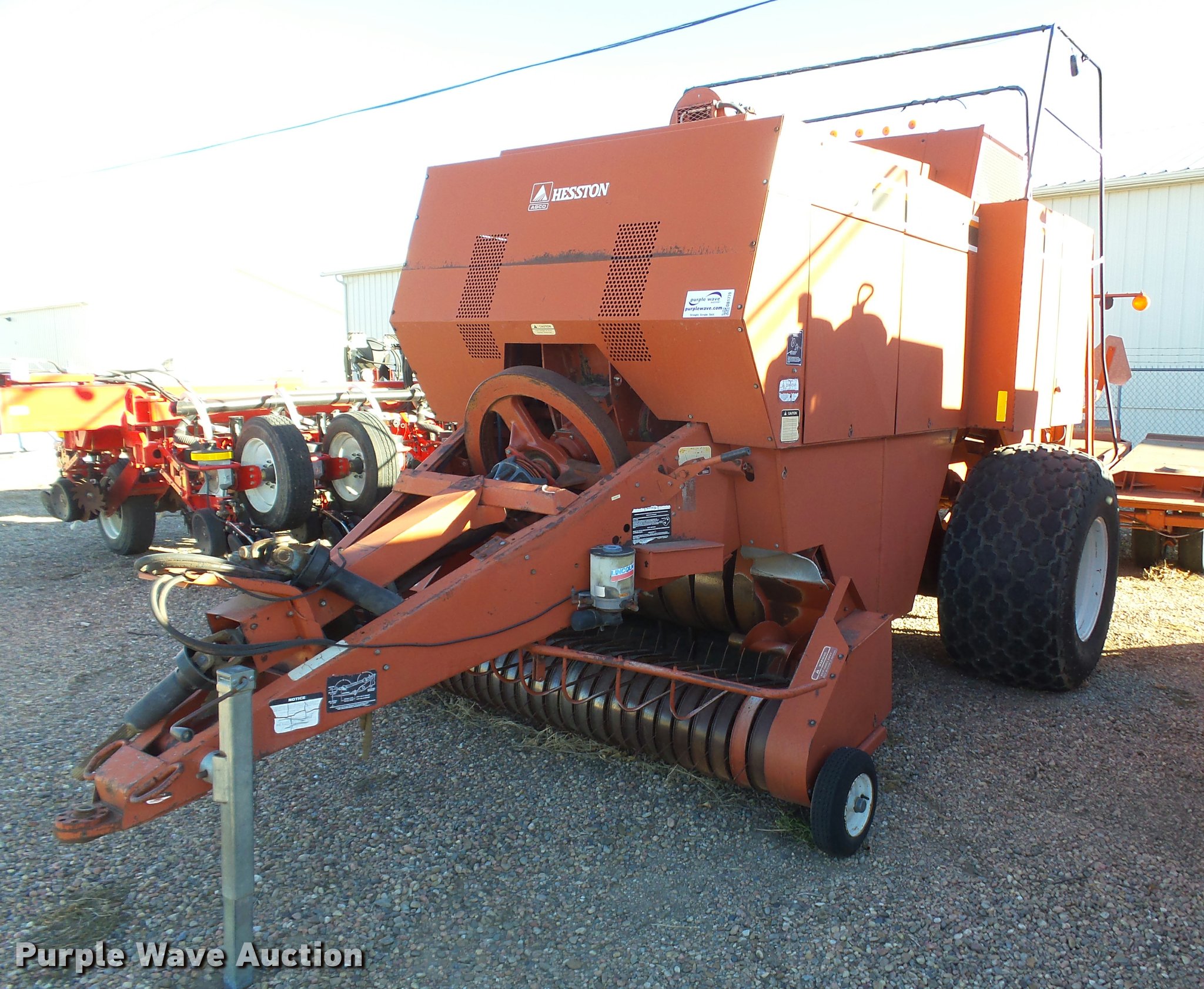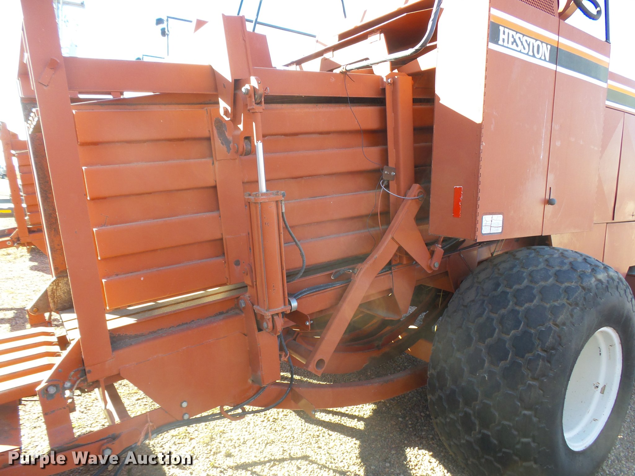 Purple Wave is selling a used Square Baler in Kansas. This item is a 1993 AGCO Hesston 4900 large square baler with the following: Approx. 26,047 bales, 4' x 4' bale capacity, 84"W pickup, Hydraulic pickup lift, Twine tie, Knotters, Hesston bale accumulator, Three bale capacity, Serial BA4900445, Large 1000 PTO, Pin hitch, 28L-26 tires, Serial BB4901369