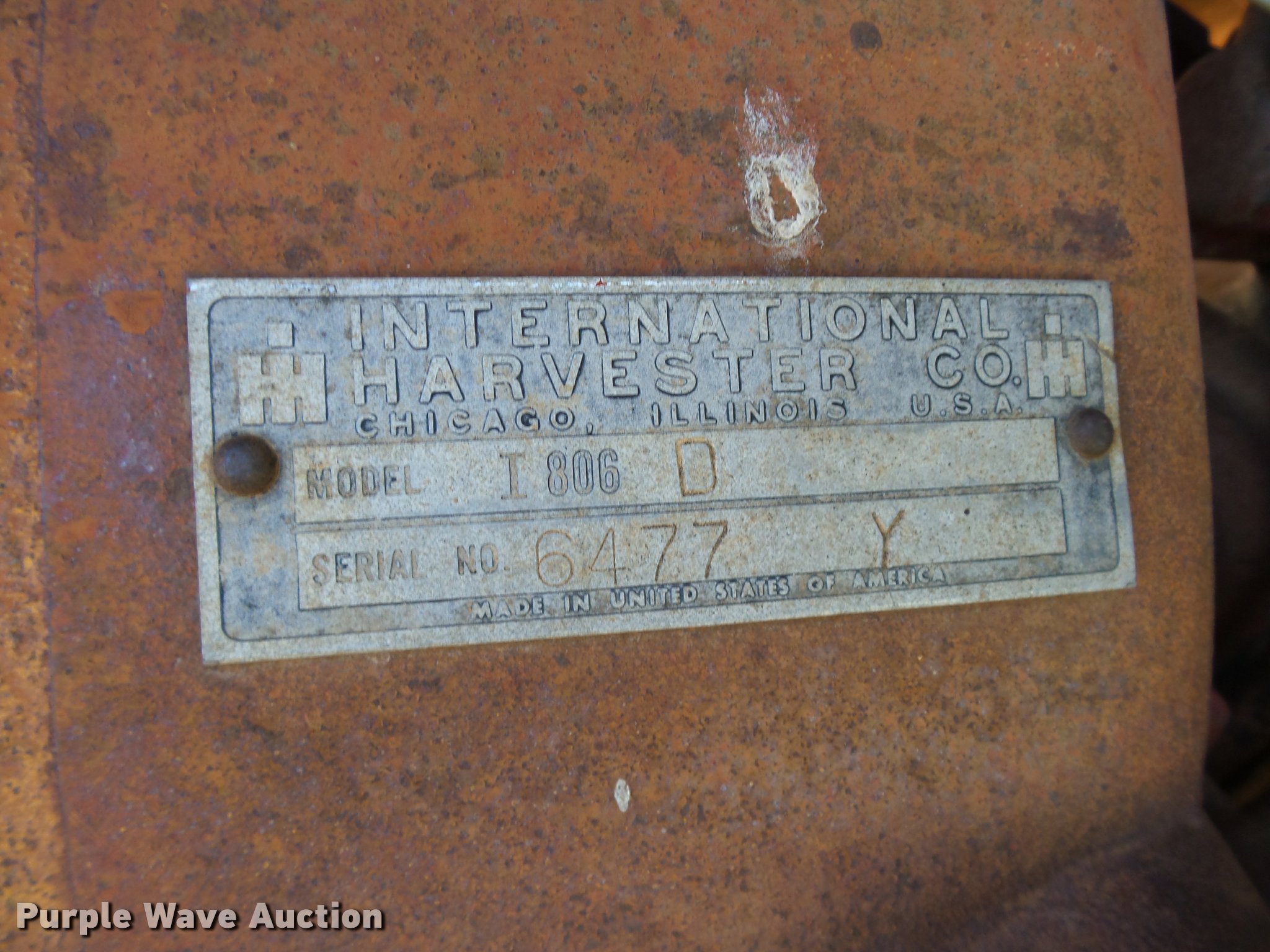 Purple Wave is selling a used Tractor in Oklahoma. This item is a 1966 International 806 tractor with the following: 8,243 hours on meter, International D-361 5.9L six cylinder diesel engine, Unsynchronized transmission, 8F-4R gears, Enclosed cab, Heat, AM/FM, Suspension seat, 540/1000 PTO, Draw bar, (2) rear hydraulic remote sets, (2) rear wheel weights, 91" wheelbase, 10.00-16 front tires, 18.4-34 rear tires, Unknown operating condition, Serial 6477
