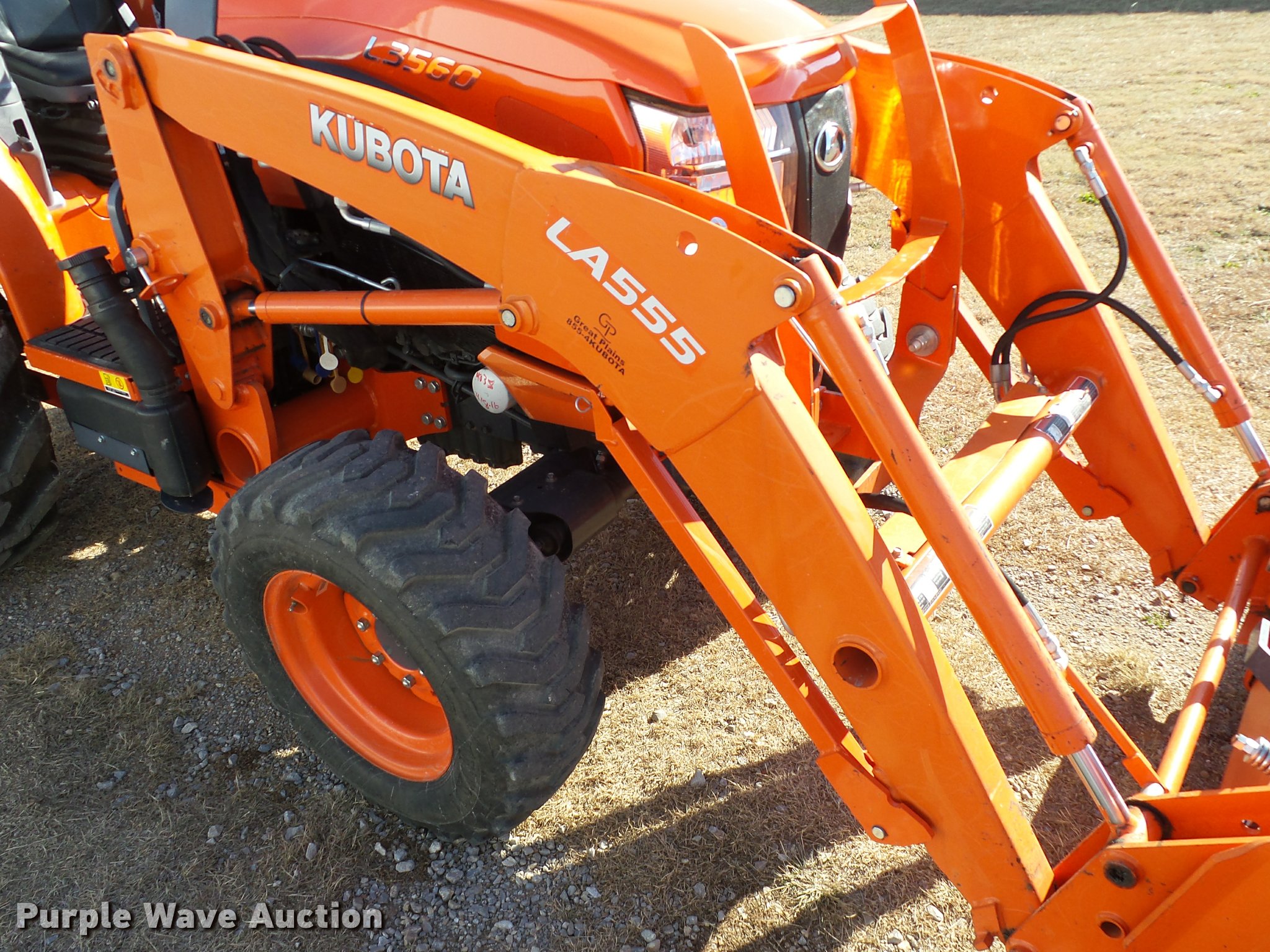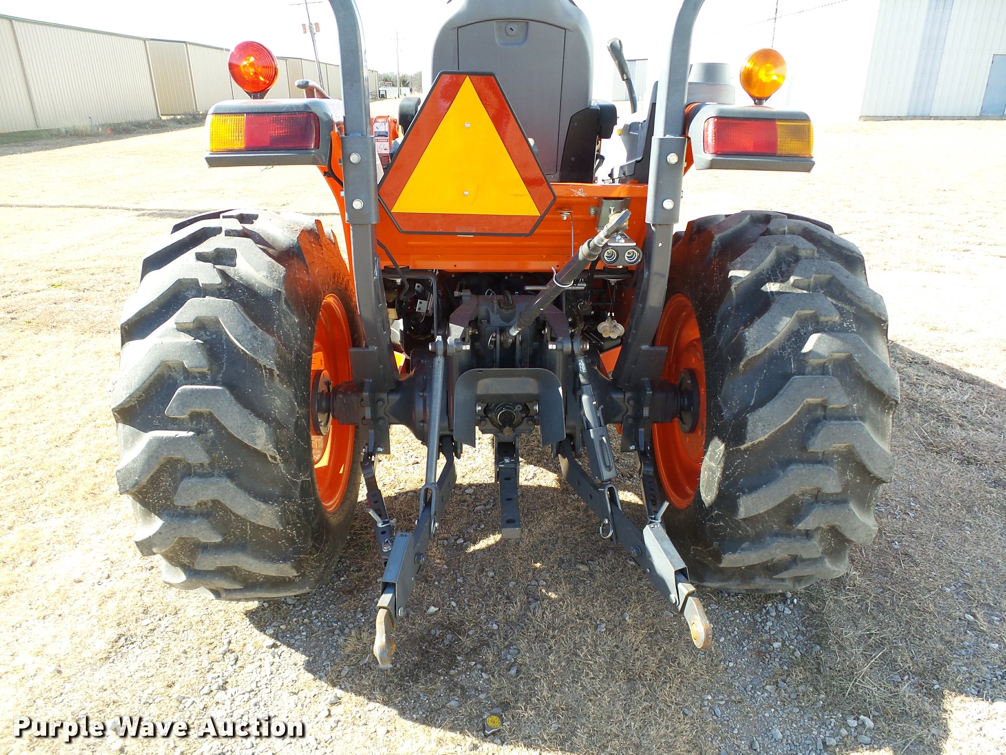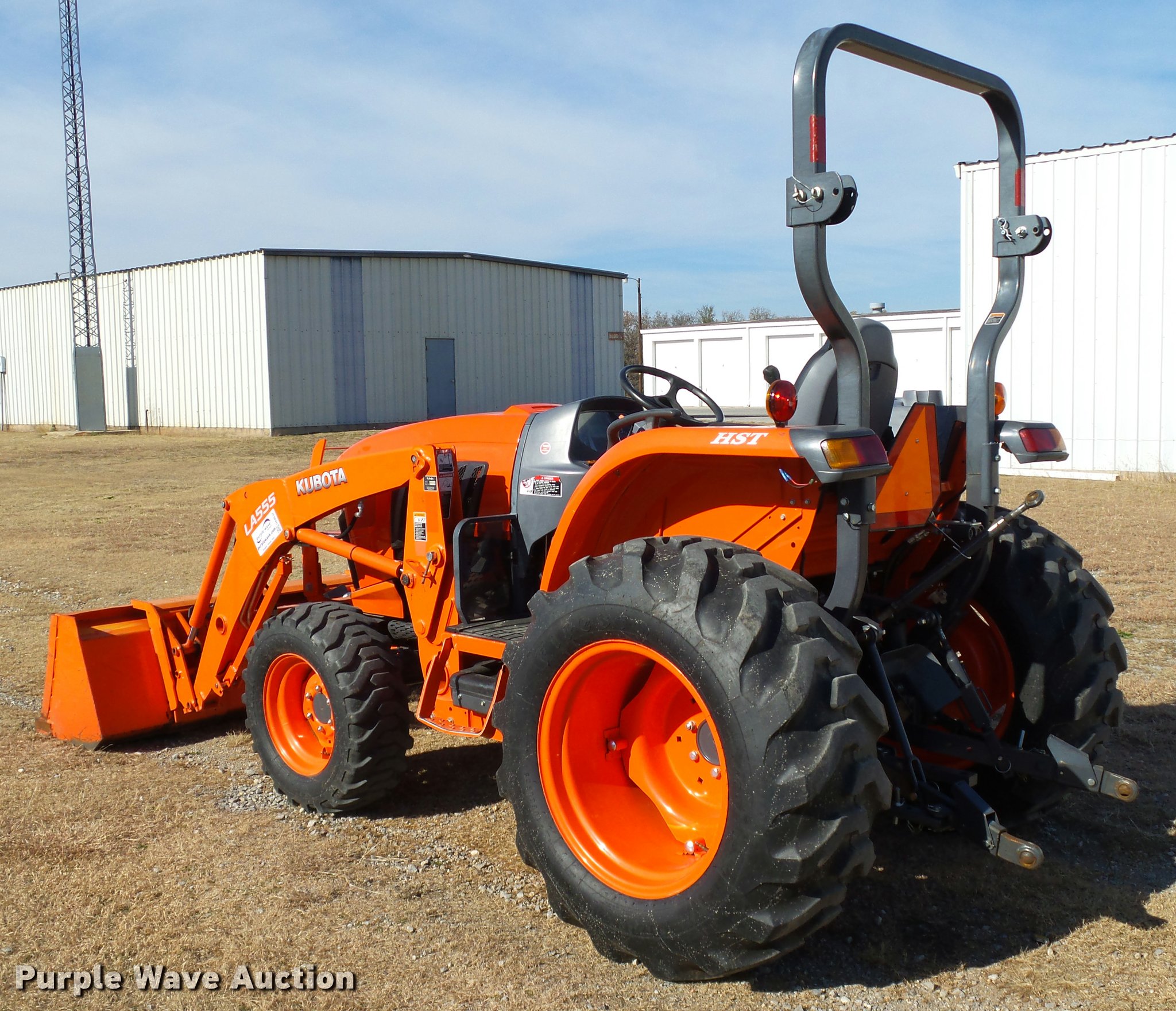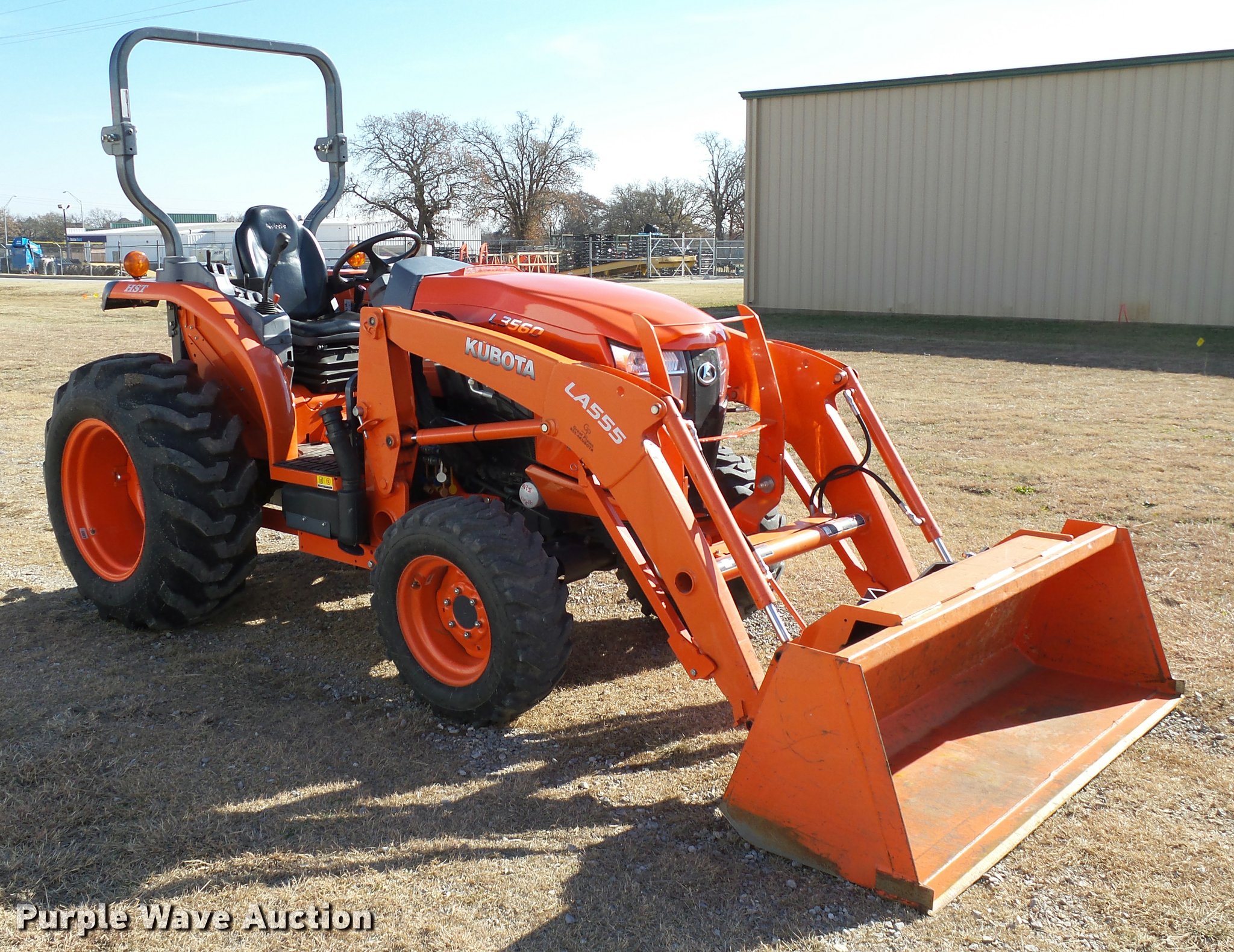 Purple Wave is selling a used Tractor in Oklahoma. This item is a 2013 Kubota L3560 HST MFWD tractor with the following: 569 hours on meter, Kubota D1803 1.8L three cylinder diesel engine, 37 HP, Hydrostatic transmission, Three range with hydro dual speed technology, Infinitely variable, Differential lock, ROPS bar, Tilt steering wheel, Suspension seat, Kubota LA555 loader, 72"W bucket, Manual quick attach, Joystick controls, Three point, Top link, 540 PTO, Draw bar, Rear hydraulic remote set, 71" wheelbase, Titan 10-16.5 NHS front tires, Firestone 420/70-24 rear tires, Serial L3560D30850