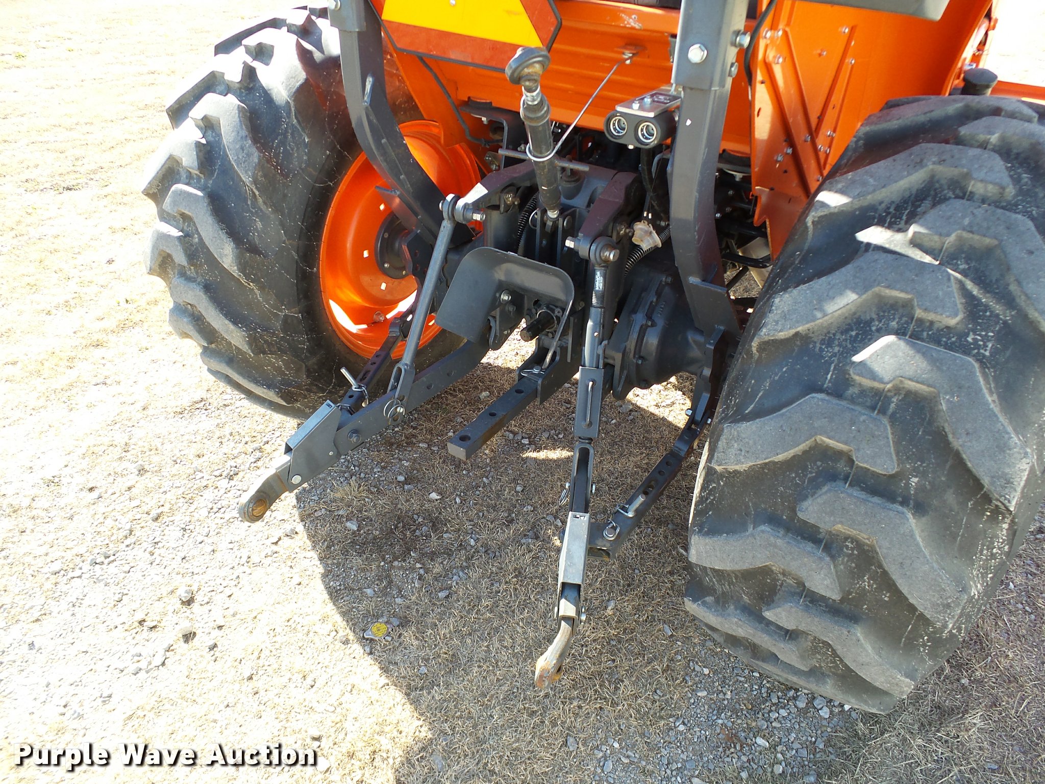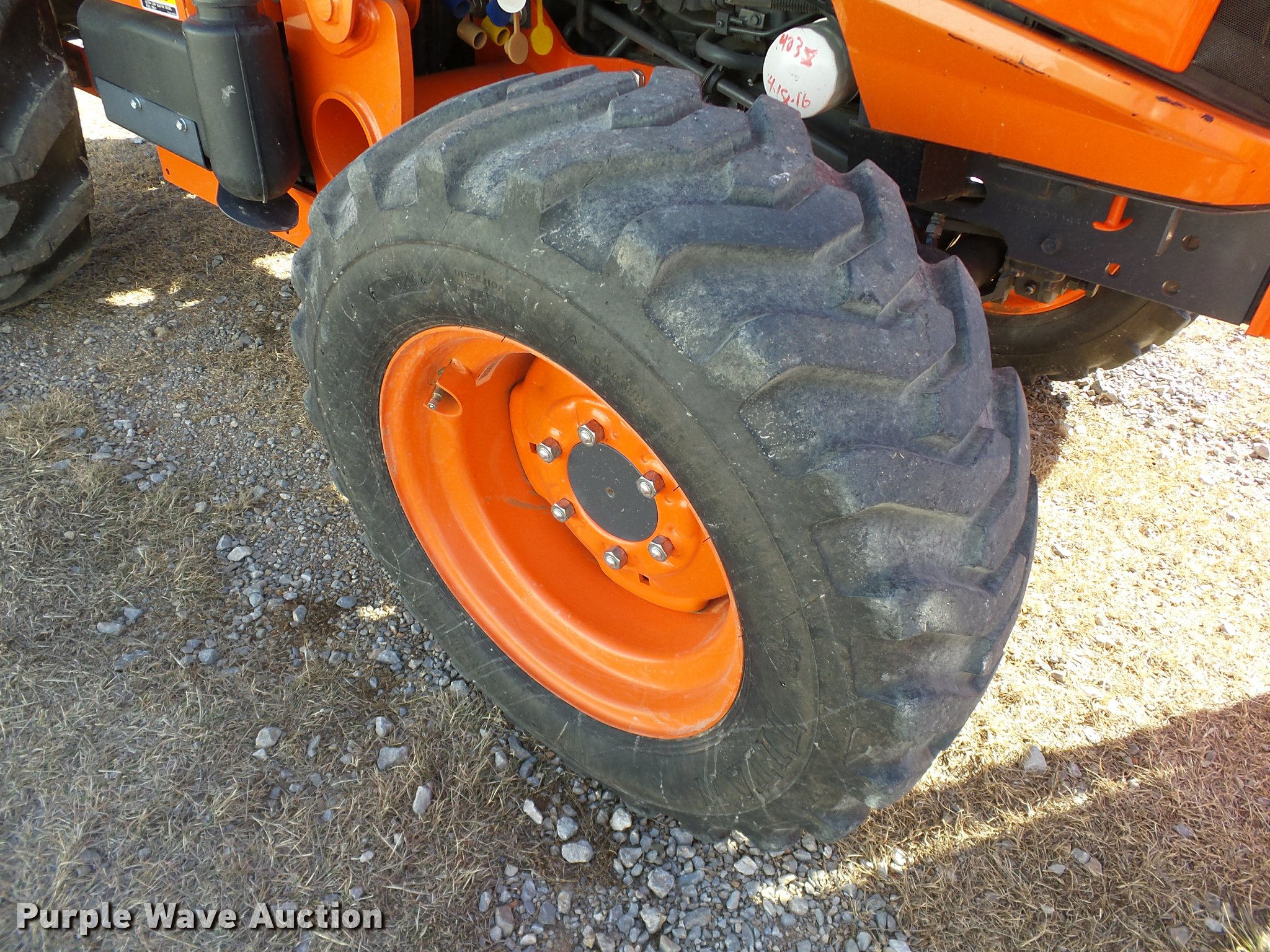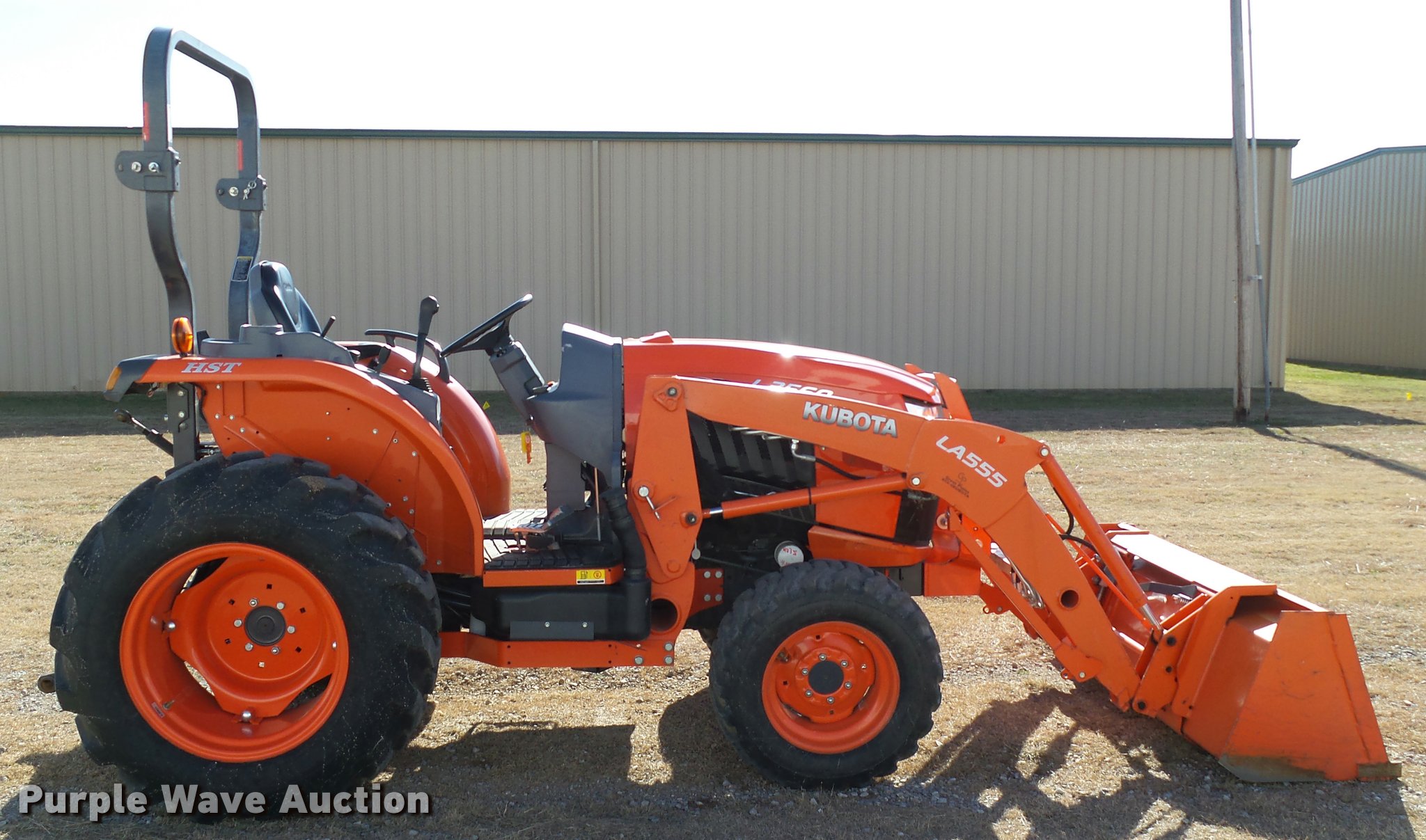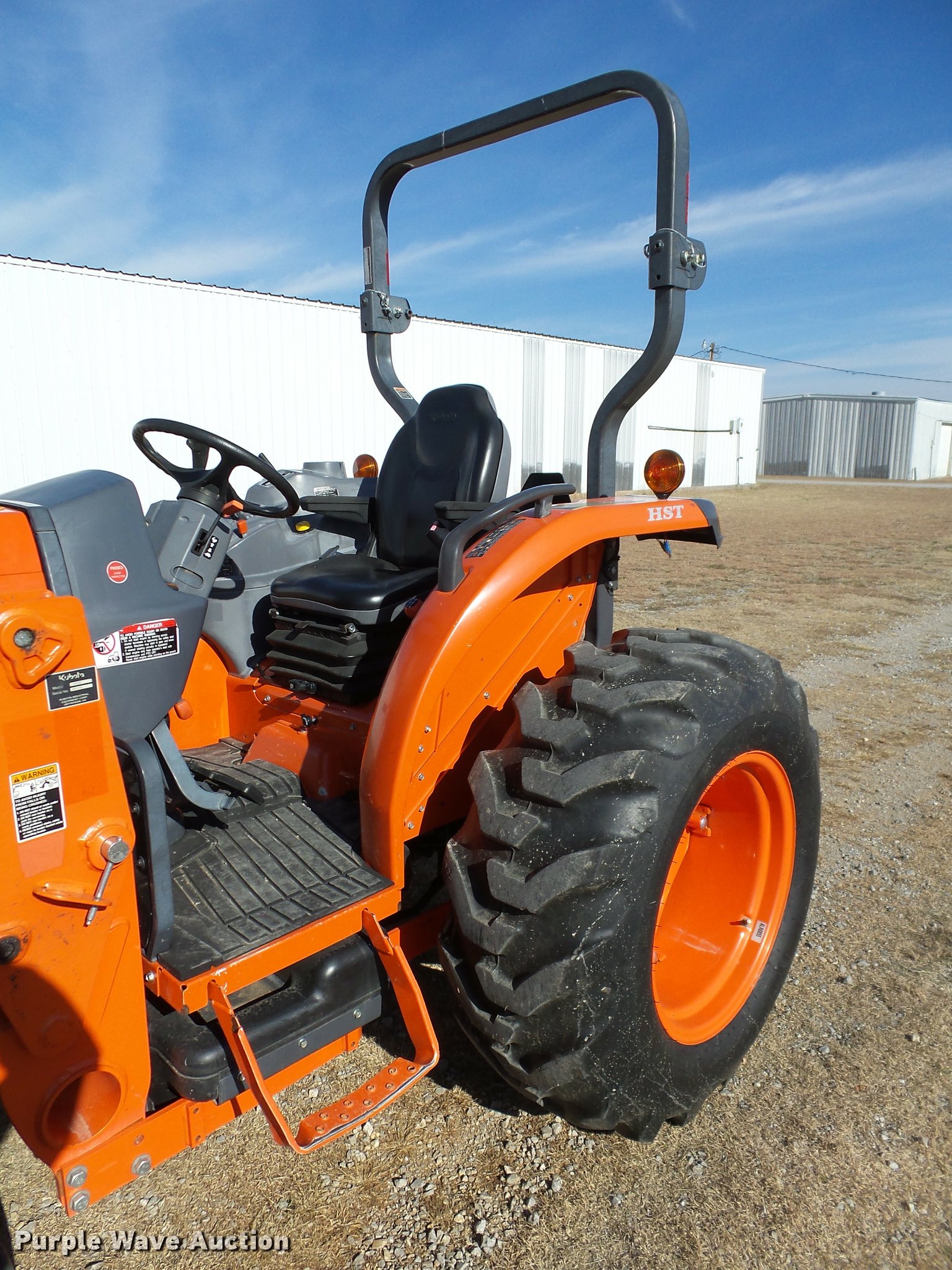 Purple Wave is selling a used Tractor in Oklahoma. This item is a 2013 Kubota L3560 HST MFWD tractor with the following: 569 hours on meter, Kubota D1803 1.8L three cylinder diesel engine, 37 HP, Hydrostatic transmission, Three range with hydro dual speed technology, Infinitely variable, Differential lock, ROPS bar, Tilt steering wheel, Suspension seat, Kubota LA555 loader, 72"W bucket, Manual quick attach, Joystick controls, Three point, Top link, 540 PTO, Draw bar, Rear hydraulic remote set, 71" wheelbase, Titan 10-16.5 NHS front tires, Firestone 420/70-24 rear tires, Serial L3560D30850