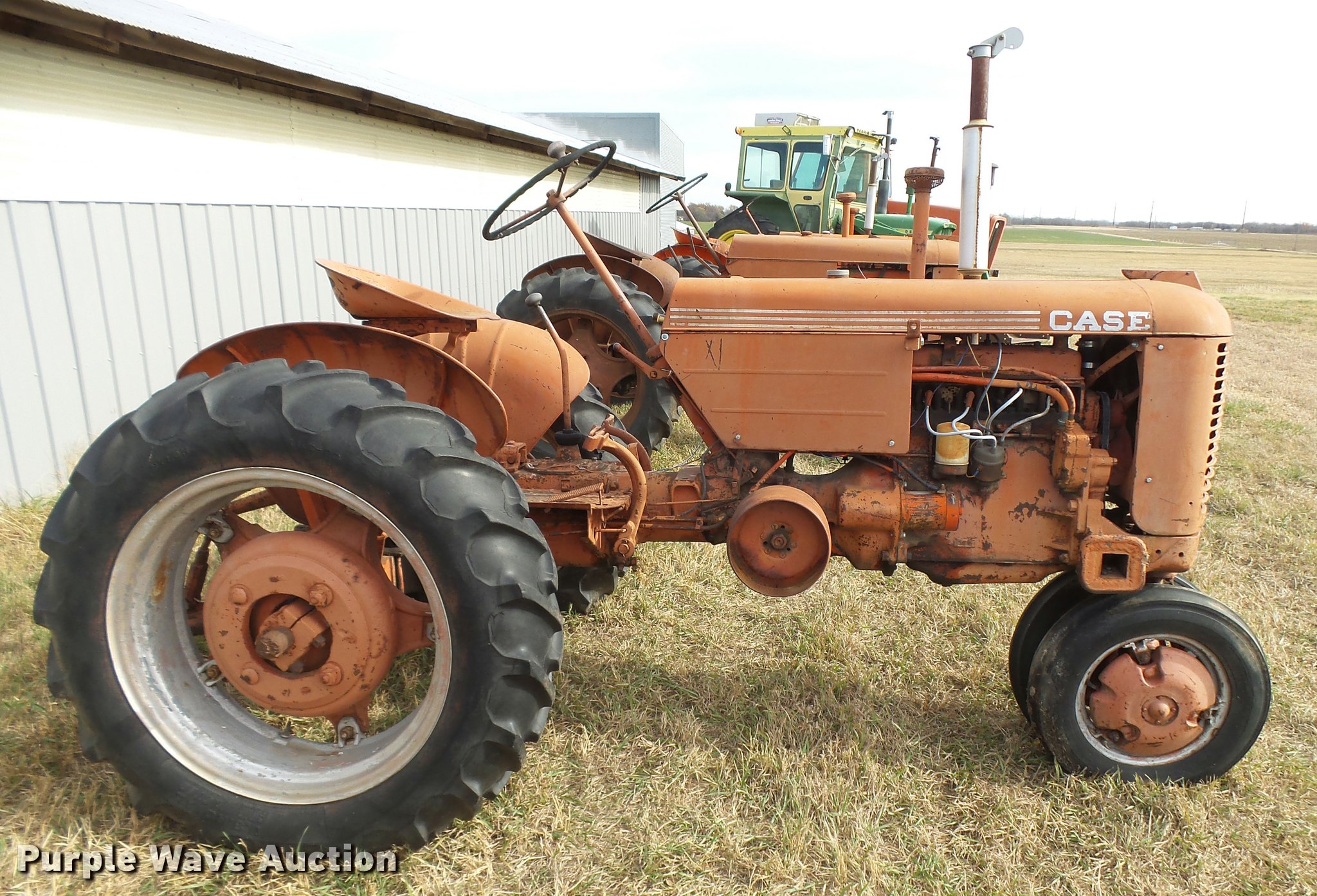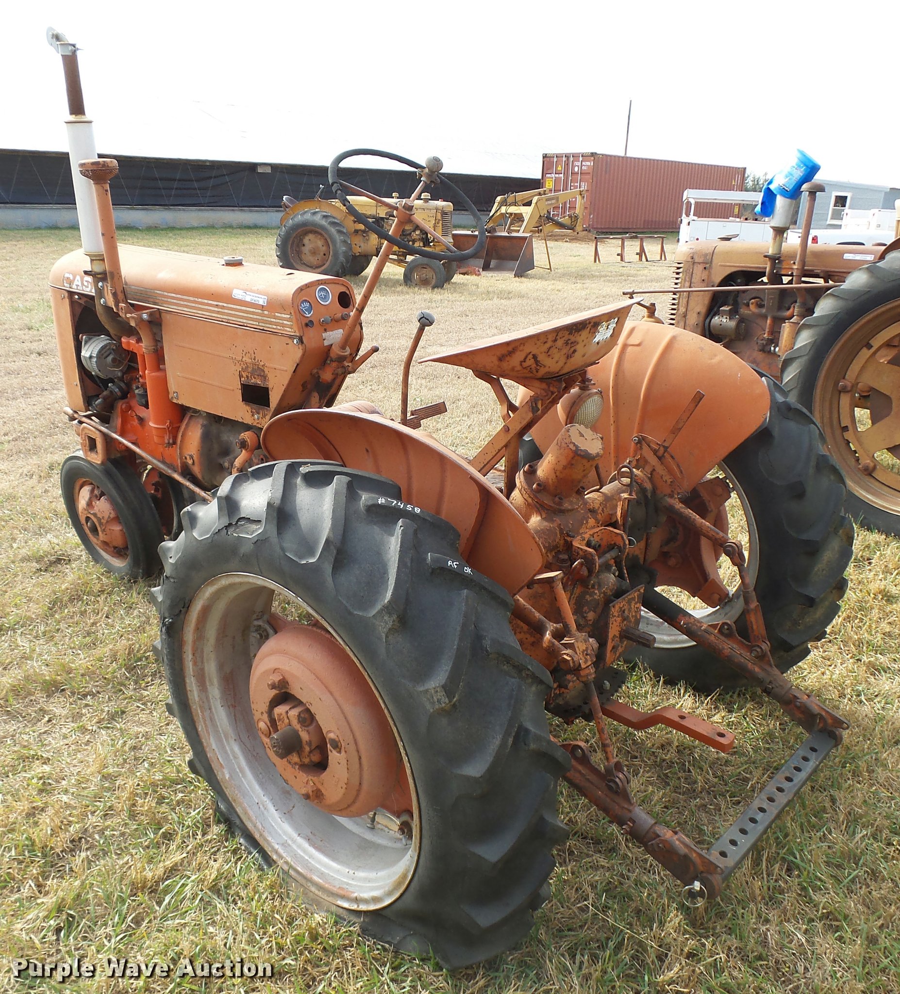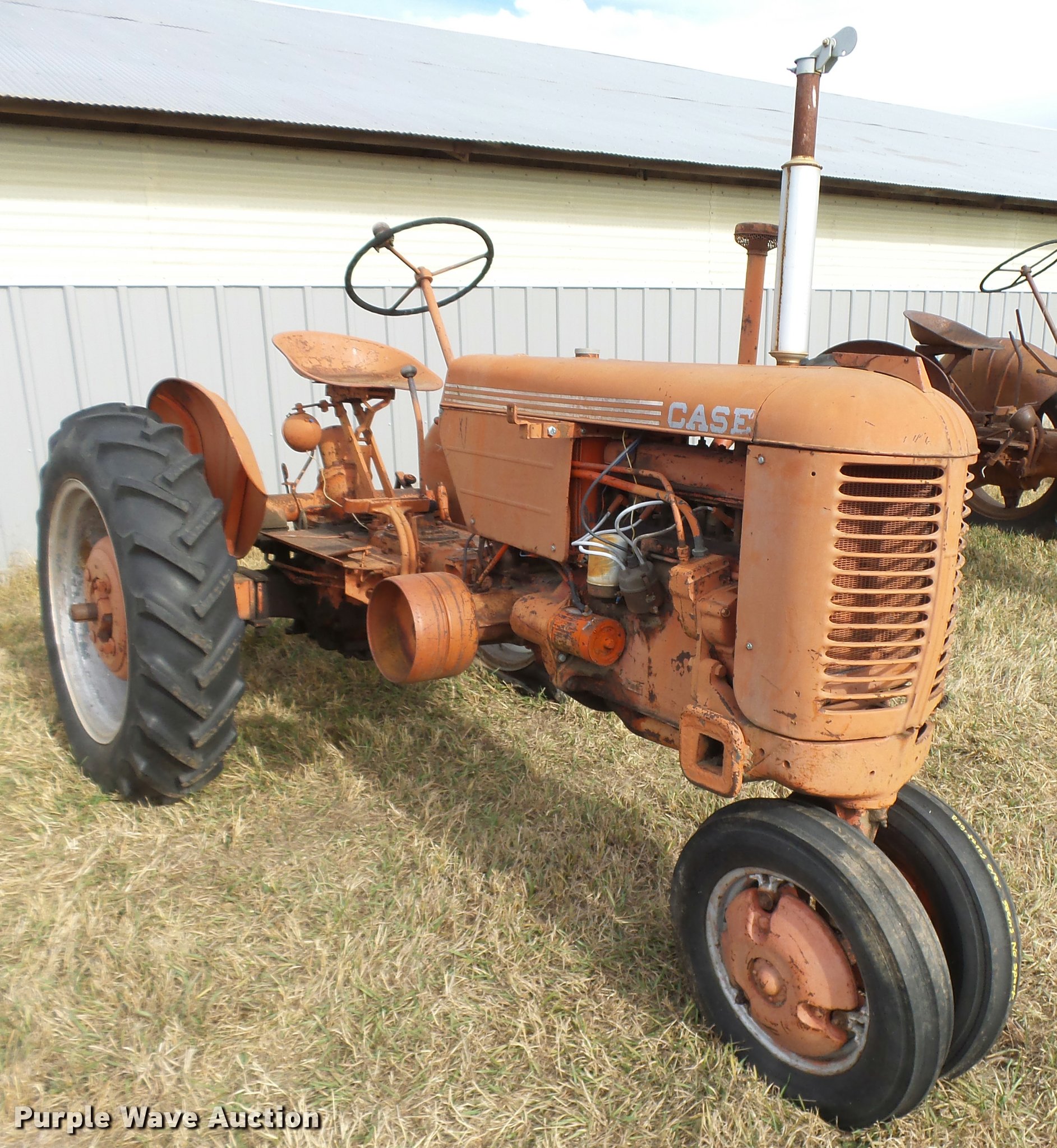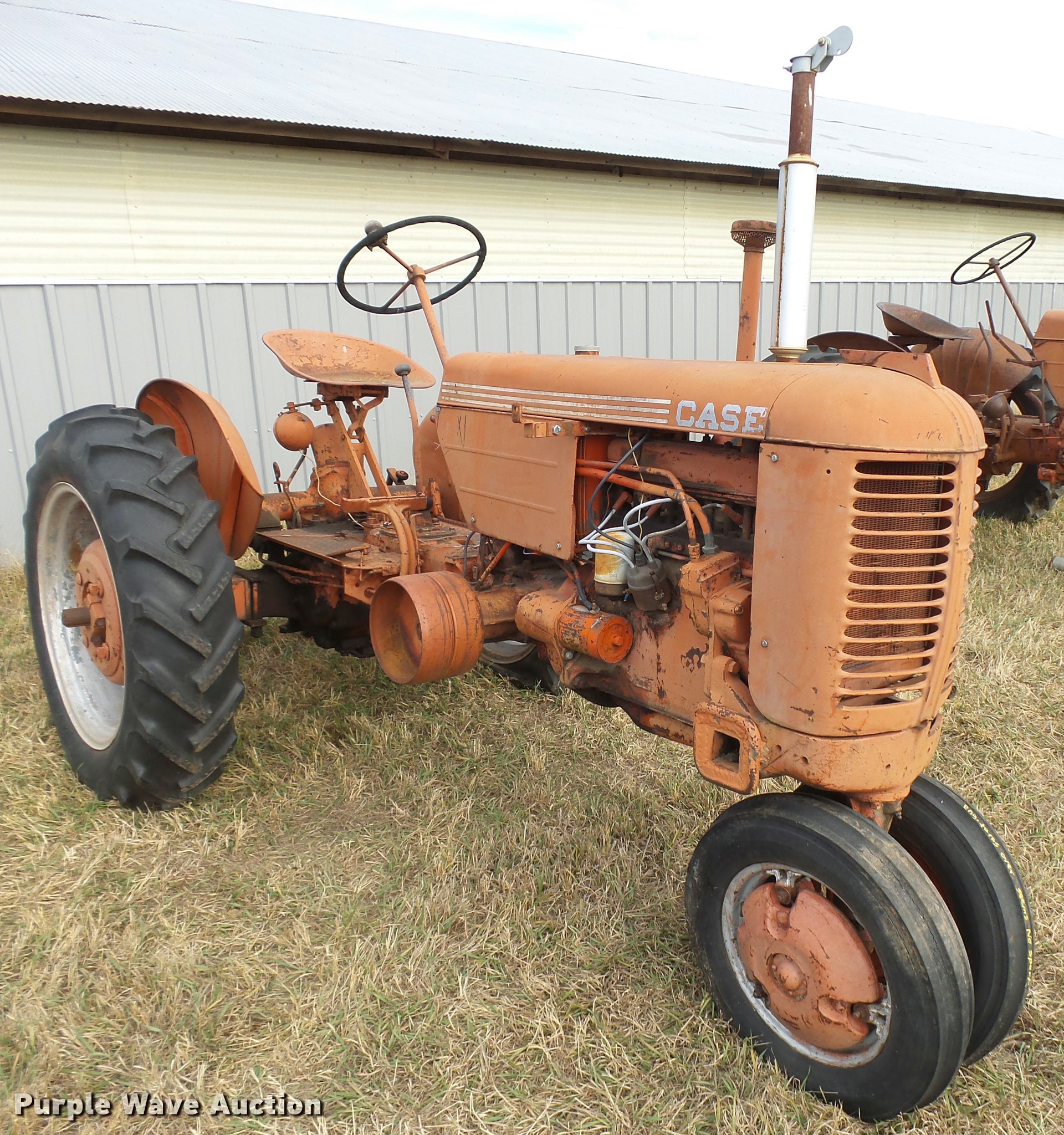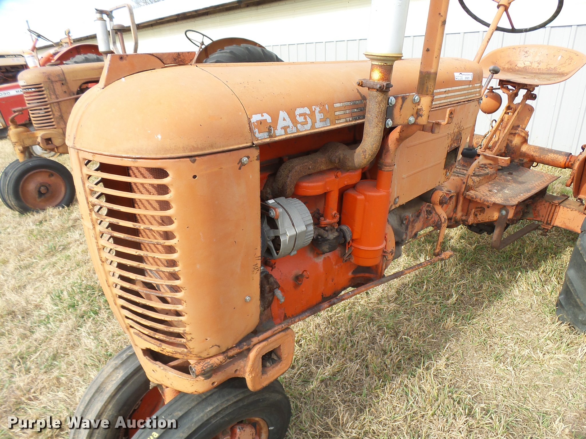 Purple Wave is selling a used Tractor in Kansas. This item is a 1950 Case VAC tractor with the following: Four cylinder gas engine, Four speed manual transmission, Electric start, Side pulley, Three point, 540 PTO, Draw bar, Front wheel weights, Rear outside wheel weights, 5.00x15 front tires, 11.2x28 rear tires, One tire flat, No hand crank, Engine turns over, but will not start, Serial 5451642, Unit# 7458