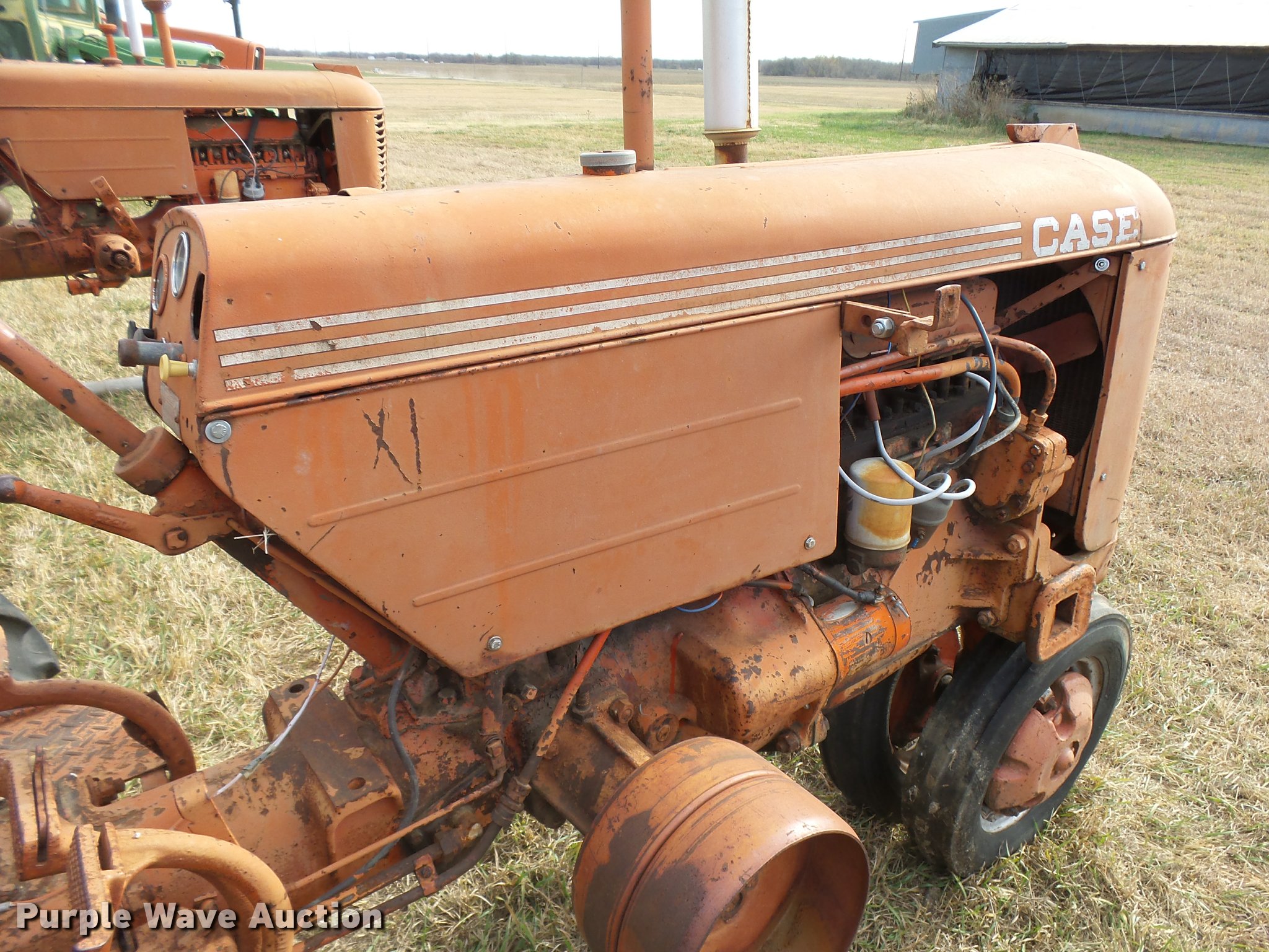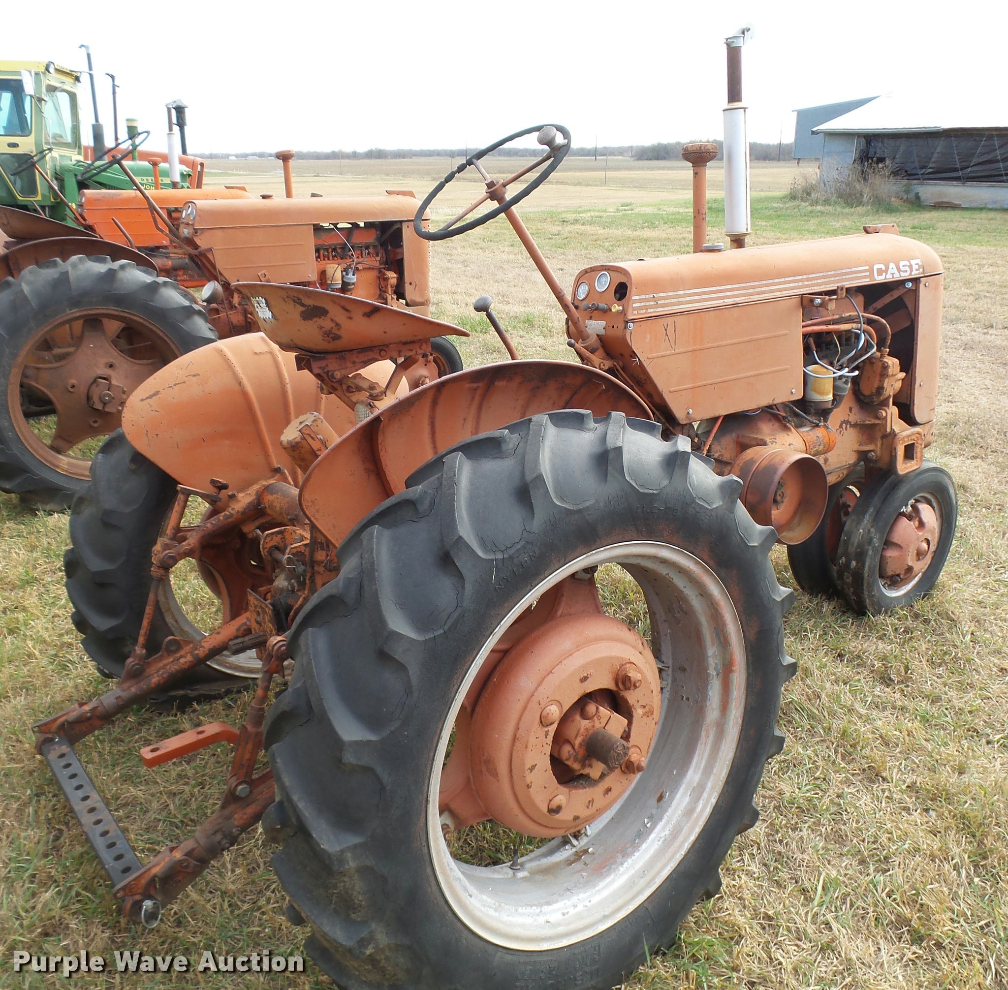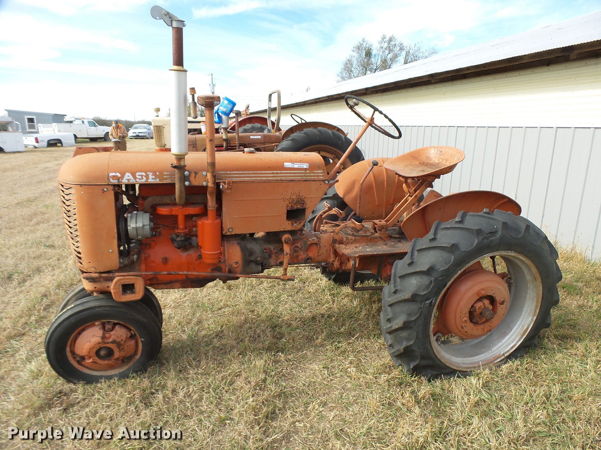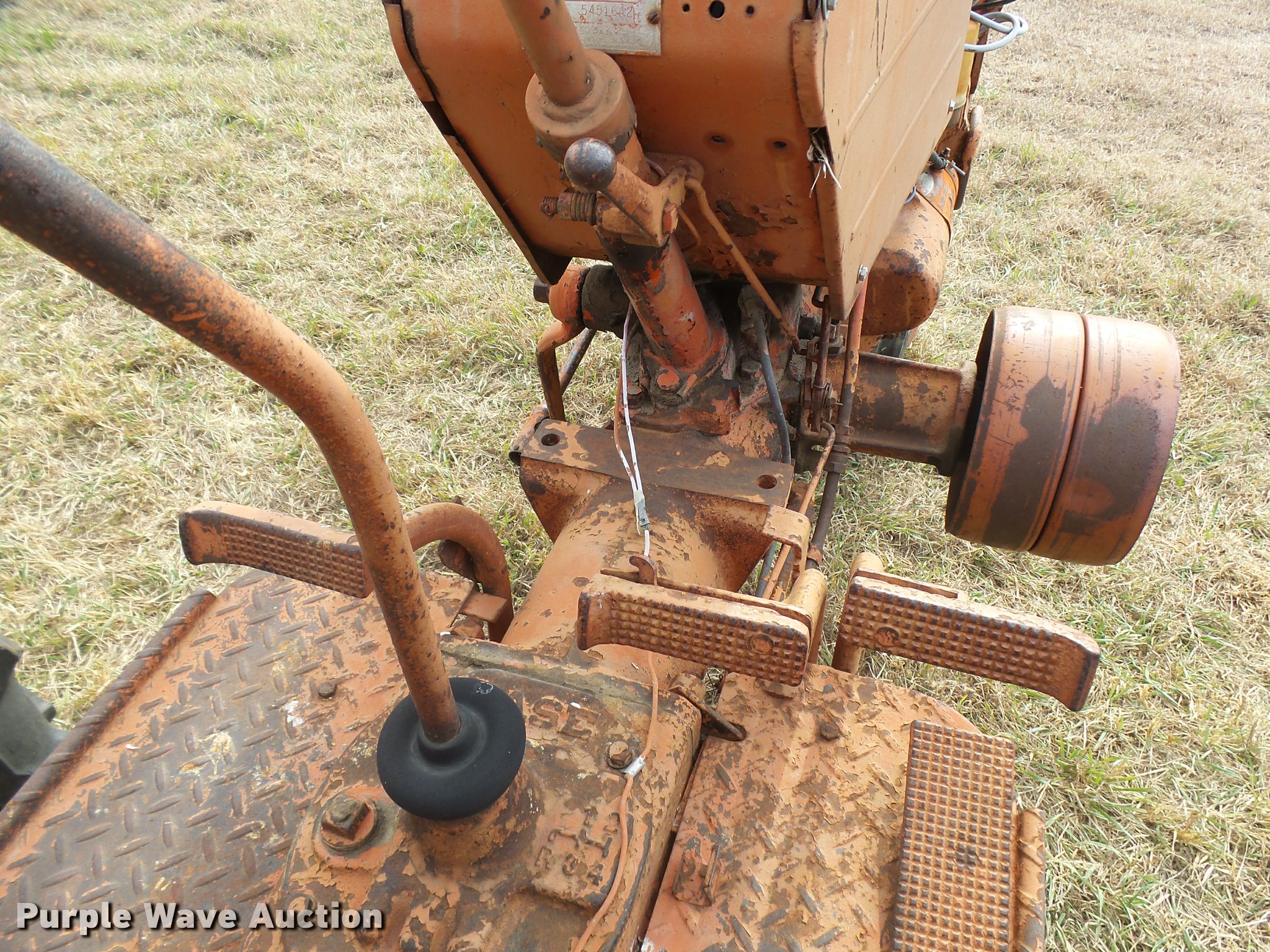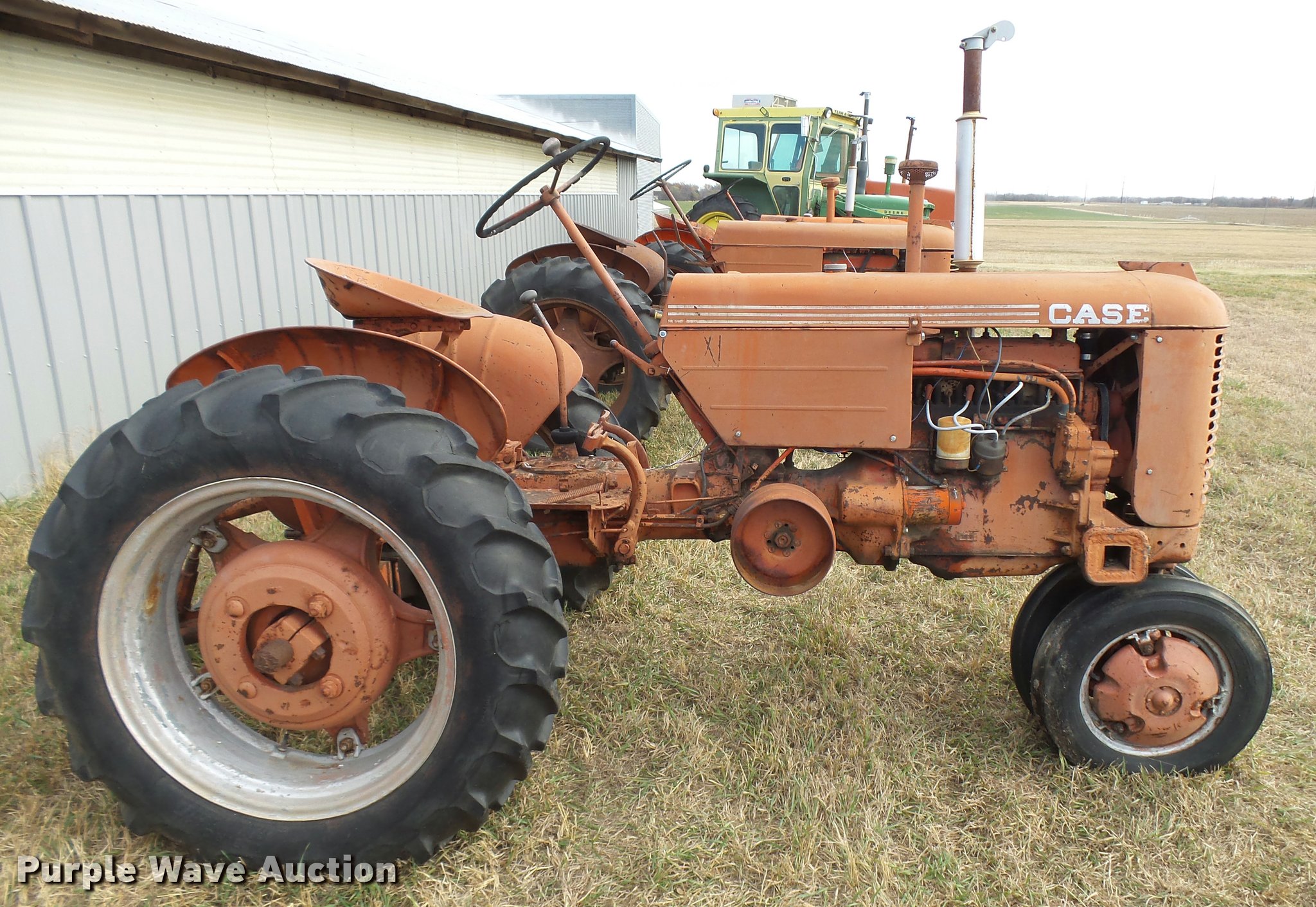 Purple Wave is selling a used Tractor in Kansas. This item is a 1950 Case VAC tractor with the following: Four cylinder gas engine, Four speed manual transmission, Electric start, Side pulley, Three point, 540 PTO, Draw bar, Front wheel weights, Rear outside wheel weights, 5.00x15 front tires, 11.2x28 rear tires, One tire flat, No hand crank, Engine turns over, but will not start, Serial 5451642, Unit# 7458