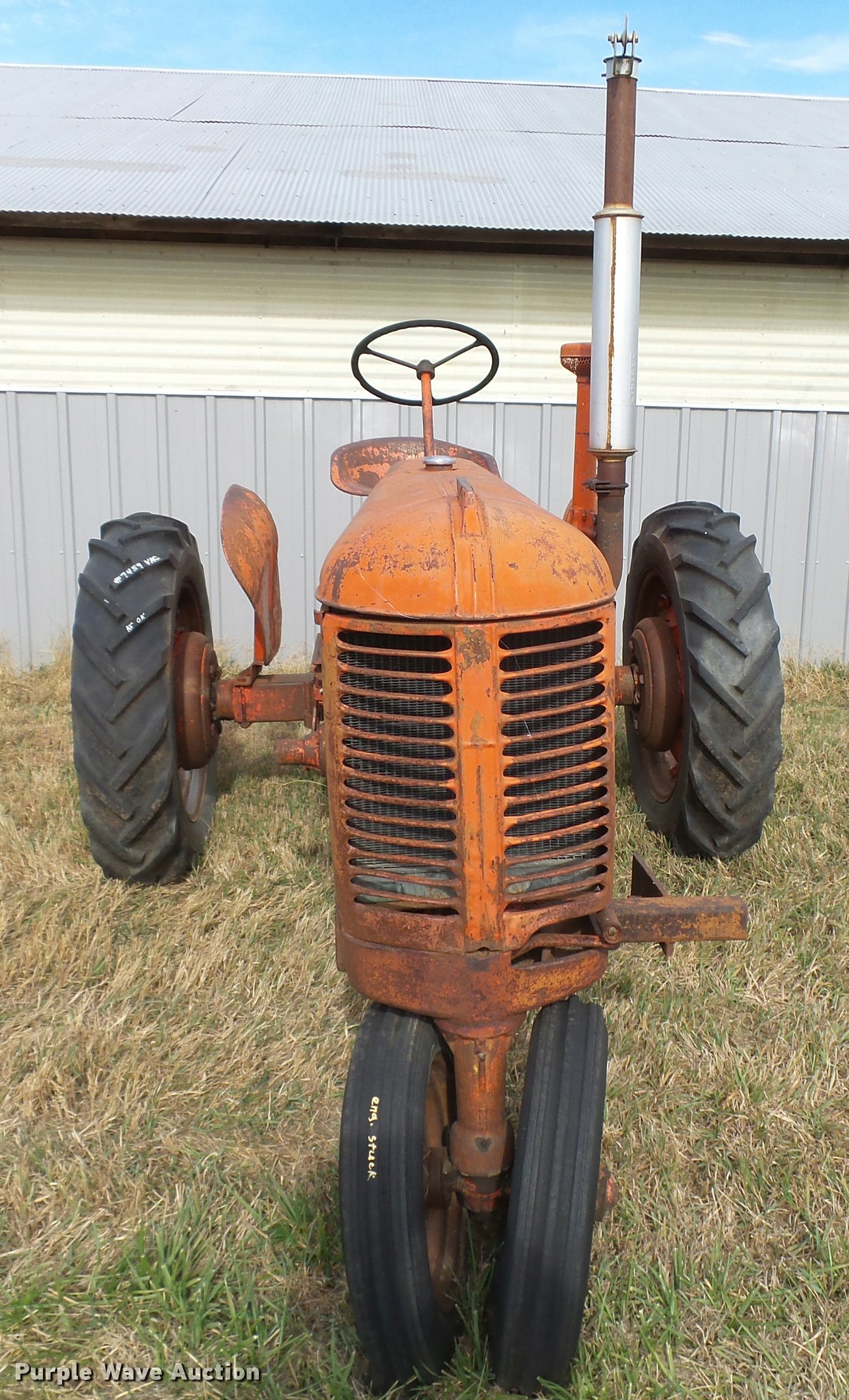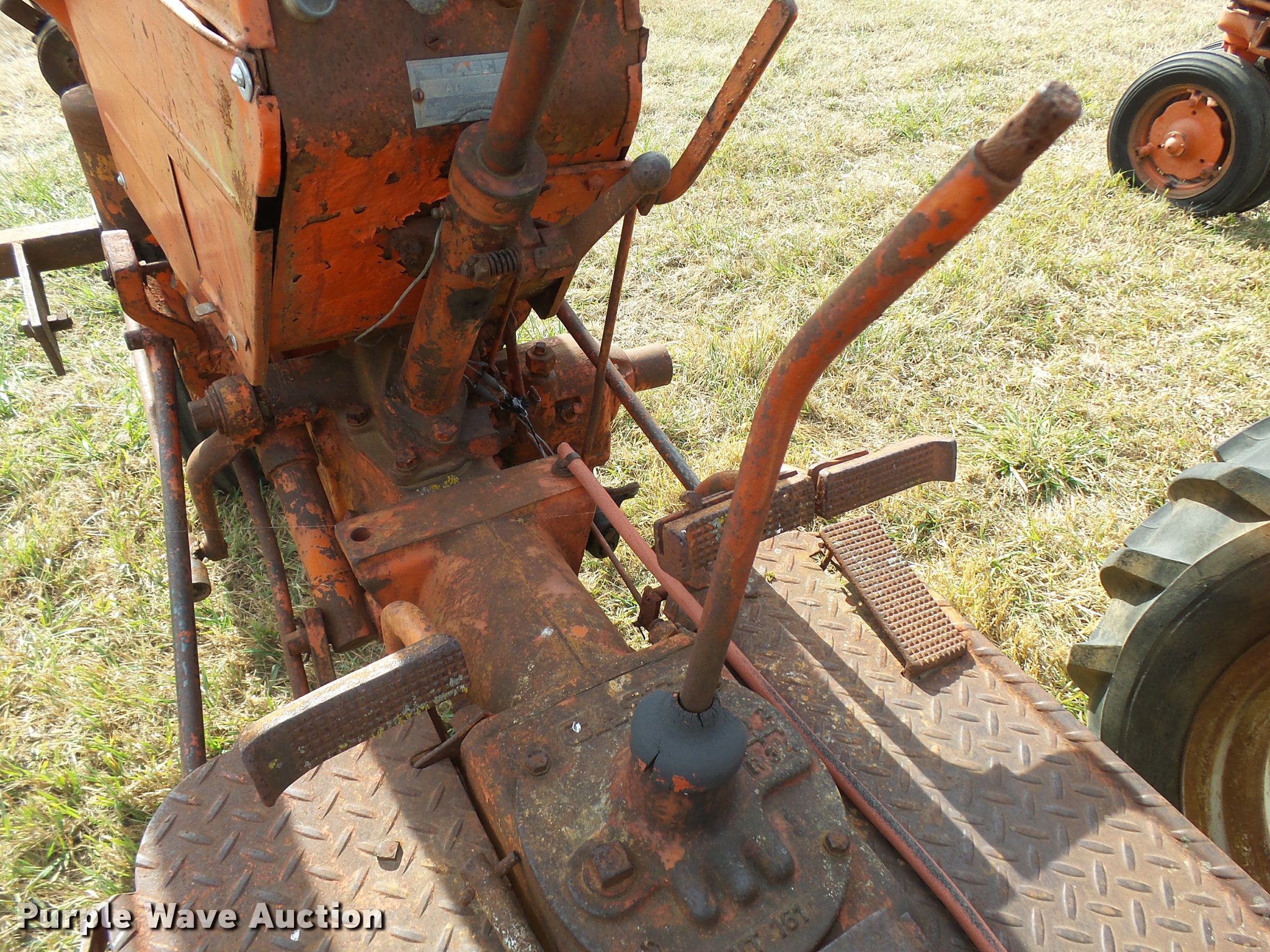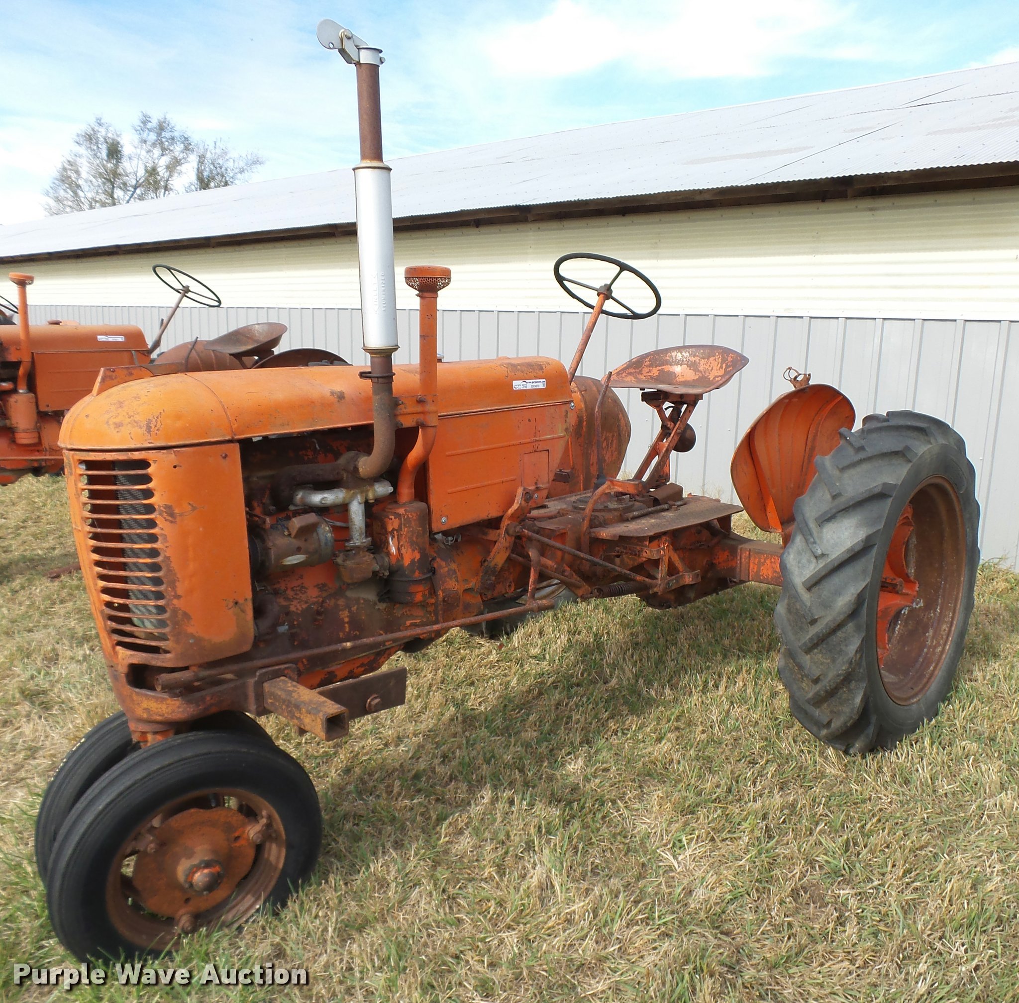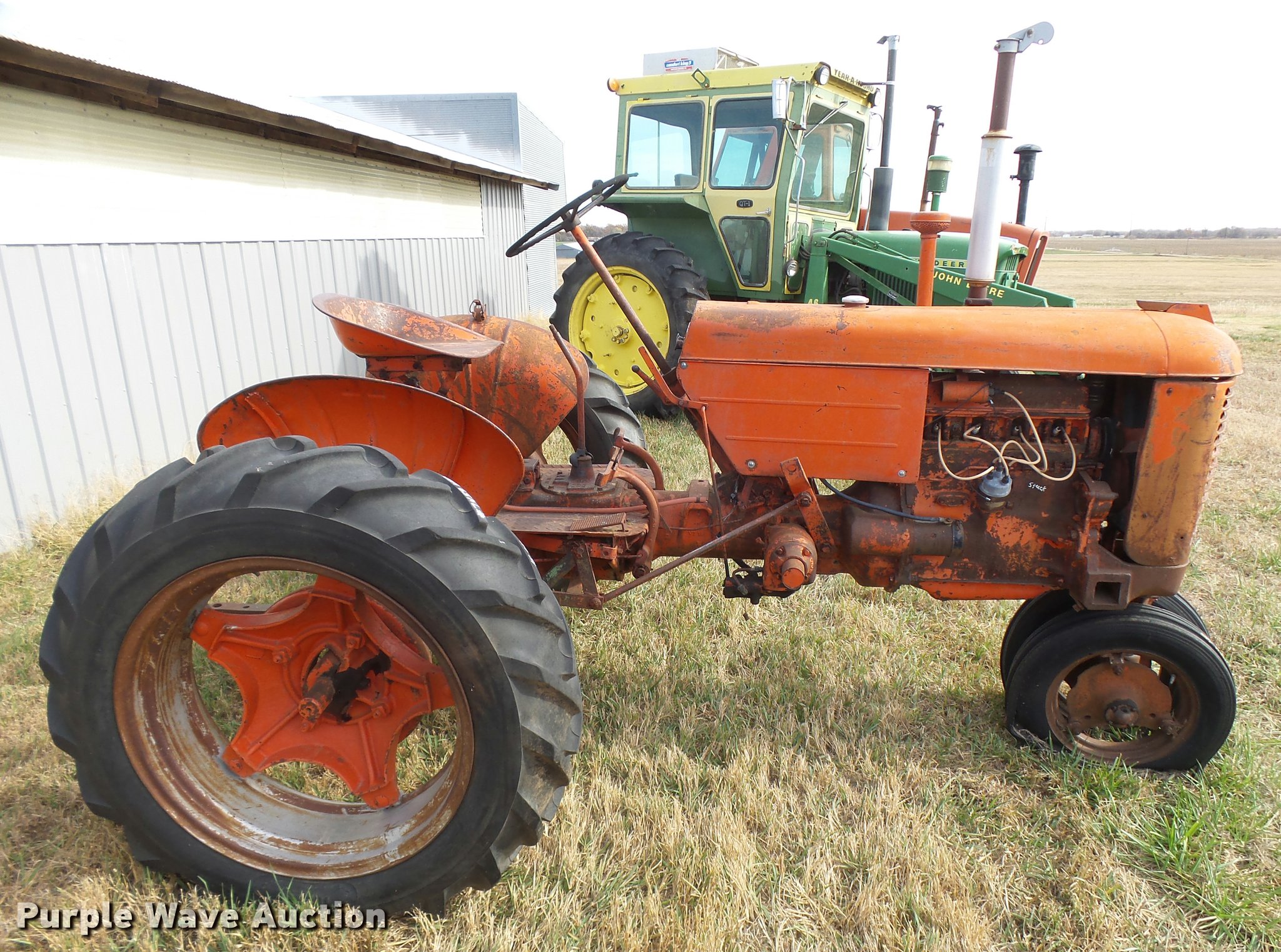 Purple Wave is selling a used Tractor in Kansas. This item is a 1947 Case VAC tractor with the following: Four cylinder gas engine, Locked up, Four speed manual transmission, Hand crank, Electric start, 540 PTO, Draw bar, Tricycle front end, Inner rear wheel weights, 5.00x15 front tires, 11.2x28 rear tires, Front tires flat, Side pulley missing, Serial VAC5165477, Unit# 7459