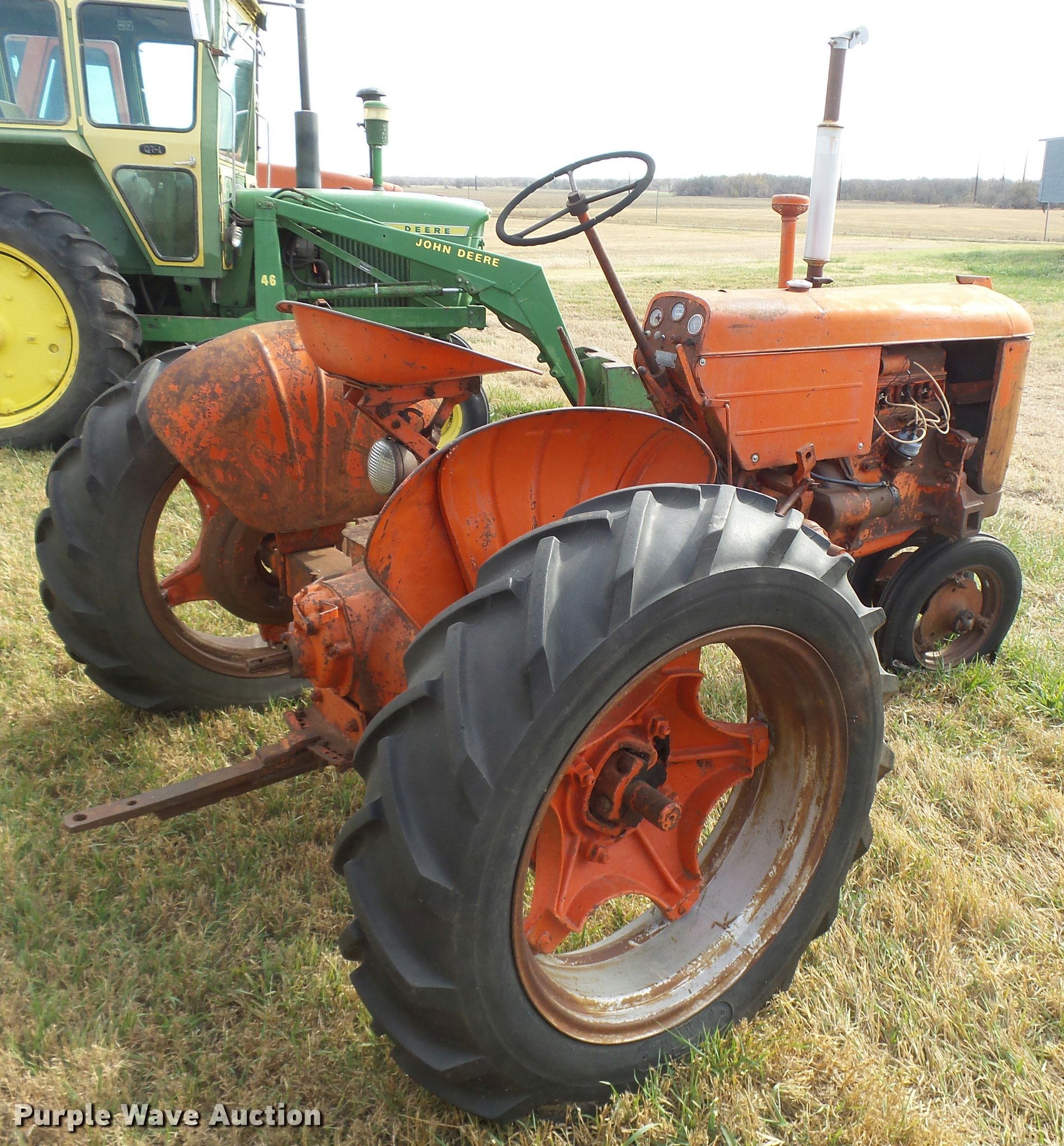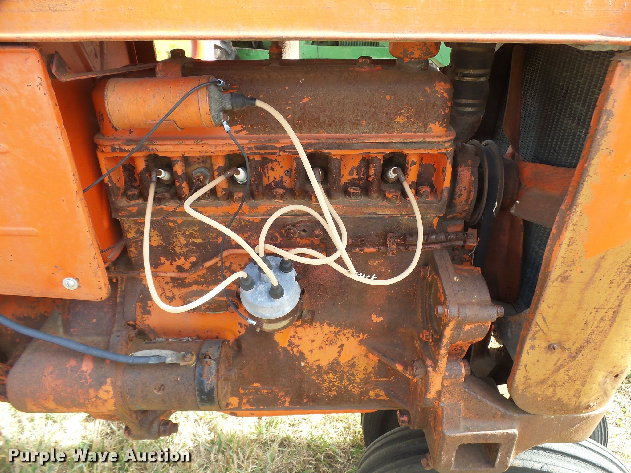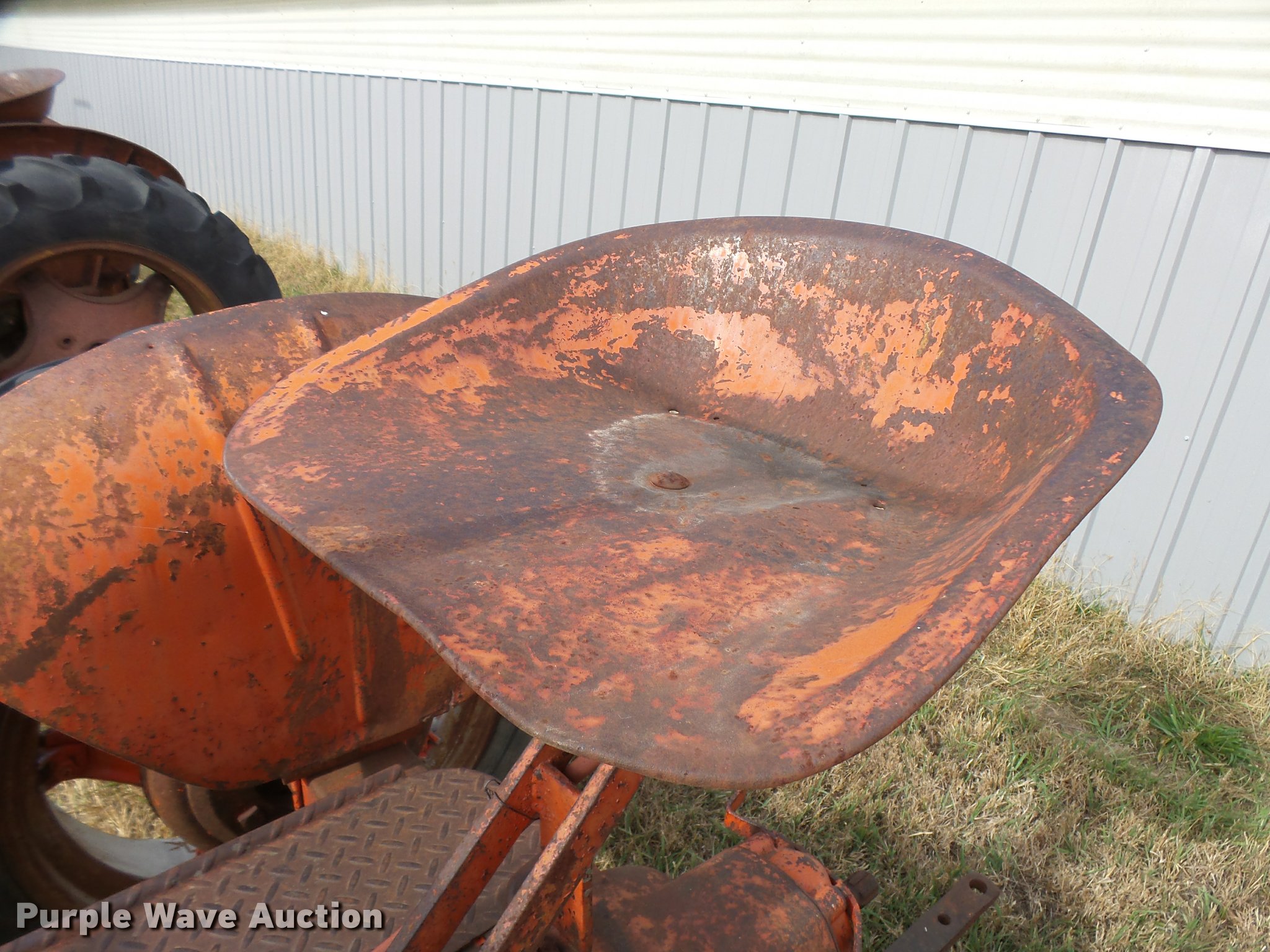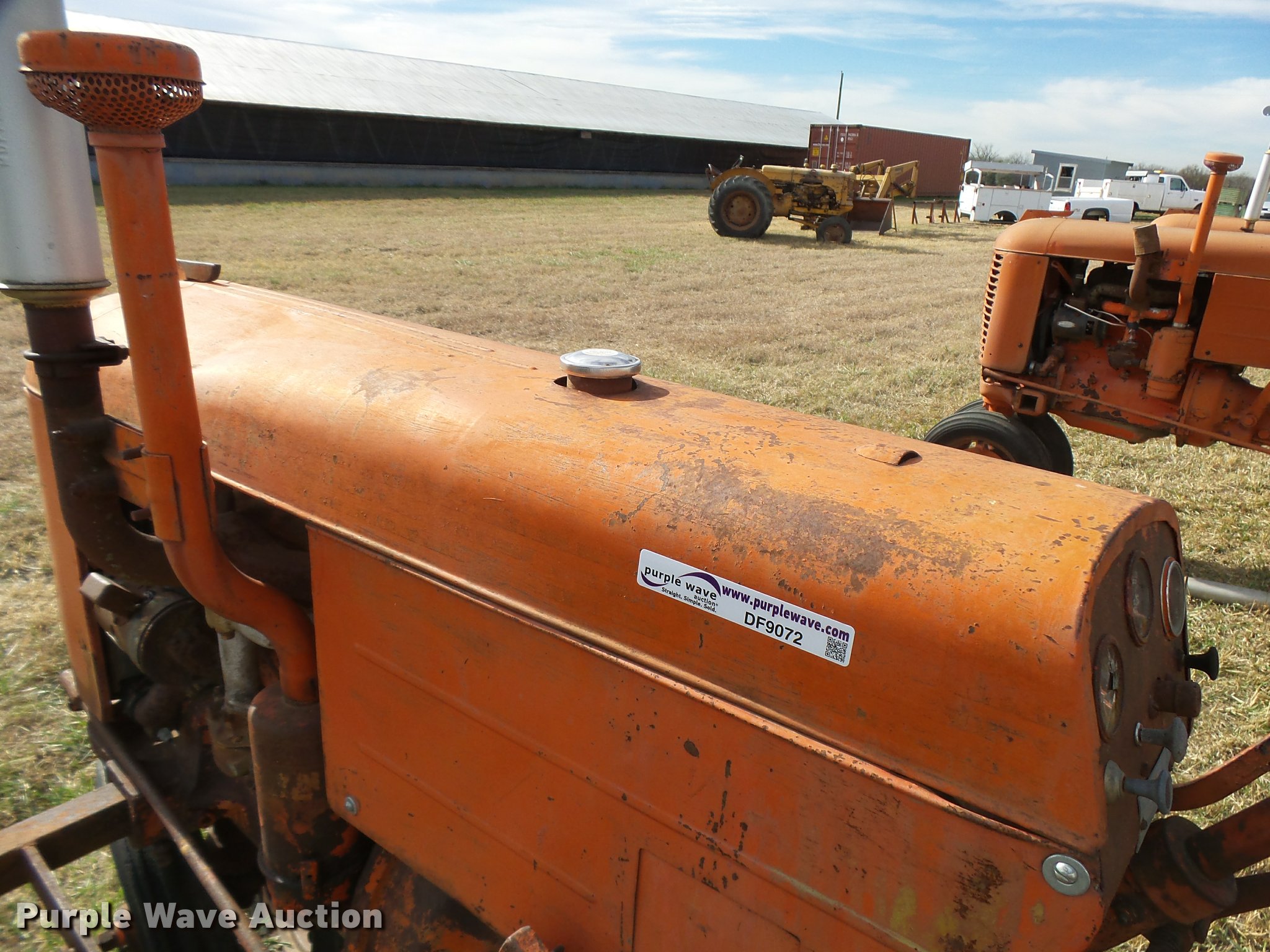 Purple Wave is selling a used Tractor in Kansas. This item is a 1947 Case VAC tractor with the following: Four cylinder gas engine, Locked up, Four speed manual transmission, Hand crank, Electric start, 540 PTO, Draw bar, Tricycle front end, Inner rear wheel weights, 5.00x15 front tires, 11.2x28 rear tires, Front tires flat, Side pulley missing, Serial VAC5165477, Unit# 7459