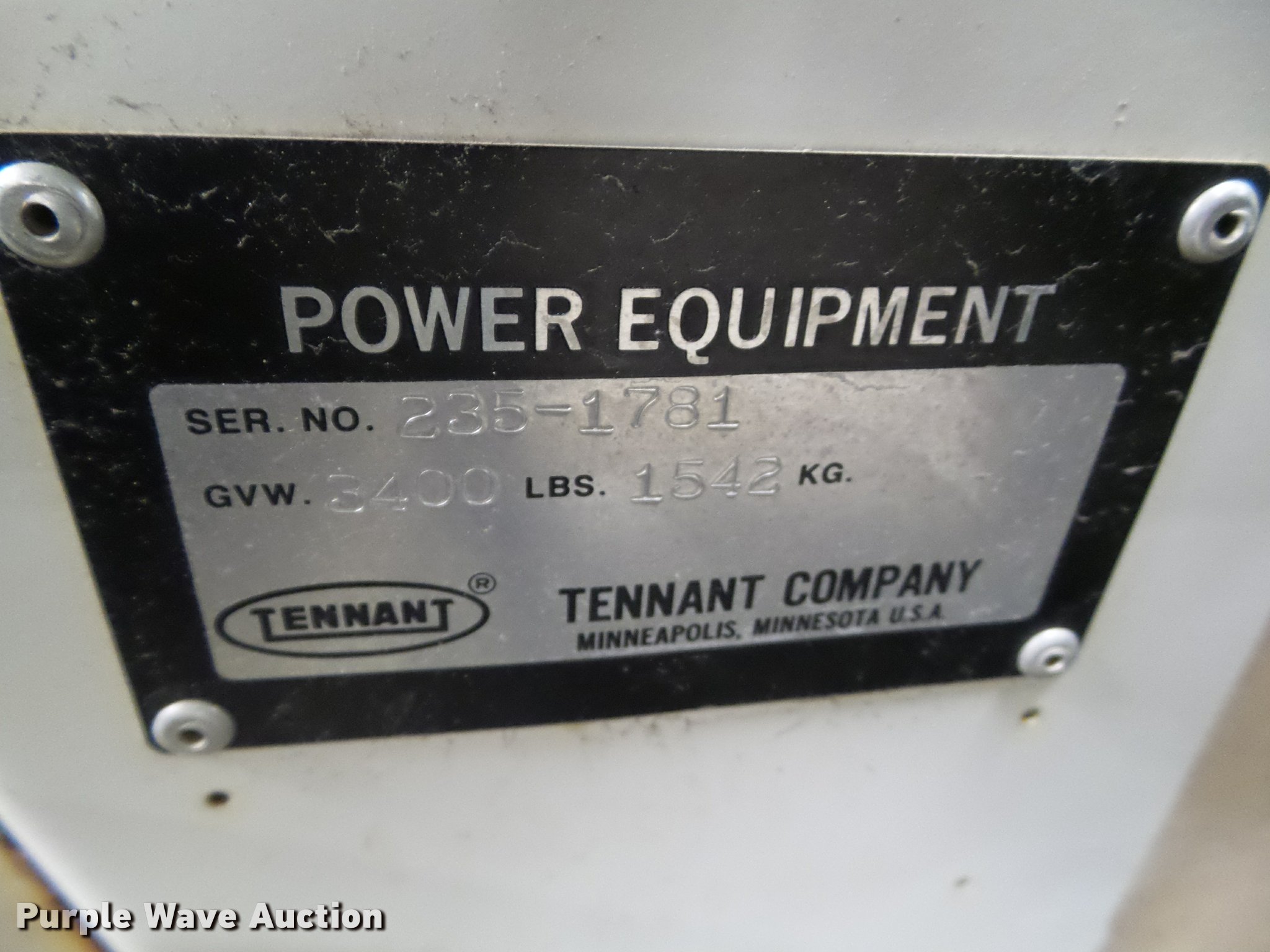 Purple Wave is selling a used Sweeper in Iowa. This item is a Tennant 235 sweeper with the following: 1,206 hours on meter, Kohler 18 propane engine, GVW 3,400 lbs, Serial 235-1781