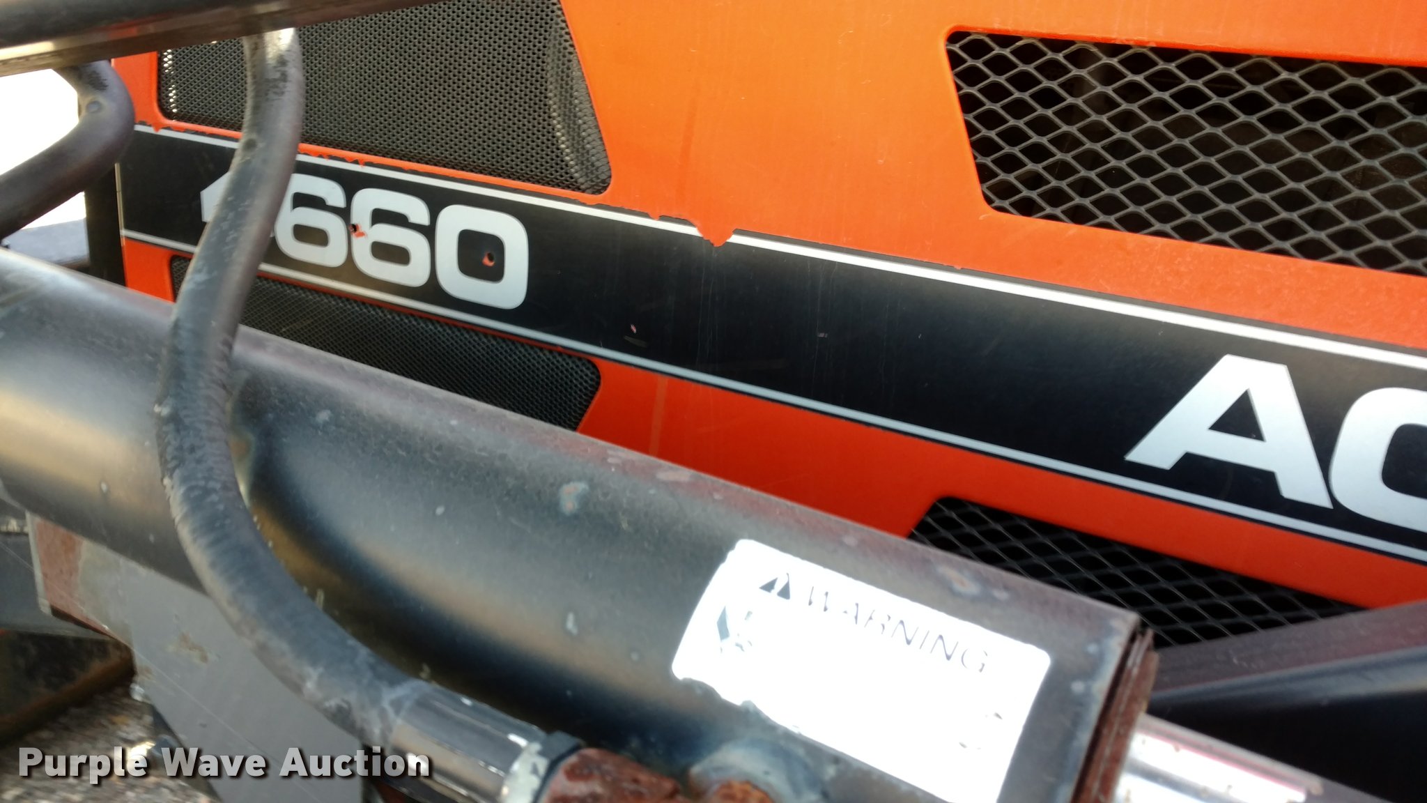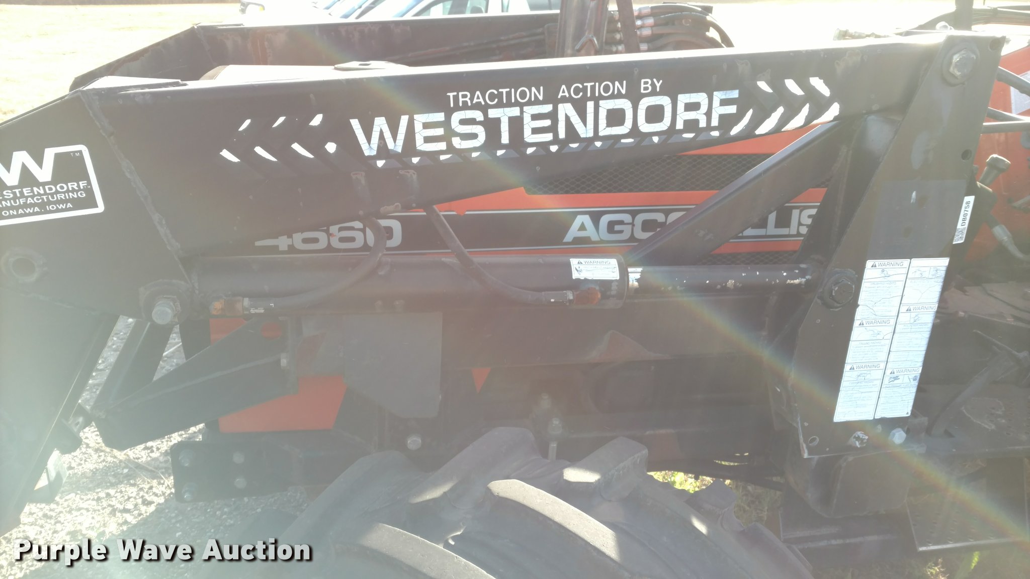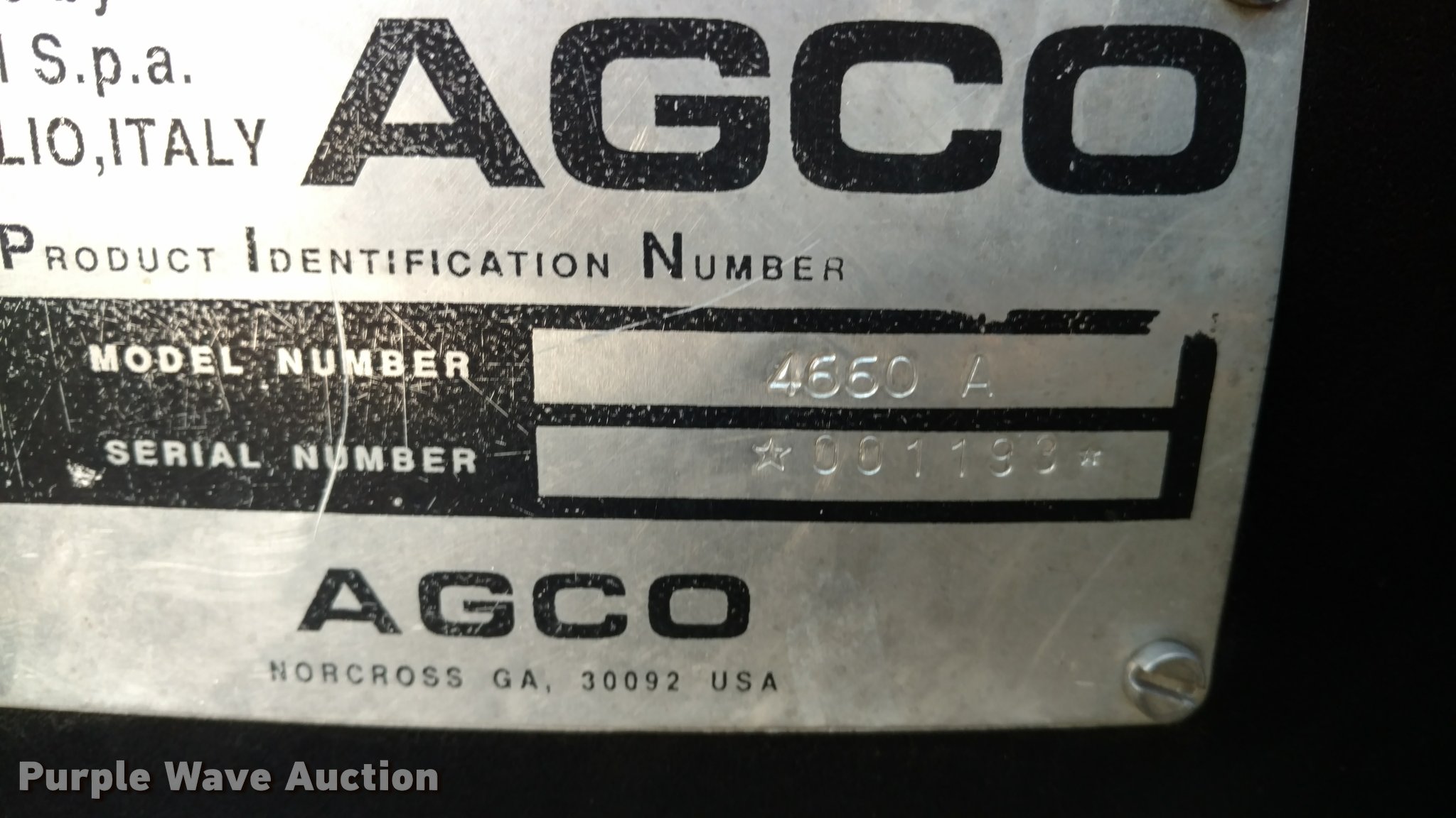 Purple Wave is selling a used Tractor in Kansas. This item is a 1994 AGCO Allis 4660 tractor with the following: 4,198 hours on meter, Three cylinder diesel engine, 12F-4R gears, Spring suspension seat, Westendorf loader, 6'W bucket, Quick attach, Three point, 540 PTO, Draw bar, (3) rear hydraulic remotes, 11.2R24 front tires, 16.9R30 rear tires, Serial 001193