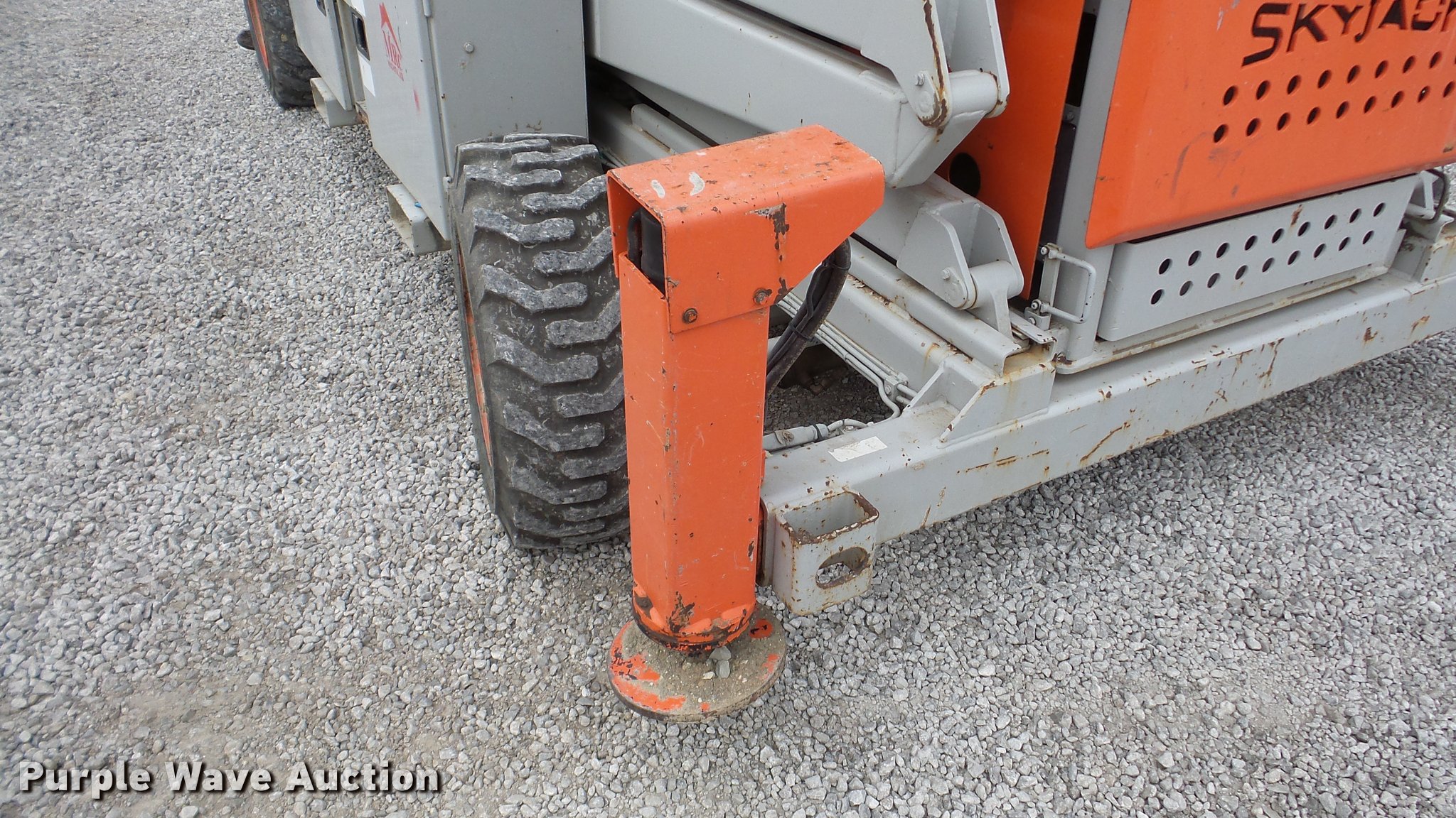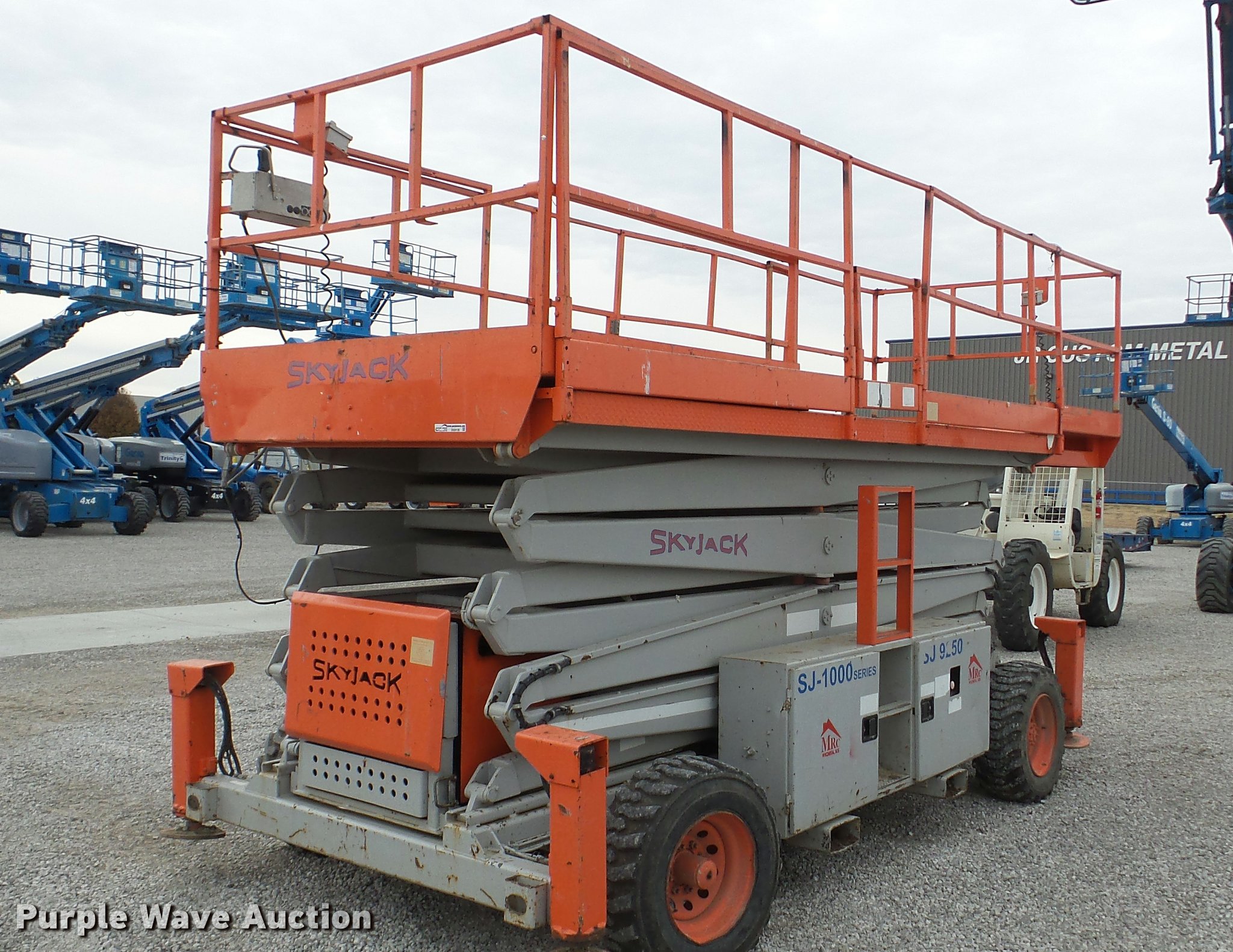 Purple Wave is selling a used Scissor or Vertical Lift in Kansas. This item is a 1998 Skyjack SJ9250 scissor lift with the following: 3,165 hours on meter, Four cylinder dual fuel engine, Gas or propane capable, Four wheel drive, 50' platform height, 168"L x 74"W platform, 5' platform extensions, 1,500 lbs max lift capacity, Five person capacity, 110V outlet, Auto leveling outriggers, 67 second lift time, Two mph drive speed, 176"L x 92"W overall, 10-16.5 tires, 15,200 lbs. base operating weight, Serial 50013