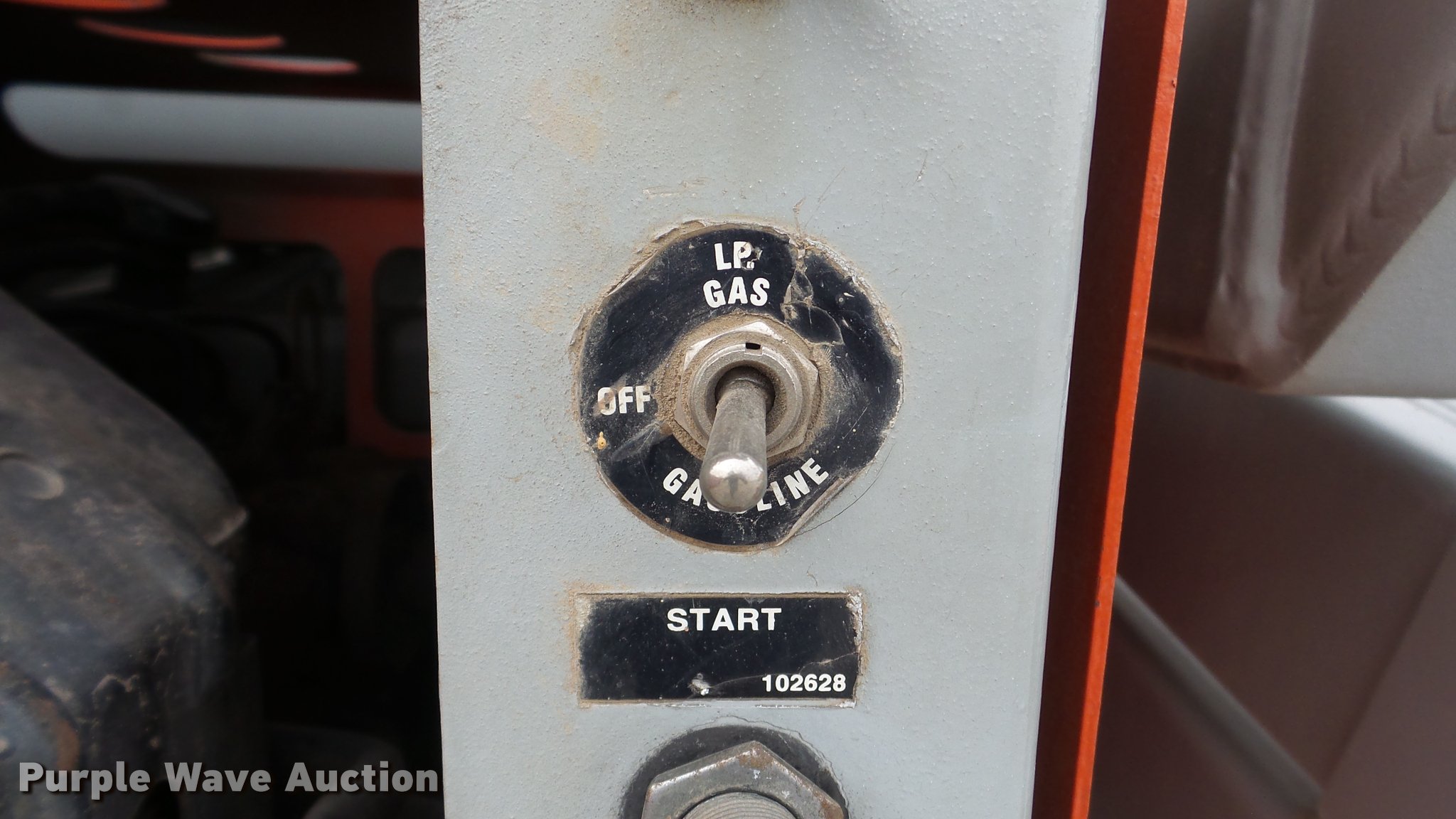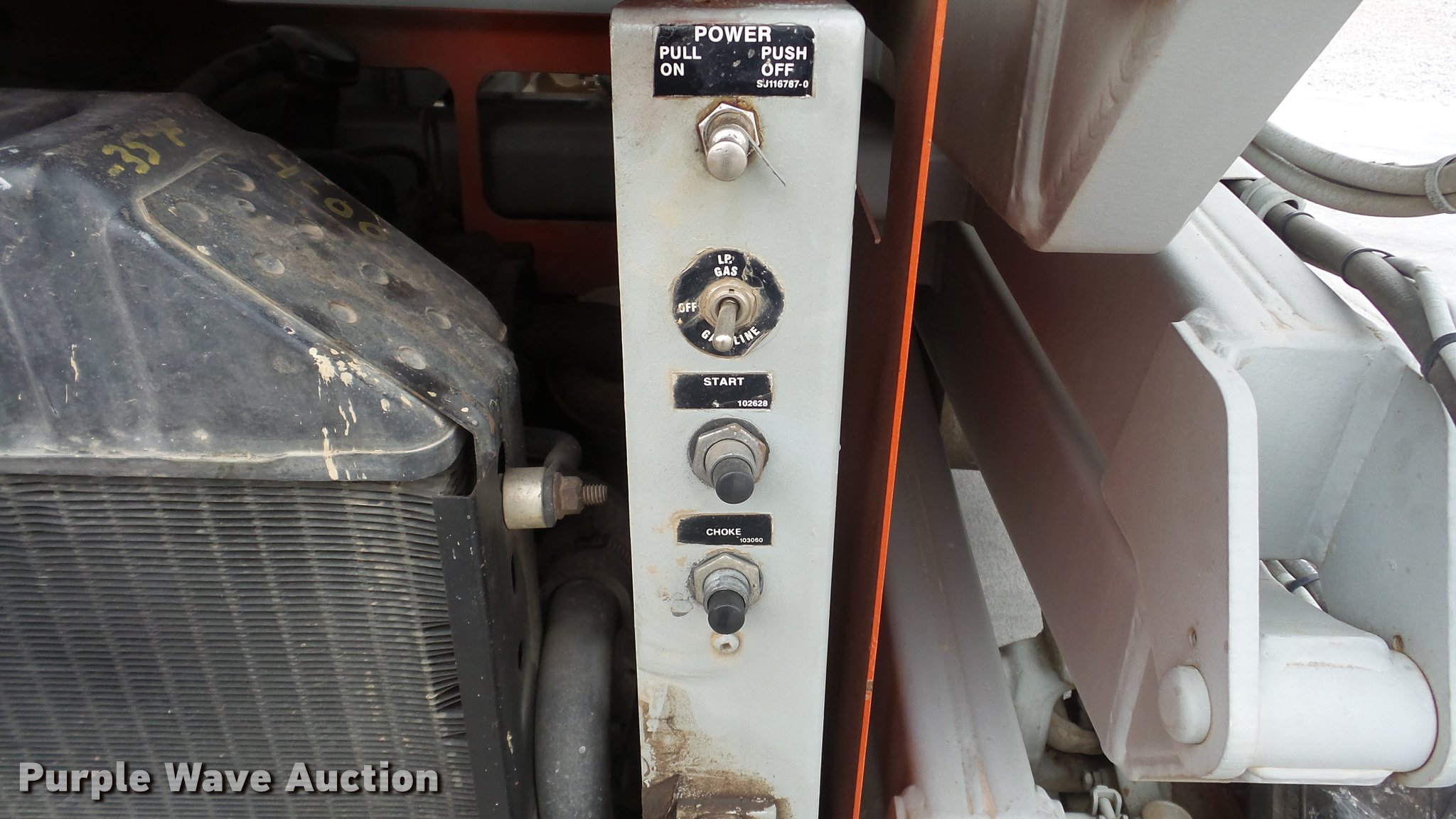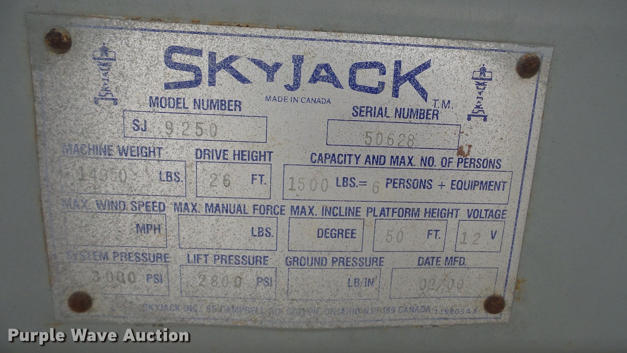 Purple Wave is selling a used Scissor or Vertical Lift in Kansas. This item is a 2000 Skyjack SJ9250 scissor lift with the following: 2,576 hours on meter, Four cylinder dual fuel engine, Gas or propane capable, Four wheel drive, 50' platform height, 168"L x 74"W platform, 5' platform extensions, 1,500 lbs max lift capacity, Five person capacity, 110V outlet, Auto leveling outriggers, 67 second lift time, Two mph drive speed, 176"L x 92"W overall, 10-16.5 tires, 15,200 lbs. base operating weight, Serial 50628
