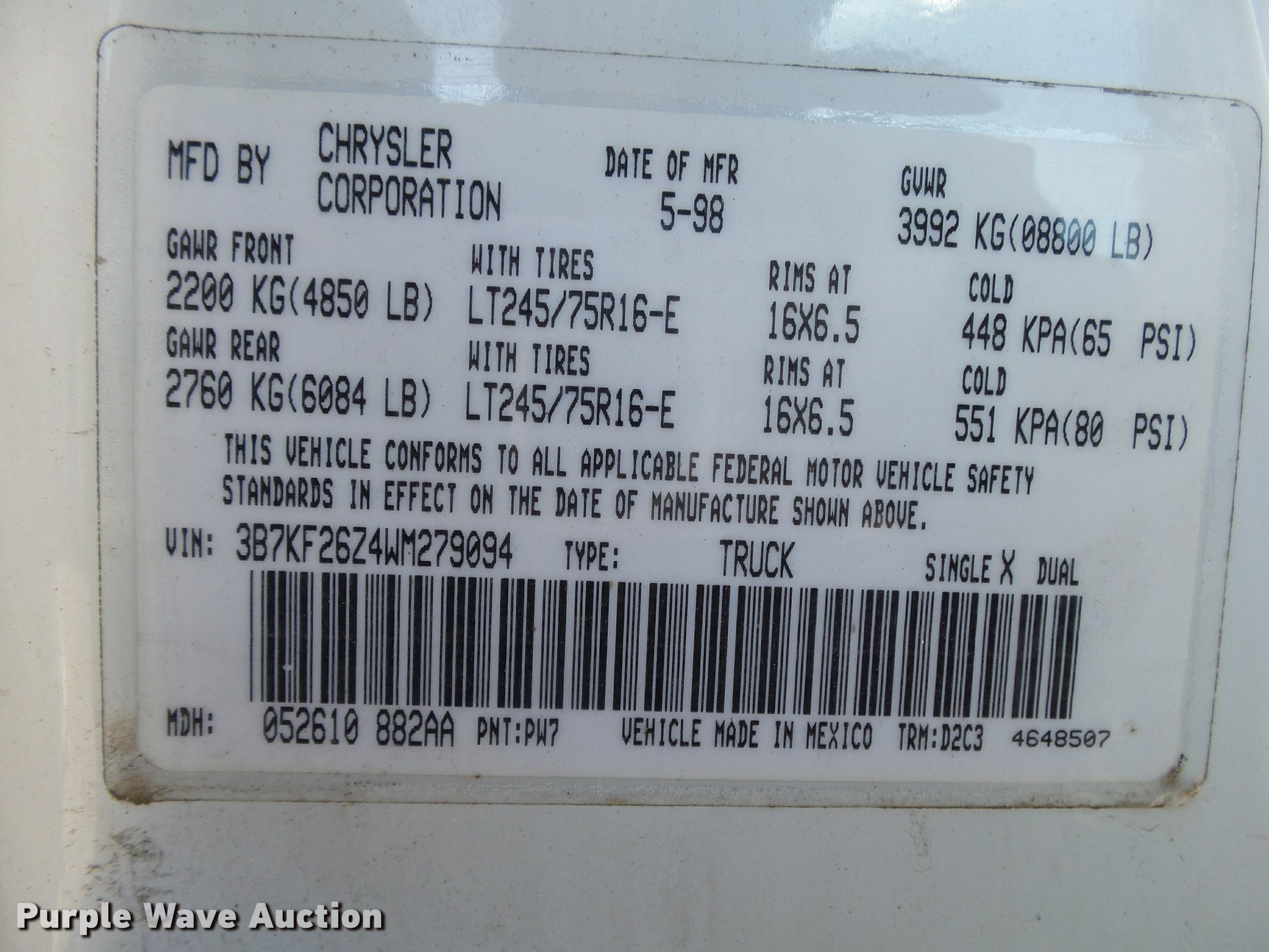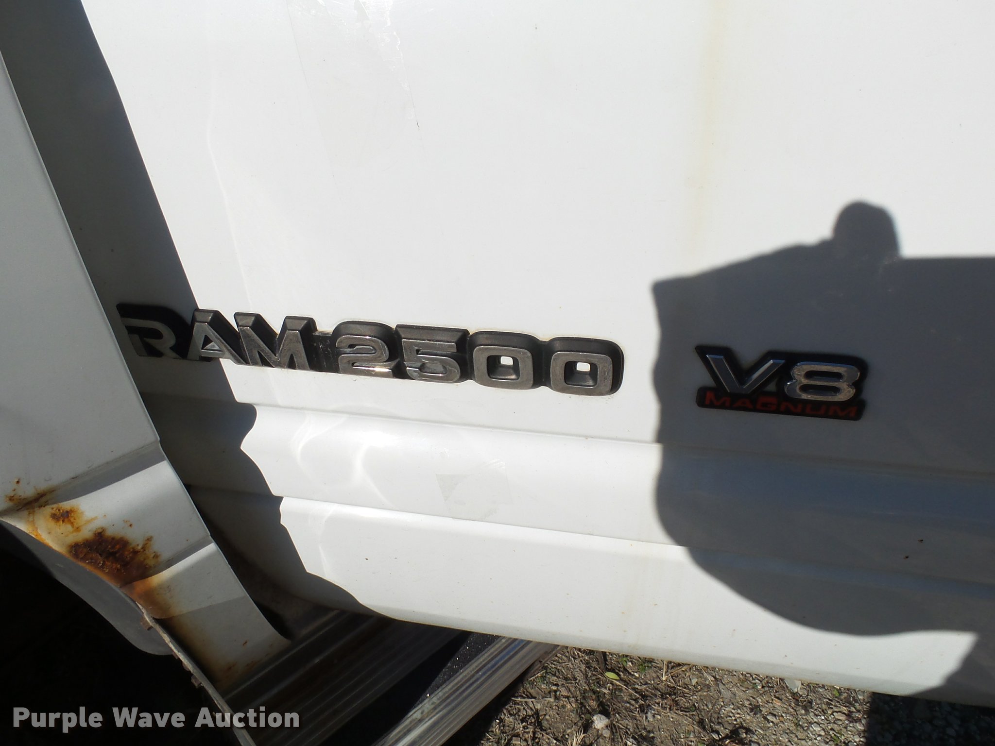 Purple Wave is selling a used 3/4 or 1 Ton Pickup or Van in Missouri. This item is a 1998 Dodge Ram 2500 pickup truck with the following: Unknown miles on odometer, 5.9L V8 OHV 16V gas engine, Automatic transmission, Four wheel drive, AC and heat, Cruise, AM/FM/cassette, Manual windows and locks, Vinyl interior, LT245/75R16 tires, Passenger side window broken out, Steering column damaged, Dead battery, Cracked windshield, Unknown operating condition, Unit must be towed or hauled