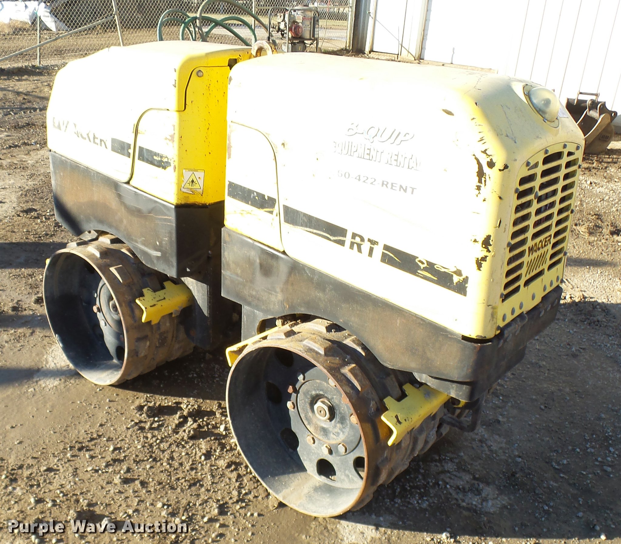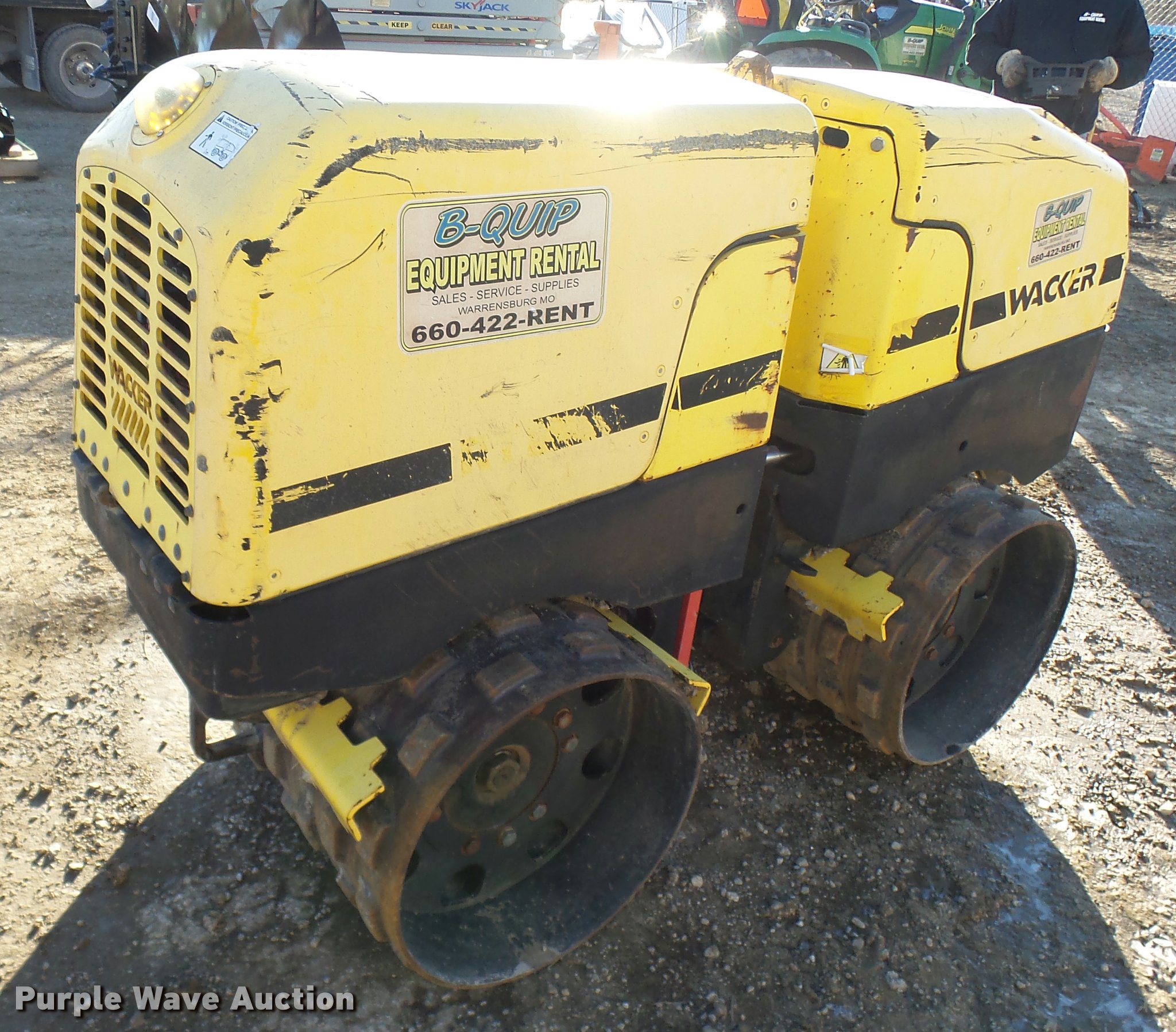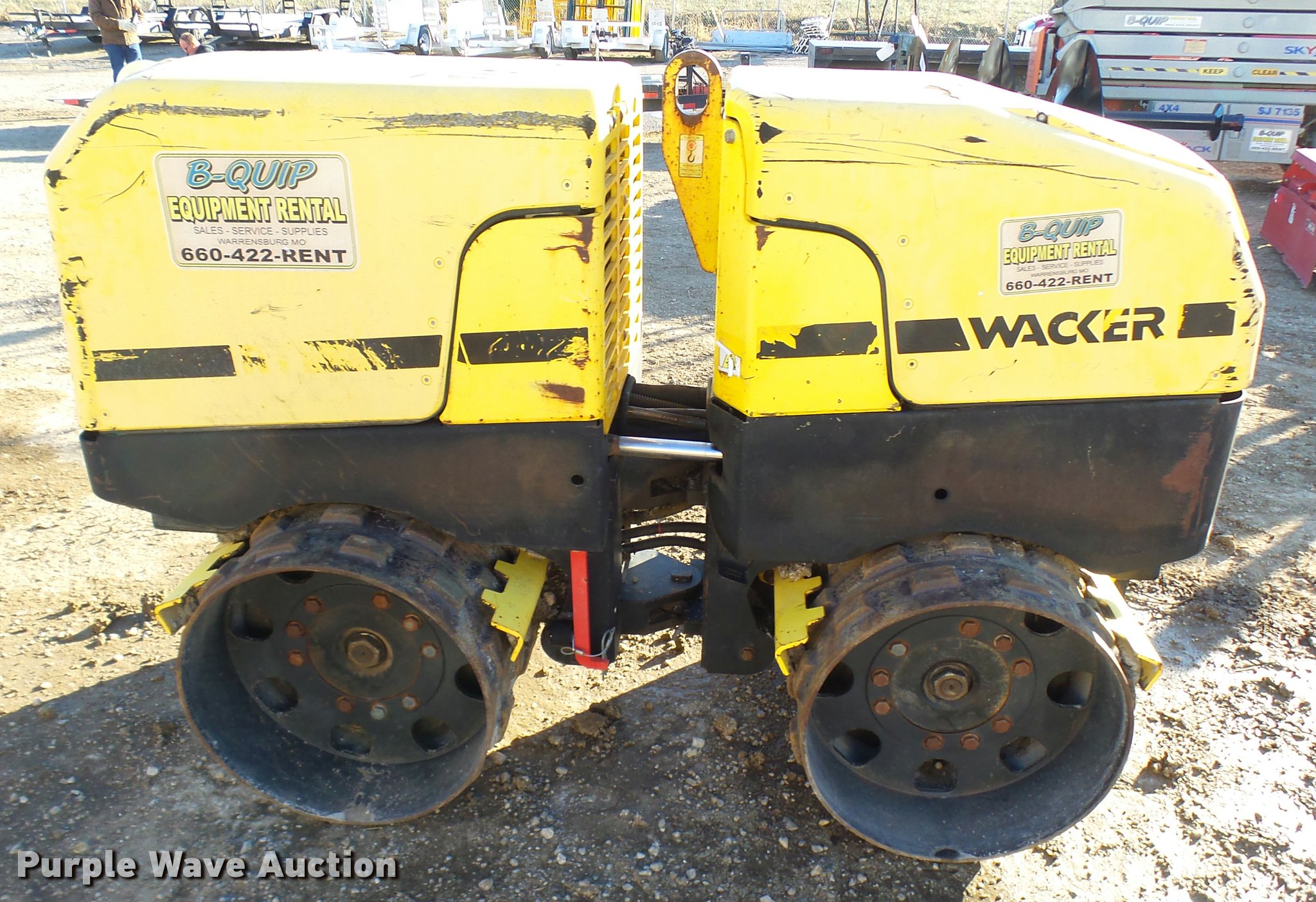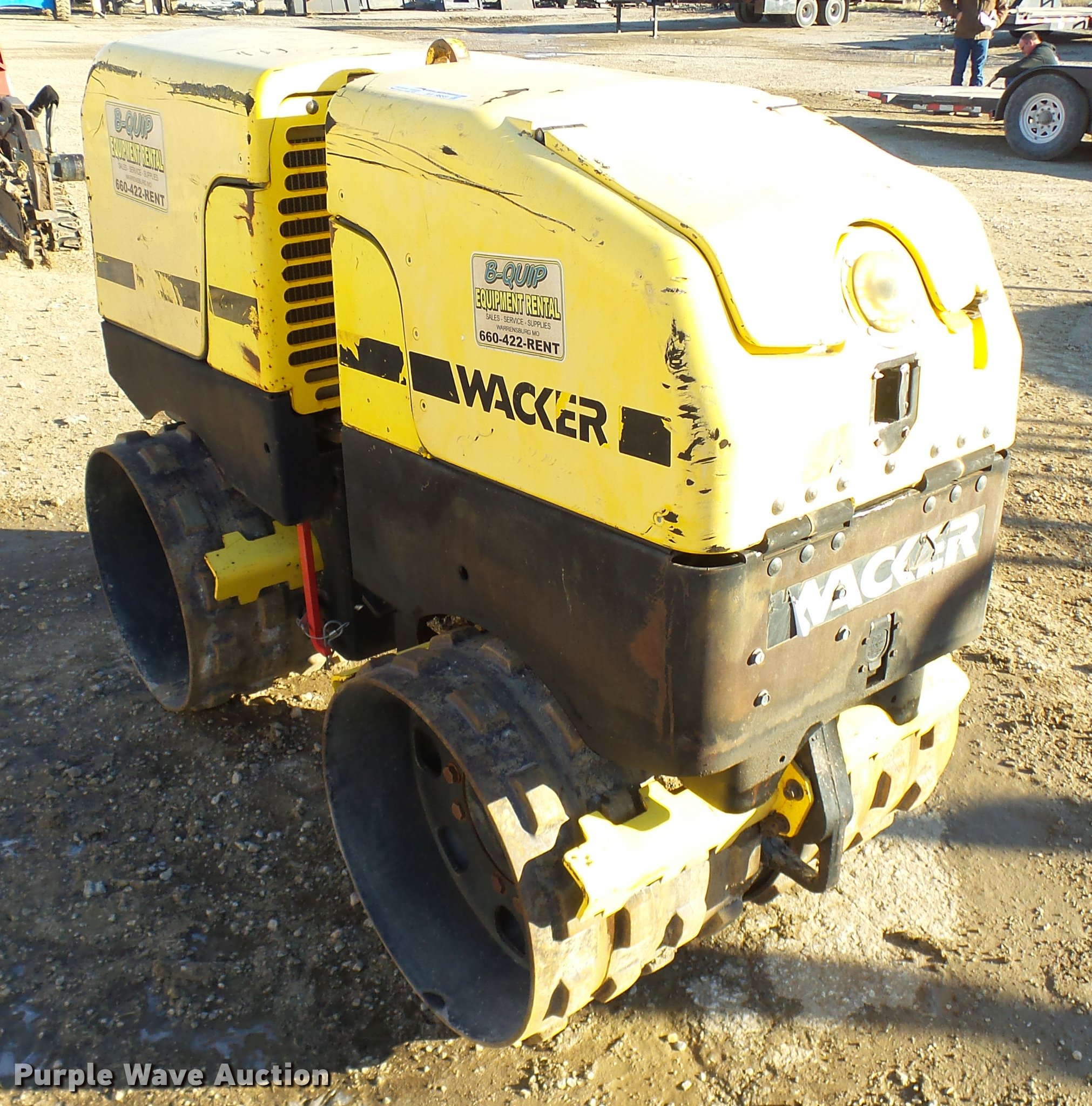 Wacker RT82-SC vibratory padfoot compactor. 573 hours on meter, Lambardini diesel engine 24 HP, Two speed hydrostatic transmission, 32"W x 20" diameter sheeps foot drums, Two speed vibratory system, Front and rear drum scrapers, Dual propel system, Remote control, 3,247 lbs. base operating weight, Serial 5641705. B-Quip Equipment Rental. 82 NW 151st Road. Warrensburg, MO 64019