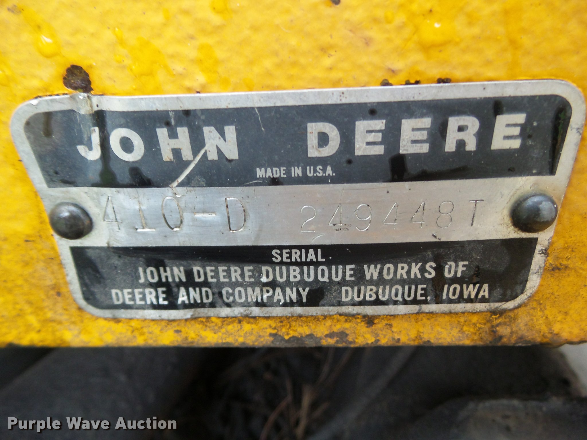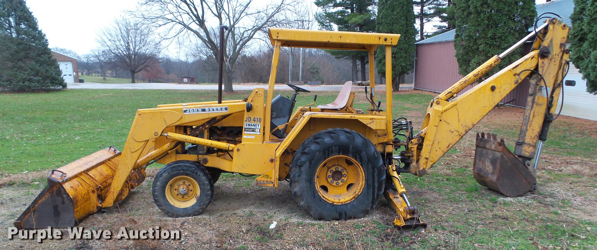 Purple Wave is selling a used Tractor Loader Backhoe in Iowa. This item is a 1976 John Deere 410 backhoe with the following: 3,404 hours on meter, John Deere 4045T four cylinder turbo diesel engine, Manual transmission, 4F-4R gears, EROPS, Suspension seat, Four stick backhoe controls, John Deere 86"W loader bucket, Weld-on cutting edge, John Deere 36"W backhoe bucket, (5) teeth, 11L-16SL front tires, 21L-24 rear tires, Serial 410D249448T