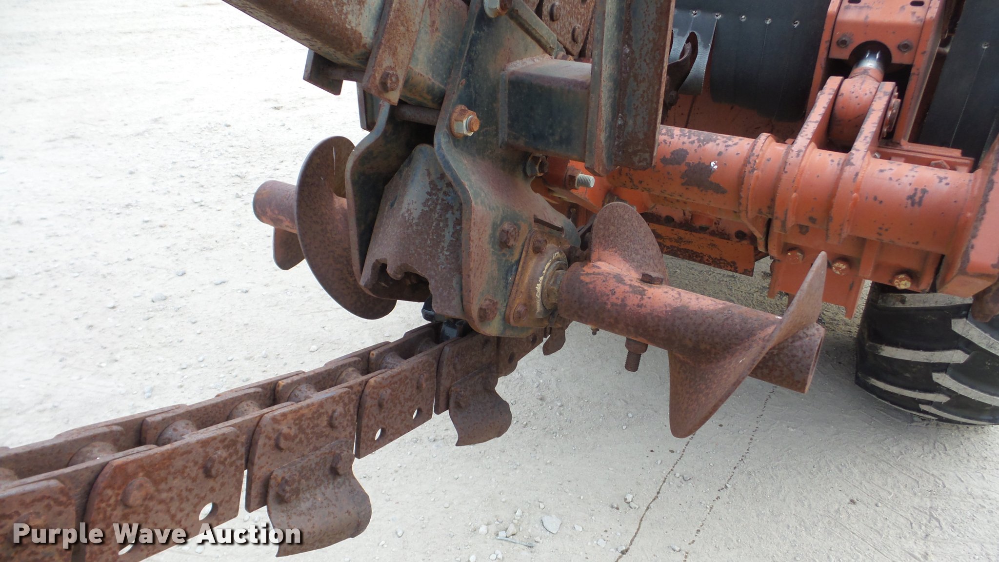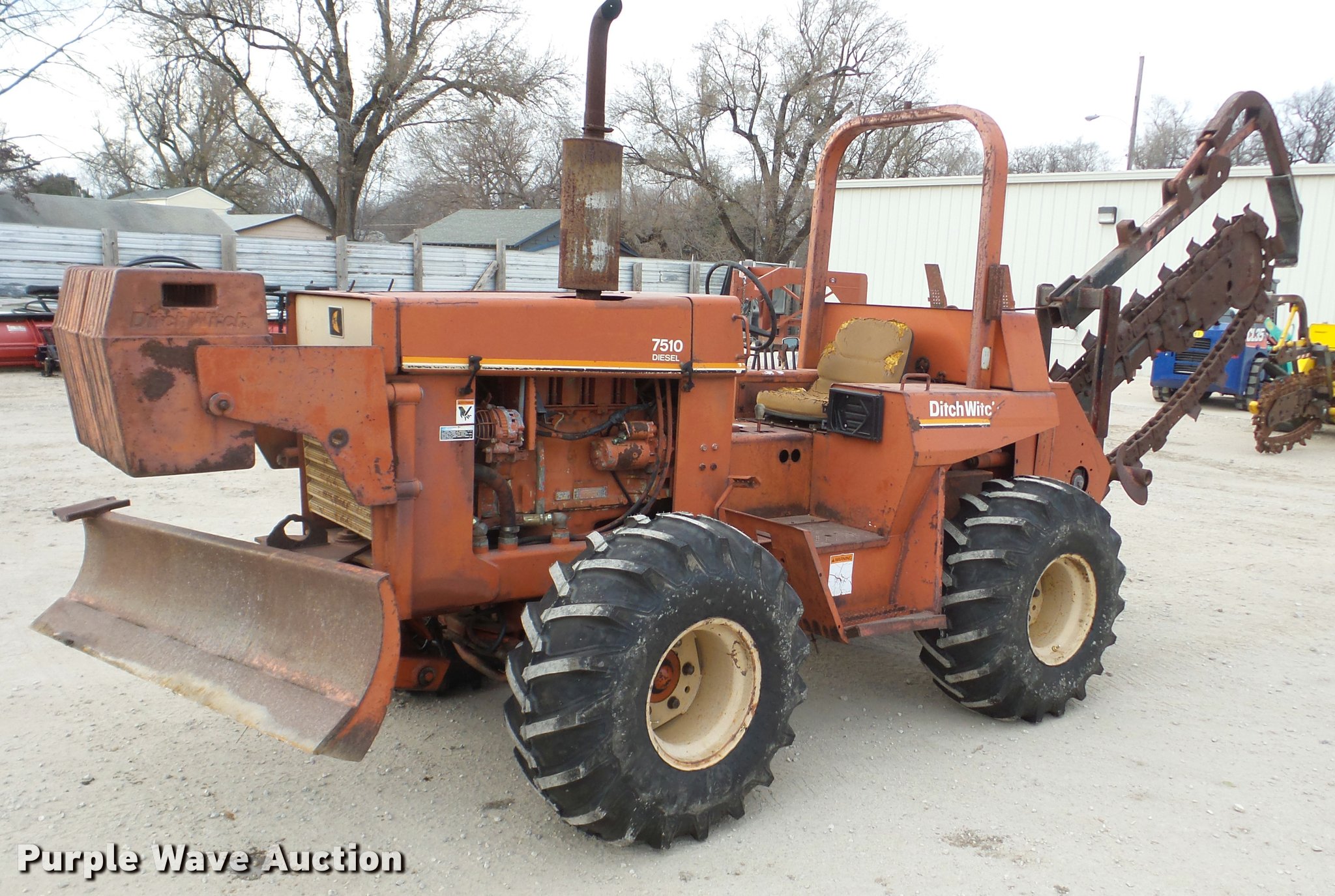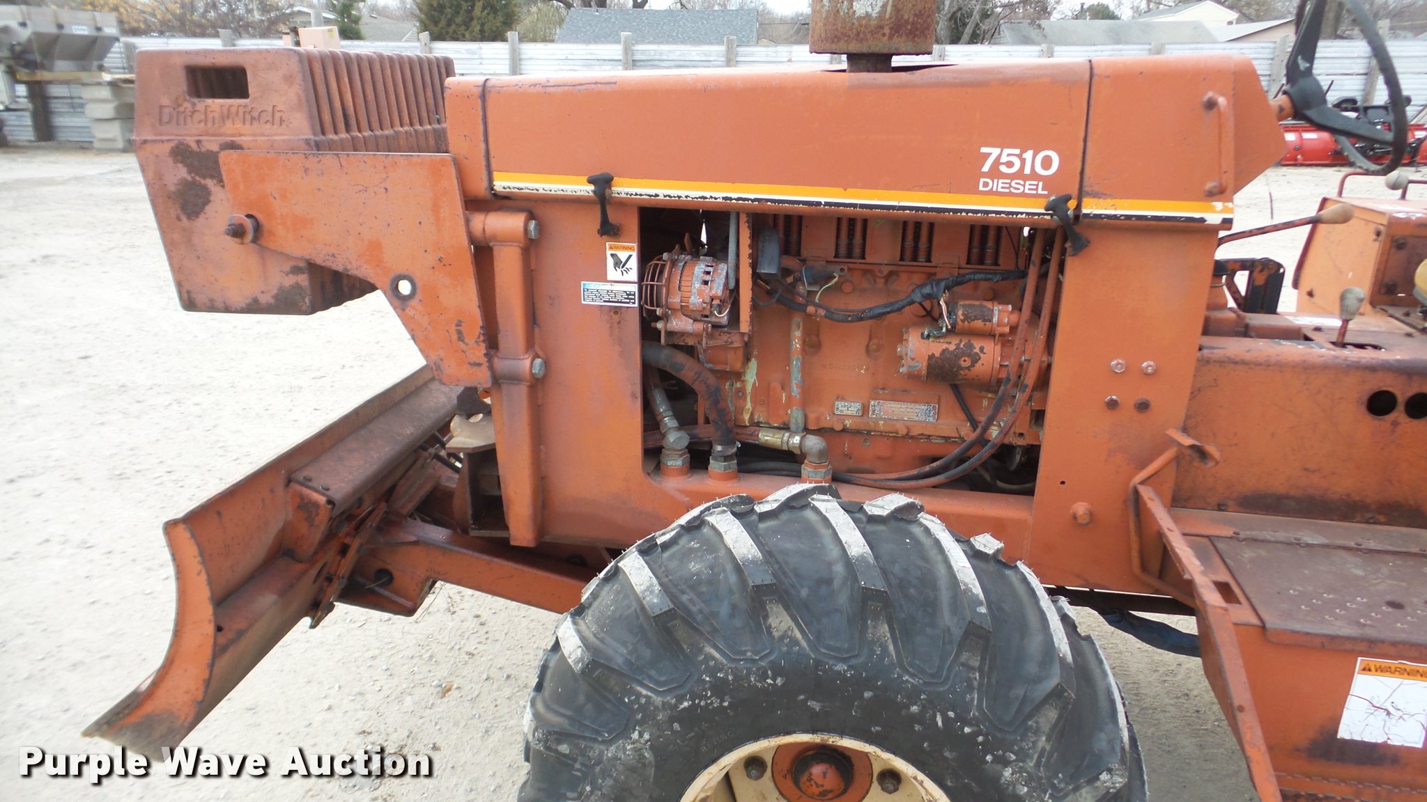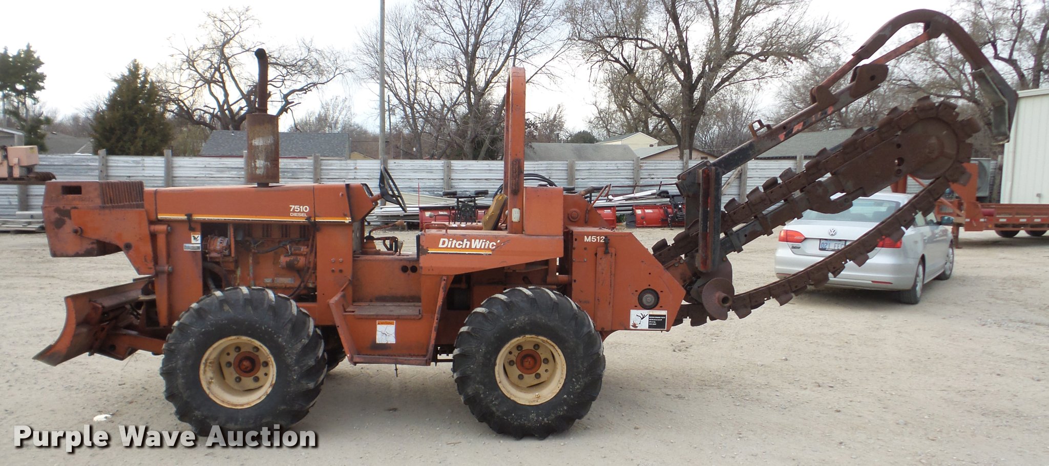 Purple Wave is selling a used Trencher or Rock Saw in Kansas. This item is a Ditch Witch 7510 trencher with the following: 688 hours on meter, Deutz four cylinder diesel engine, Four speed transmission, Four wheel drive, Four wheel steering, OROPS, 72"W six-way back fill blade, M512 10' trencher, 6" cutting width, Crumber, Serial 2T4274,, 16.5L-16.1 tires