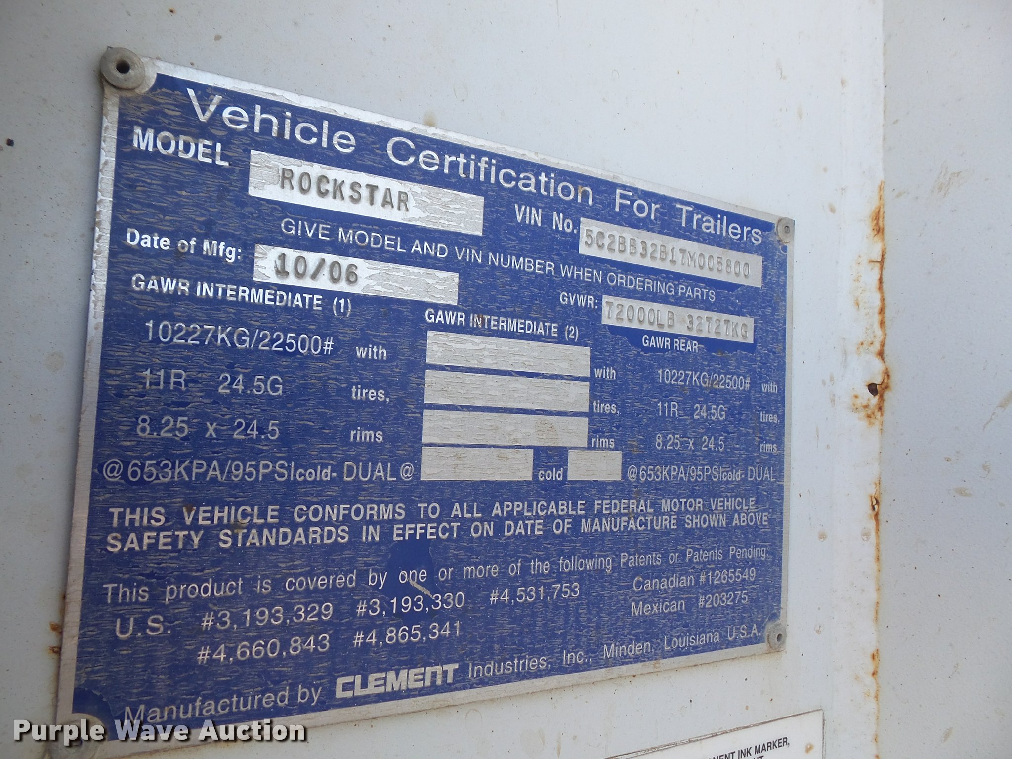 Purple Wave is selling a used End Dump Rock Trailer in Kansas. This item is a 2007 Clement Rockstar barrel bed end dump trailer with the following: 32'L, Single hydraulic cylinder, End gate, Electric rollover tarp, Steel construction, Fifth wheel plate, Dual leg landing gear, Spring suspension, Air brakes, Tandem axle, 11R24.5 tires, GVWR 72,000 lbs